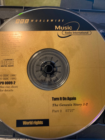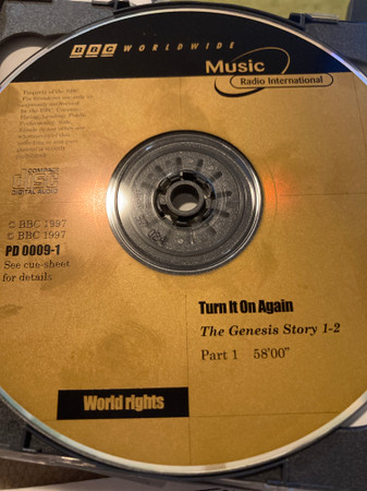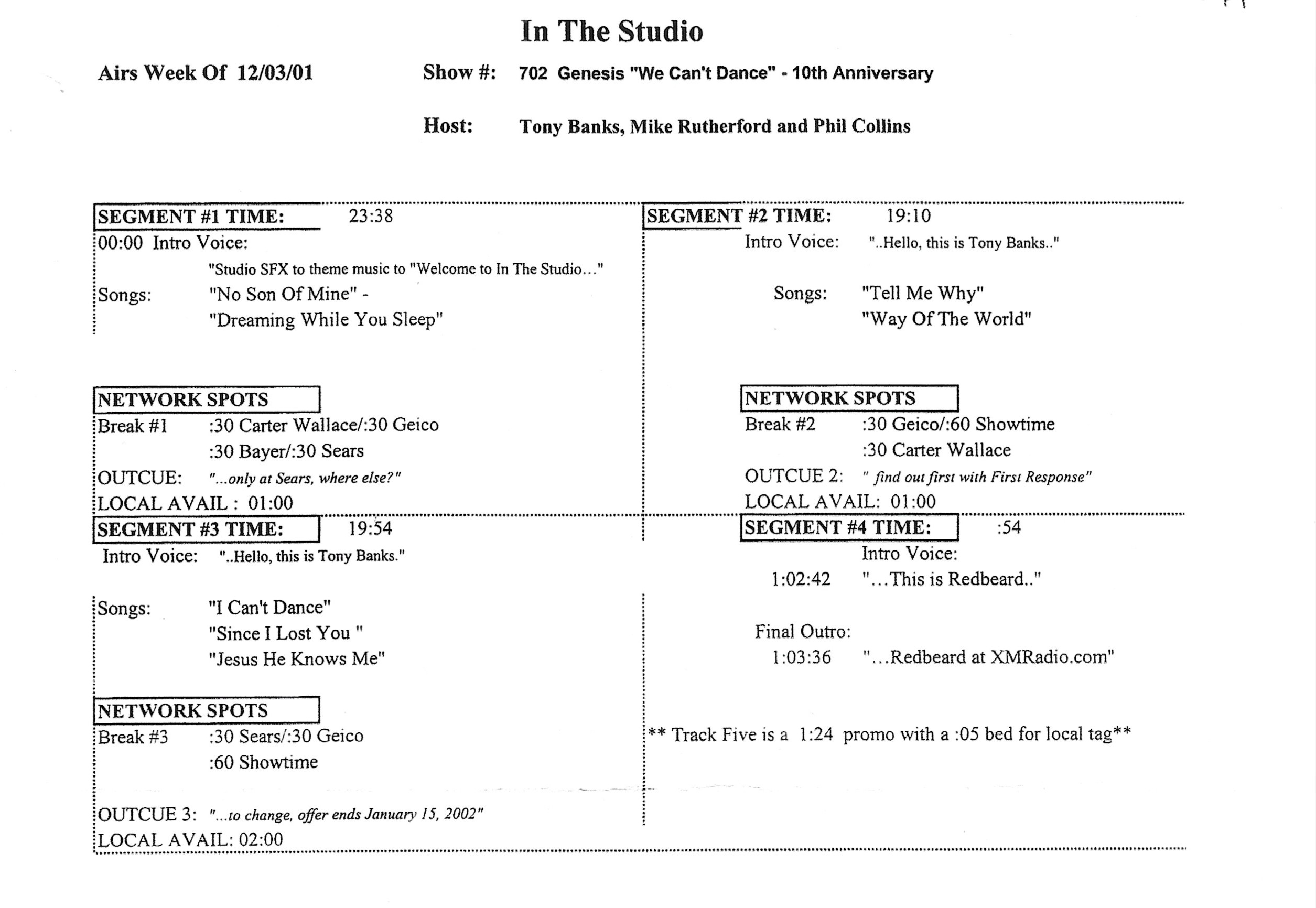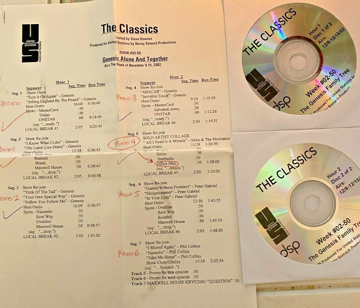 The show contains commercials and studio tracks from several of the band’s albums, plus In The Air Tonight. There are thirty-three tracks on the compact disc, with Tracks 1 – 4 containing the actual interview and song segments, Tracks 5 – 7 are show promo spots, Tracks 8 – 17 are commercial spots, while Tracks 18 – 33 are the actual interview segments separated into individual tracks.