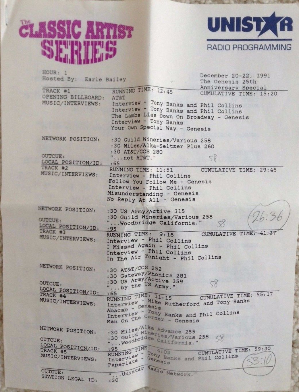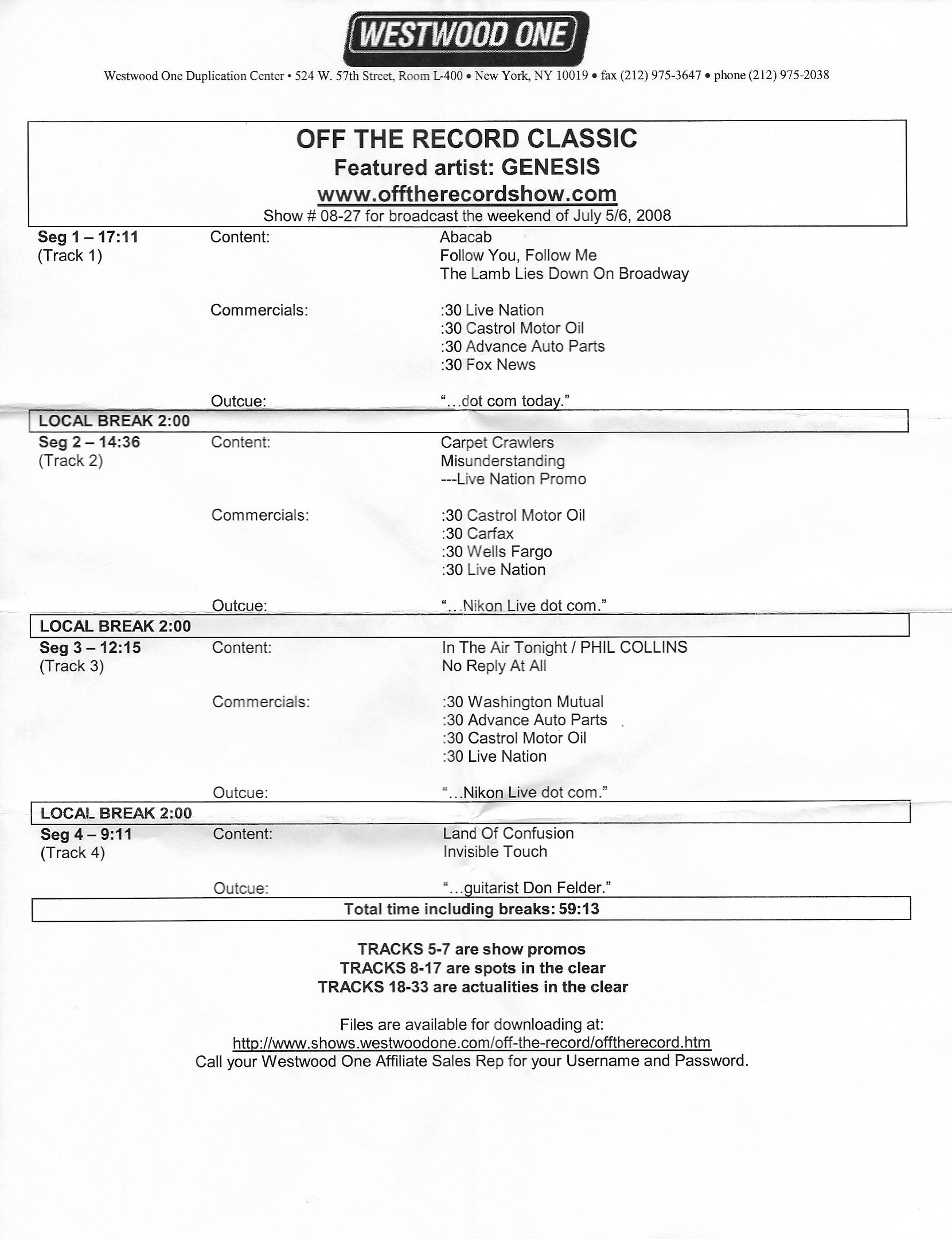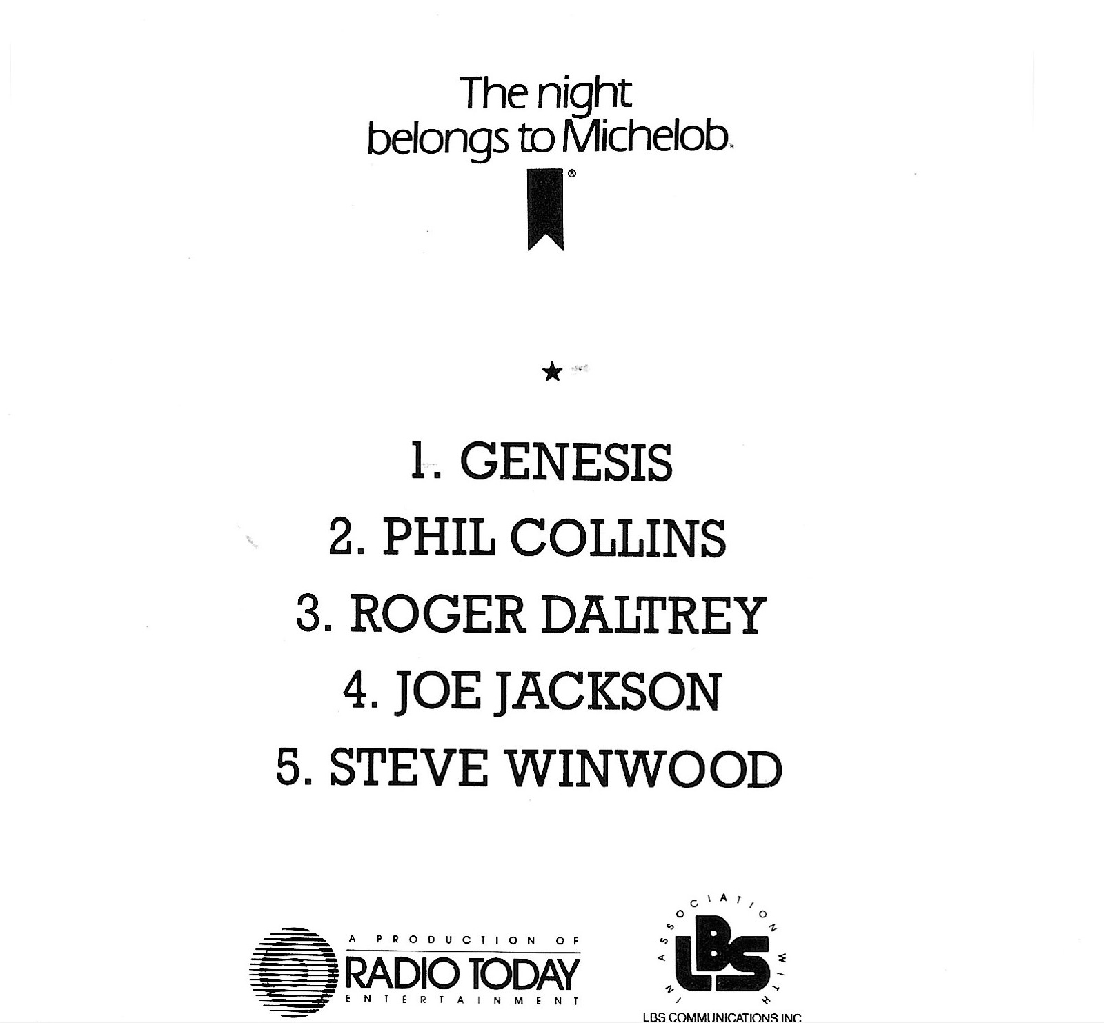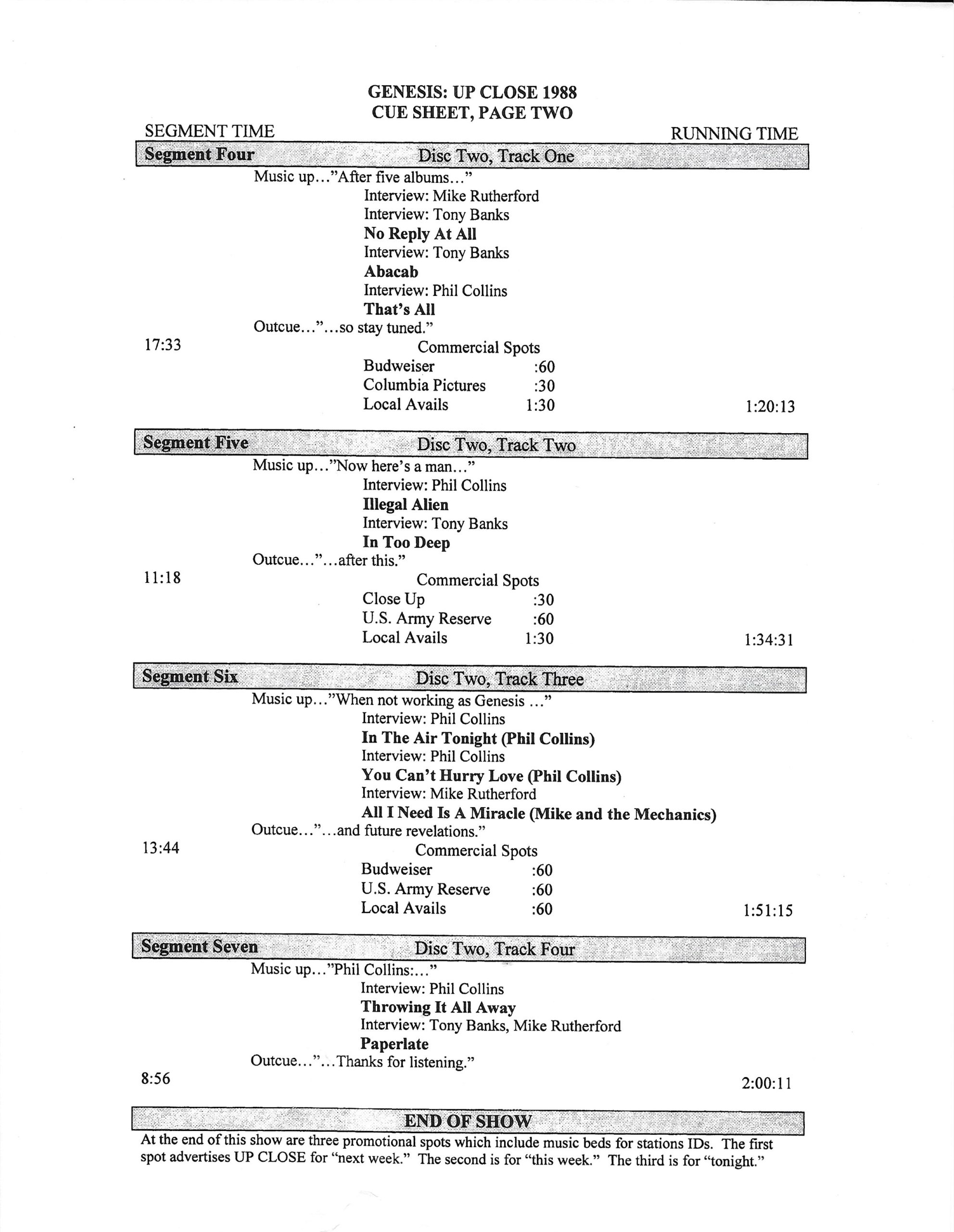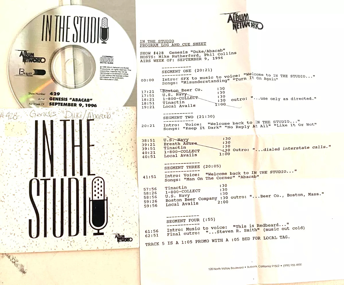 The show contains commercials and studio tracks from several of the band’s albums, plus In The Air Tonight. There are thirty-four tracks on the compact disc, with Tracks 1 – 4 containing the actual interview and song segments, Tracks 5 – 7 are show promo spots, Tracks 8 – 17 are commercial spots, while Tracks 18 – 34 are the actual interview segments separated into individual tracks.