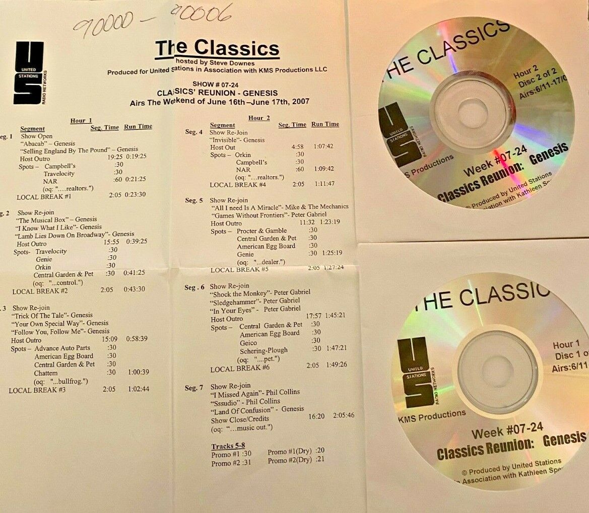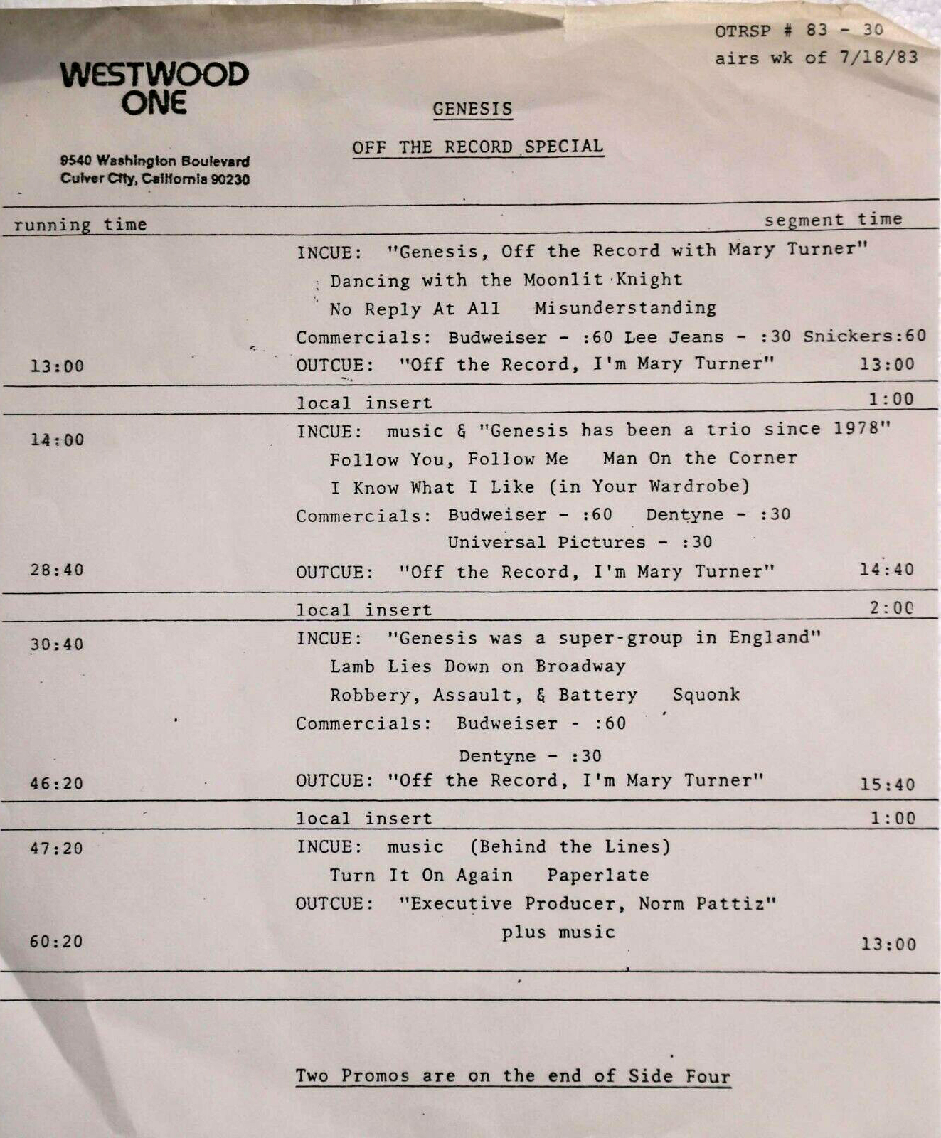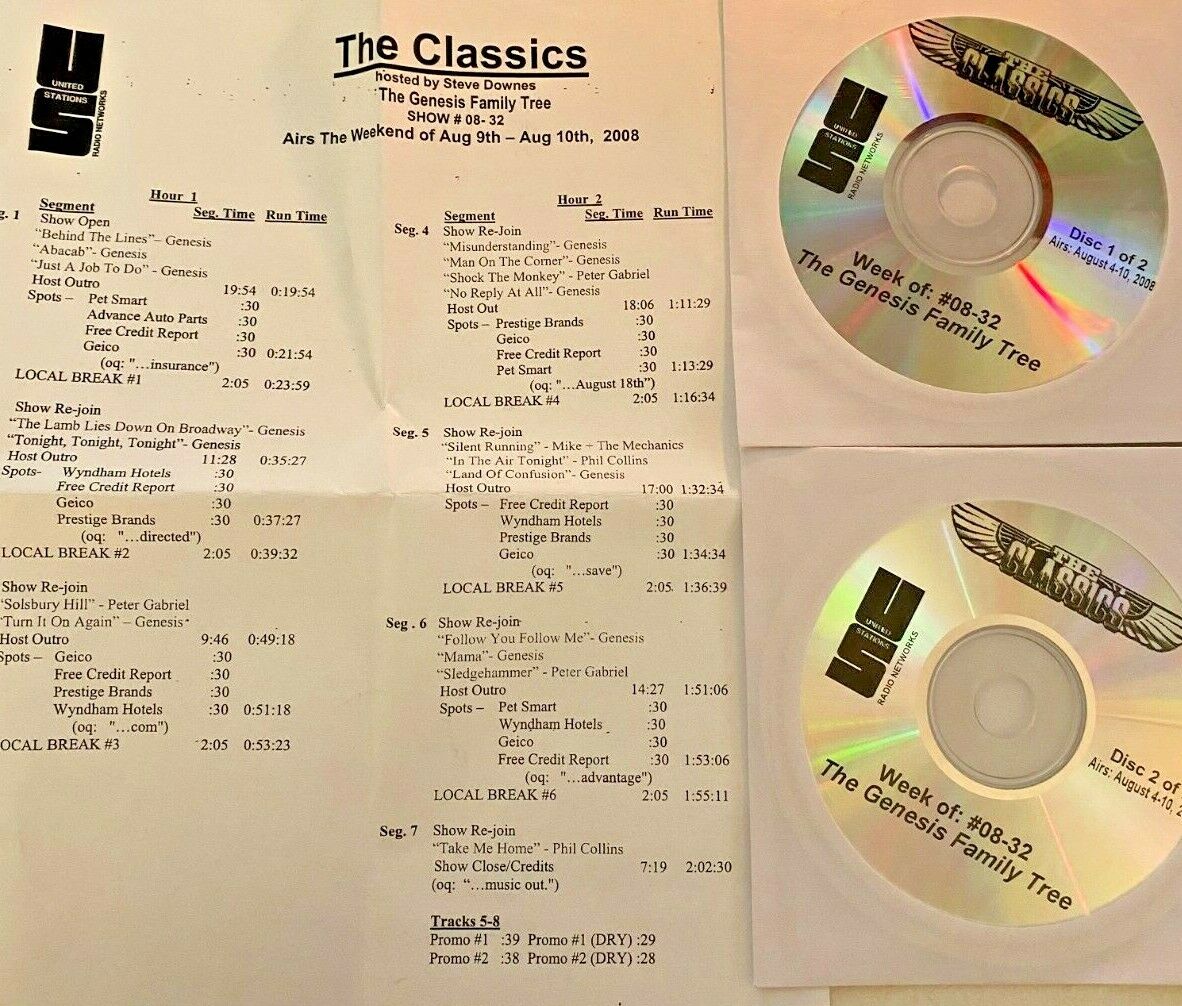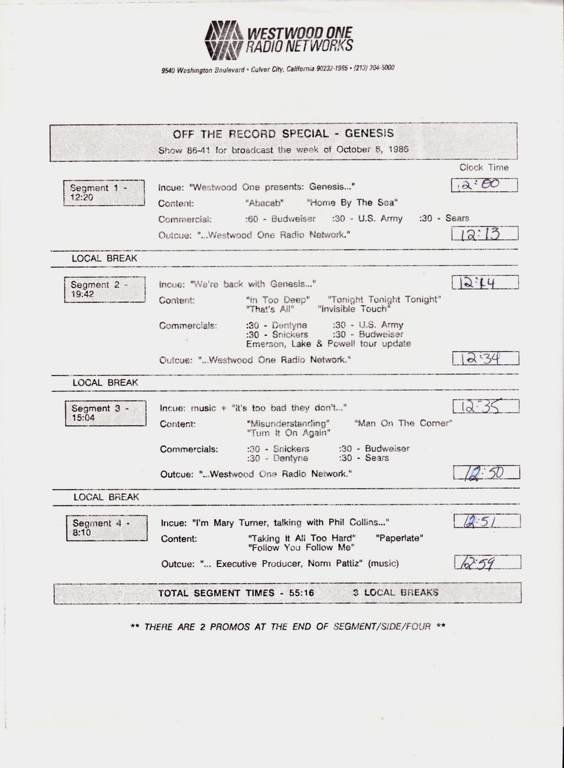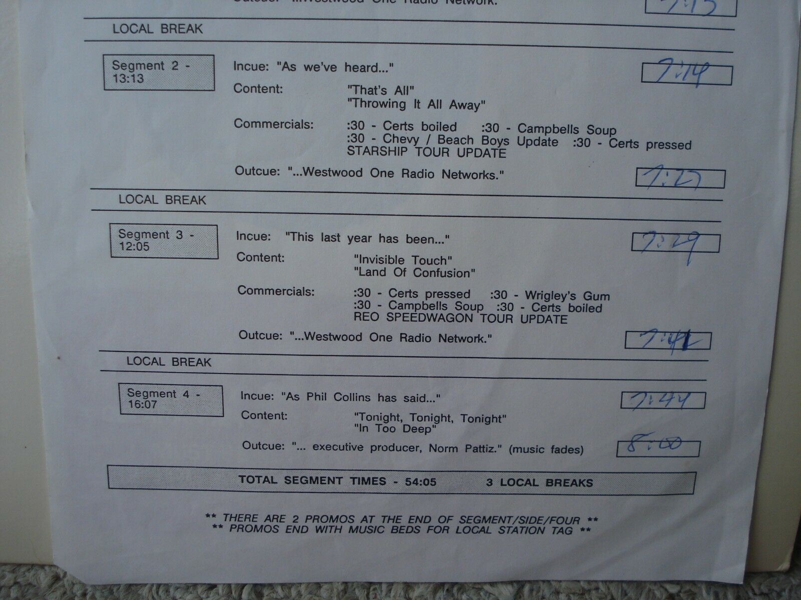 The show contains commercials and studio tracks from several of the band’s albums, plus In The Air Tonight. There are thirty-four tracks on the compact disc, with Tracks 1 – 4 containing the actual interview and song segments, Tracks 5 – 7 are show promo spots, Tracks 8 – 17 are commercial spots, while Tracks 18 – 34 are the actual interview segments separated into individual tracks.