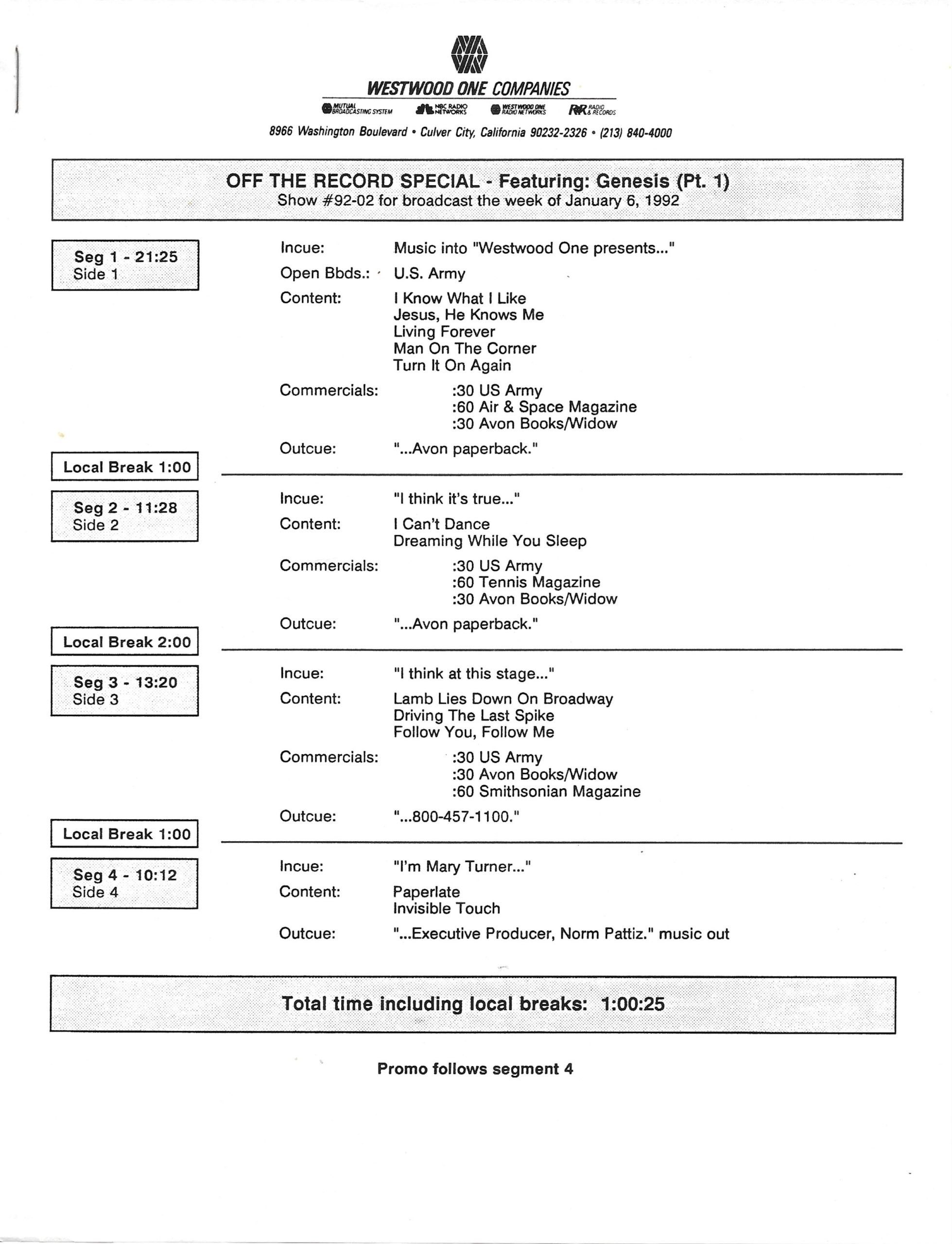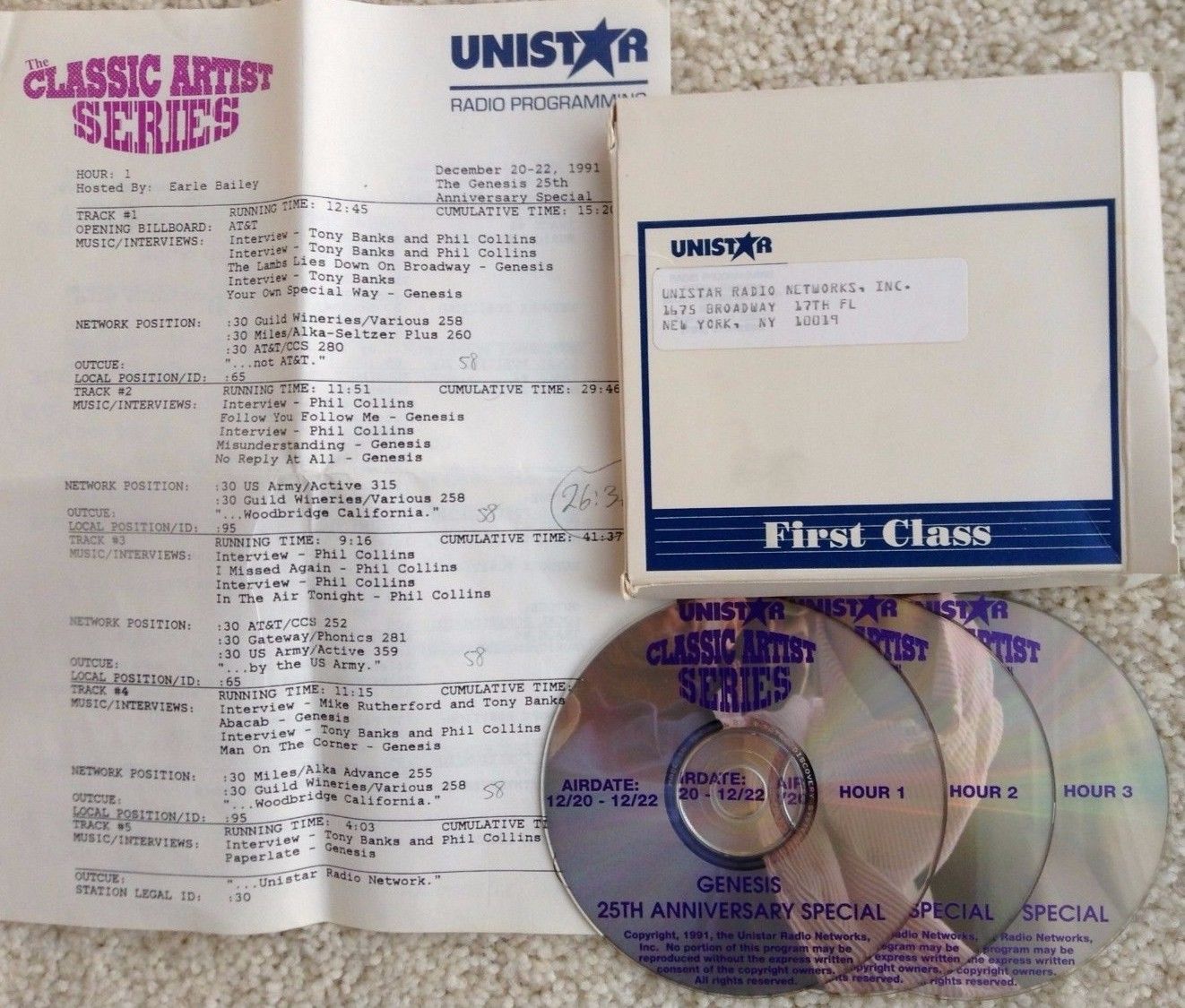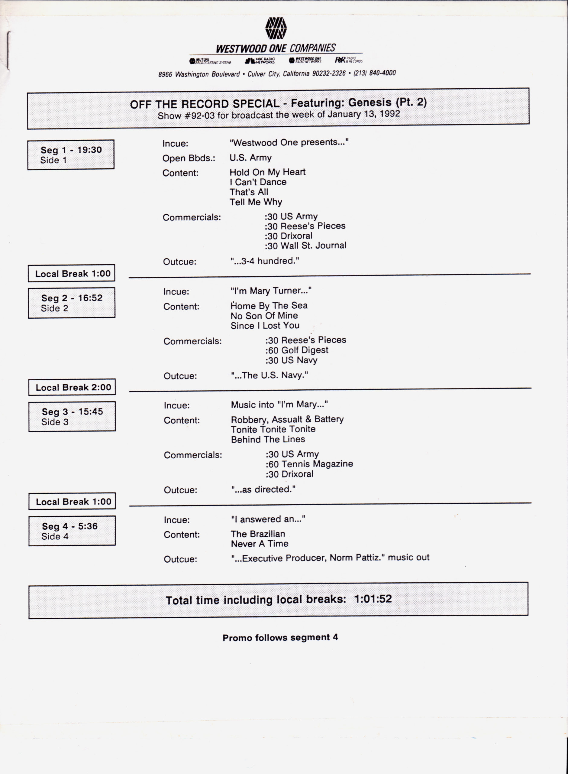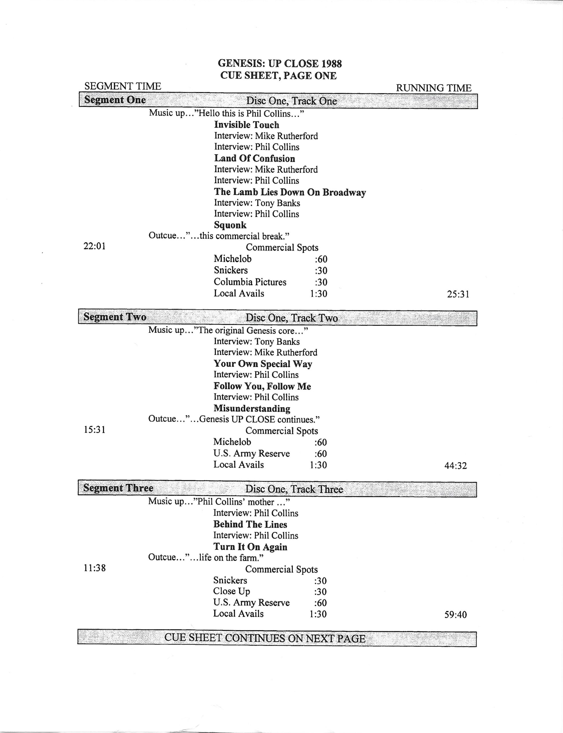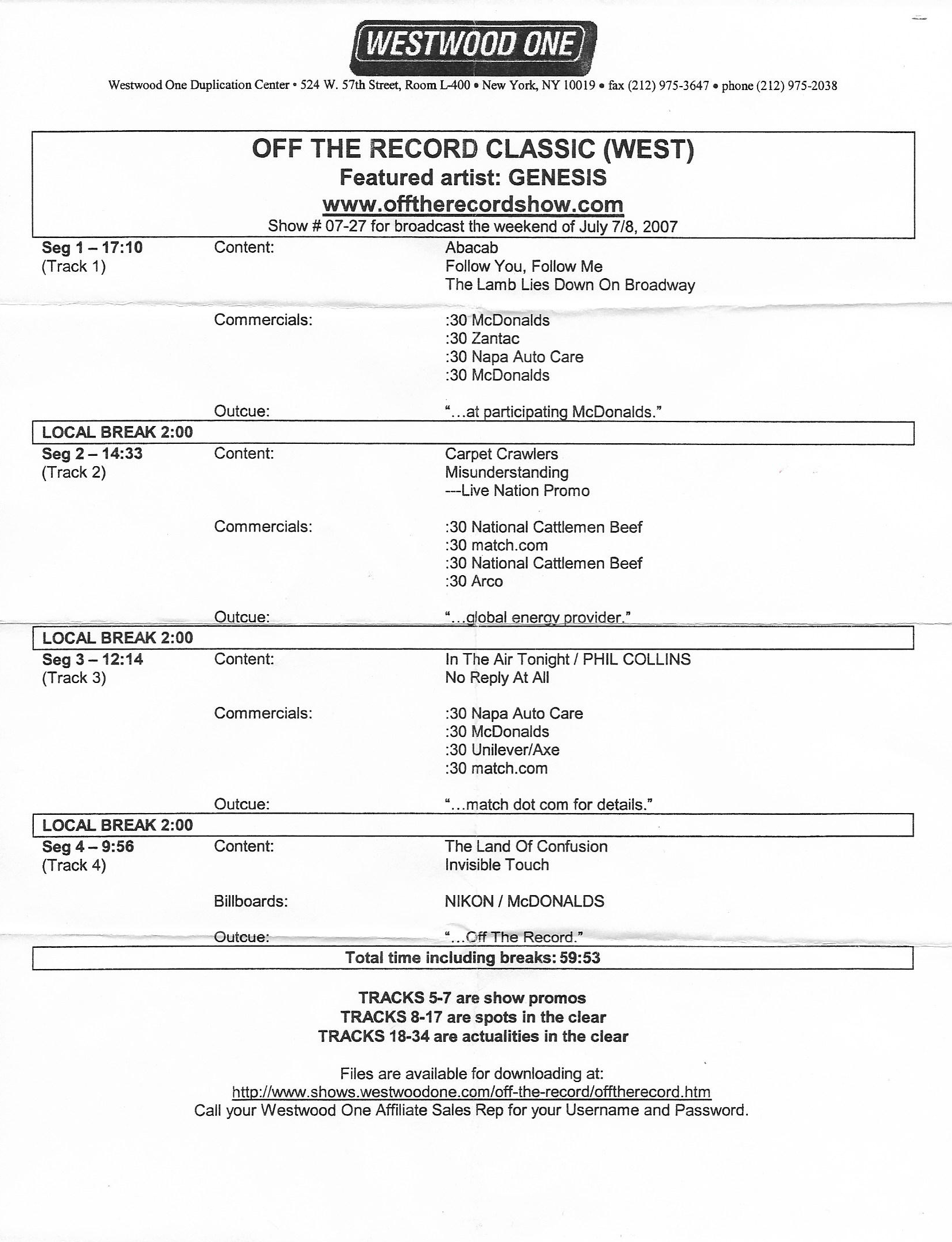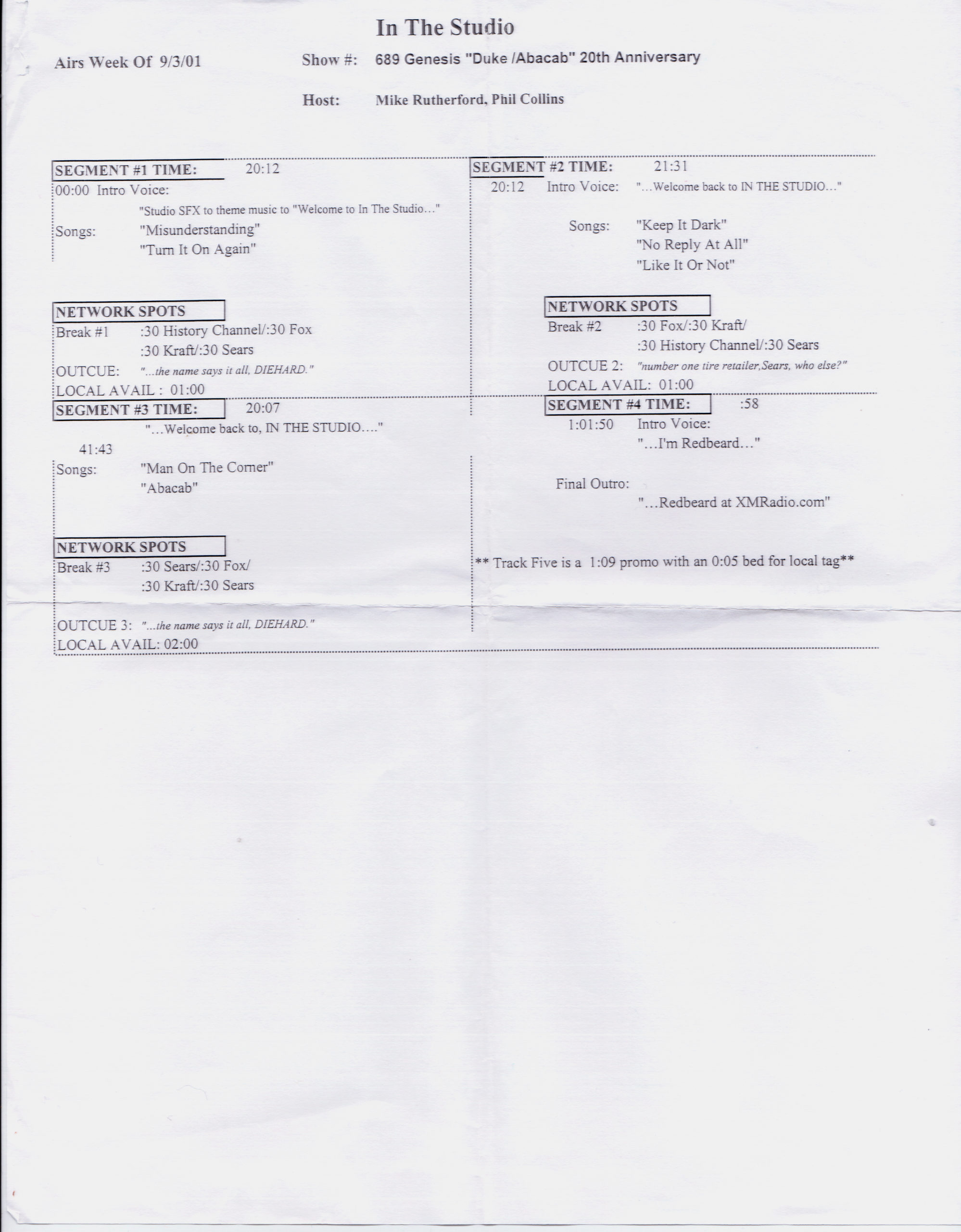 The show contains commercials and studio tracks from several of the band’s albums, plus In The Air Tonight. There are thirty-four tracks on the compact disc, with Tracks 1 – 4 containing the actual interview and song segments, Tracks 5 – 7 are show promo spots, Tracks 8 – 17 are commercial spots, while Tracks 18 – 34 are the actual interview segments separated into individual tracks.