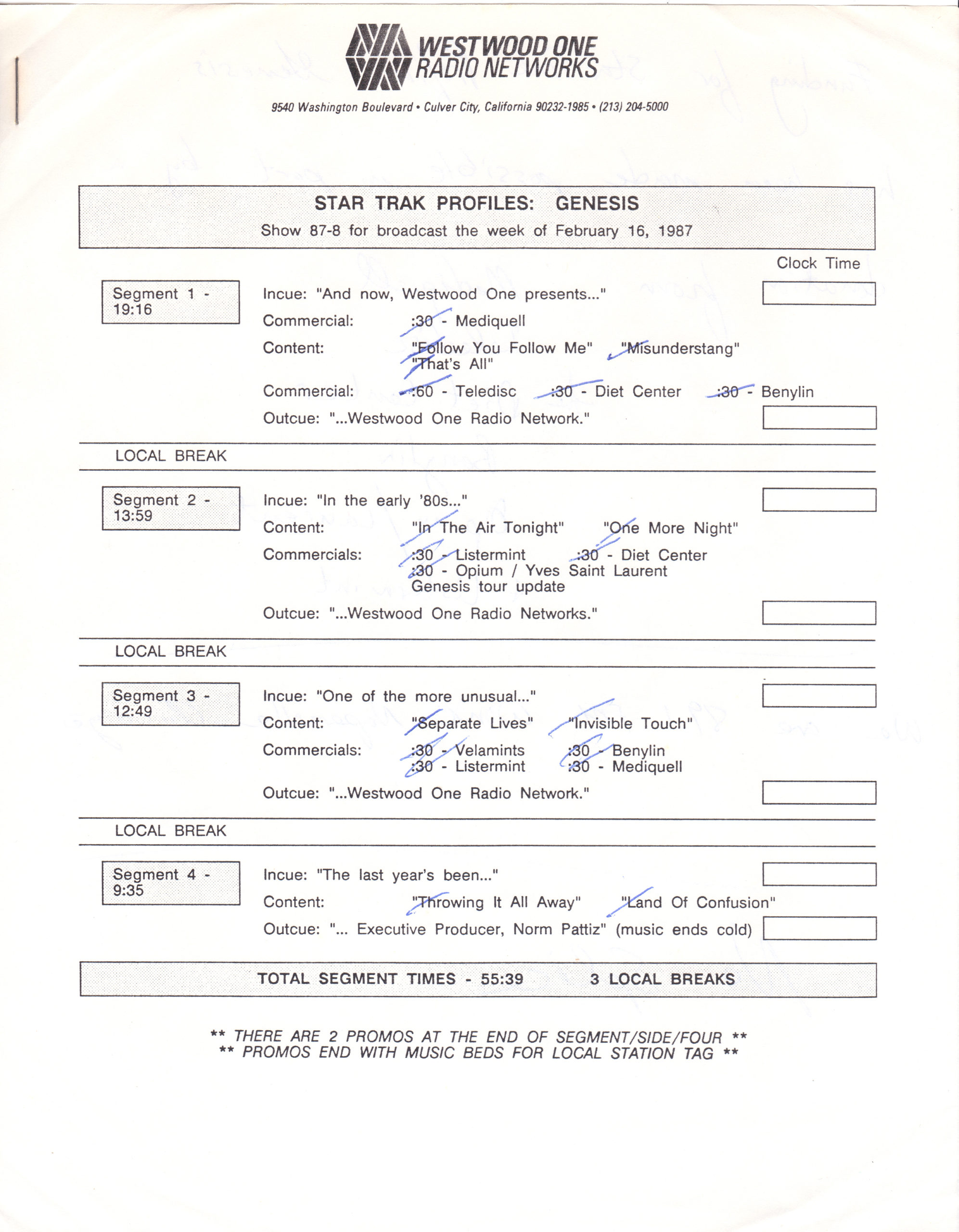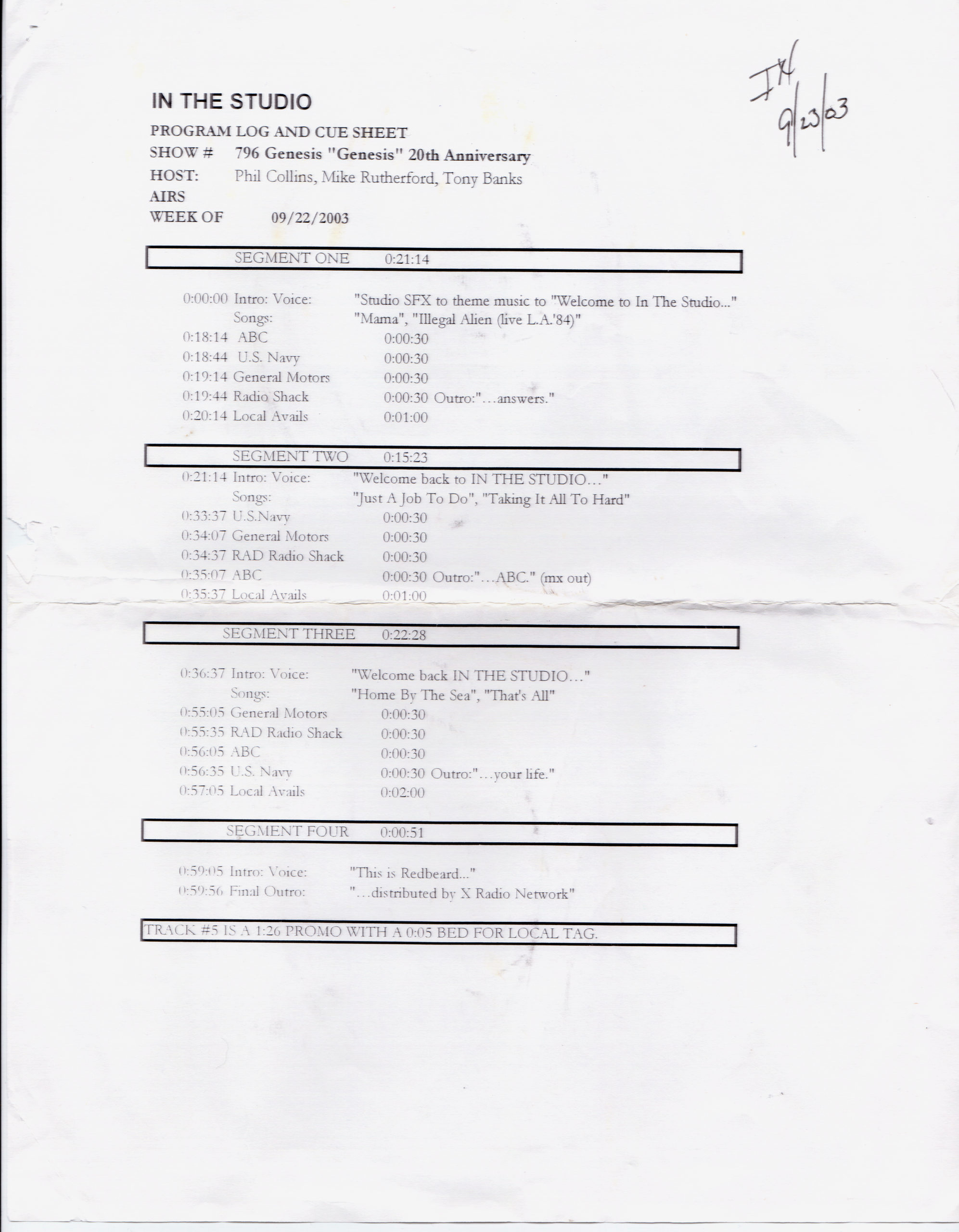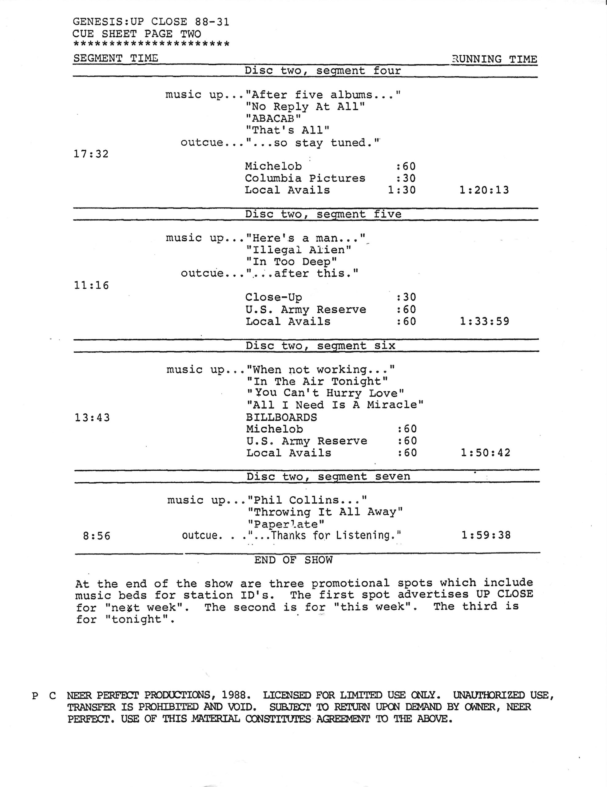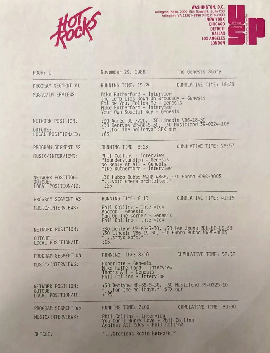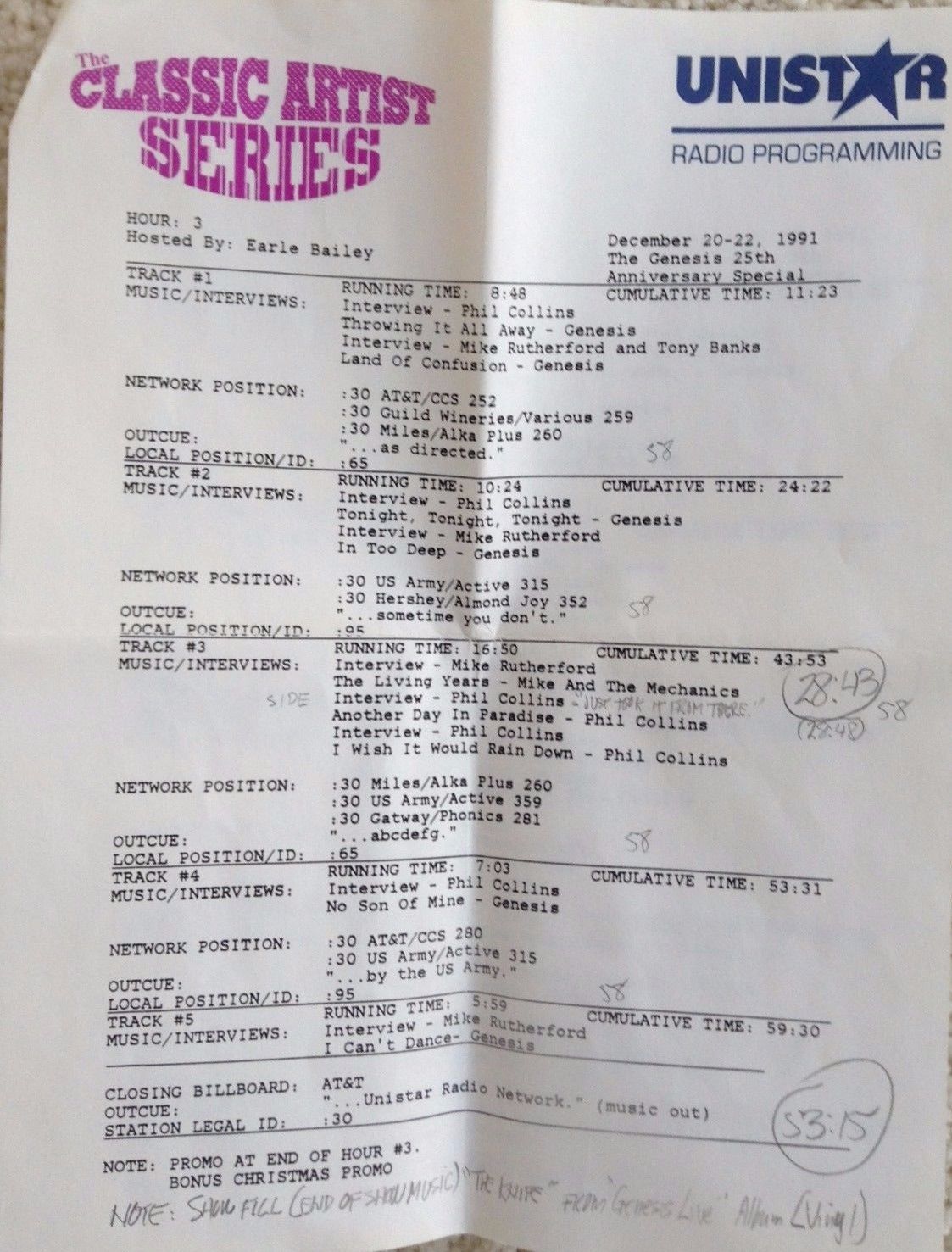 The show contains commercials and studio tracks from several of the band’s albums, plus In The Air Tonight. There are thirty-four tracks on the compact disc, with Tracks 1 – 4 containing the actual interview and song segments, Tracks 5 – 7 are show promo spots, Tracks 8 – 17 are commercial spots, while Tracks 18 – 34 are the actual interview segments separated into individual tracks.