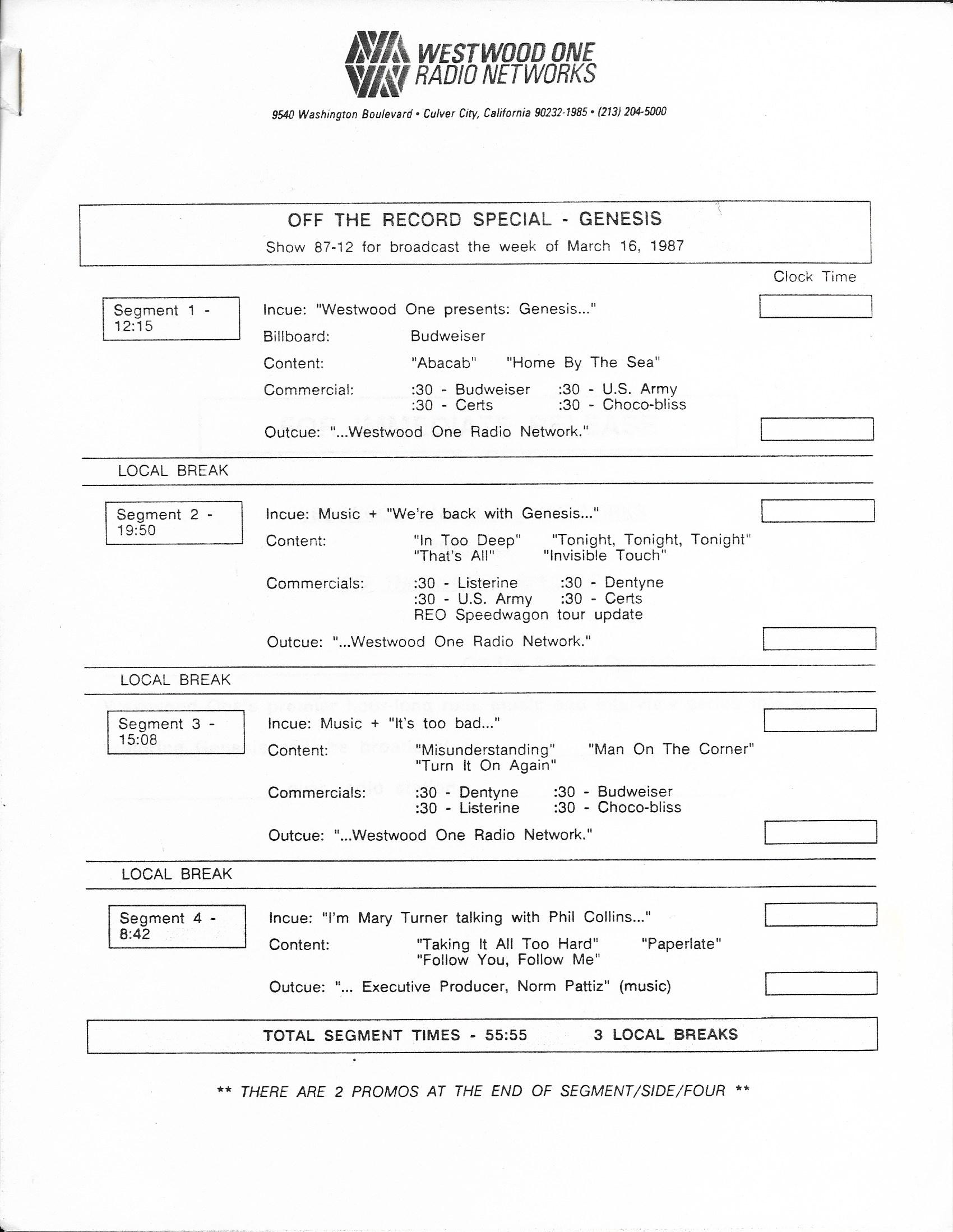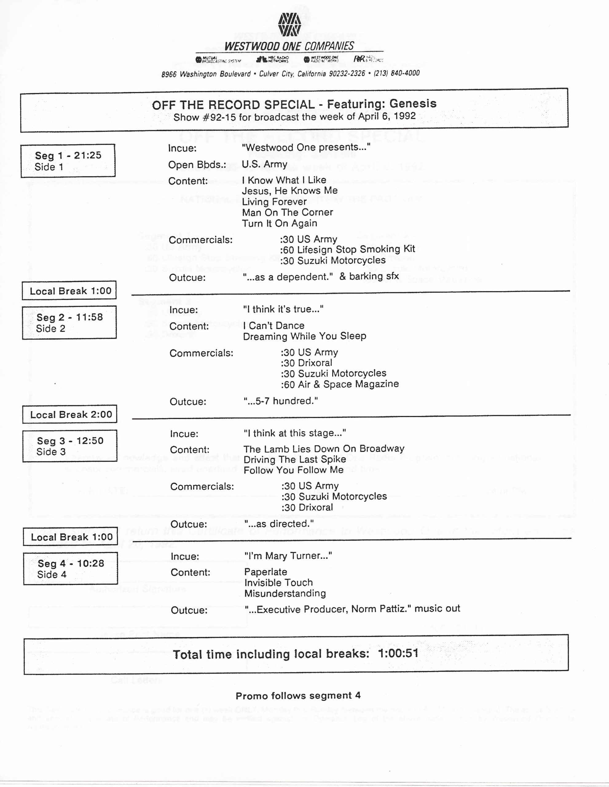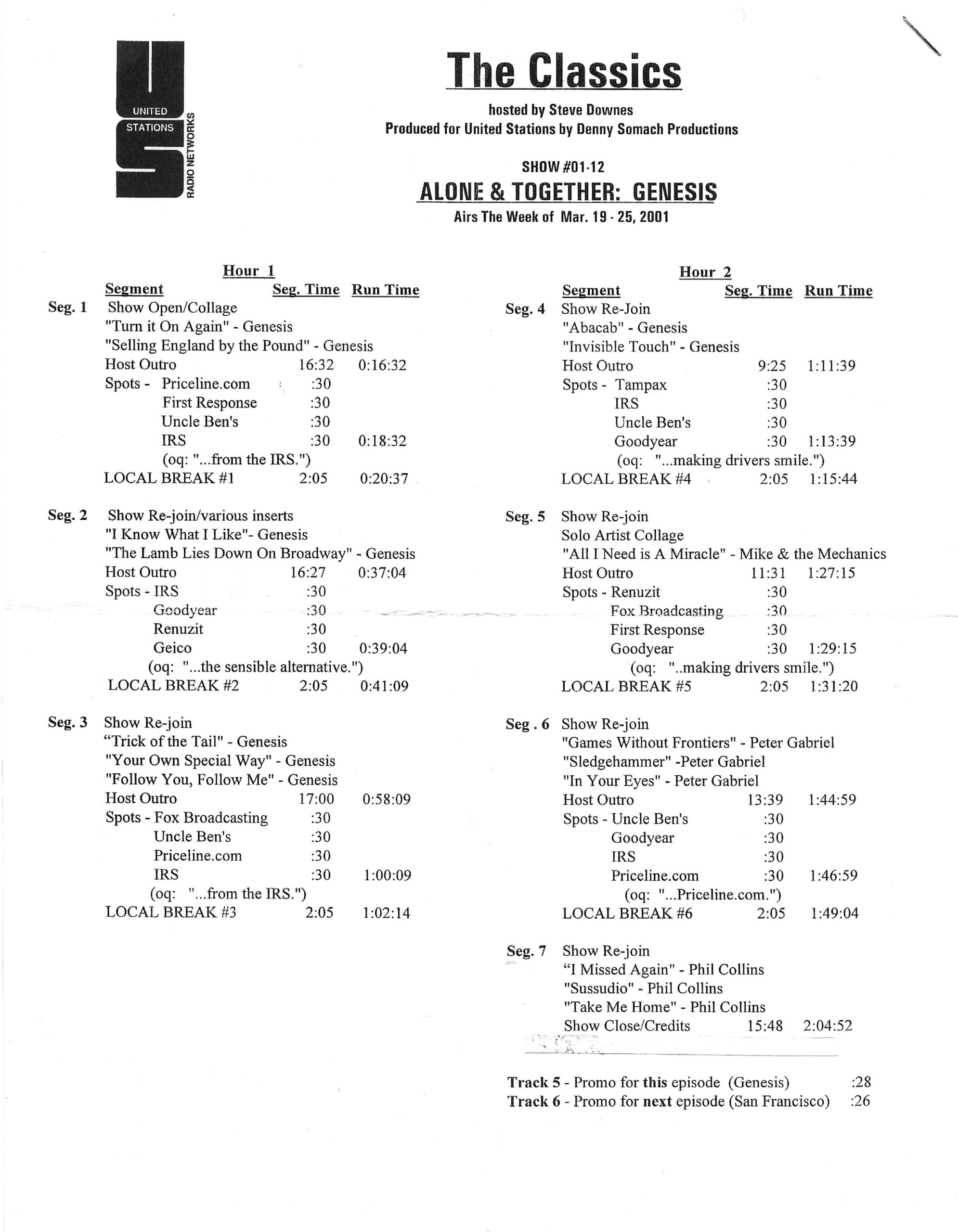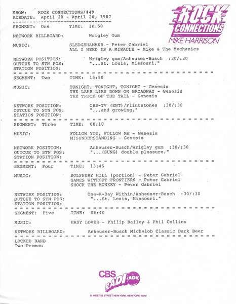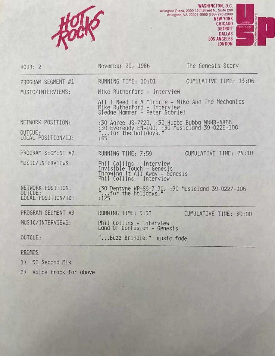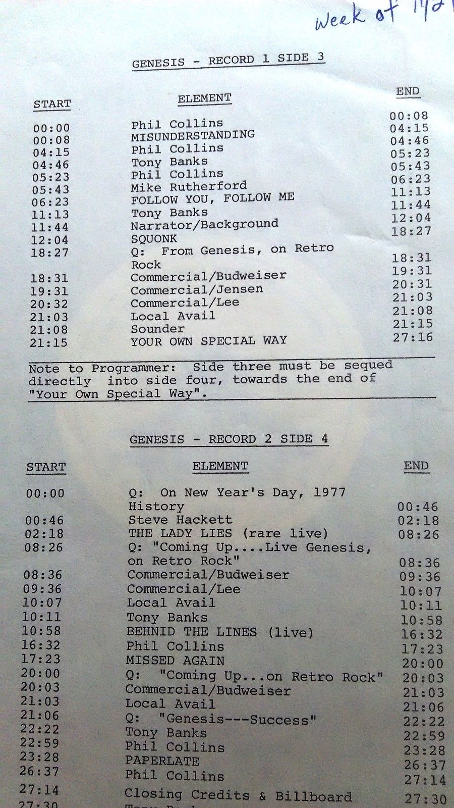 The show contains commercials and studio tracks from several of the band’s albums, plus In The Air Tonight. There are thirty-four tracks on the compact disc, with Tracks 1 – 4 containing the actual interview and song segments, Tracks 5 – 7 are show promo spots, Tracks 8 – 17 are commercial spots, while Tracks 18 – 34 are the actual interview segments separated into individual tracks.