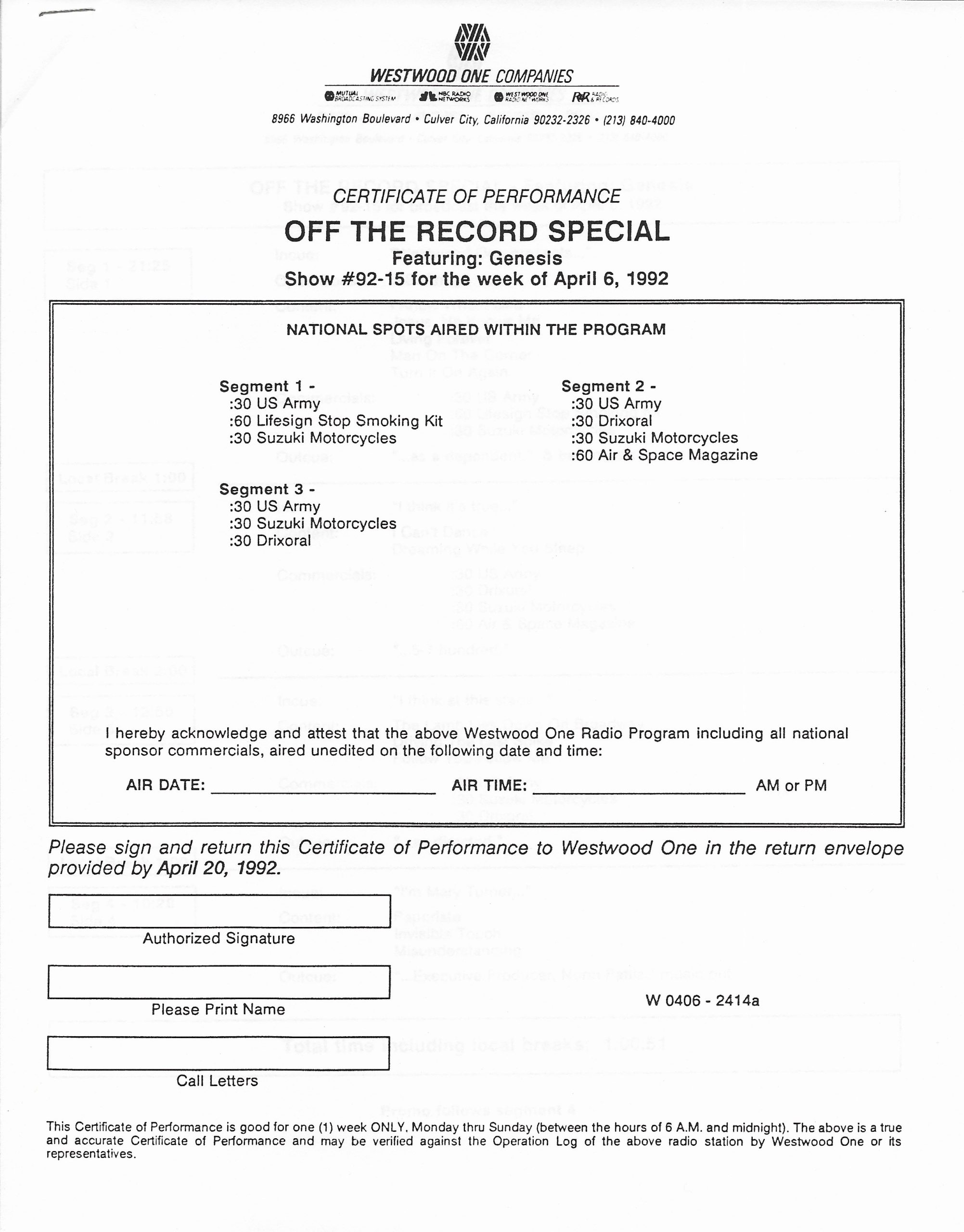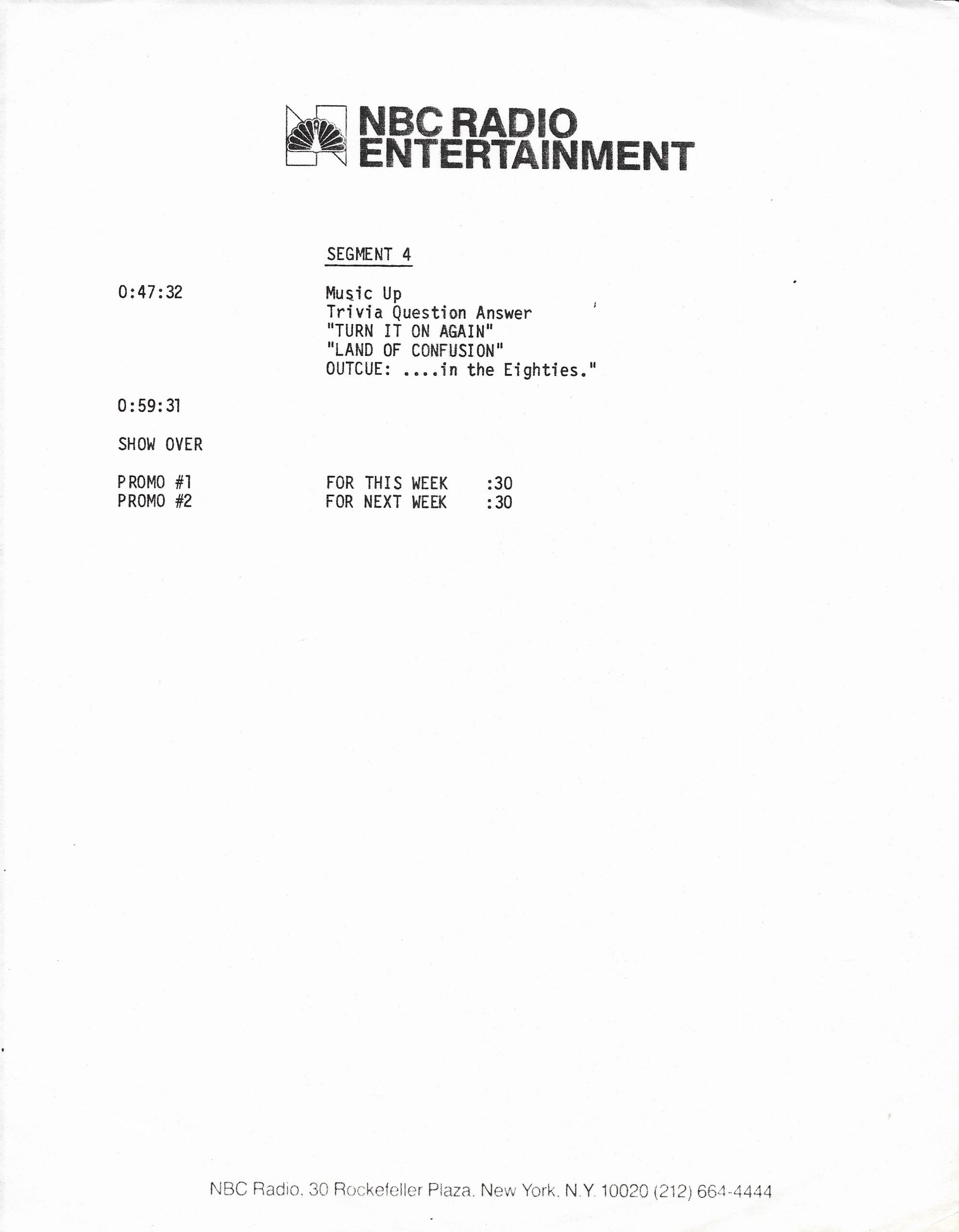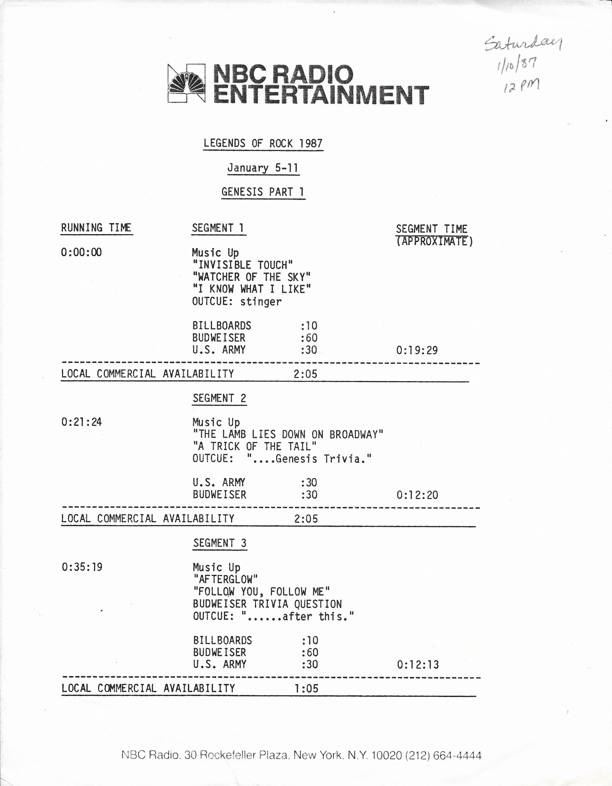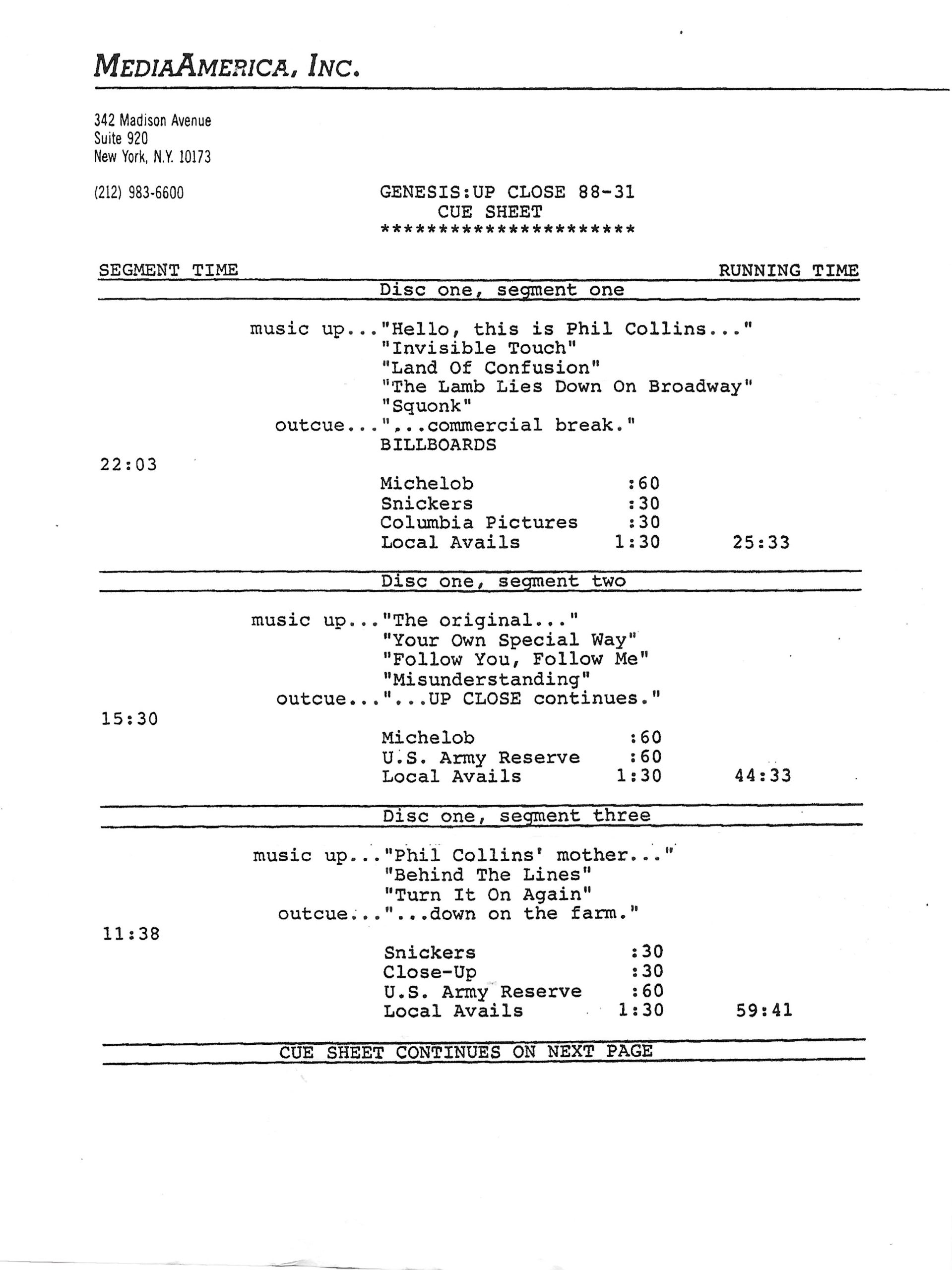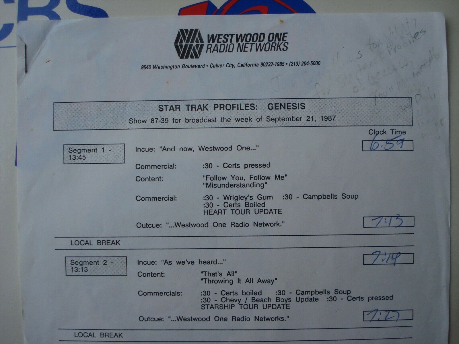 The show contains commercials and studio tracks from several of the band’s albums, plus In The Air Tonight. There are thirty-four tracks on the compact disc, with Tracks 1 – 4 containing the actual interview and song segments, Tracks 5 – 7 are show promo spots, Tracks 8 – 17 are commercial spots, while Tracks 18 – 34 are the actual interview segments separated into individual tracks.