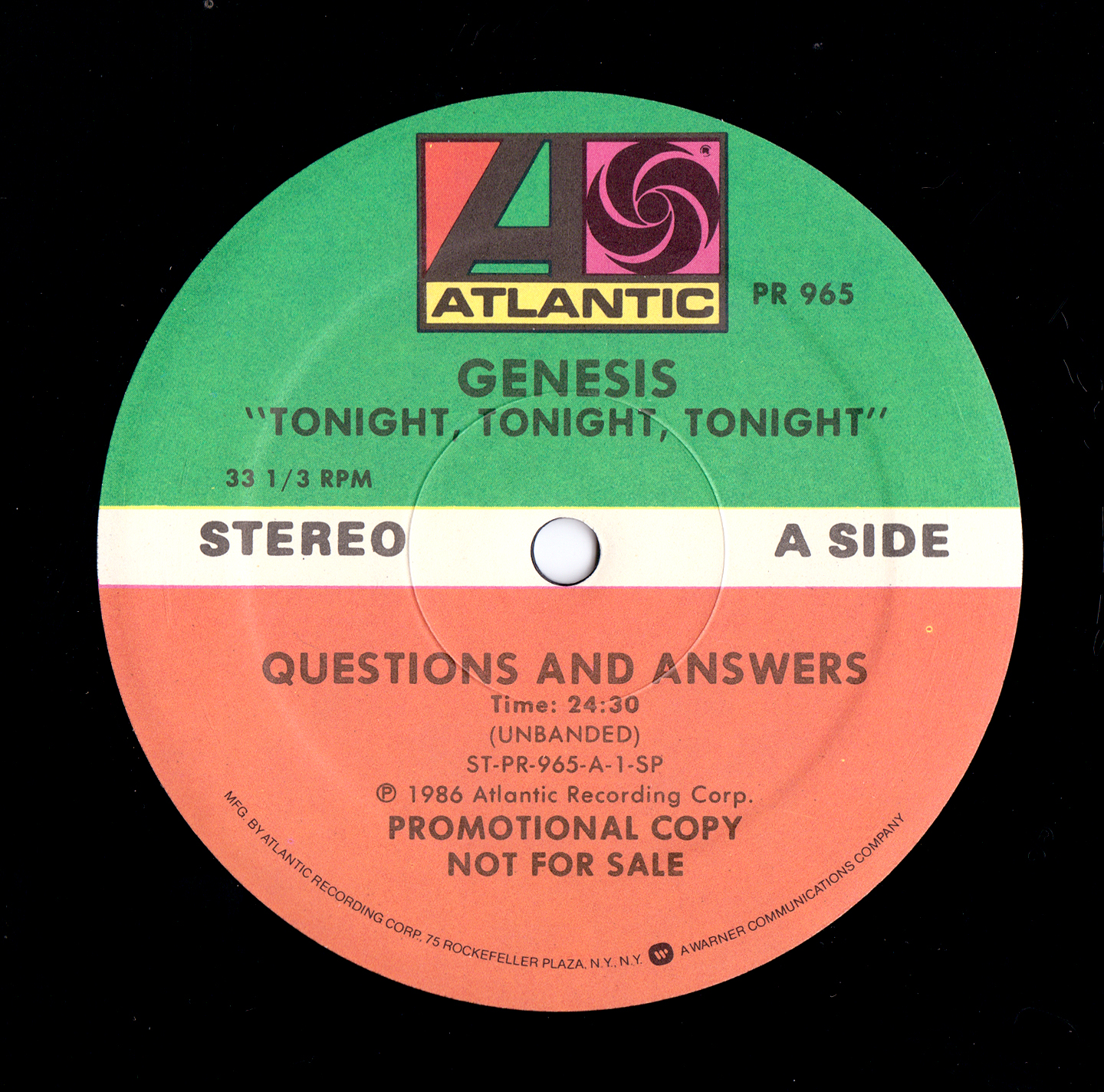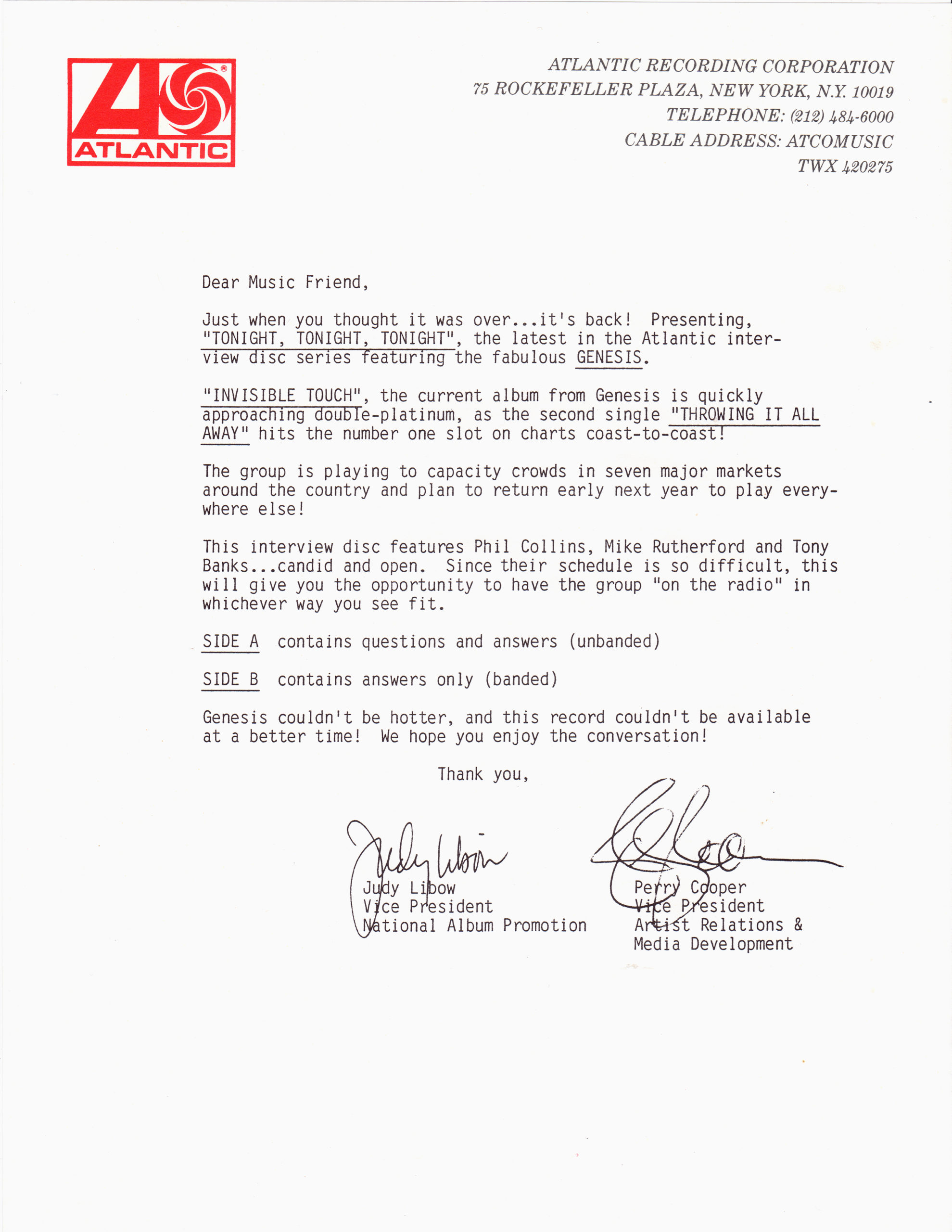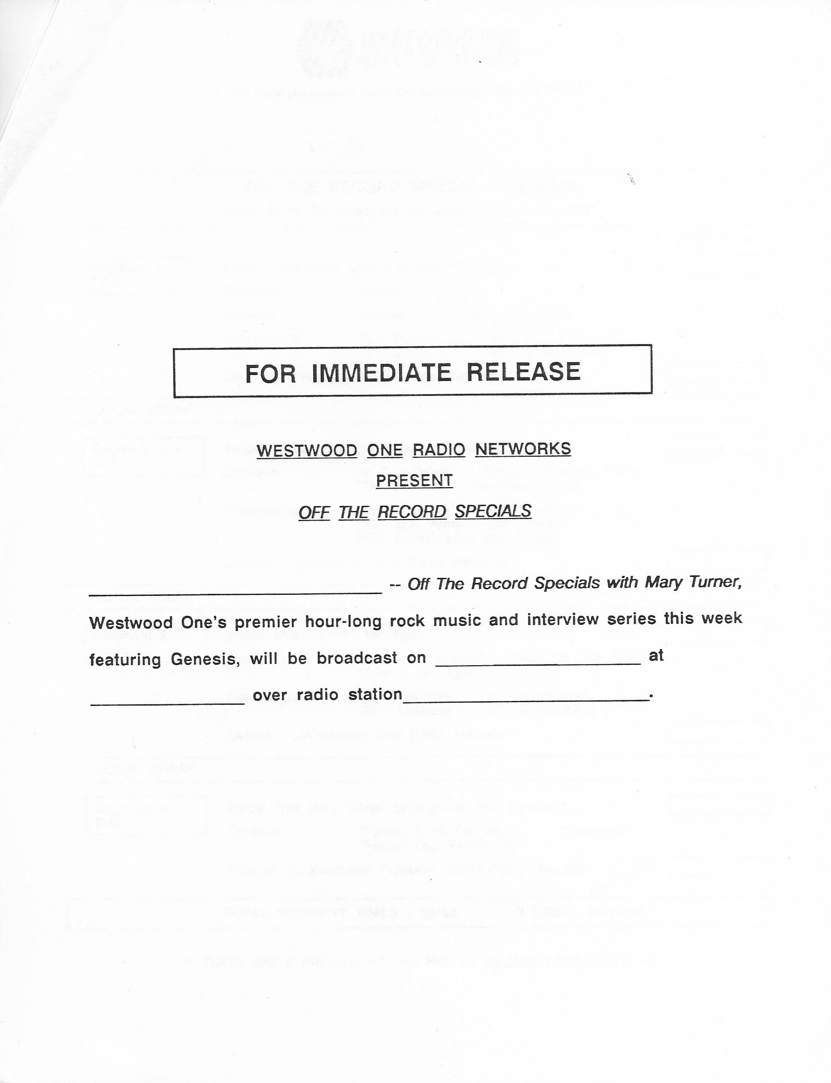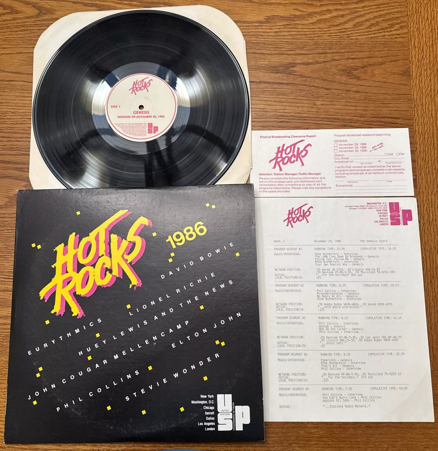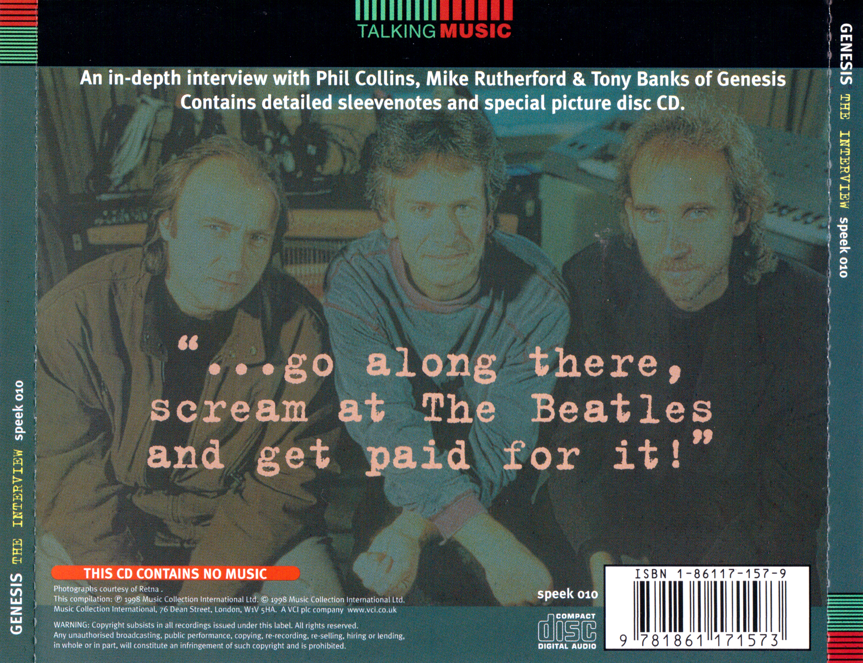 A two-hour hour radio show on two LPs hosted by Meg Griffin and featuring an unidentified male interviewer who provides a detailed history of the band while playing brief interview clips with all three members, plus Peter Gabriel and Steve Hackett. Commercial blocks and studio tracks are included.