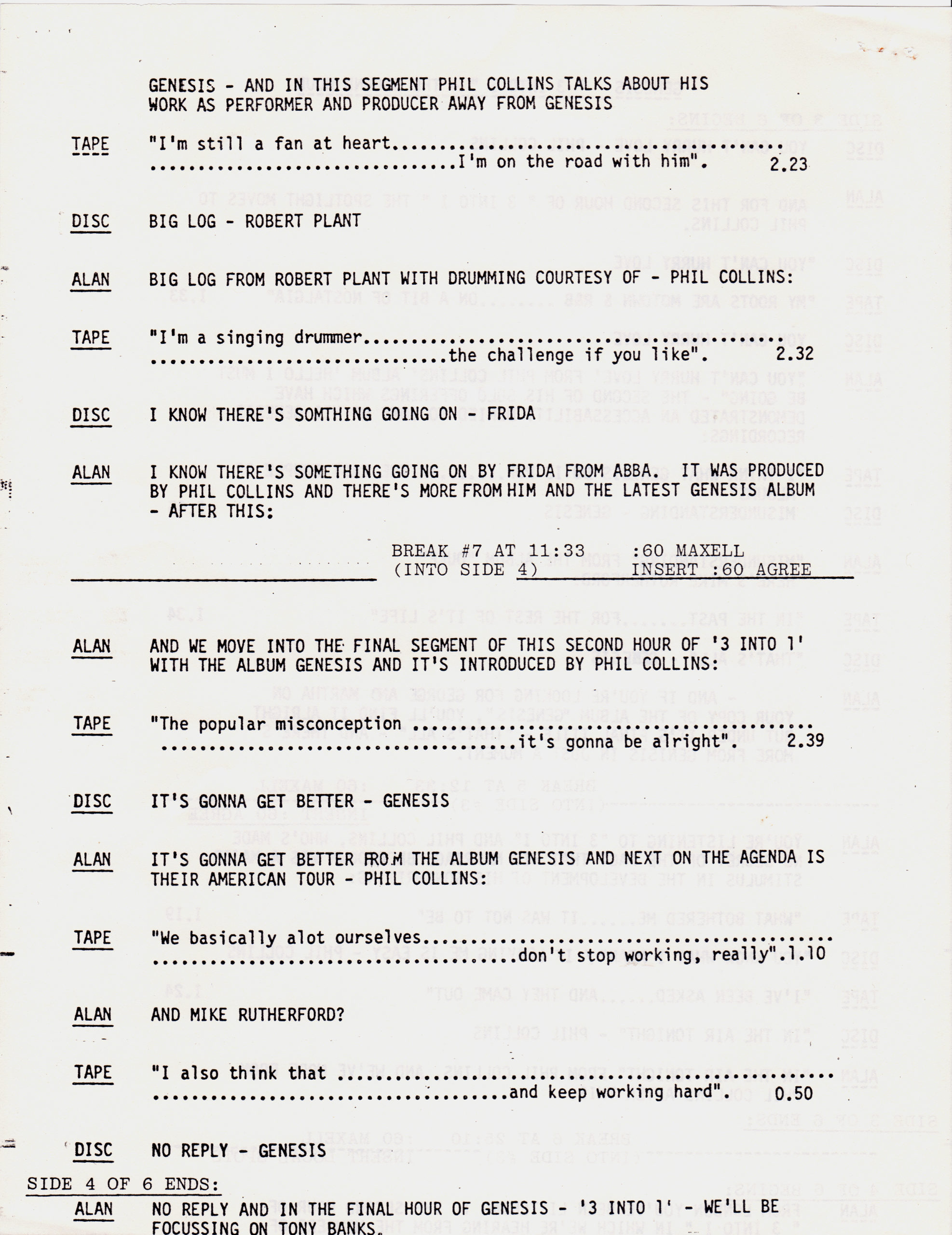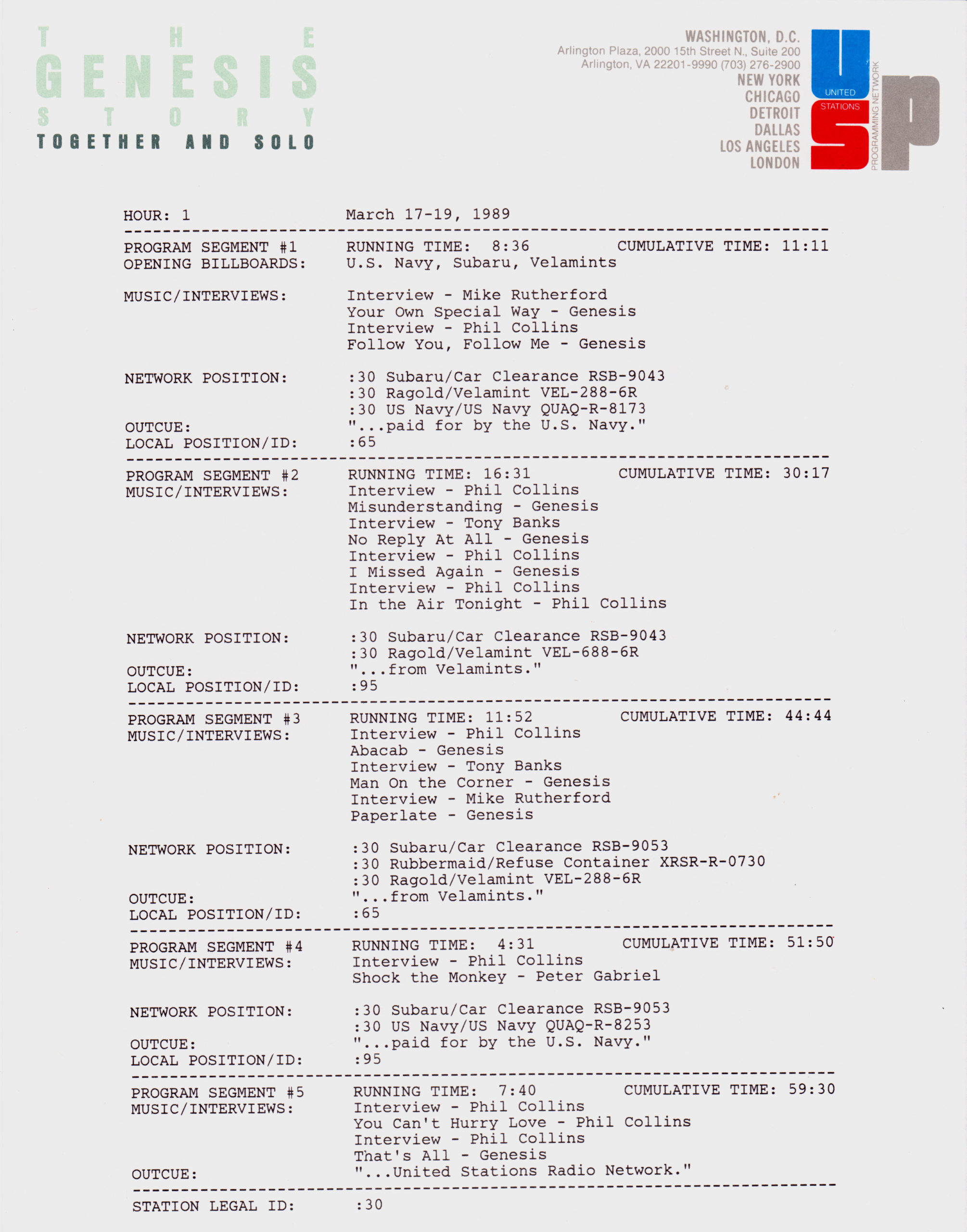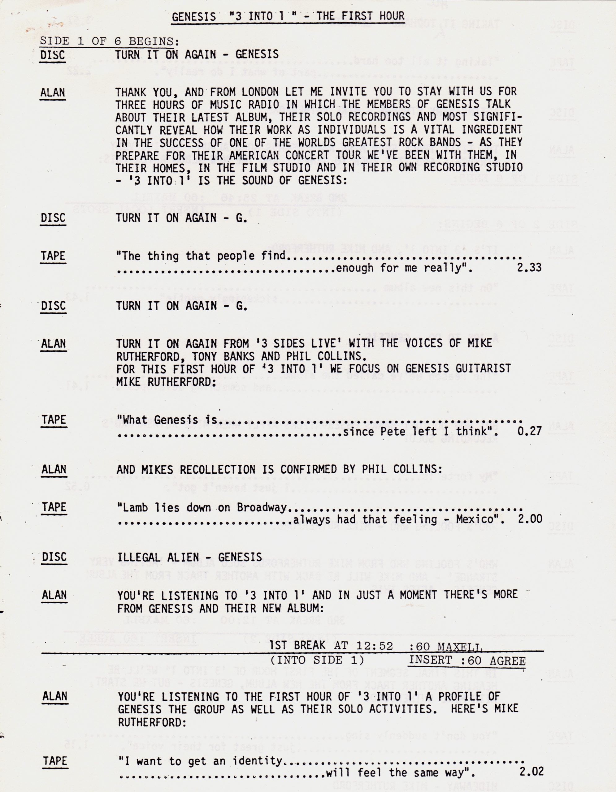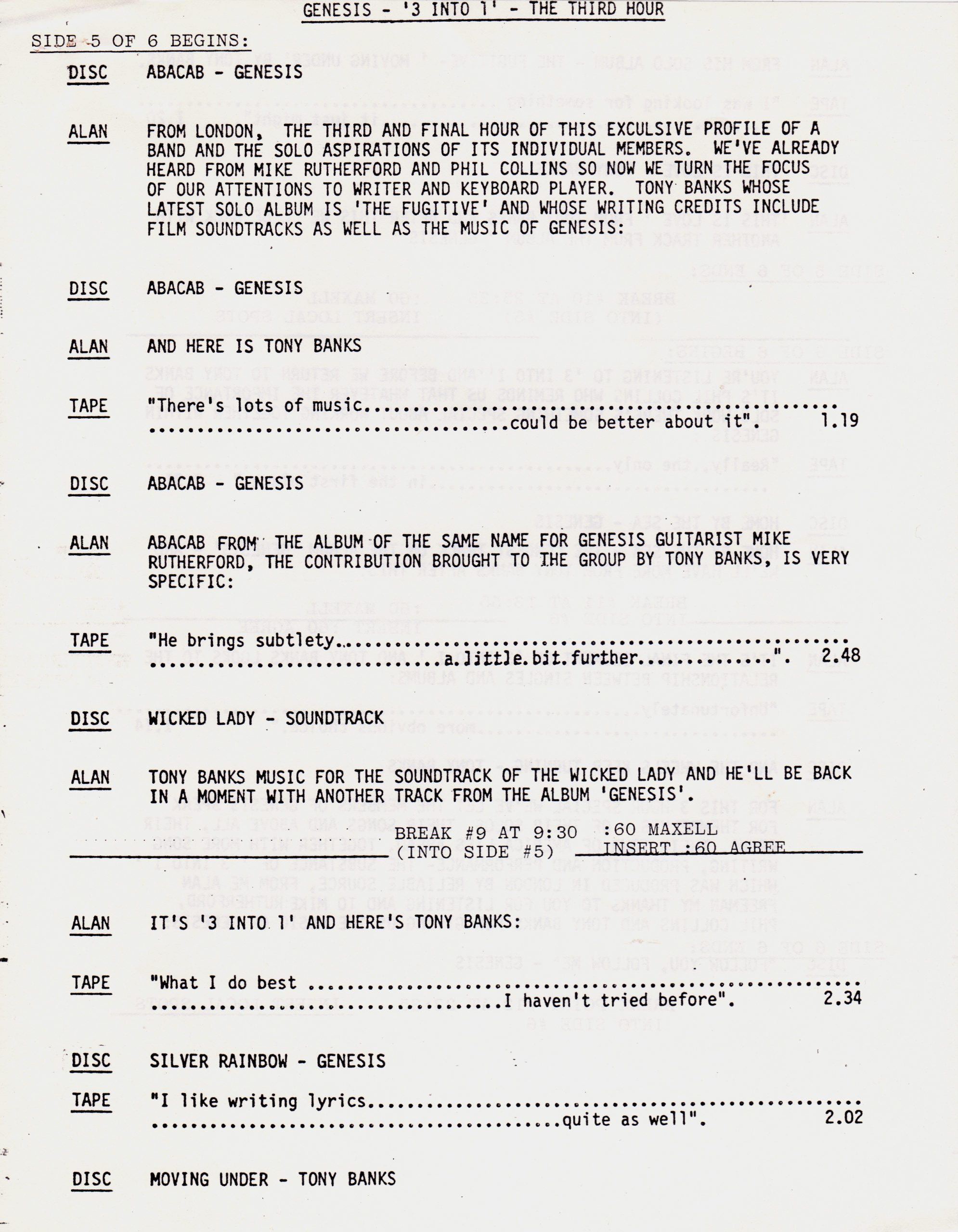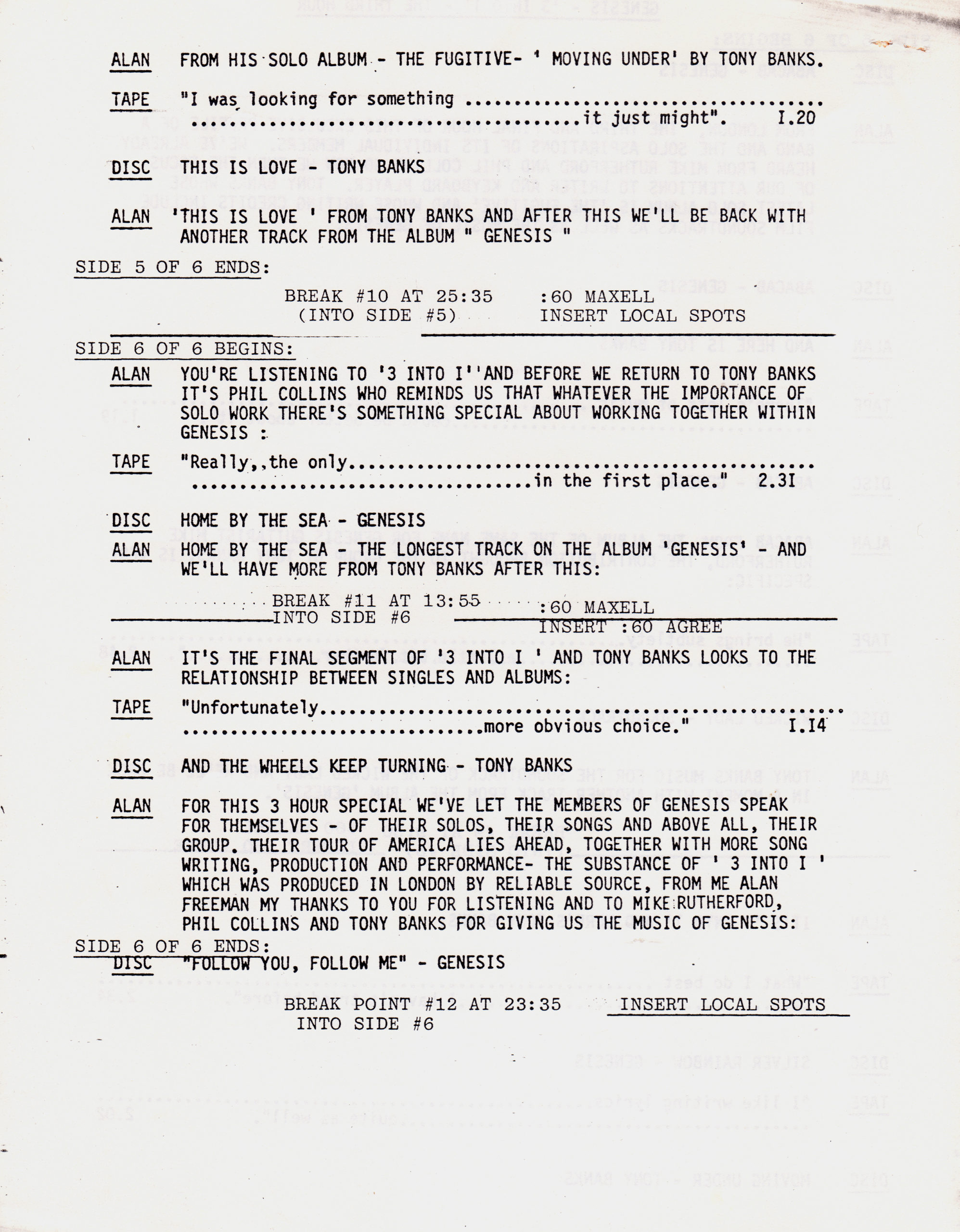 This is a very lengthy show which contains a detailed overview of the band’s history up to that point, as well as lots of information about each member’s solo career. The show is divided into three parts, one for each of the band members. Hour One (Sides A & B) focuses on Mike Rutherford, Hour Two (Sides C & D) on Phil Collins and Hour Three (Sides E & F) on Tony Banks.
