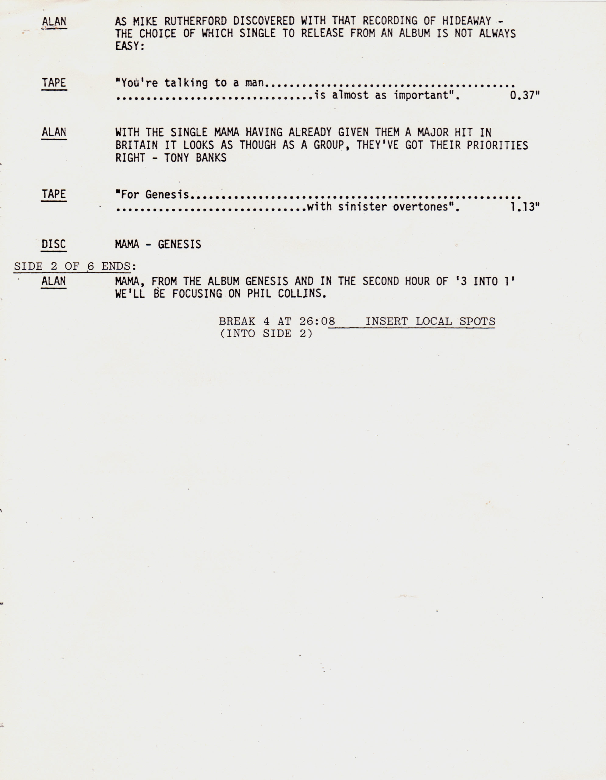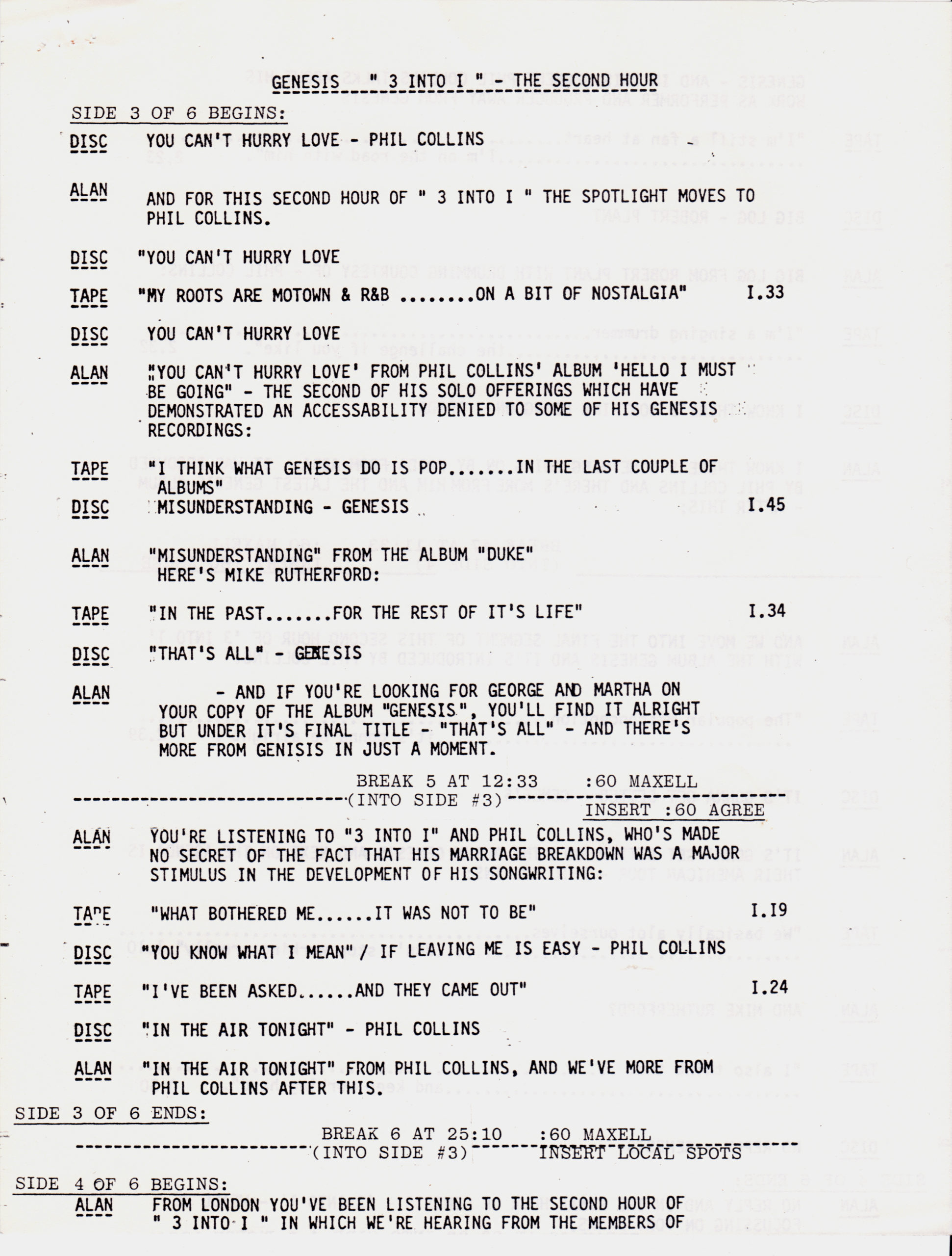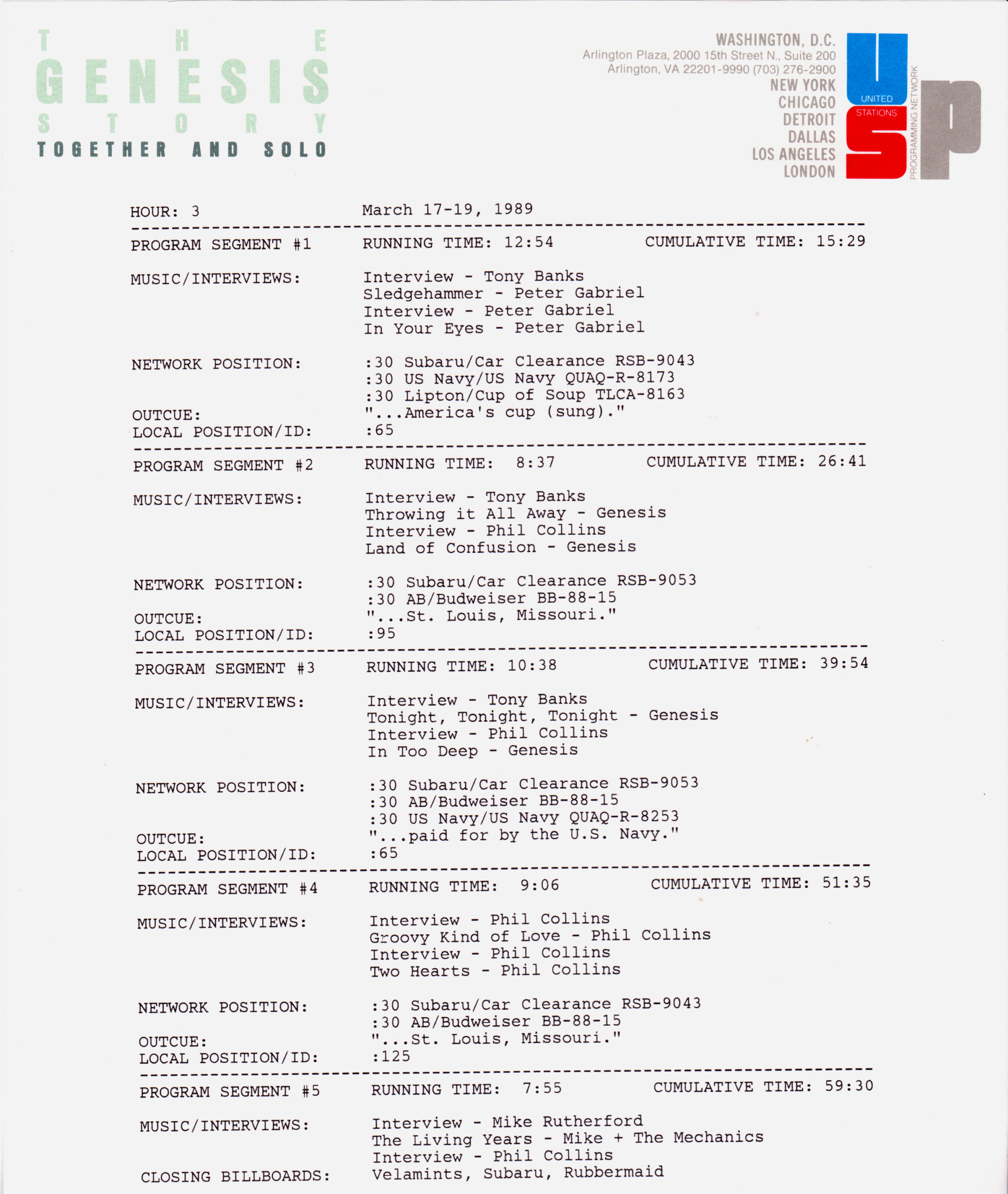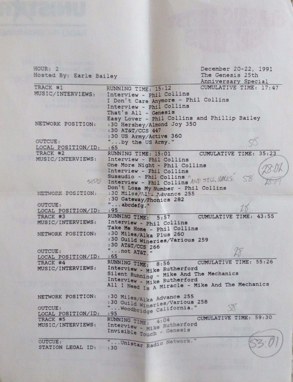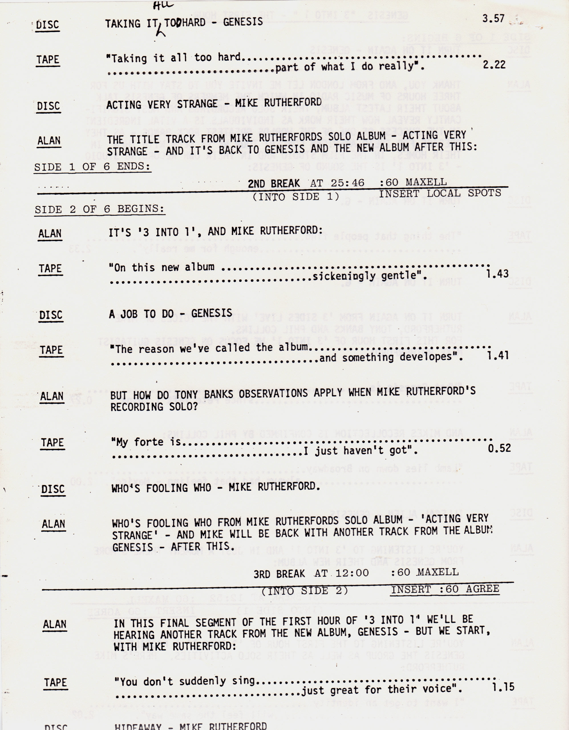 This is a very lengthy show which contains a detailed overview of the band’s history up to that point, as well as lots of information about each member’s solo career. The show is divided into three parts, one for each of the band members. Hour One (Sides A & B) focuses on Mike Rutherford, Hour Two (Sides C & D) on Phil Collins and Hour Three (Sides E & F) on Tony Banks.