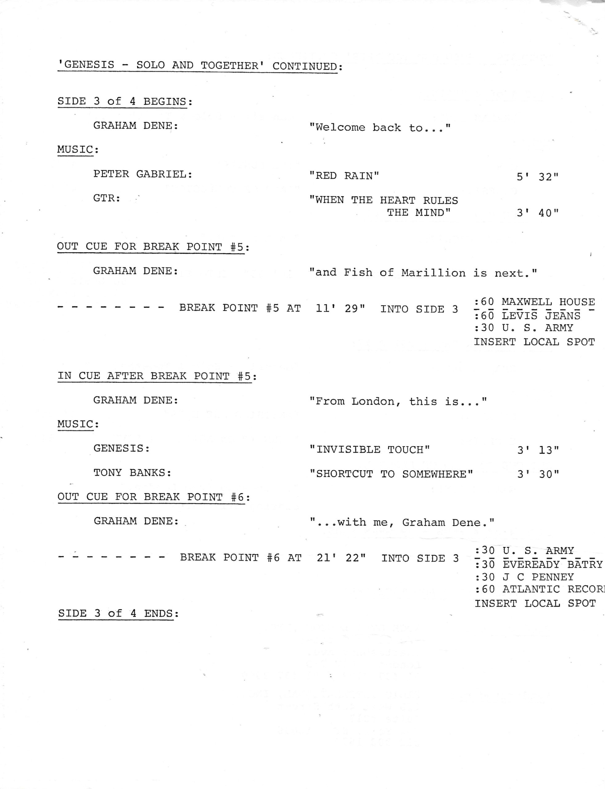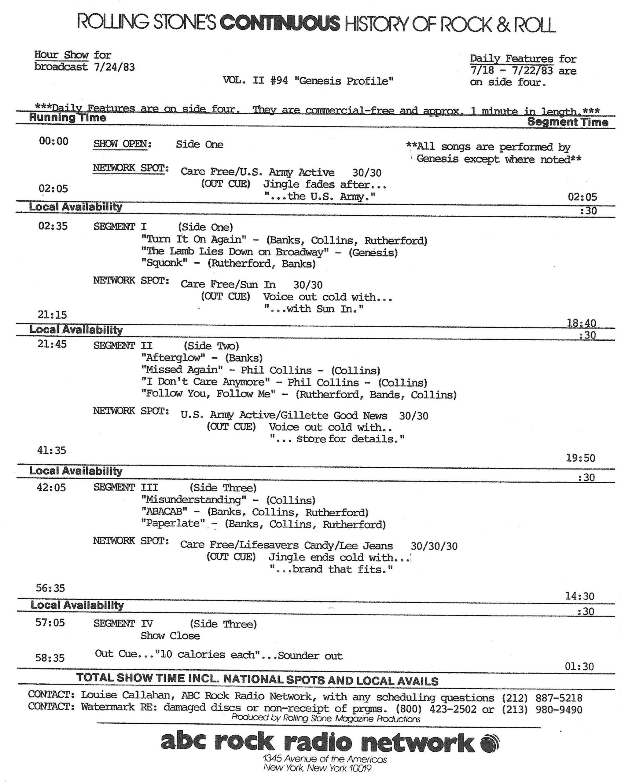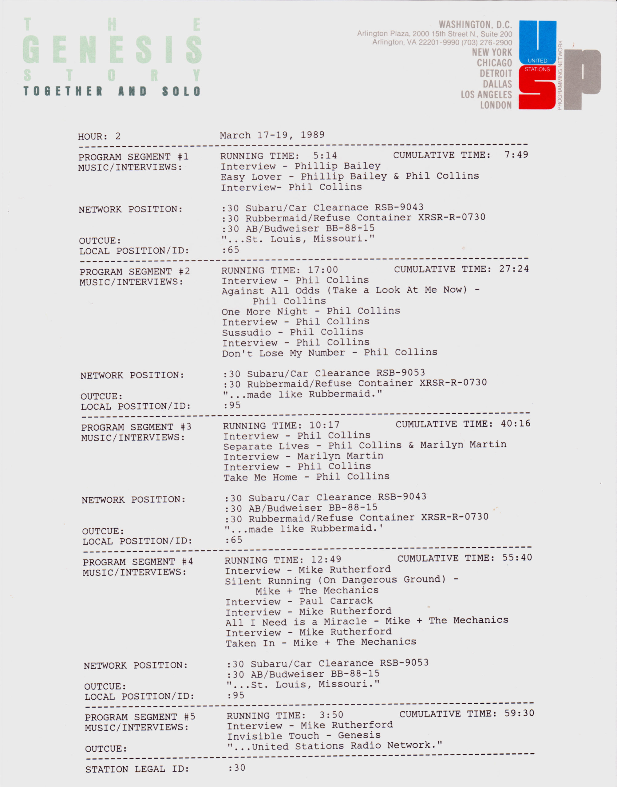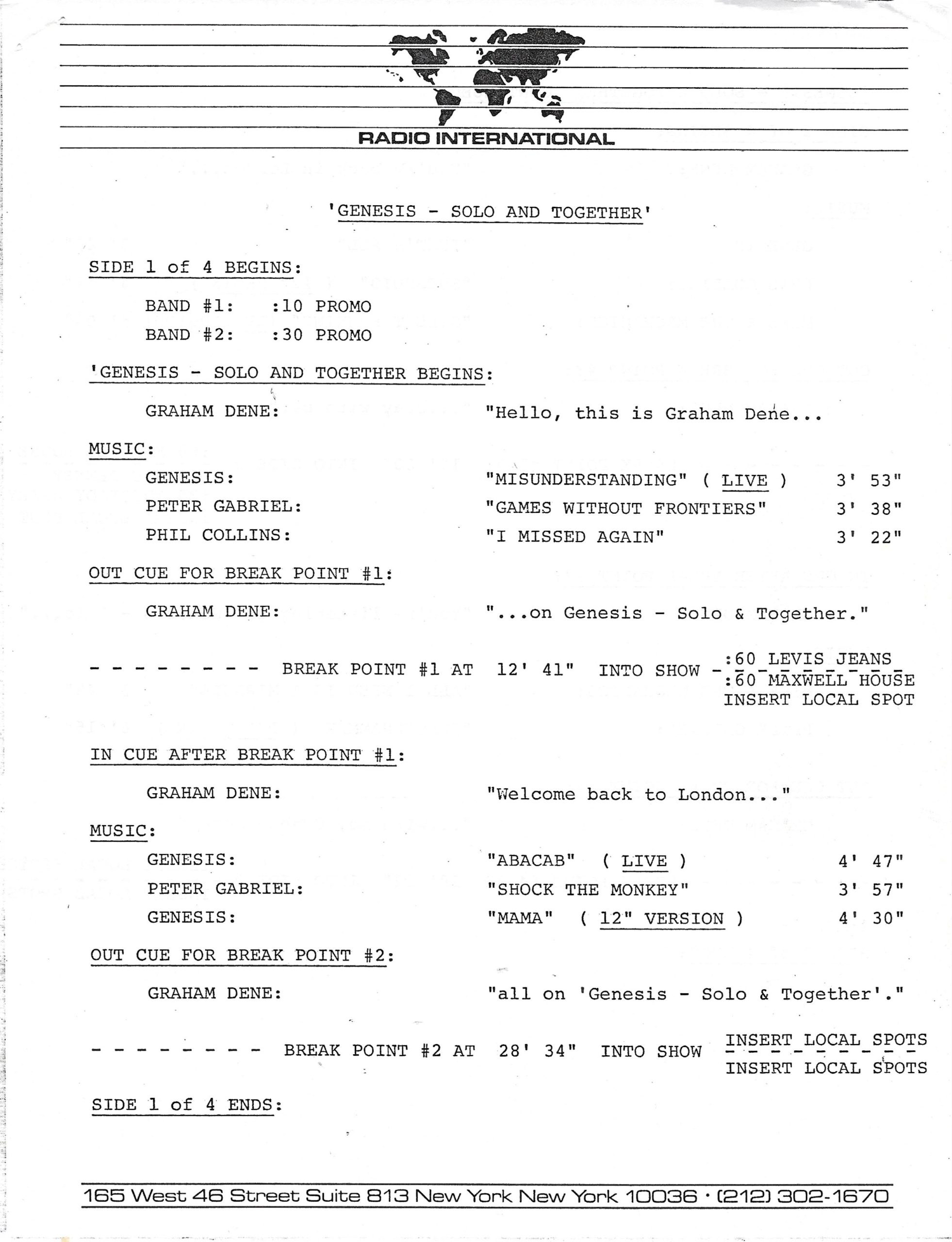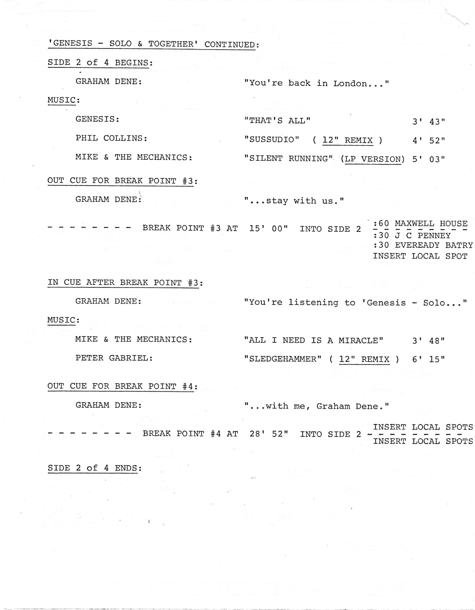 This is a very lengthy show which contains a detailed overview of the band’s history up to that point, as well as lots of information about each member’s solo career. The show is divided into three parts, one for each of the band members. Hour One (Sides A & B) focuses on Mike Rutherford, Hour Two (Sides C & D) on Phil Collins and Hour Three (Sides E & F) on Tony Banks.