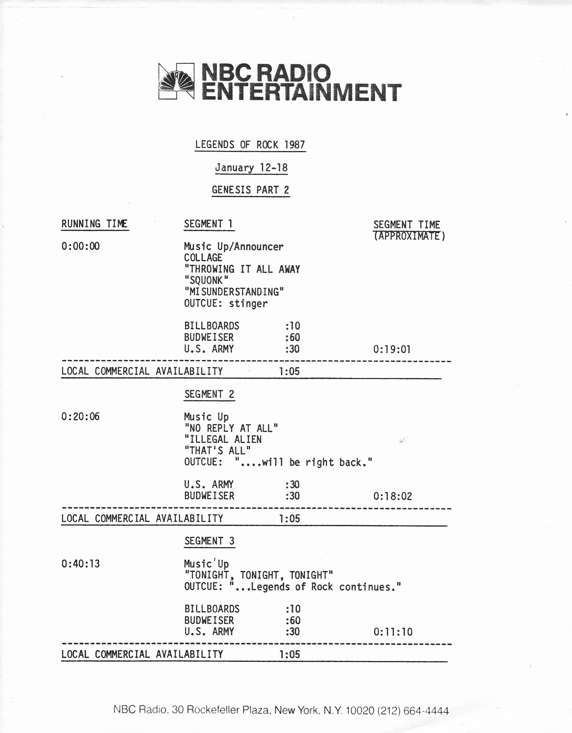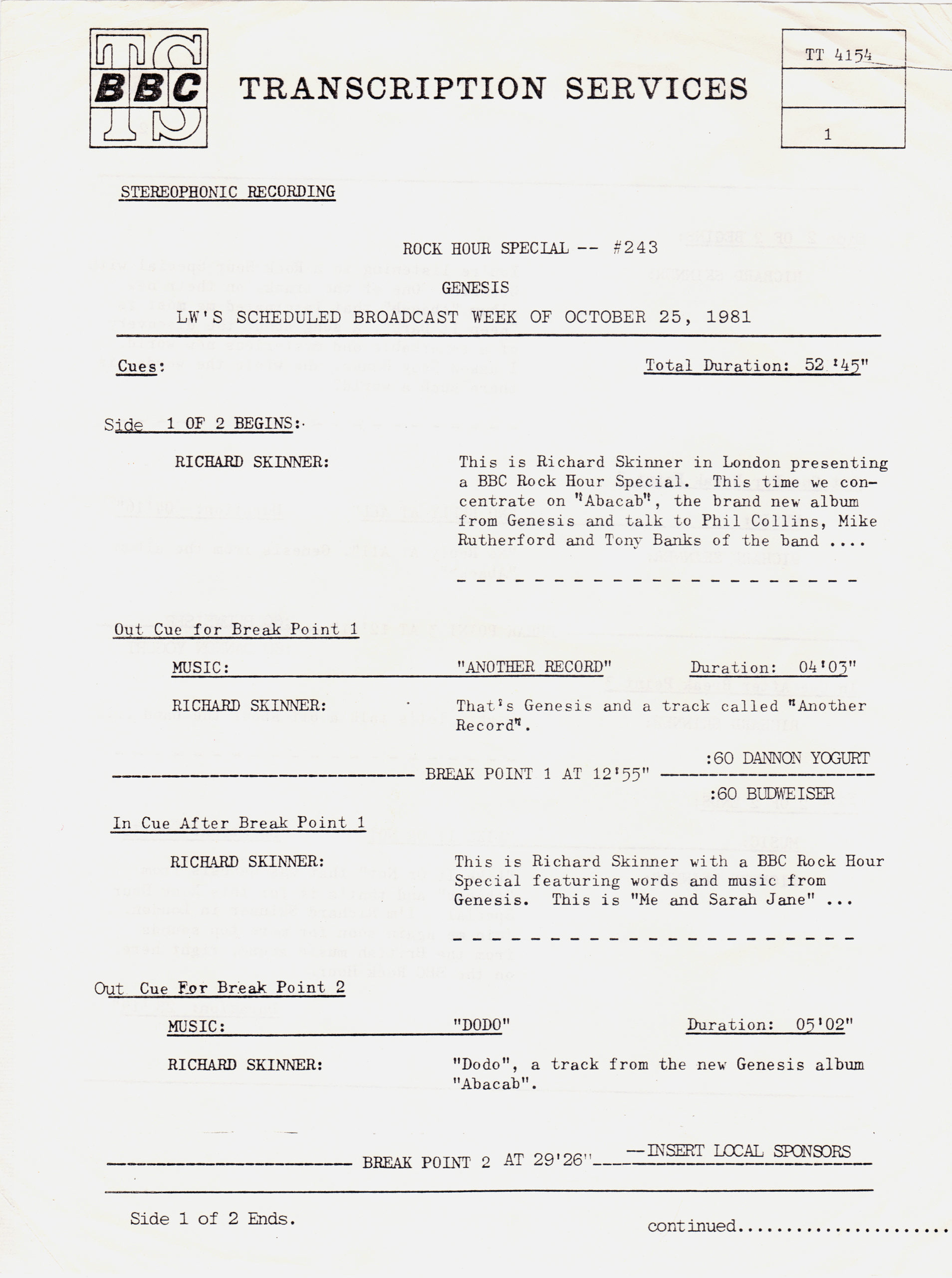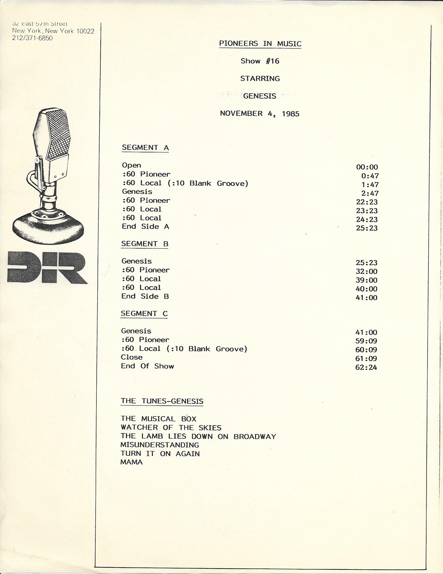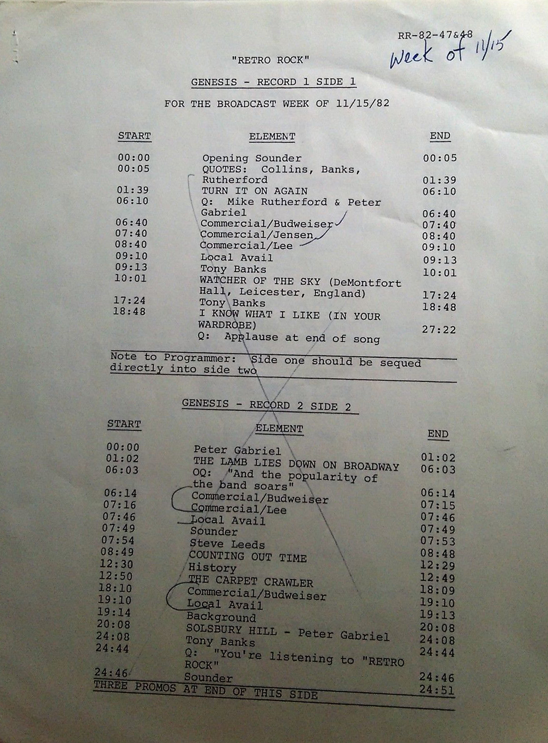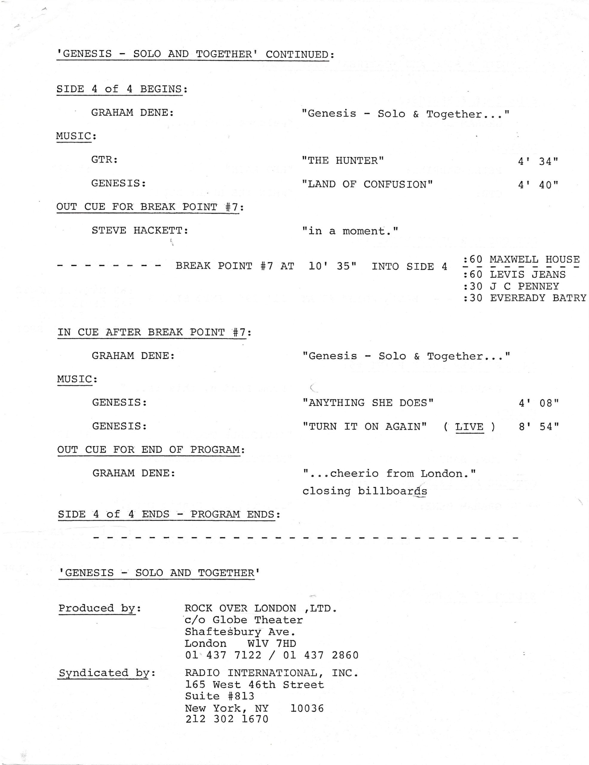 This is a very lengthy show which contains a detailed overview of the band’s history up to that point, as well as lots of information about each member’s solo career. The show is divided into three parts, one for each of the band members. Hour One (Sides A & B) focuses on Mike Rutherford, Hour Two (Sides C & D) on Phil Collins and Hour Three (Sides E & F) on Tony Banks.