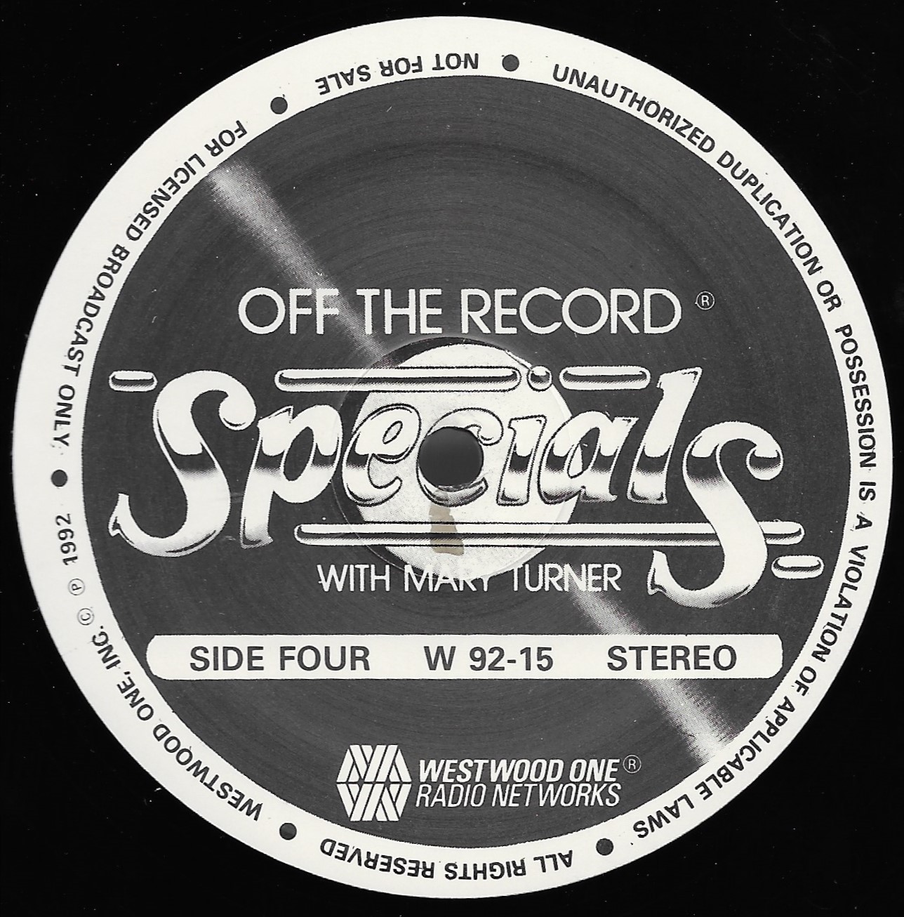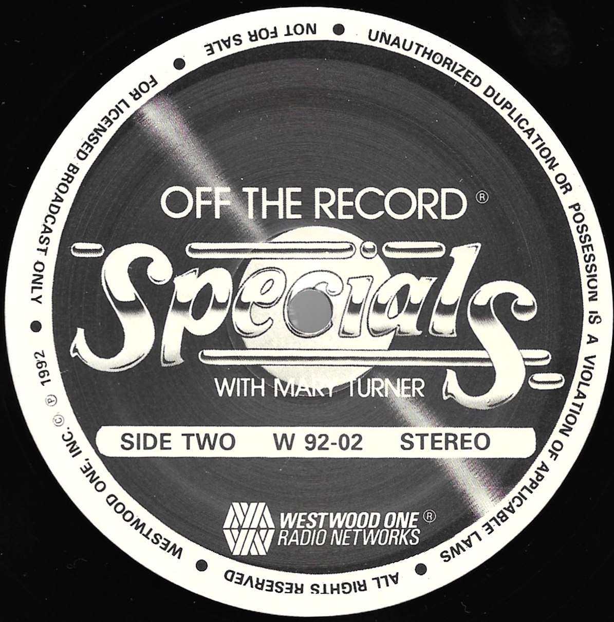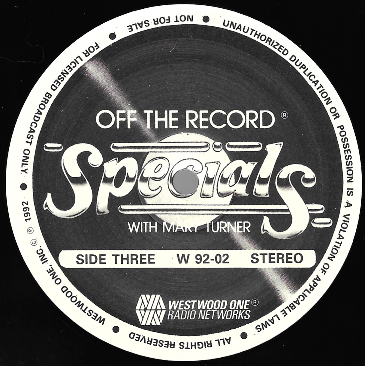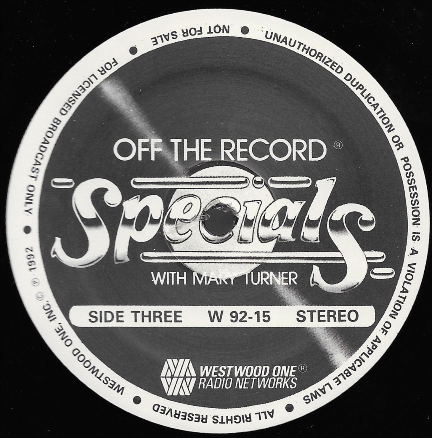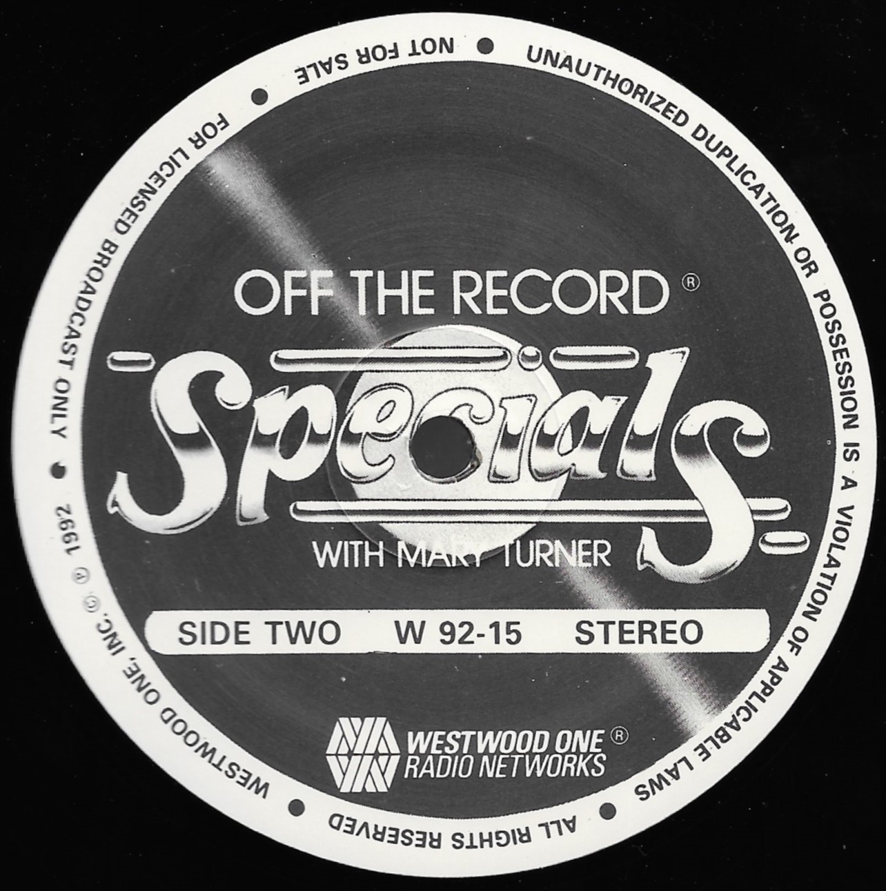 Another entry in the Off The Record Specials series. This show is exactly the same as the above listed OTRSP # 92-03, and thus is Part II of a two-part set. The contents, tracks and interview clips are identical, with only the commercial blocks changing slightly. Released on translucent vinyl. I do not have this item in my personal collection, and have never actually seen a copy for sale, but based on the programming schedule that Westwood One typically utilized this show would follow directly after OTRSP # 92-15.