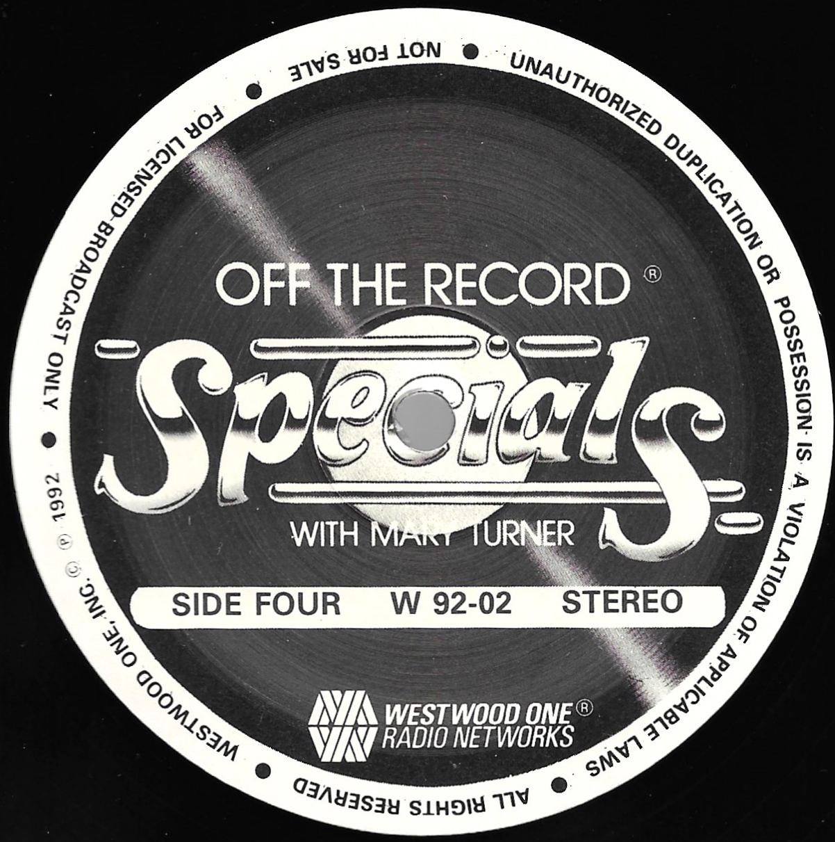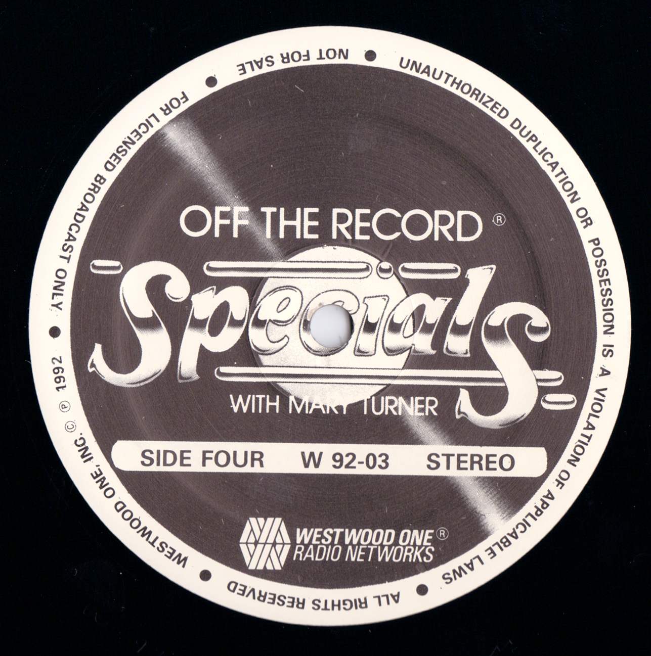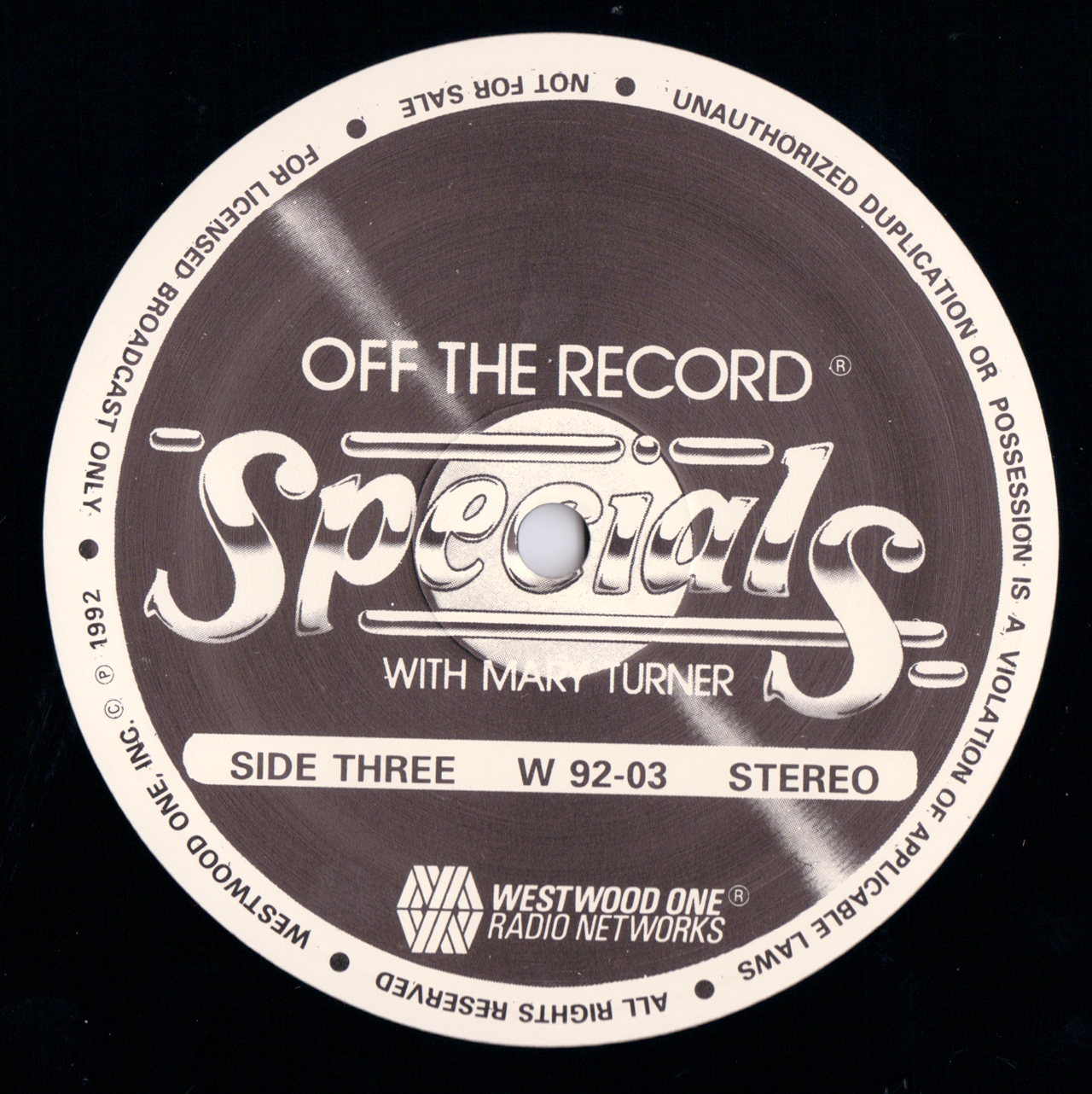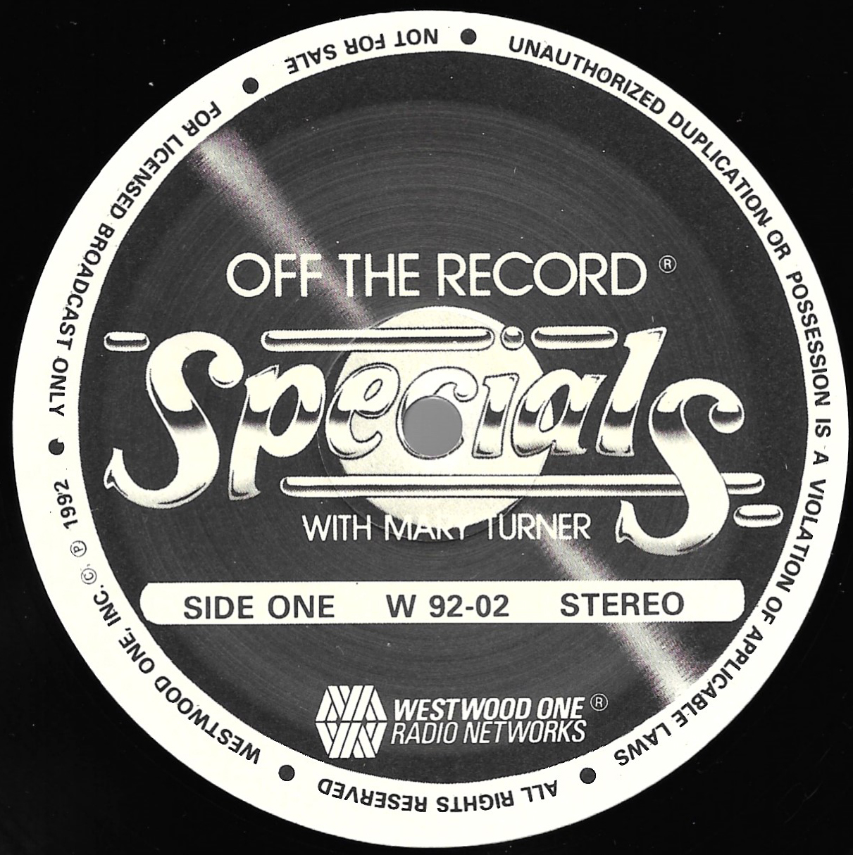 Another entry in the Off The Record Specials series. This show is exactly the same as the above listed OTRSP # 92-03, and thus is Part II of a two-part set. The contents, tracks and interview clips are identical, with only the commercial blocks changing slightly. Released on translucent vinyl. I do not have this item in my personal collection, and have never actually seen a copy for sale, but based on the programming schedule that Westwood One typically utilized this show would follow directly after OTRSP # 92-15.