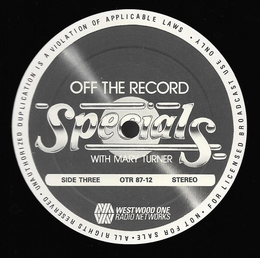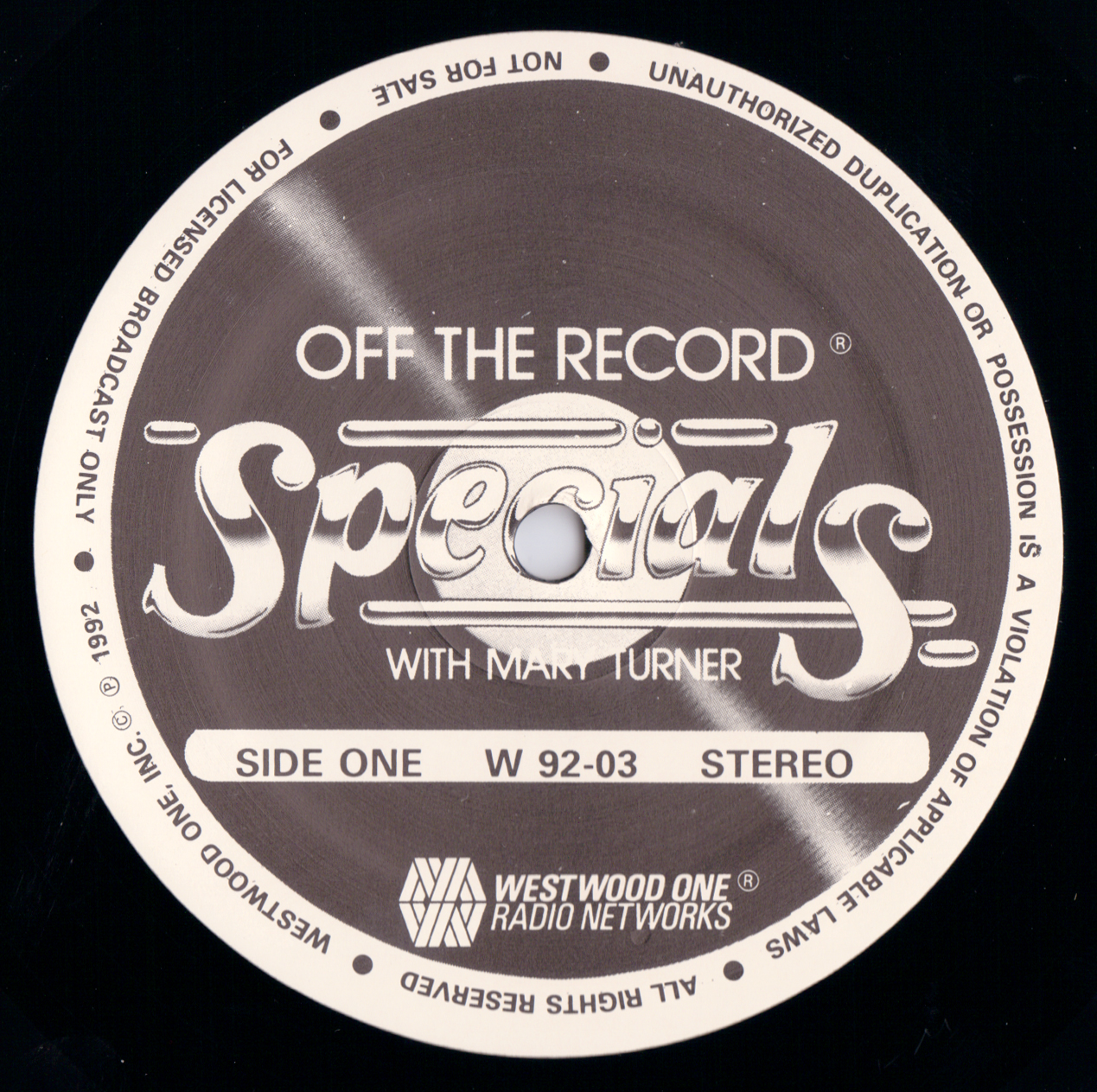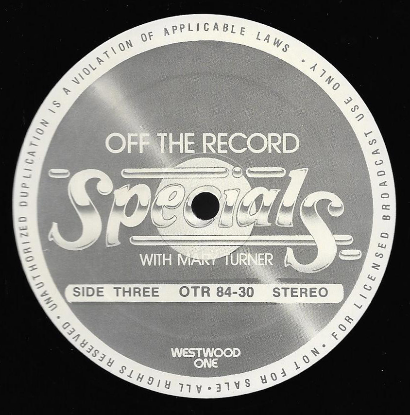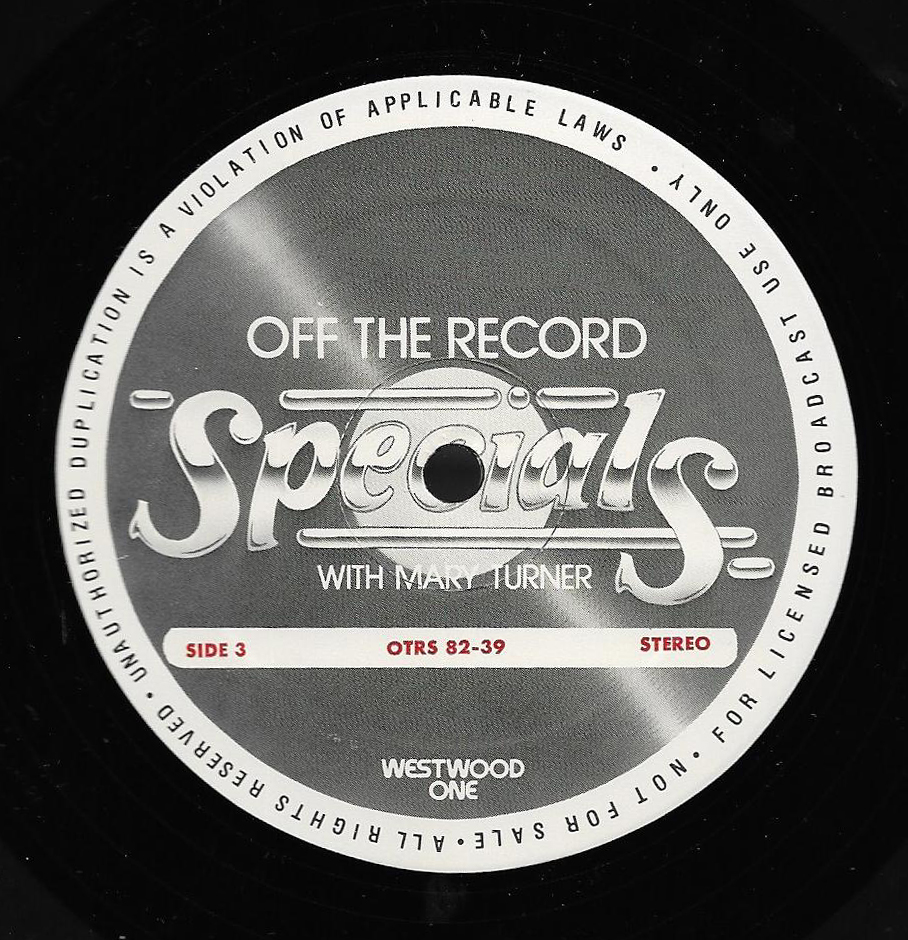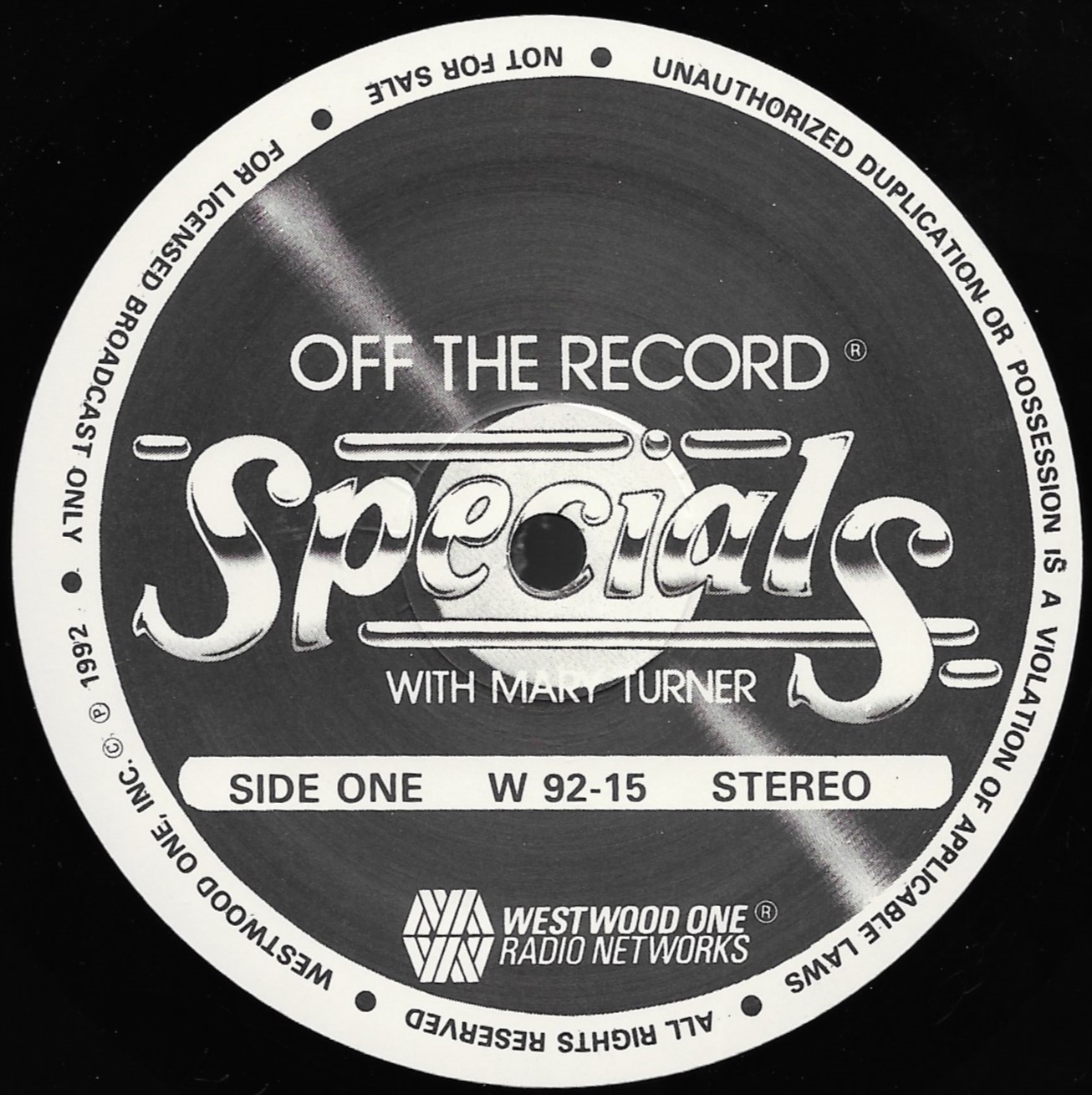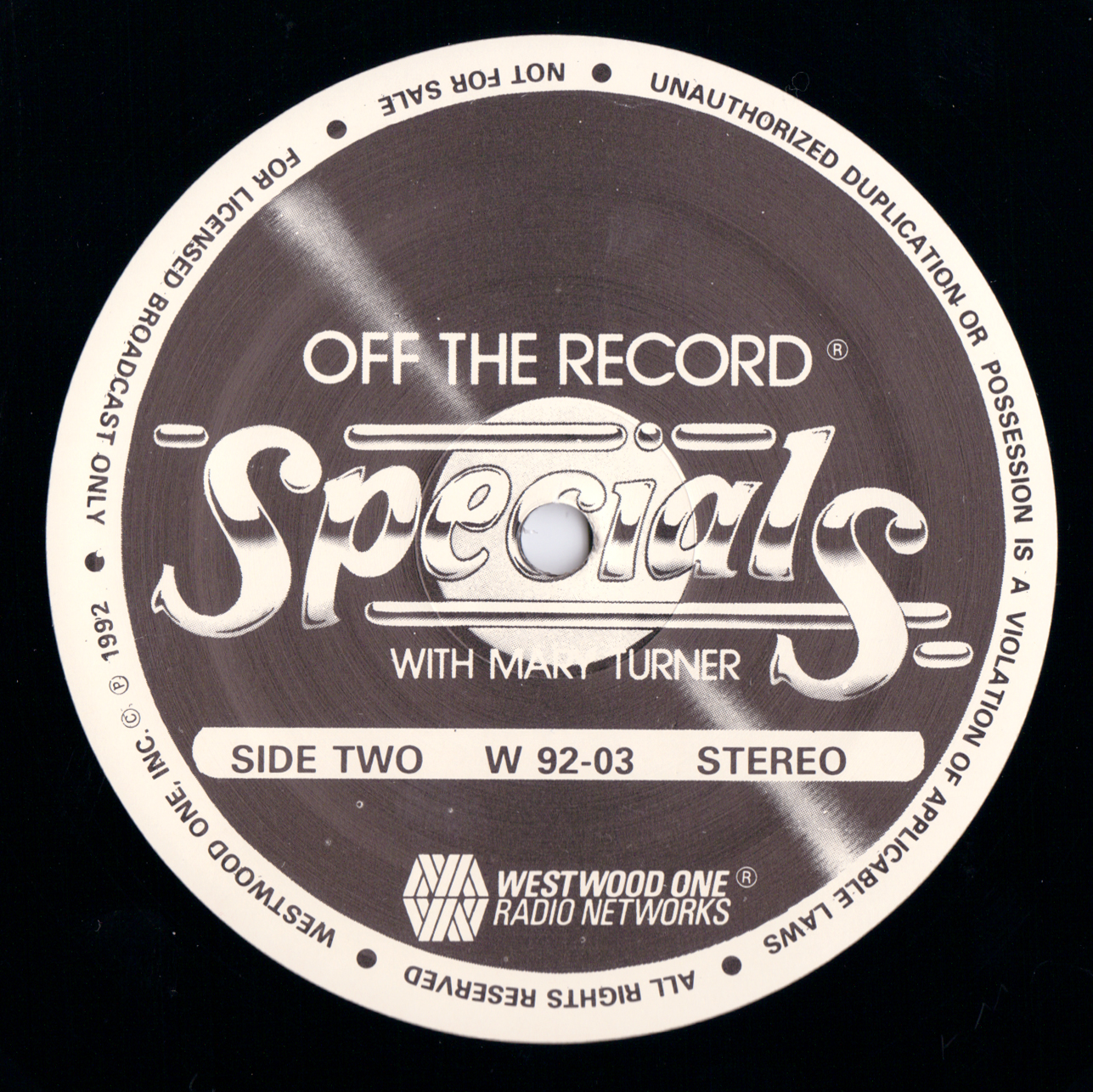 Another entry in the Off The Record Specials series. This show is exactly the same as the above listed OTRSP # 92-03, and thus is Part II of a two-part set. The contents, tracks and interview clips are identical, with only the commercial blocks changing slightly. Released on translucent vinyl. I do not have this item in my personal collection, and have never actually seen a copy for sale, but based on the programming schedule that Westwood One typically utilized this show would follow directly after OTRSP # 92-15.