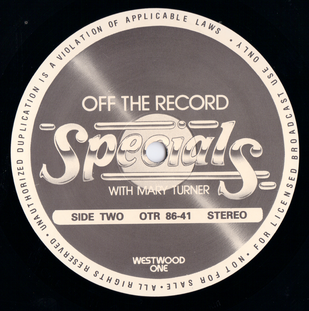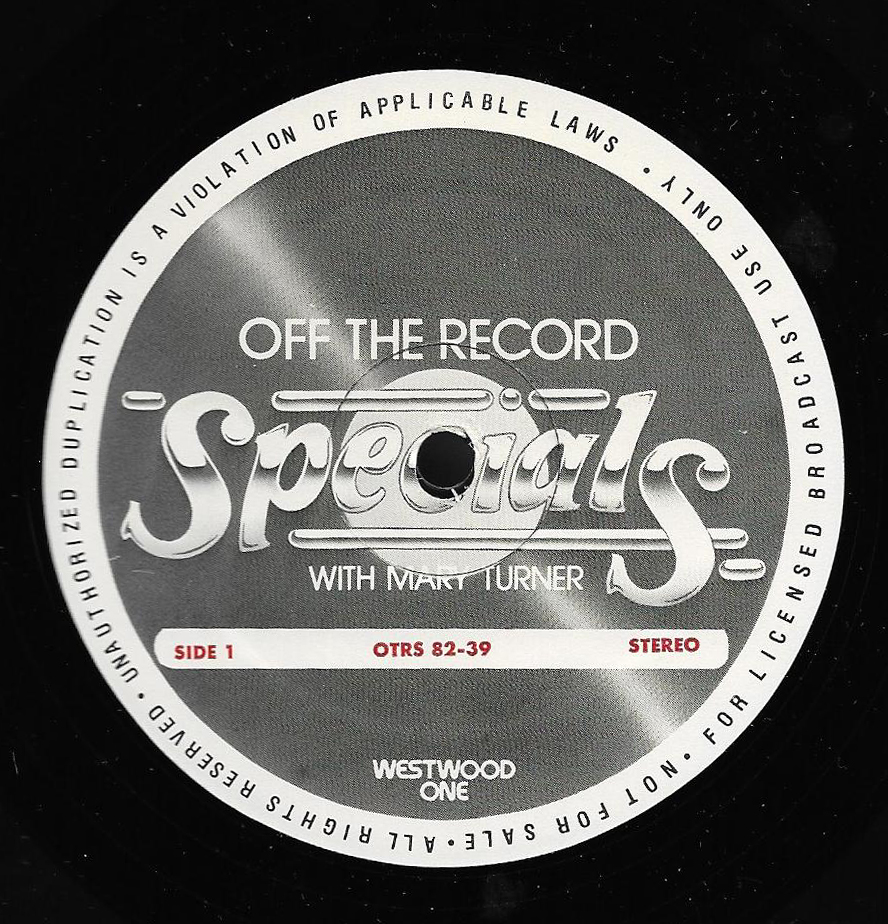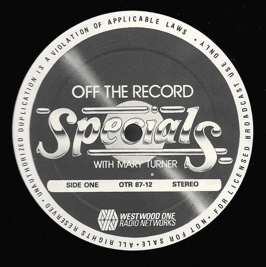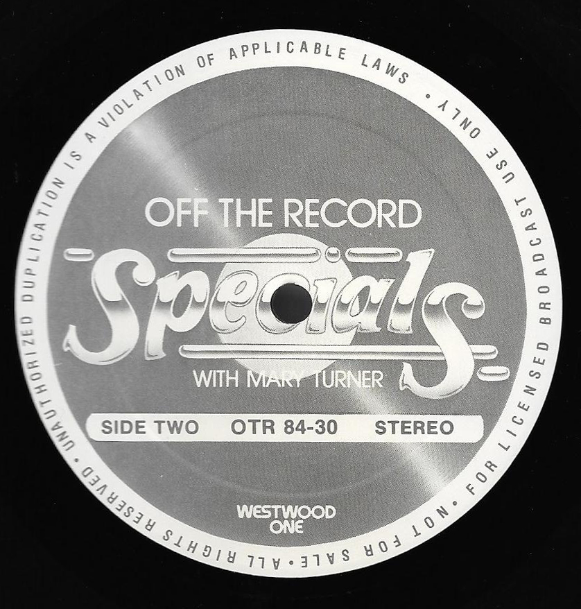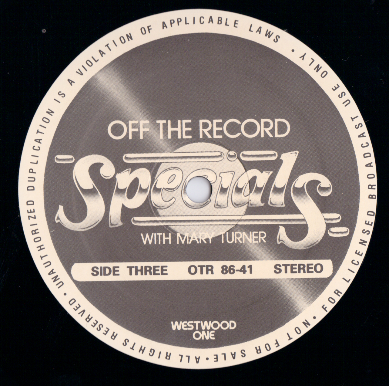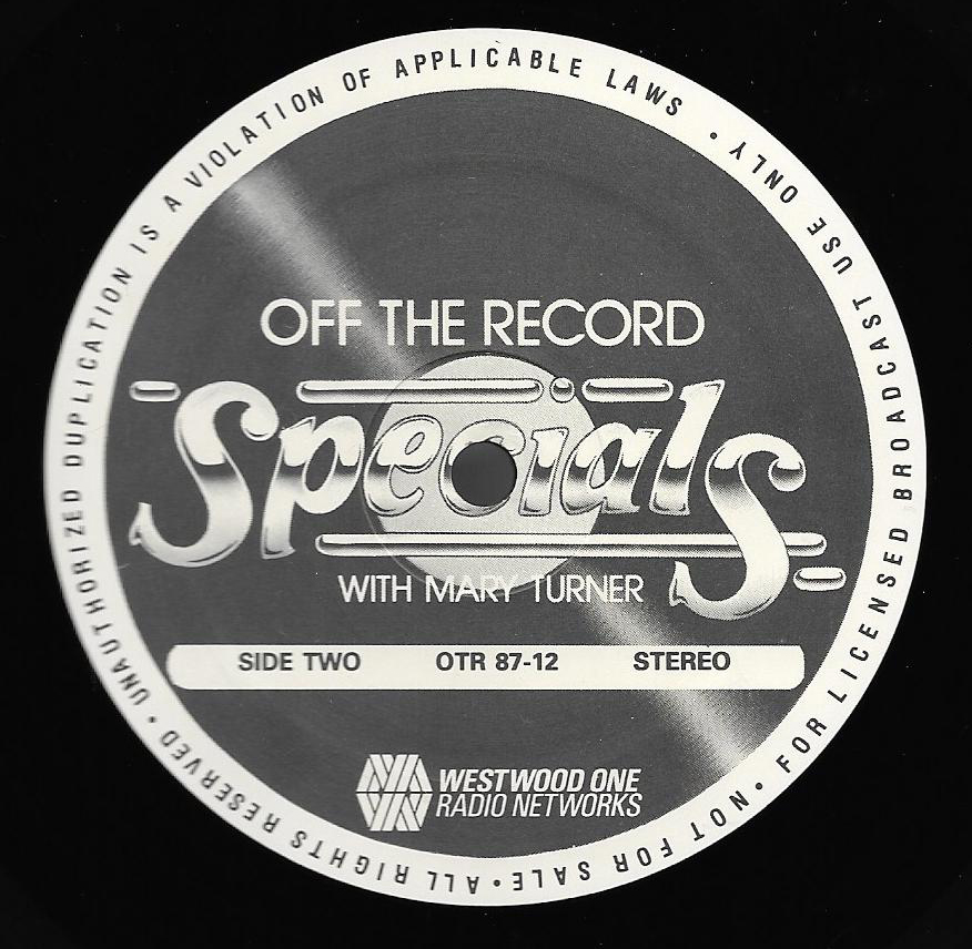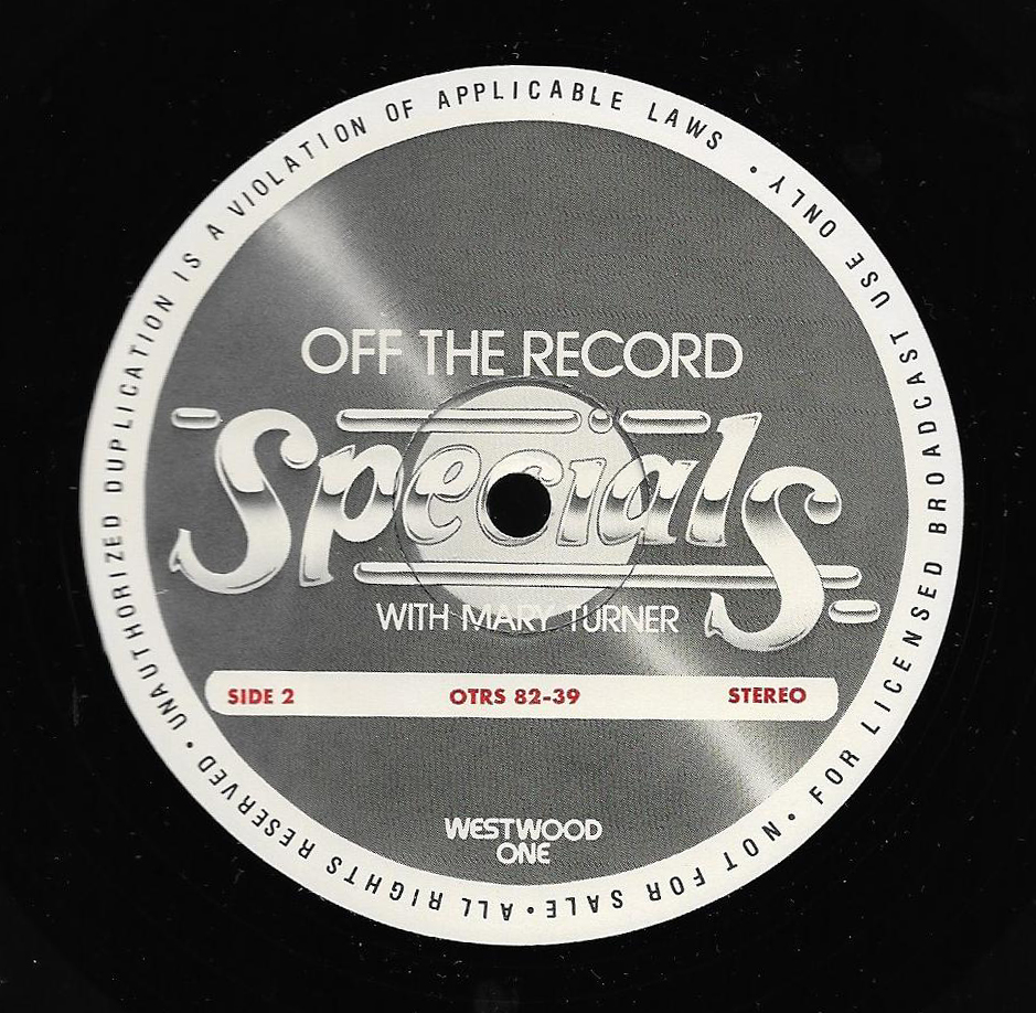 Another entry in the Off The Record Specials series. This show is exactly the same as the above listed OTRSP # 92-03, and thus is Part II of a two-part set. The contents, tracks and interview clips are identical, with only the commercial blocks changing slightly. Released on translucent vinyl. I do not have this item in my personal collection, and have never actually seen a copy for sale, but based on the programming schedule that Westwood One typically utilized this show would follow directly after OTRSP # 92-15.