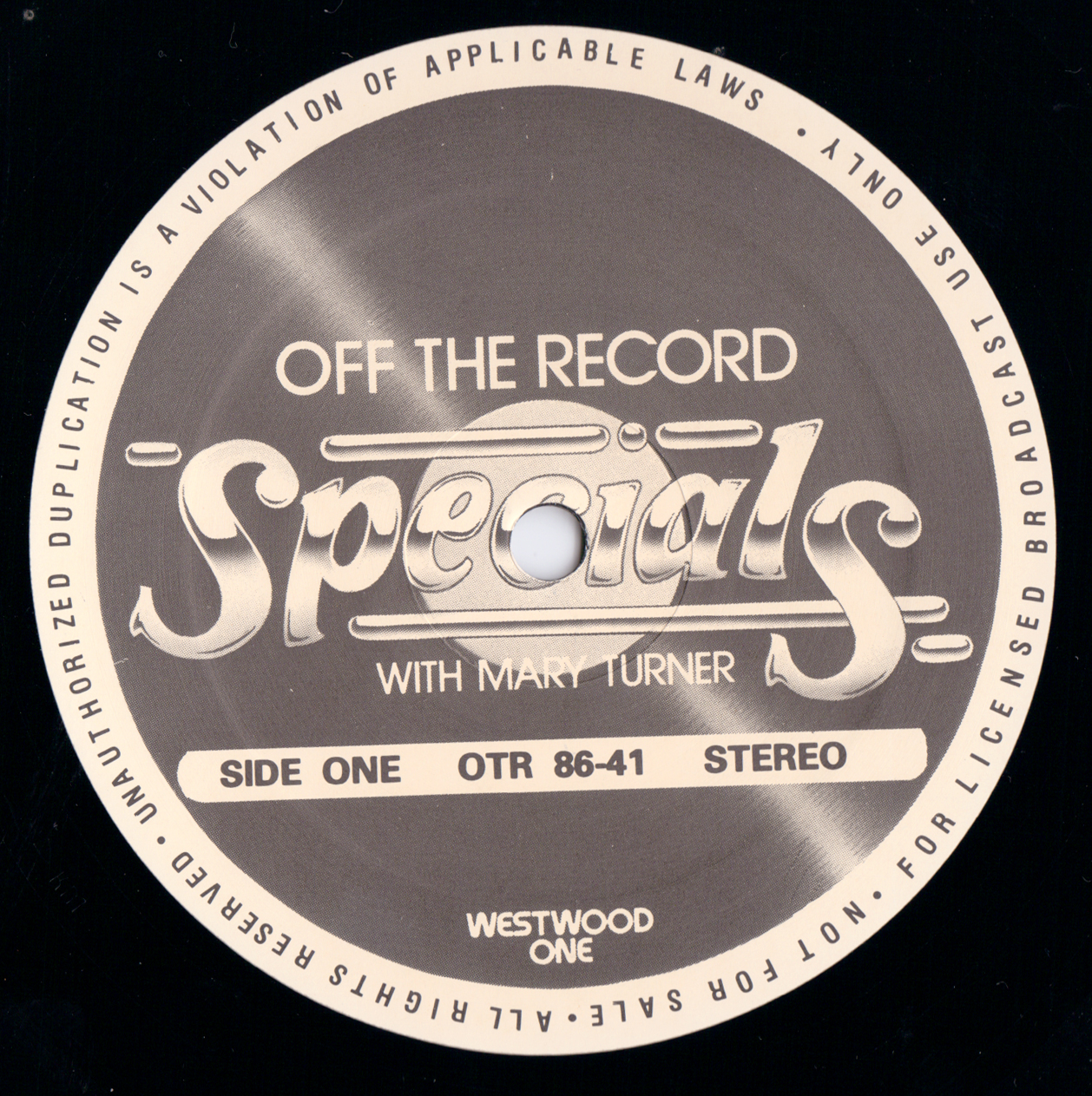 I originally thought this was an early incarnation of what would later become the double LP series known as Off The Record Specials with Mary Turner. Investigation has revealed that these single LP versions were actually daily shows which were sent to radio stations to supplement the double LP versions. Unlike those later shows, (which you will find many more of below) this LP does not contain complete music tracks, nor does it contain an opening segment, commercials or end credits. In addition, this LP does not have one continuous side on each side of the LP, rather, each track is its own separate “locked groove” or “lock banded” track which forced the disc jockey to lift the needle and place it down again in order to play each consecutive track.