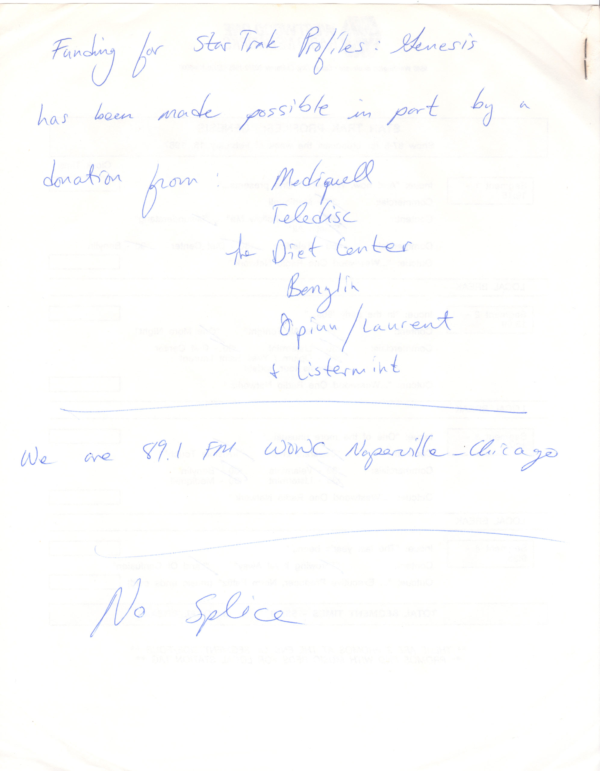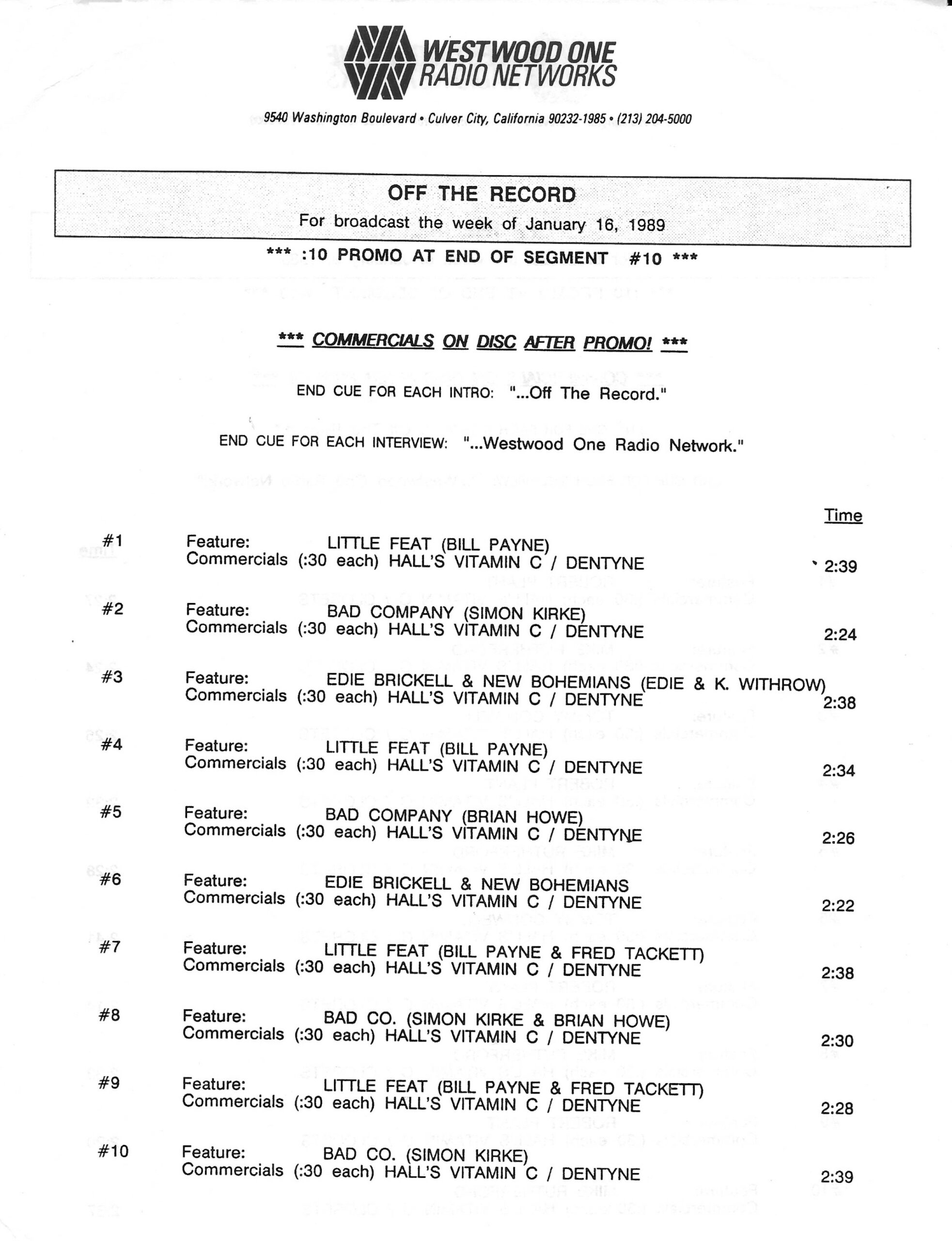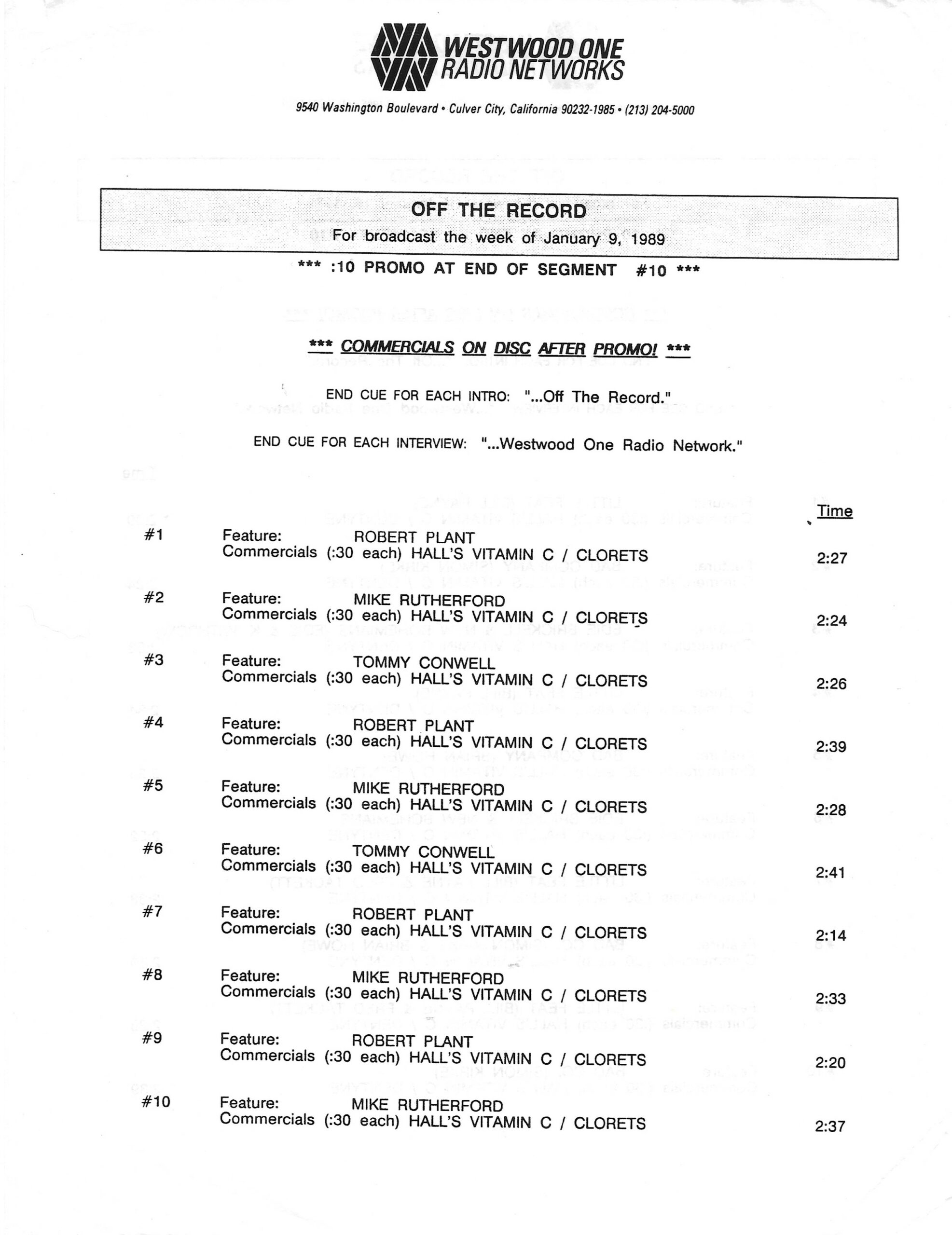 Tracks from each album are played, and there are commercial blocks as well. There are five tracks on the CD. I have the track from this CD in my personal collection, plus a scan of the Cue Sheet (which you can view to the right,) but I don’t have the actual disc in my possession.