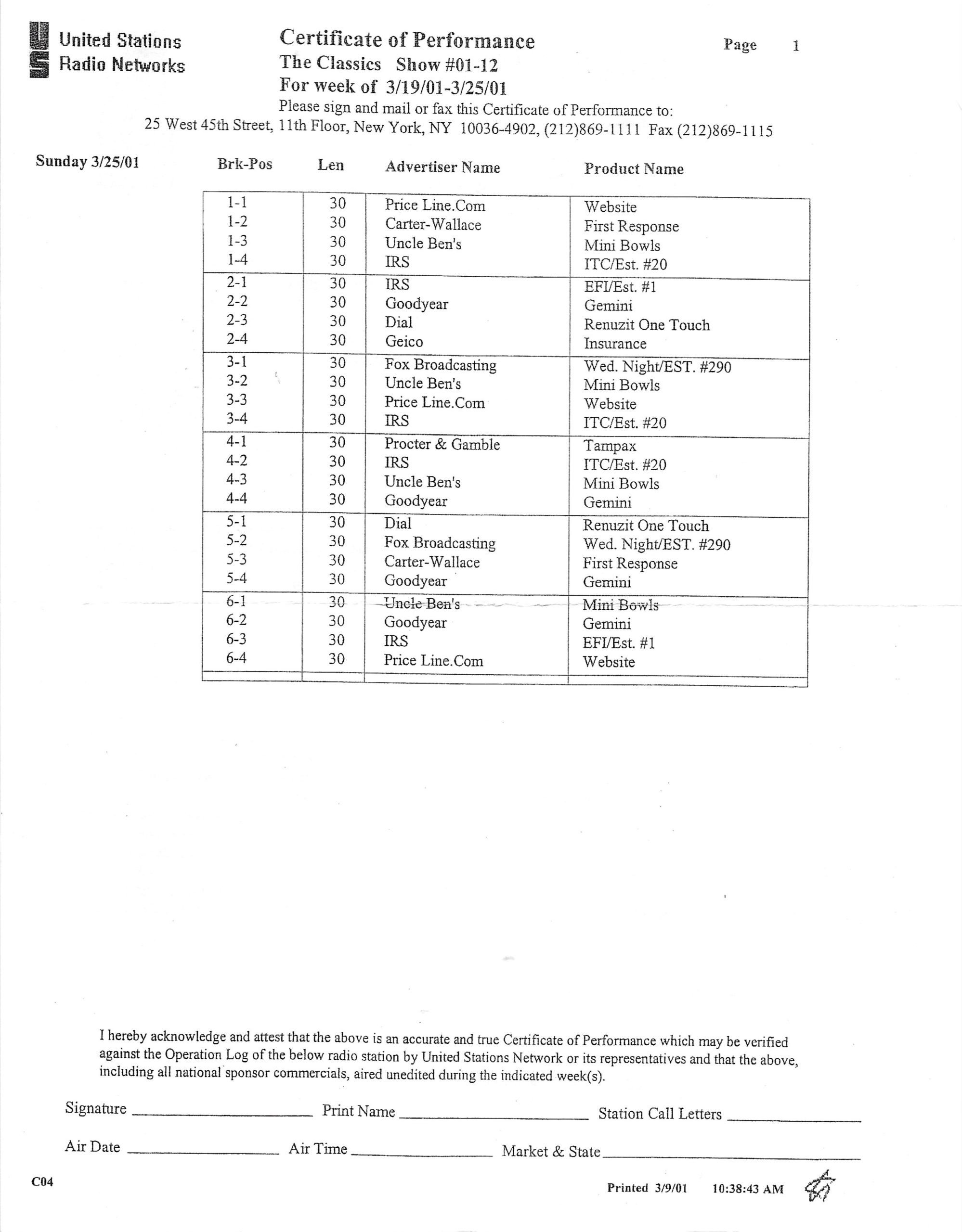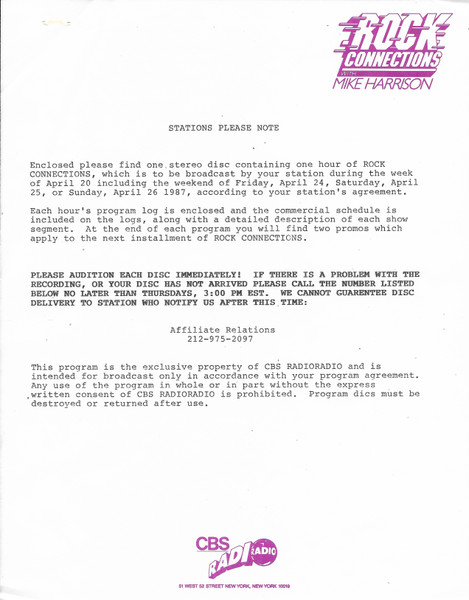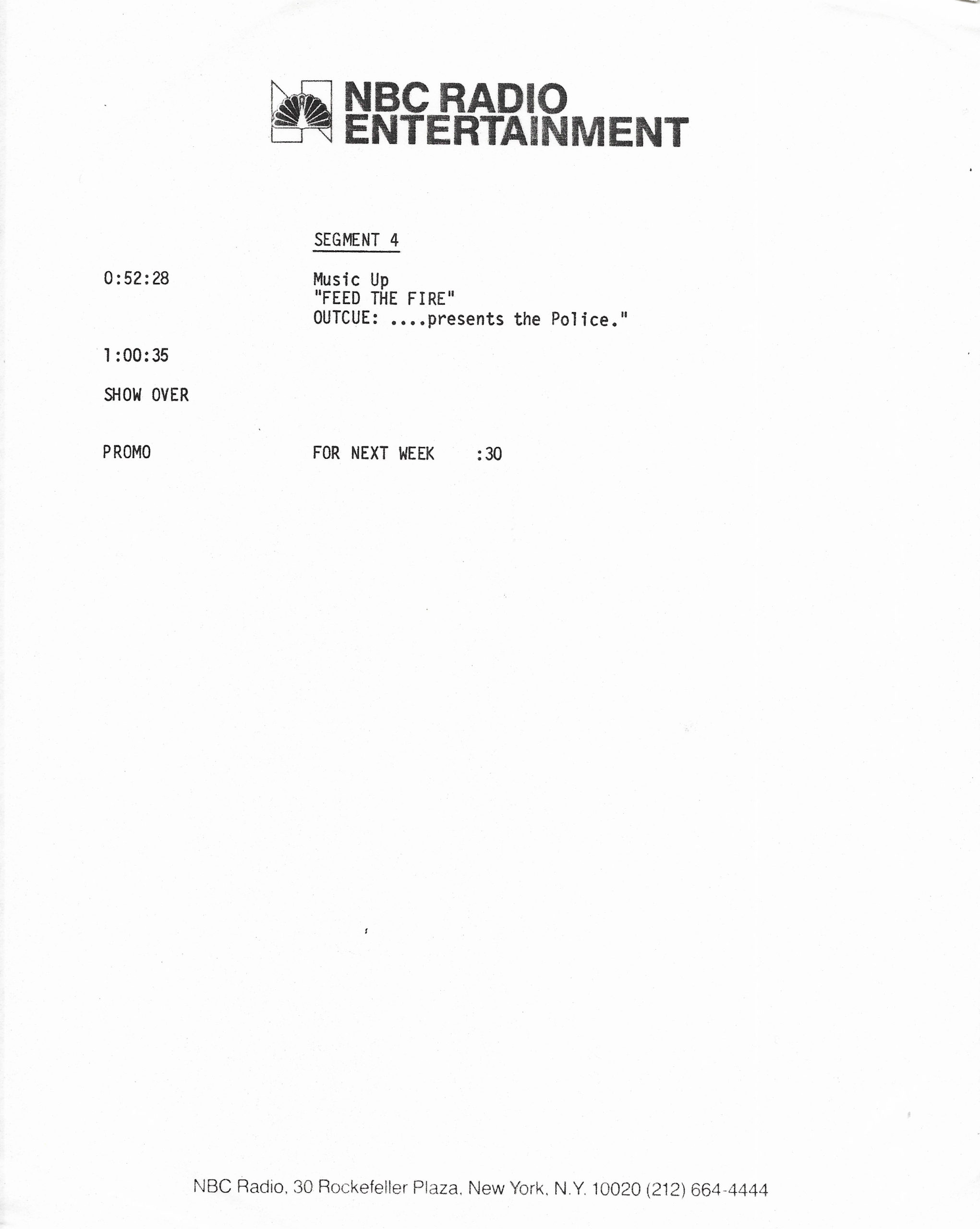 Tracks from each album are played, and there are commercial blocks as well. There are five tracks on the CD. I have the track from this CD in my personal collection, plus a scan of the Cue Sheet (which you can view to the right,) but I don’t have the actual disc in my possession.