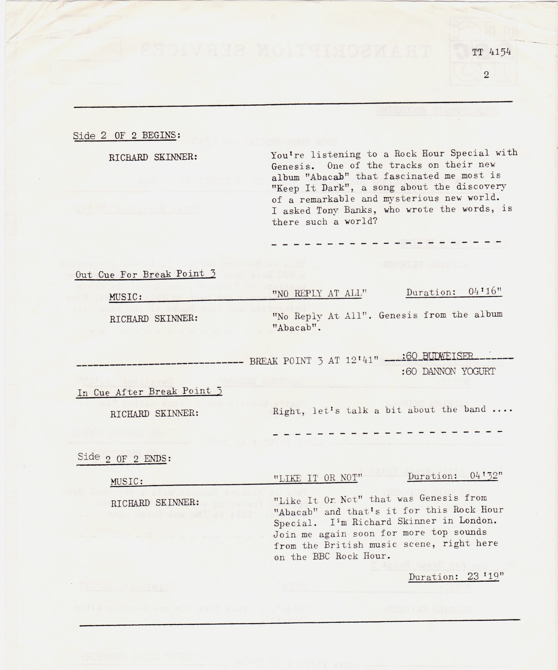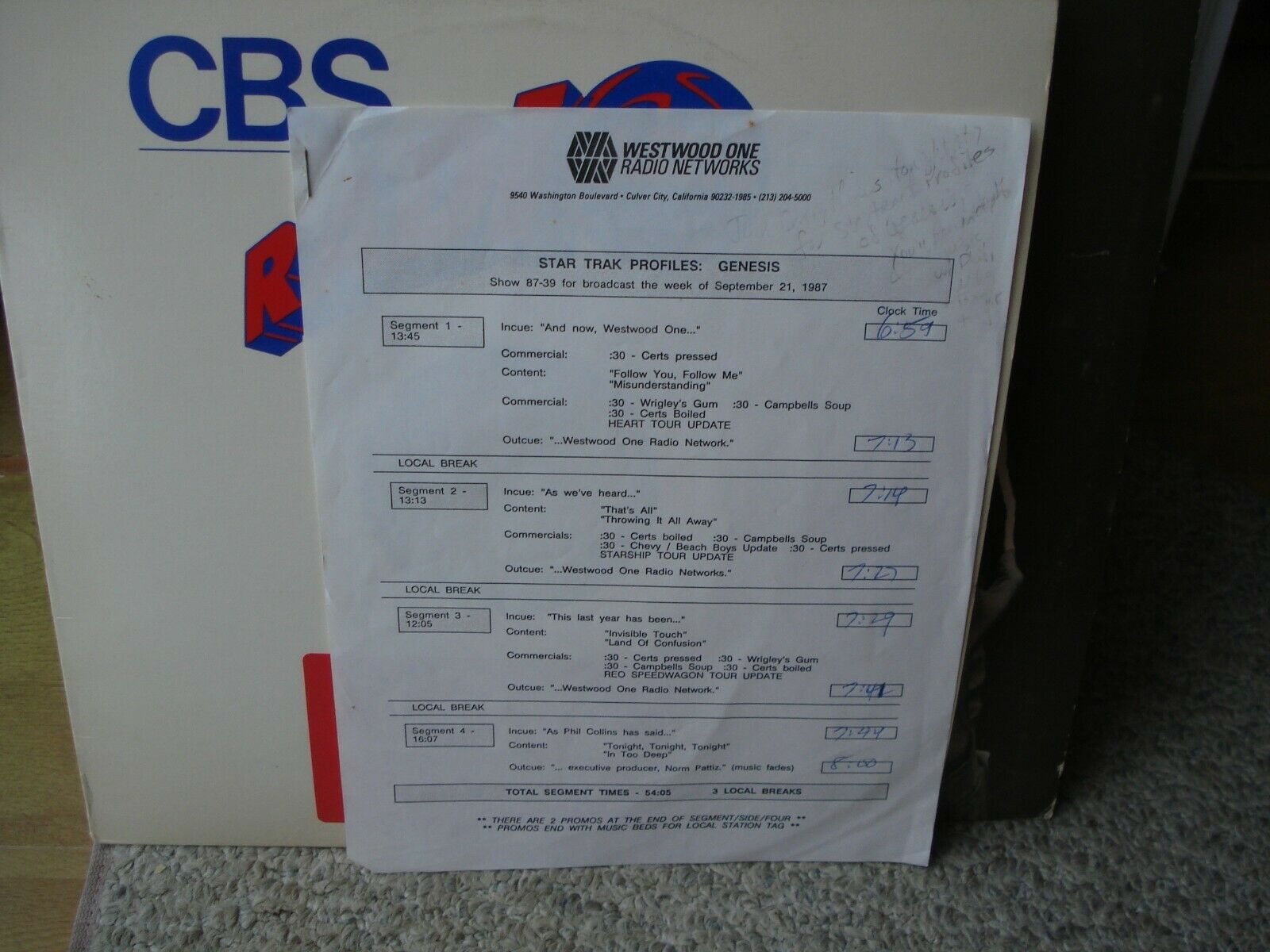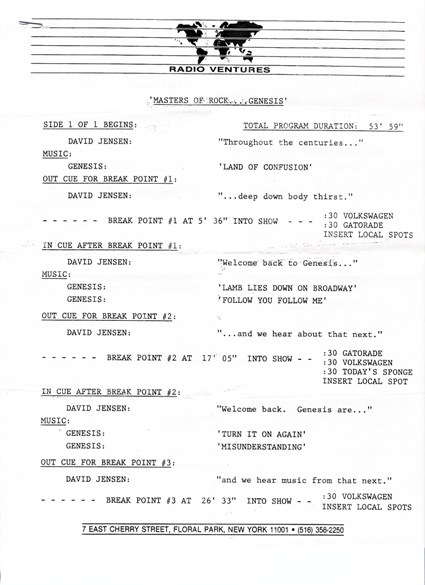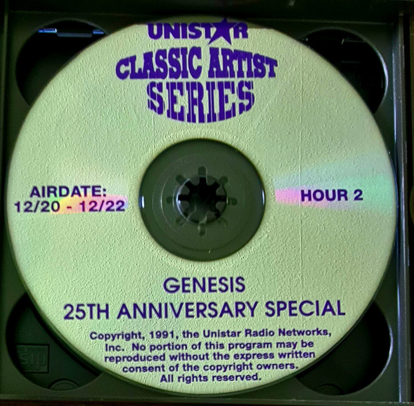This show is one hour in length, but unlike most radio programs of the day which compressed the hour show into 30 minute sides of one LP, this show comes on two LPs. The show features several interview segments covering topics such as the history of the band, Genesis without Peter Gabriel and Steve Hackett and Tony Banks solo projects.