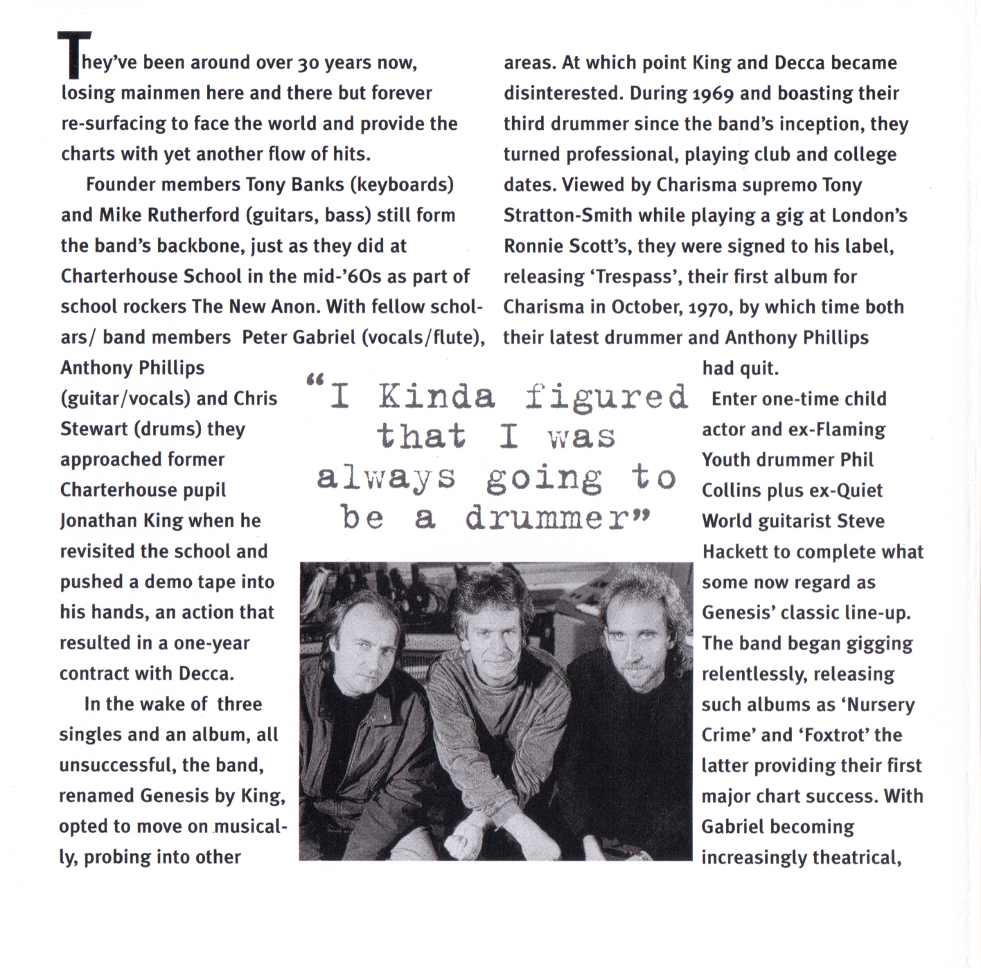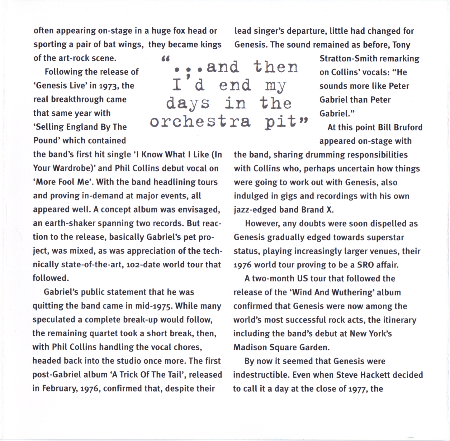 Tracks include I Can’t Dance, The Musical Box, The Lamb Lies Down On Broadway, Behind The Lines, Way Of The World and Your Own Special Way.