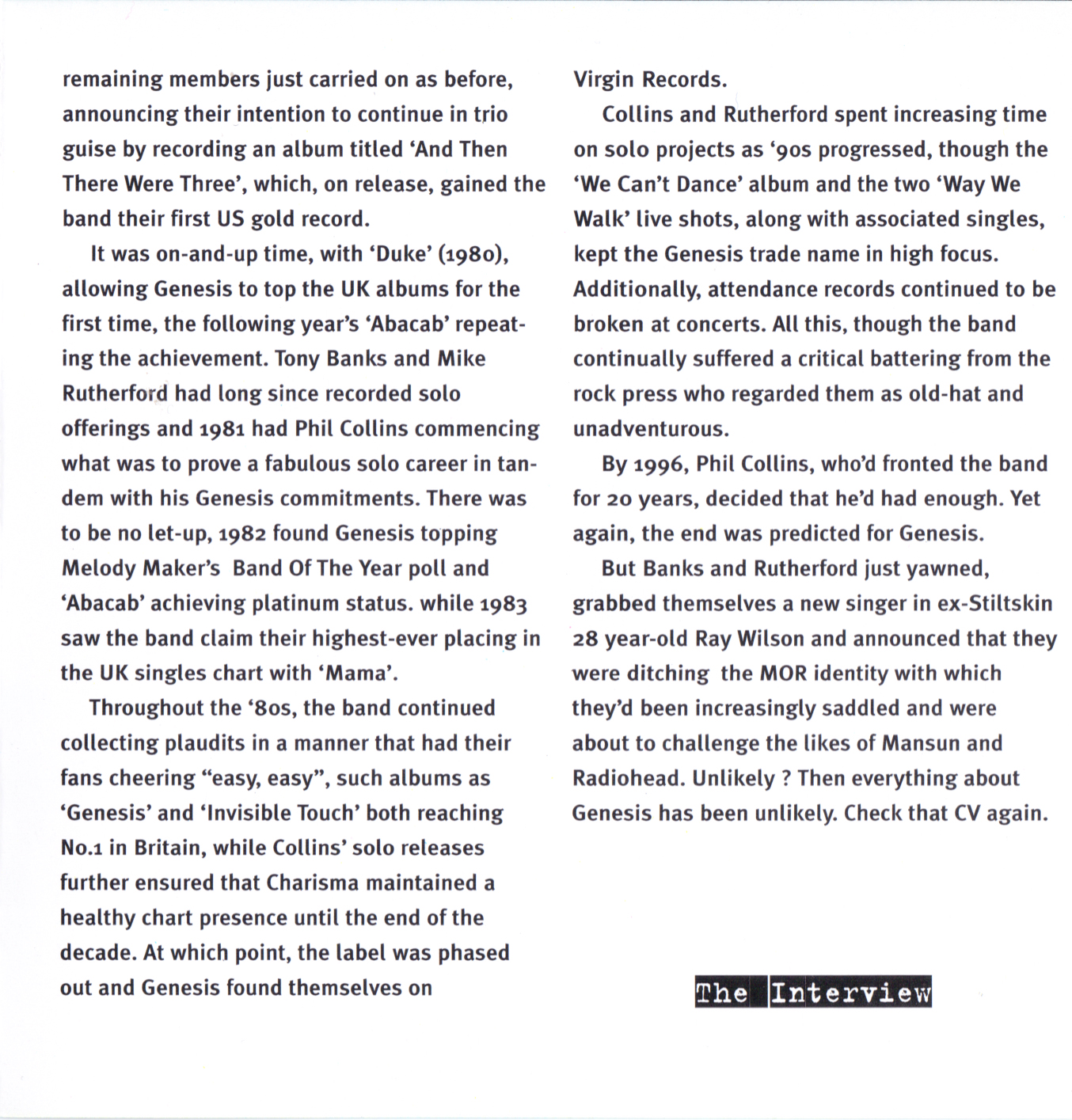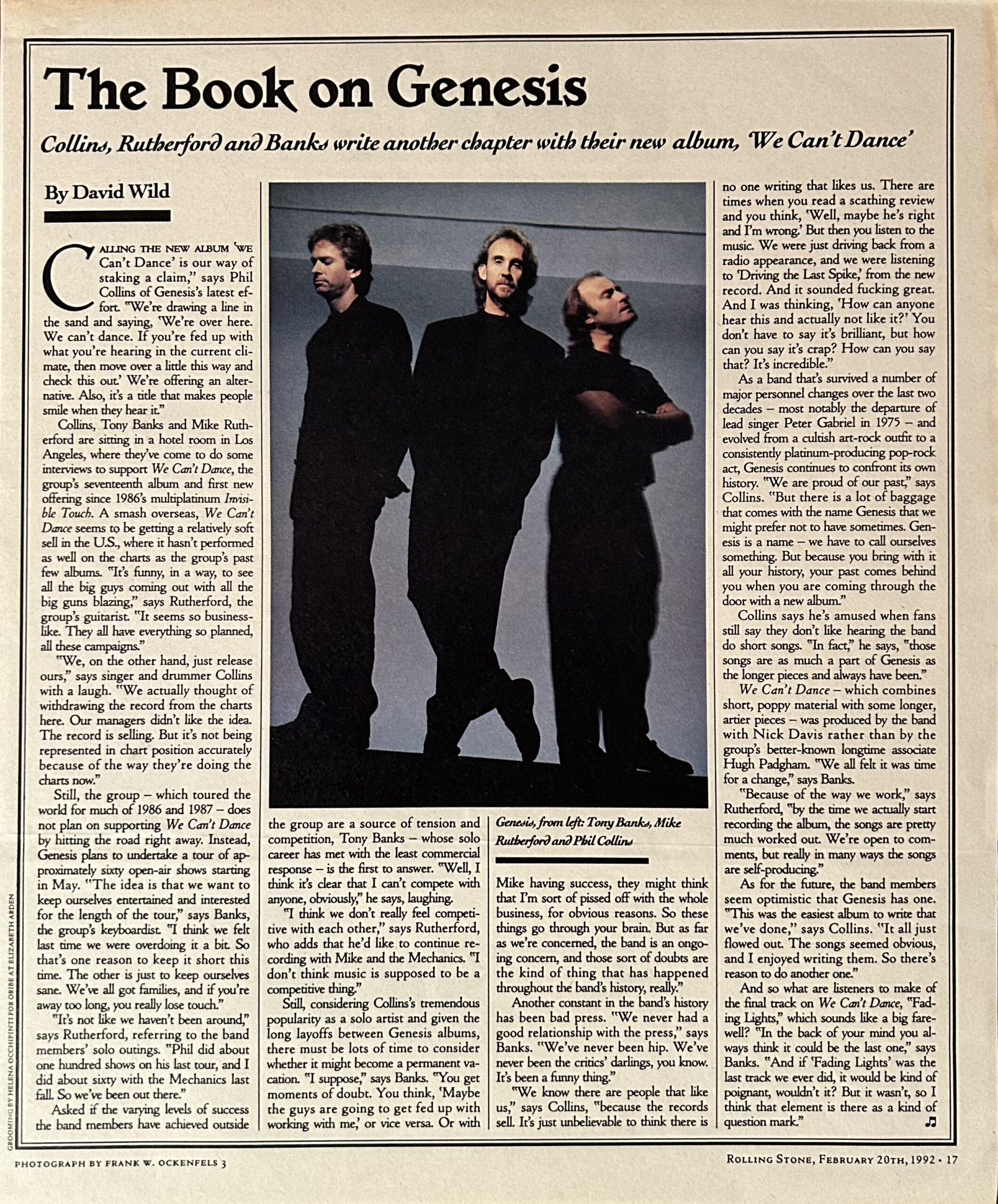 This is another magazine article, this time from Rolling Stone featured in the 20 February 1992 issue. This is the only article to ever feature the band at the time of their WE CAN’T DANCE album. I remember being very upset that the magazine did not feature the band on their cover at any time in the 80’s or 90’s, and again, this was the only article to even feature the band. (There was one other article about the boys, a rather scathing review of a live Genesis show from the Invisible Touch Tour, and a scan of that article can be found on the listing for The Genesis Event on my page entitled THE REST OF MY RADIO SHOW COLLECTION.) In this article, the boys discuss the album, the critics reception of same, and the future of the band. You can view a scan of this article in the gallery to the right.