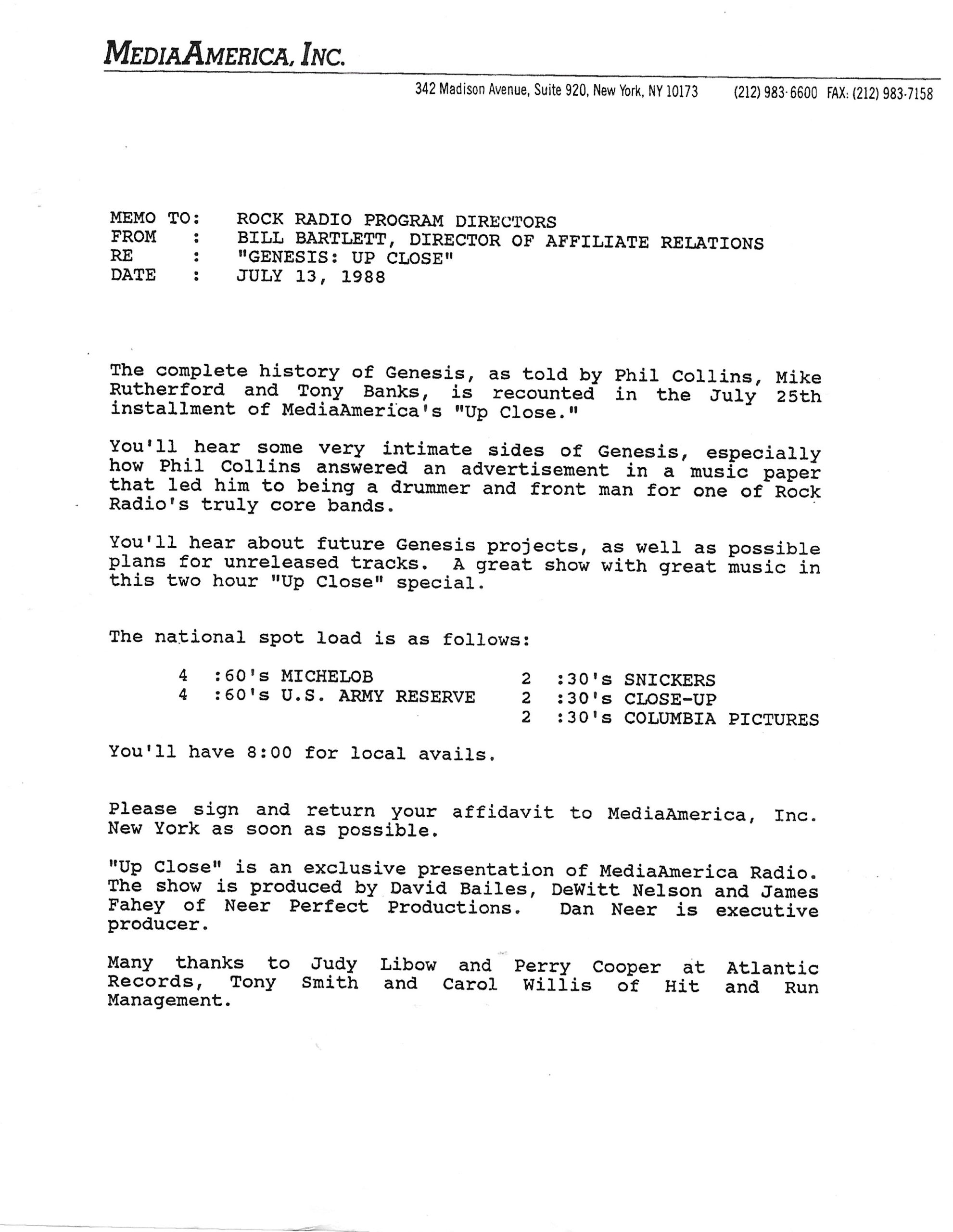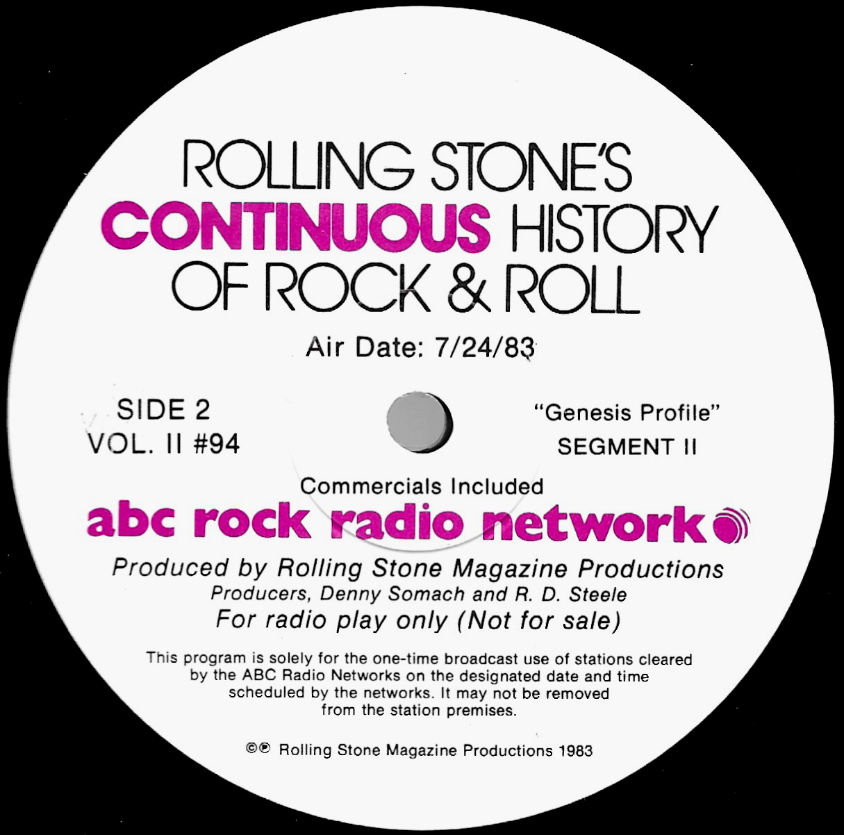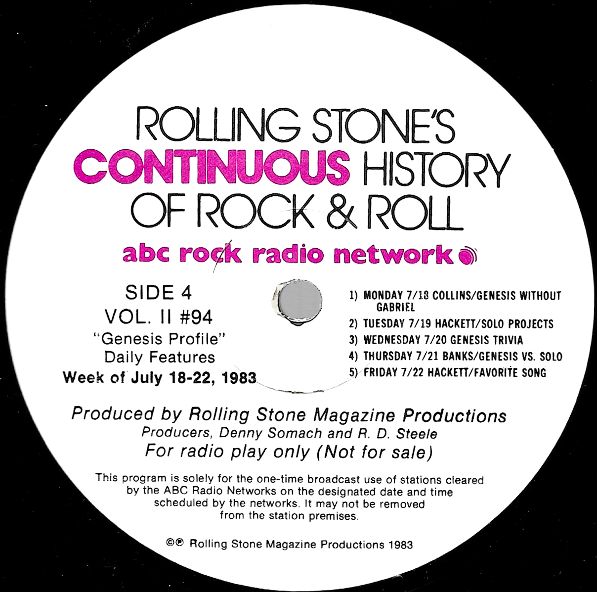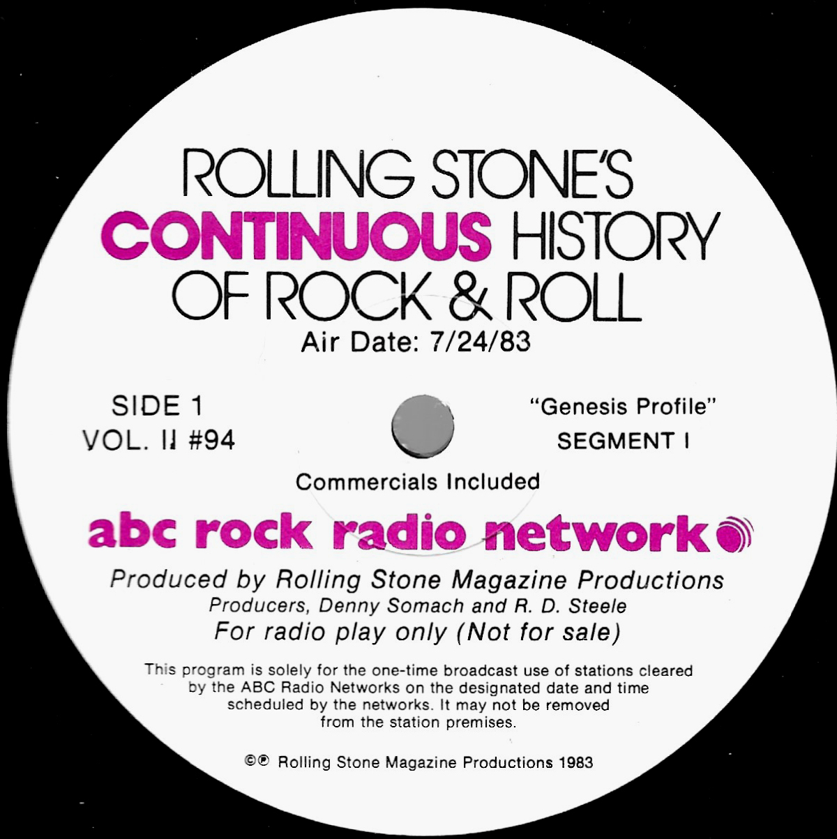 This particular episode features Bill Bruford and Phil talking about the Genesis album A TRICK OF THE TAIL. The other three sides are separate shows featuring America (this segment aired 4 July 1976), Chris Squire of Yes talking about his FISH OUT OF WATER solo album, (which aired 11 July 1976) and David Pomeranz (which aired 18 July 1976).