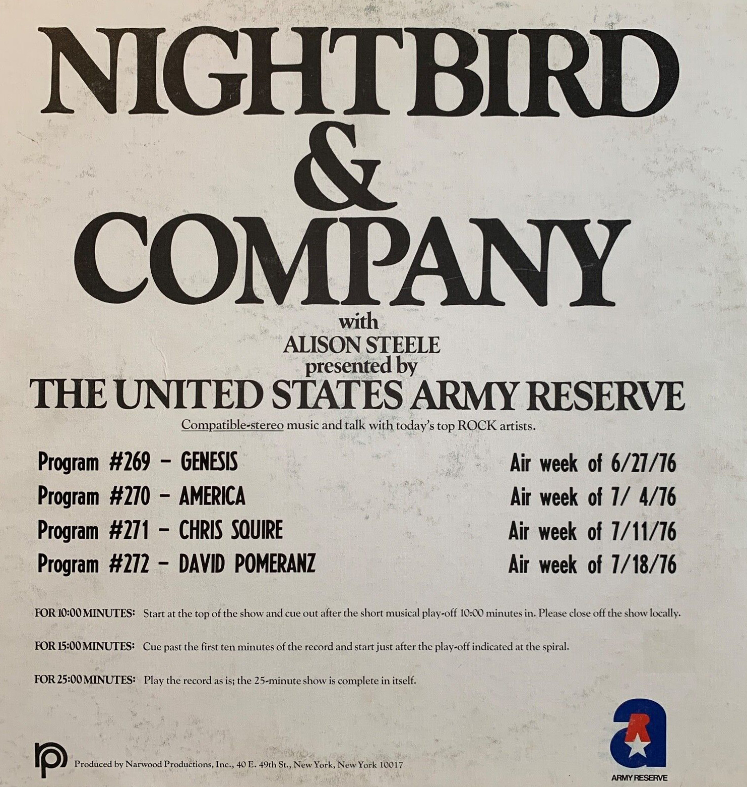 Nightbird & Company Program # 269 – 272 – Genesis, America, Chris Squire and David Pomeranz: