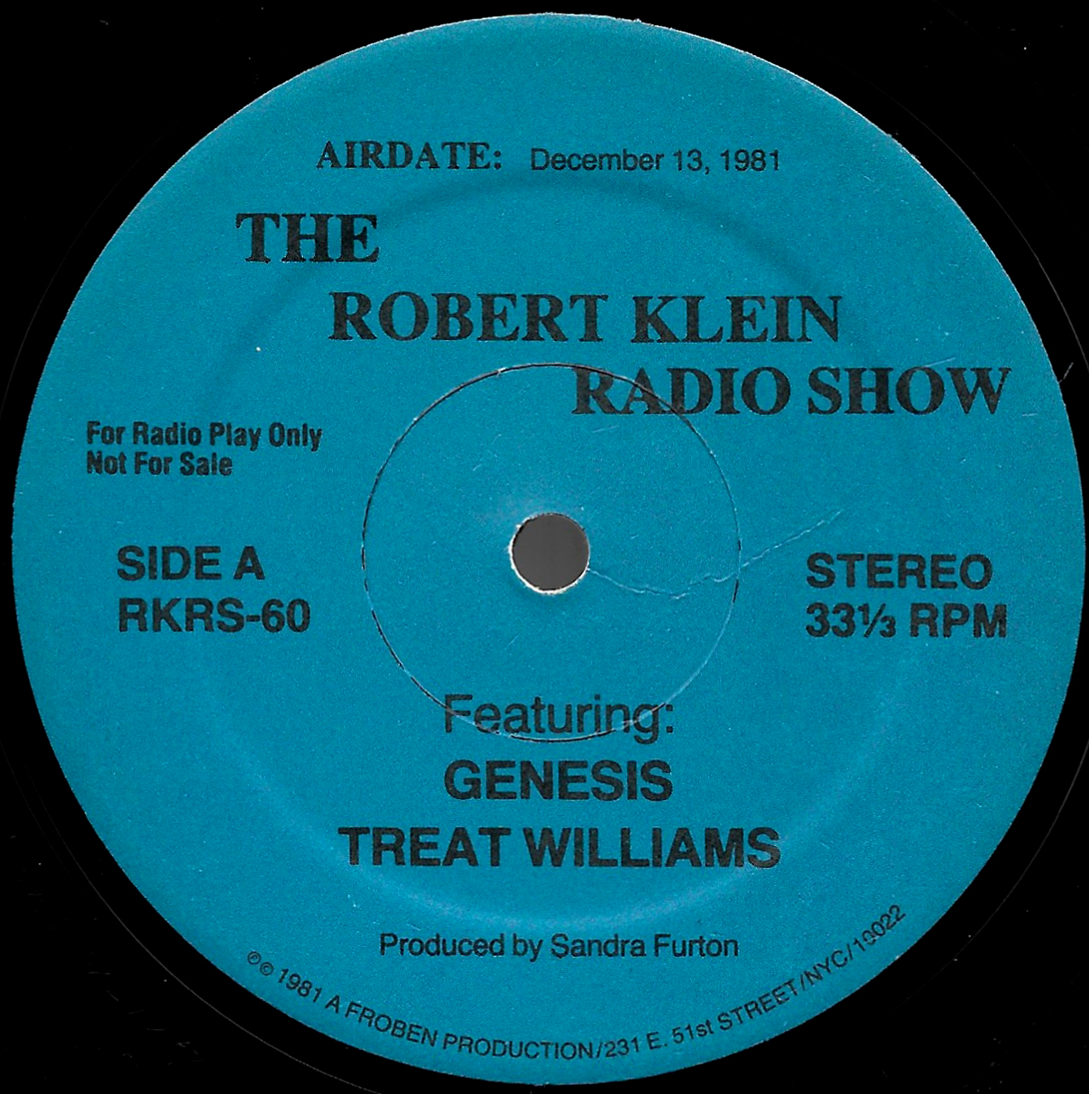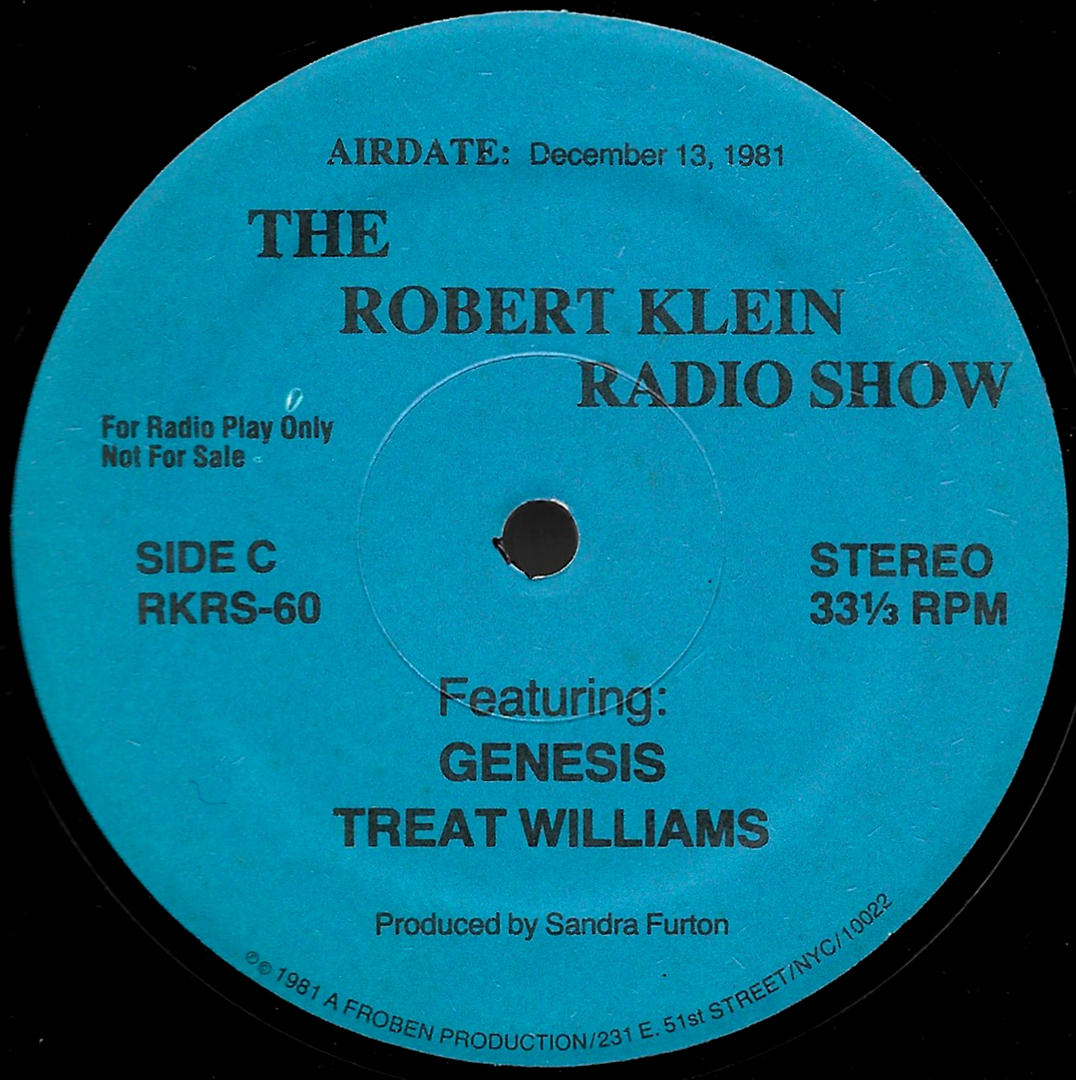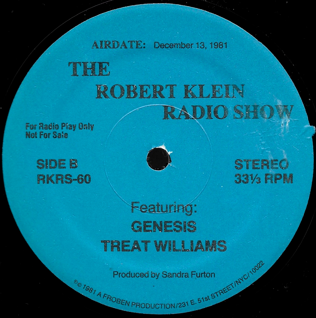Kline interviews Phil and Mike both and plays tracks from both Phil and Genesis albums. Tracks include Abacab, Turn It On Again, No Reply At All and I Missed Again. Klein also provides lots of (rather silly) comedic sections, including a lengthy opening monologue prior to introducing the boys from the band. Actor Treat Williams is featured in a section on Side C, but Phil and Mike are also present during his interview. Klein plays the title track from the HAIR original motion picture film soundtrack, of which Williams was a part. Side D is blank. From my personal collection.