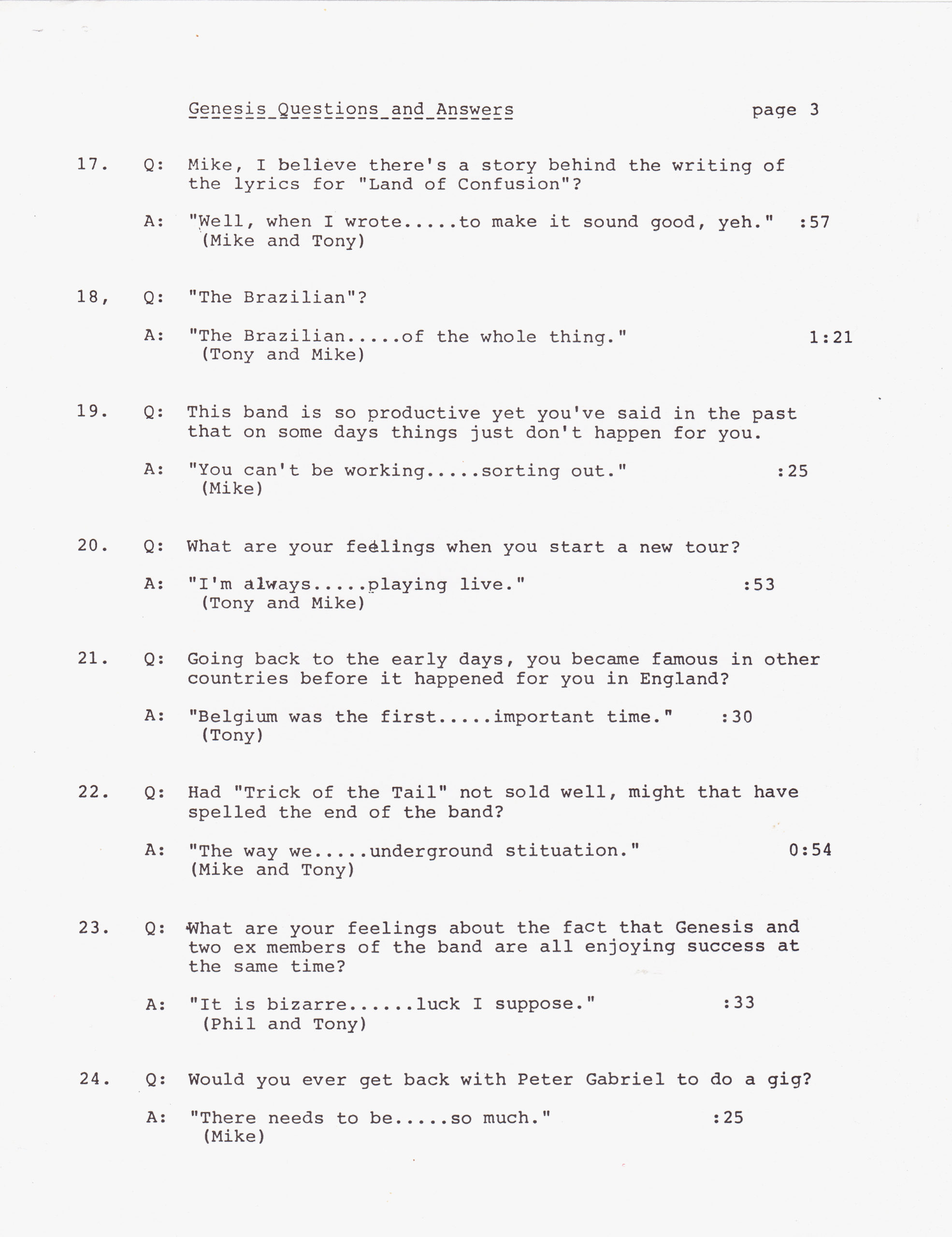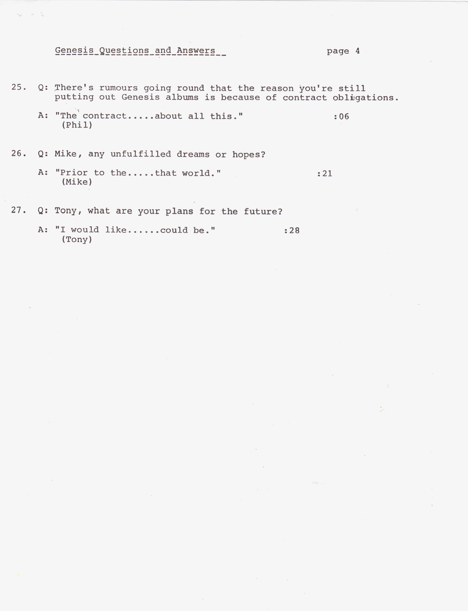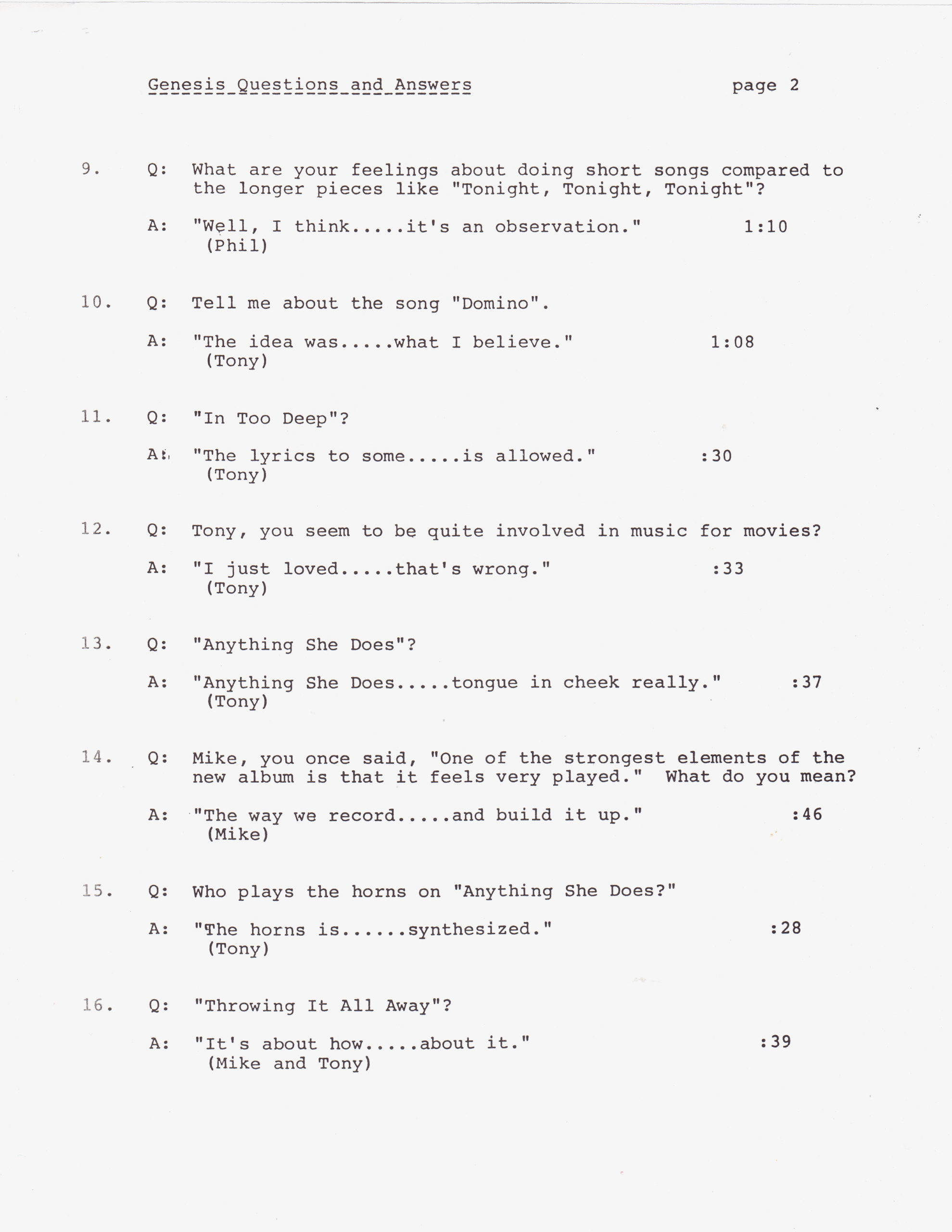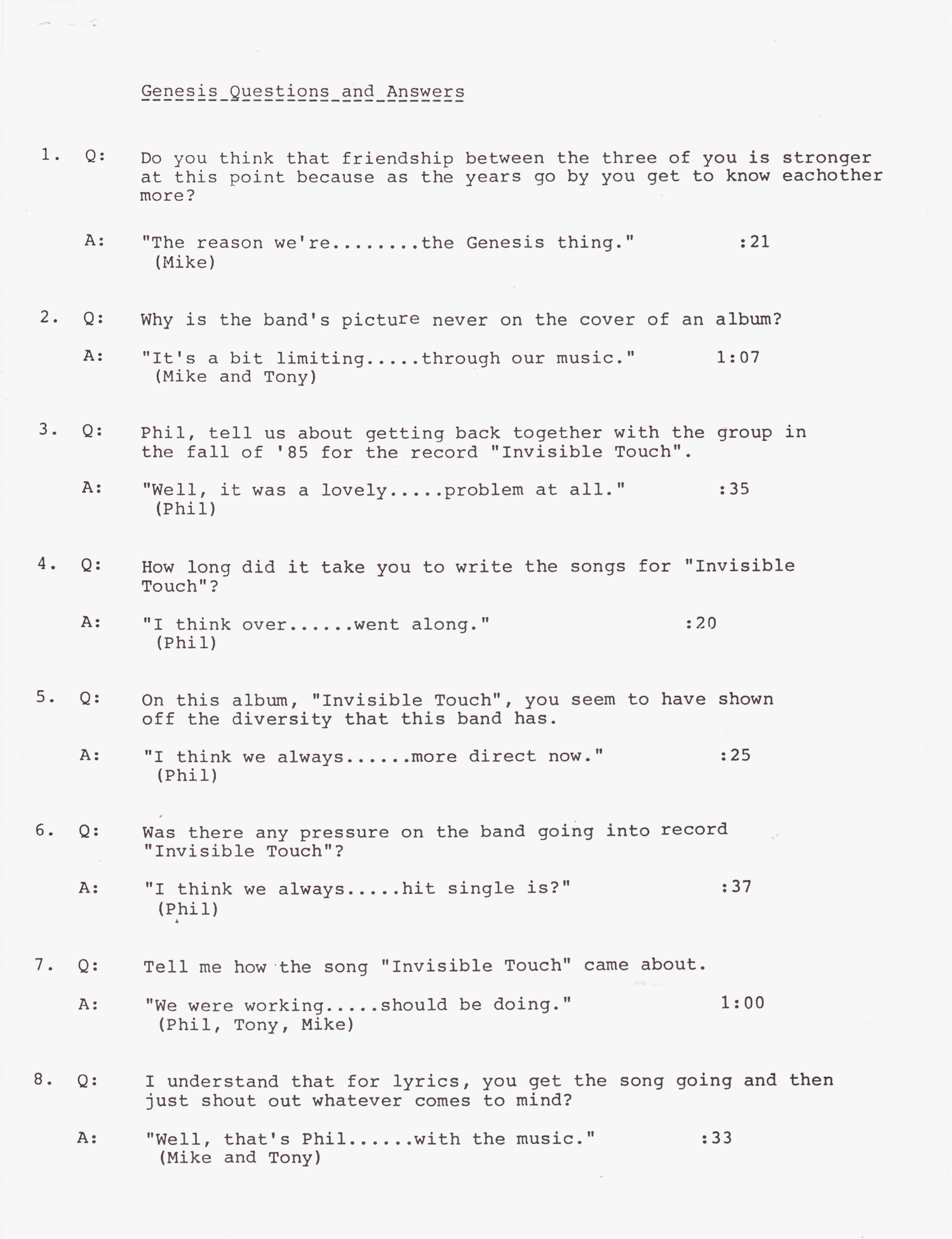 An unknown female interviewer meets with the boys at an undisclosed location about a myriad of topics including Tony’s “upcoming” release STILL, (which he states is coming out in March – firmly establishing the recording date of this interview in late 1991 or early 1992), Phil offering his services to various bands, his double LIVE AID appearances and his bit part in The Beatles’ film A HARD DAY’S NIGHT, solo material, writing credits on the albums, and success. Oddly enough, no mention is made about the latest release (at that time) from the band, which would have been their last studio album with Phil, WE CAN’T DANCE.