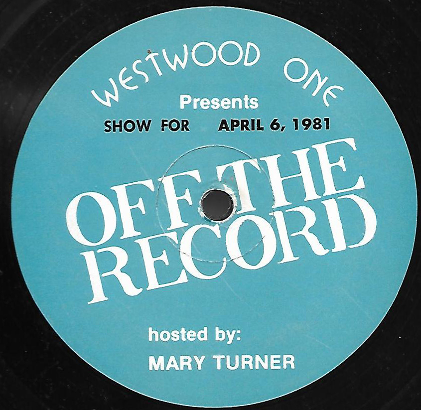 This was one of two rock interview shows she hosted, the other being the double LP version entitled Off the Record Specials with Mary Turner. Both were syndicated by Westwood One, a company founded by the media entrepreneur Norman Pattiz, whom Turner married in 1985. The shows were broadcast in every major market in the United States and 40 countries through the American Forces Radio and Television Service, giving Turner a worldwide audience of more than 20 million. She left KMET on 6 August 1982, but continued the Off The Record series of shows well into the 90’s. Turner passed away on 9 May 2023 from cancer. You can read more about her amazing career in her obituaries, found here: