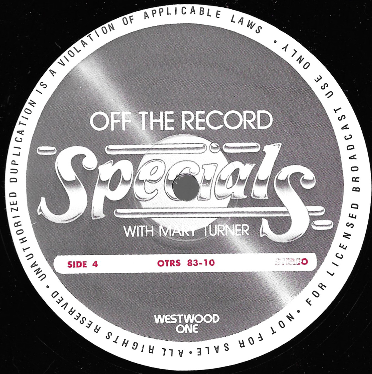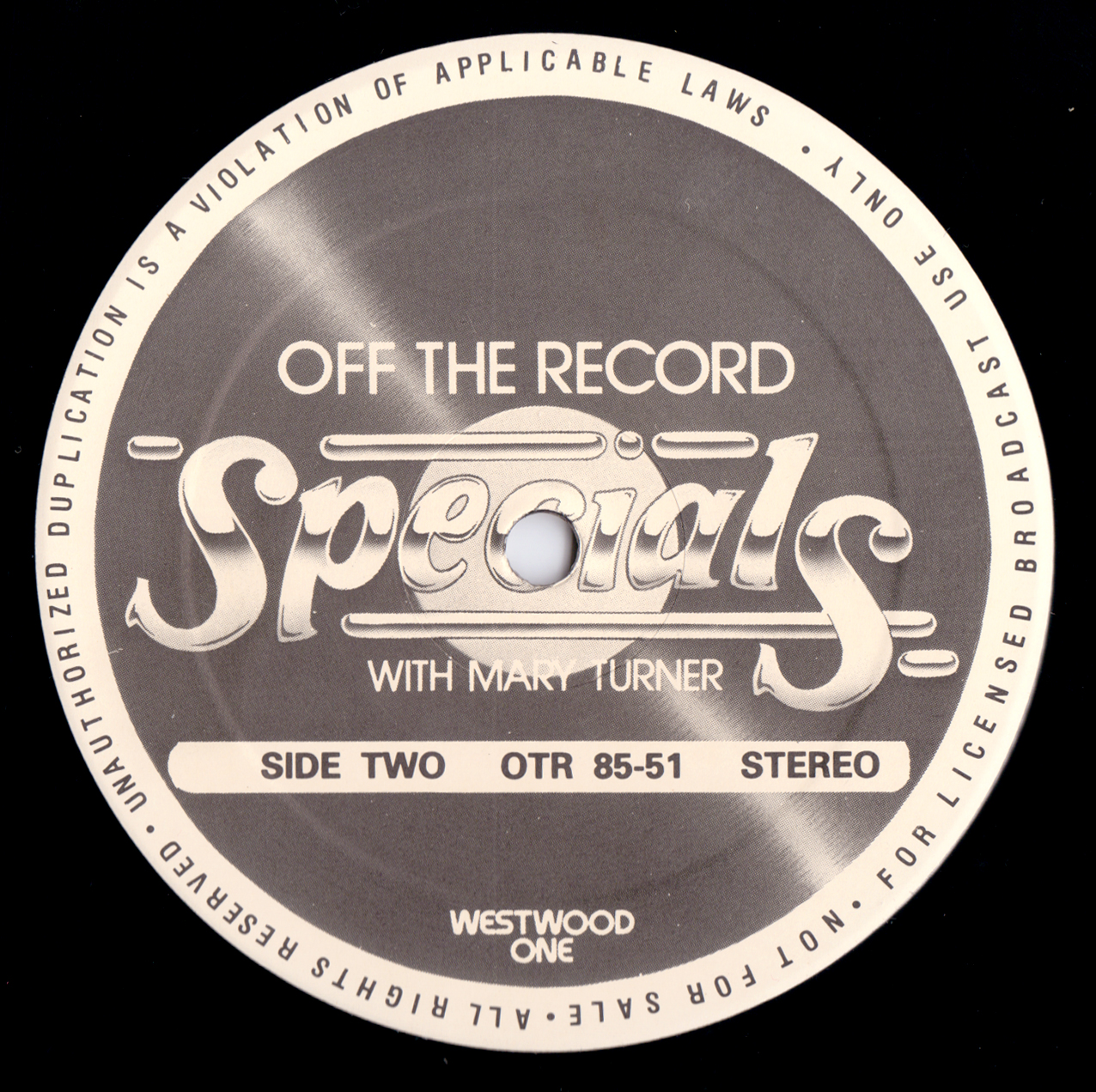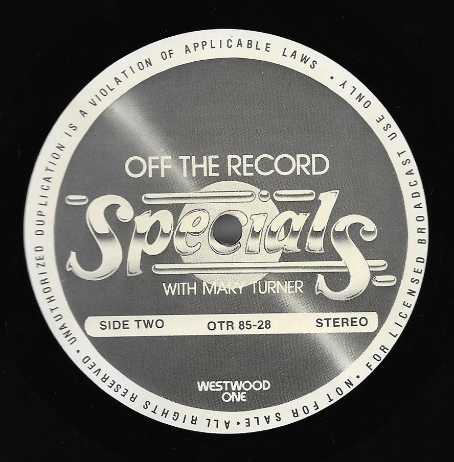 I originally thought this was an early incarnation of what would later become the double LP series known as Off The Record Specials with Mary Turner. Investigation has revealed that these single LP versions were actually daily short-form shows which were sent to radio stations to supplement the double LP versions. Unlike those later shows, (which you will find many more of below) this LP does not contain complete music tracks, nor does it contain an opening segment, commercials or end credits. In addition, this LP does not have one continuous side on each side of the LP, rather, each track is its own separate “locked groove” or “lock banded” track which forced the disc jockey to lift the needle and place it down again in order to play each consecutive track.