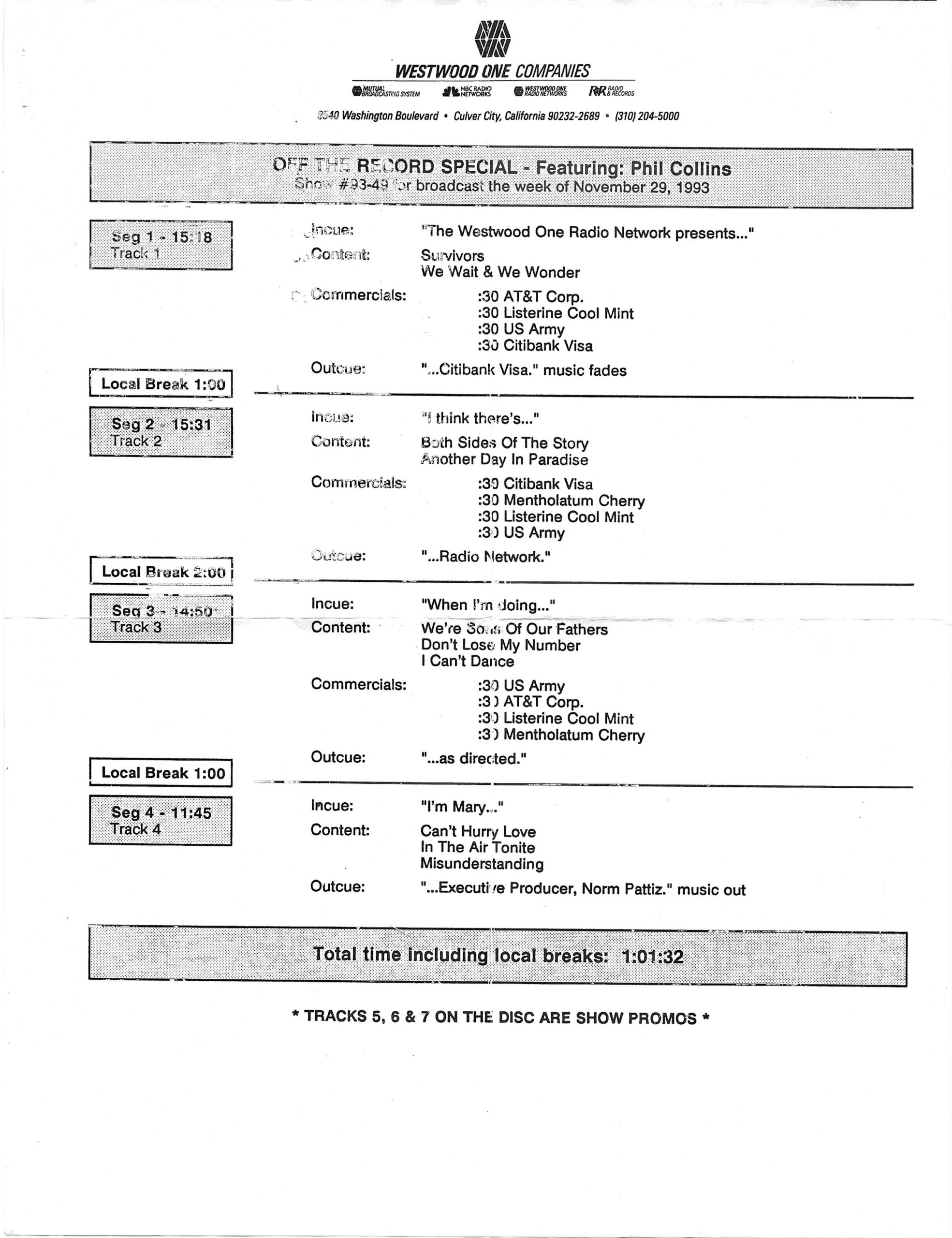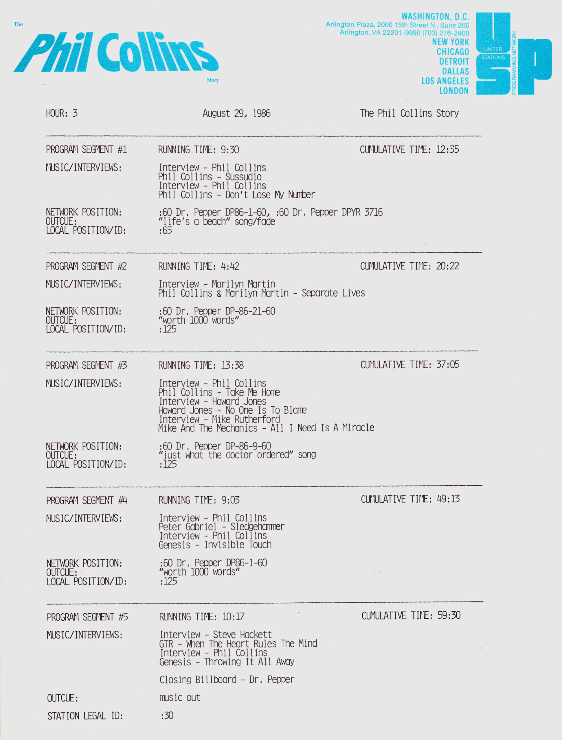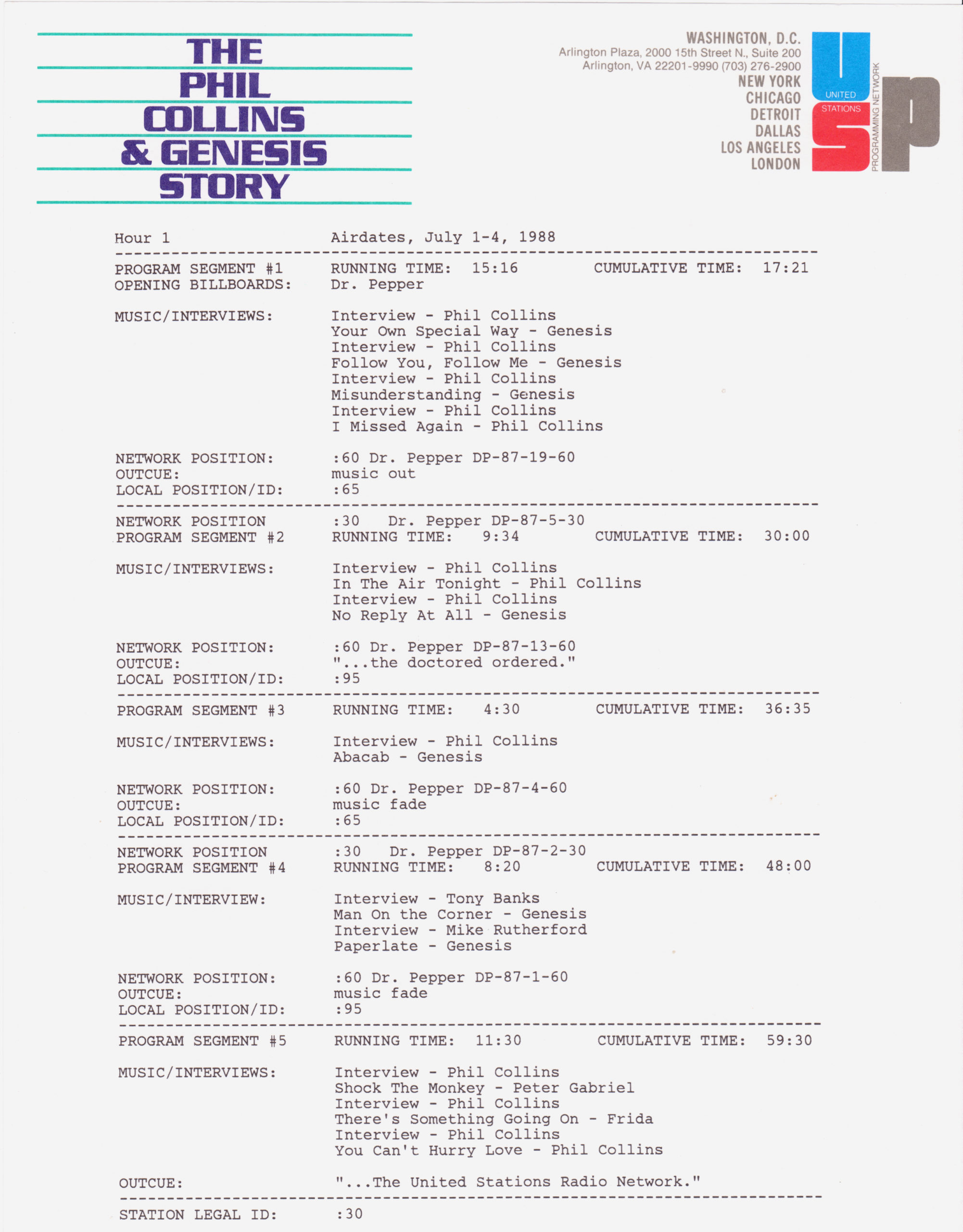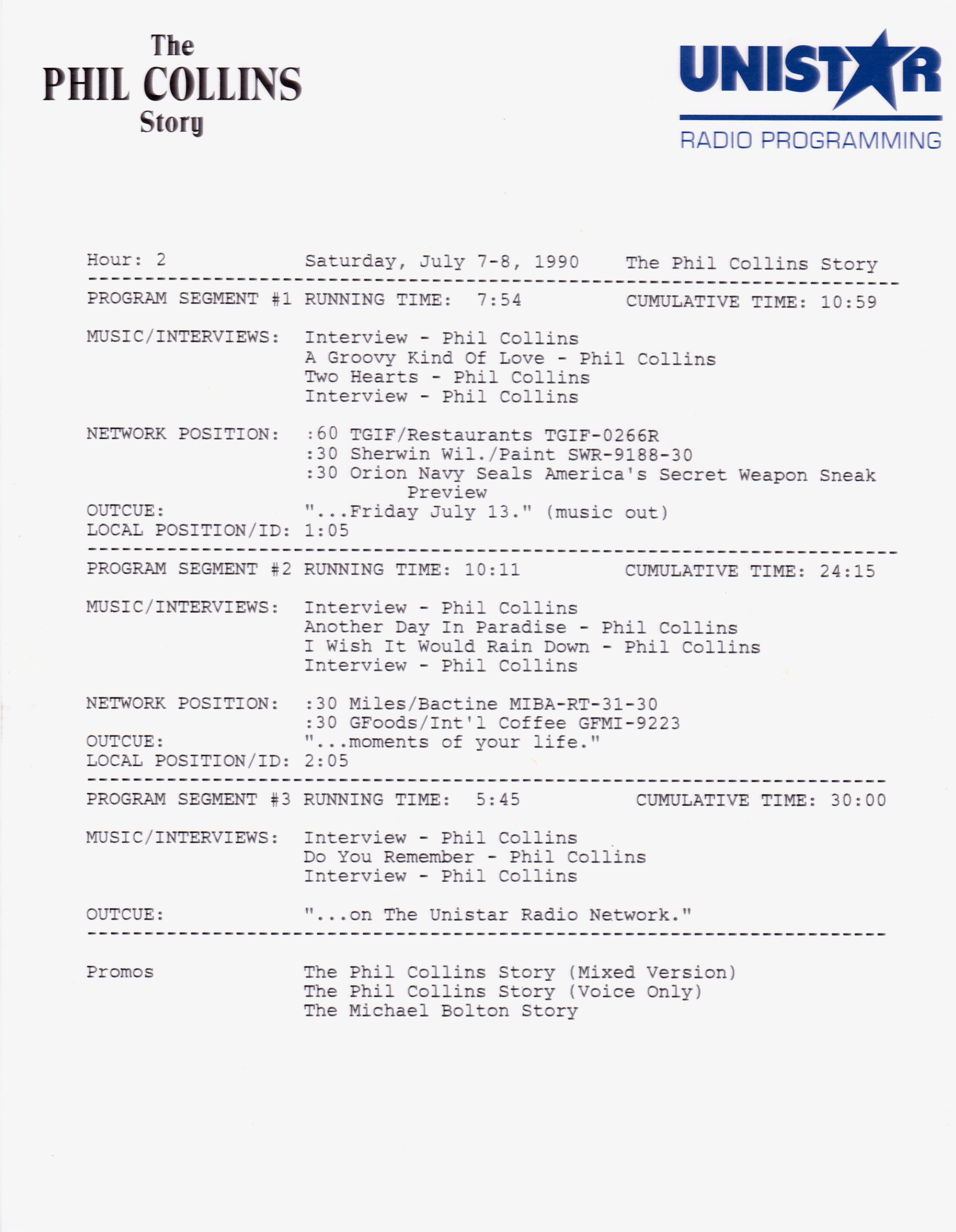 The show contains commercials and studio tracks from several of Phil and Genesis albums including Everyday, Both Sides Of The Story, Follow You, Follow Me, Two Hearts, Do You Remember?, Invisible Touch and Take Me Home.