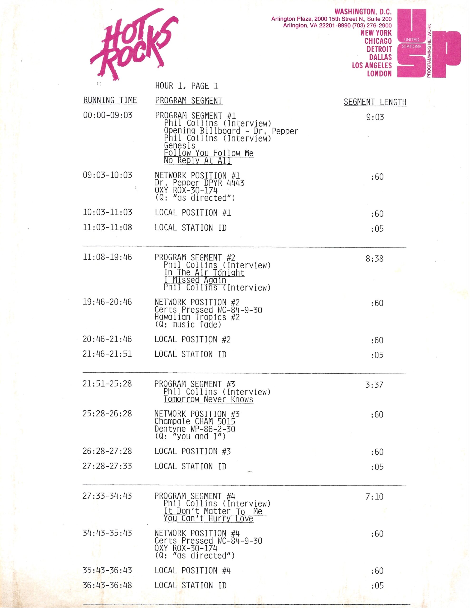 The show contains commercials and studio tracks spanning Phil’s lengthy career, including his time with Genesis. There are also tracks from Robert Plant and Eric Clapton included. I do not have this show in my collection; information obtained from an eBay listing.