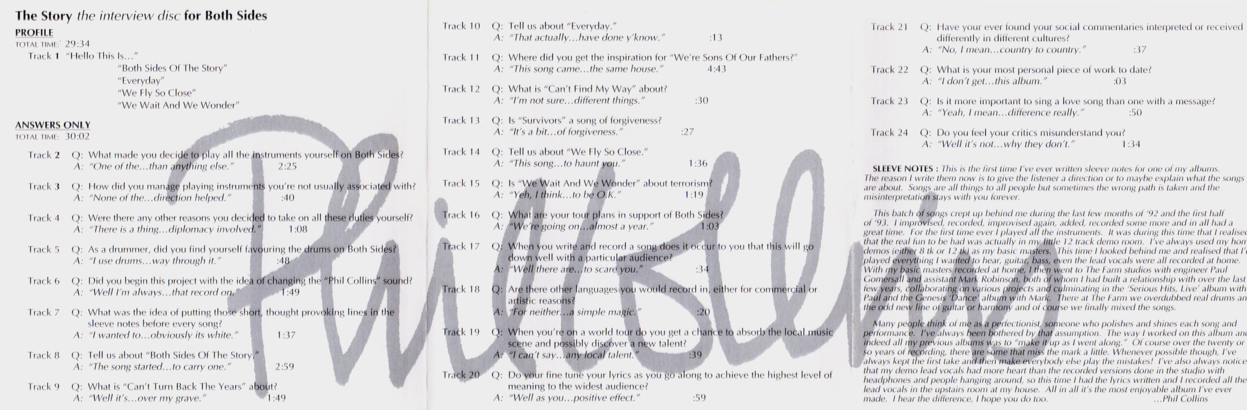 “This is a one sided, 10 track interview LP with one interview with each artist used to broadcast as a fill-in to daily events. Phil has one segment (the 3rd one) on the disc speaking about songs that ended up on FACE VALUE instead of [on a]Genesis [album].”