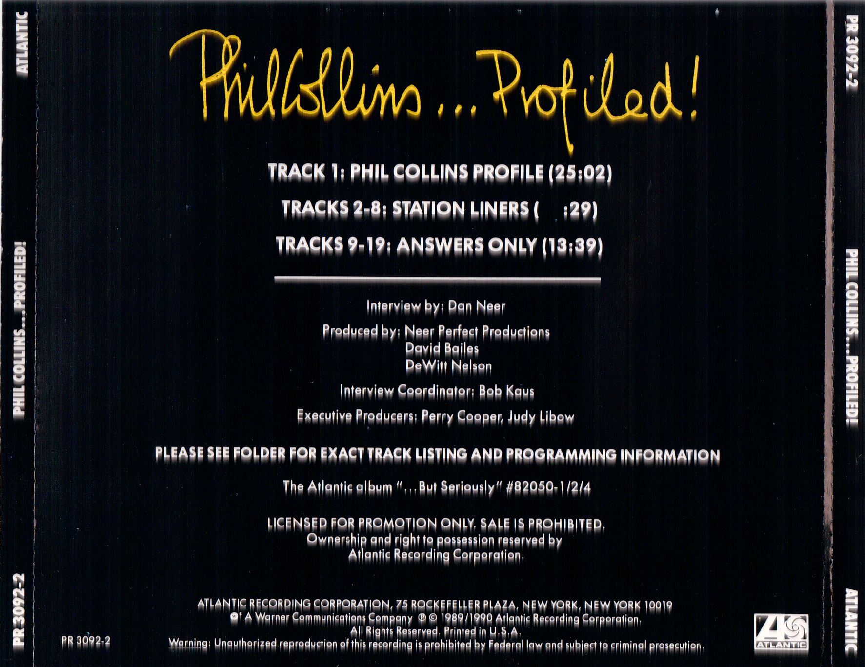 Again, the disc is an official release from Atlantic Records for promotional use, and contains four studio tracks from the listed album along with interview segments. Tracks included are Both Sides Of The Story, Everyday, We Fly So Close and We Wait And We Wonder. Similar to the COLLINS ON COLLINS LP and the Phil Collins Profiled 1990 compact disc in that it contains an “Answers Only” selection of tracks. It also contains a “profile” track which has Phil speaking about making the album along with the aforementioned studio tracks. From my personal collection.