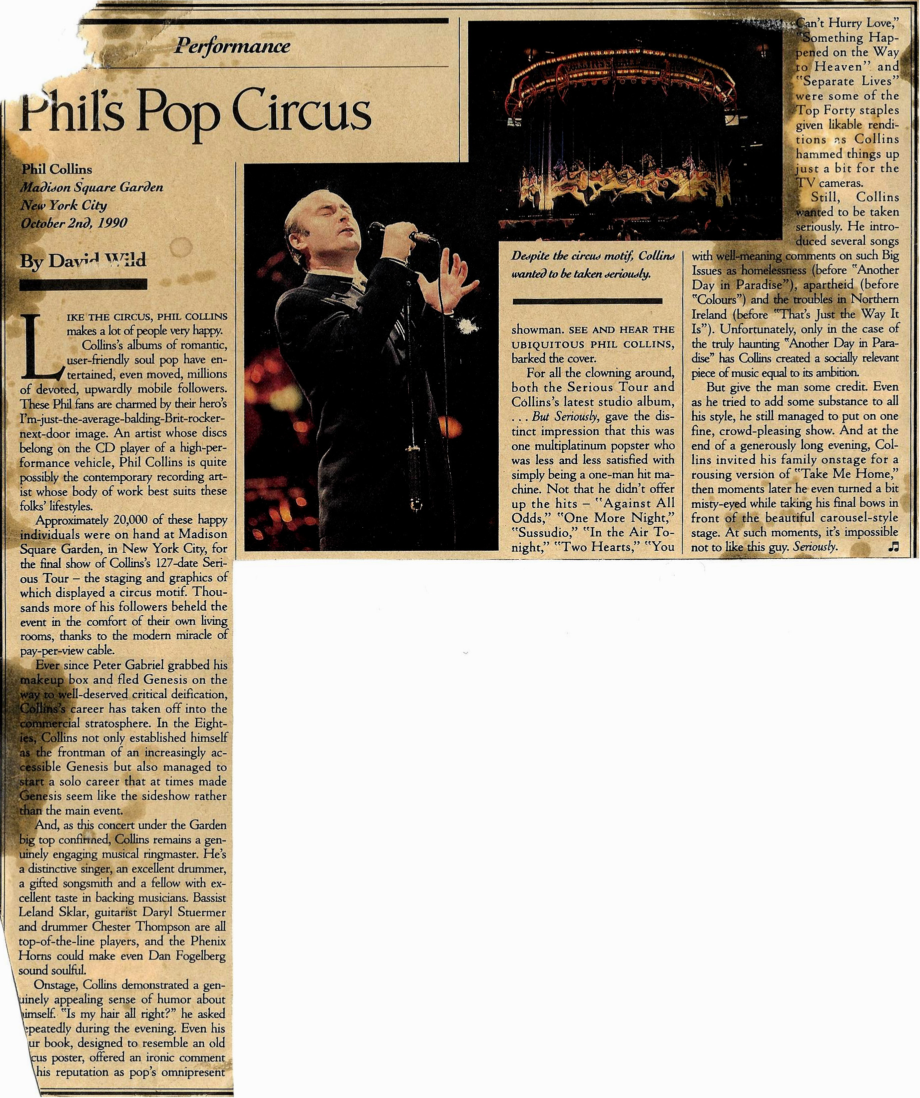 Simulcast across the U.S. on numerous FM radio stations on the final night of the BUT SERIOUSLY World Tour, this concert was simultaneously broadcast as a Pay-Per-View special. While there has been some confusion about the exact date of this concert, some believing it was actually 3 October 1990 in part because Phil’s own website listed that date, it has been confirmed through multiple sources – of which I am one – that the exact show date was 2 October 1990. Partial confirmation came in the form of the notes I took on the night of the recording, which I dated as 2 October 1990. I wrote this date directly onto the VHS tape and audio cassette tapes which I used to capture the performance. In addition, I have attached a scan below of a Rolling Stone magazine article written about this exact show, and said article clearly states the date as 2 October. (The article itself is rather stained and torn, as I had it for many years hanging on my wall. I am still searching for the exact issue this article came from, and will upload a new scan if I find it.)
