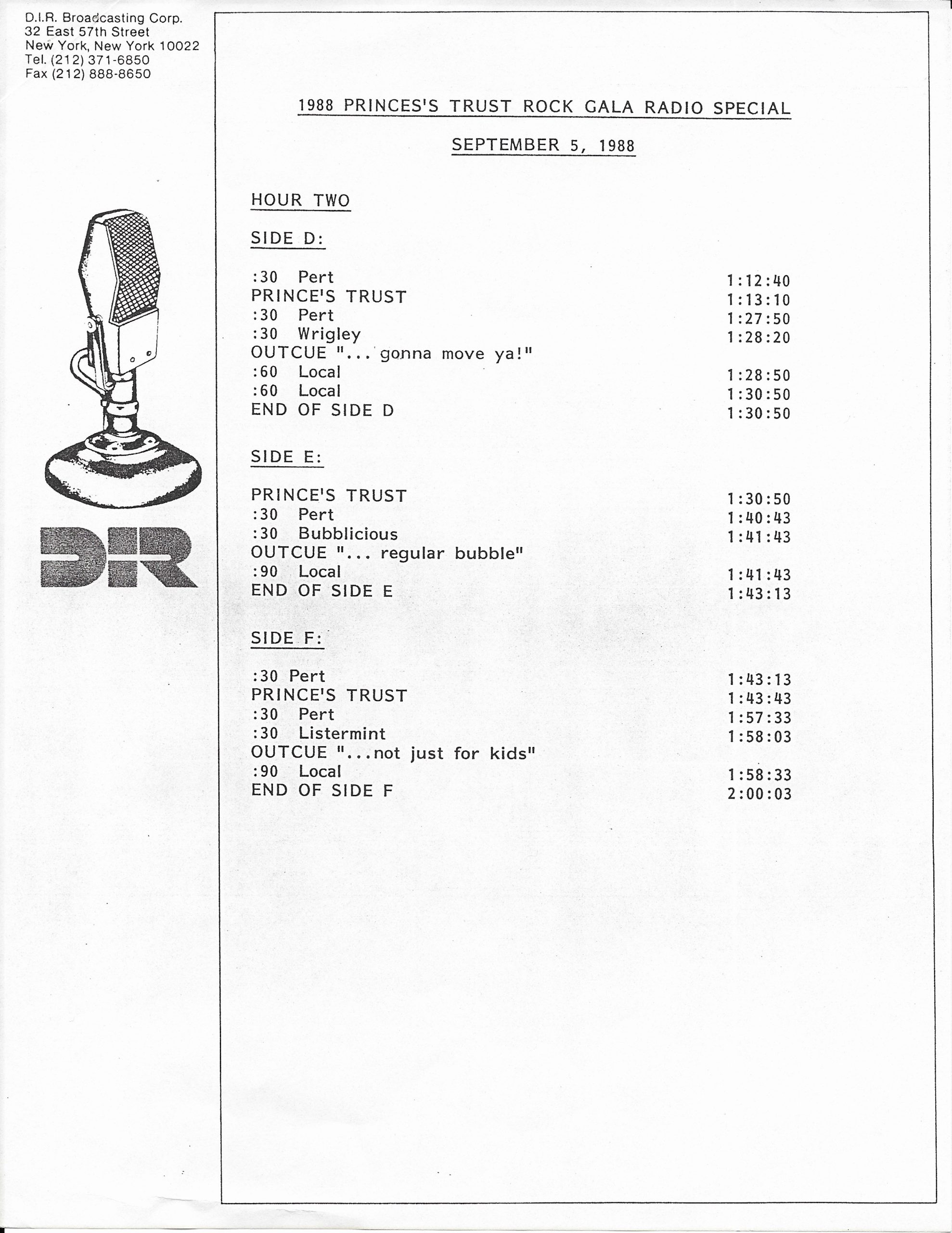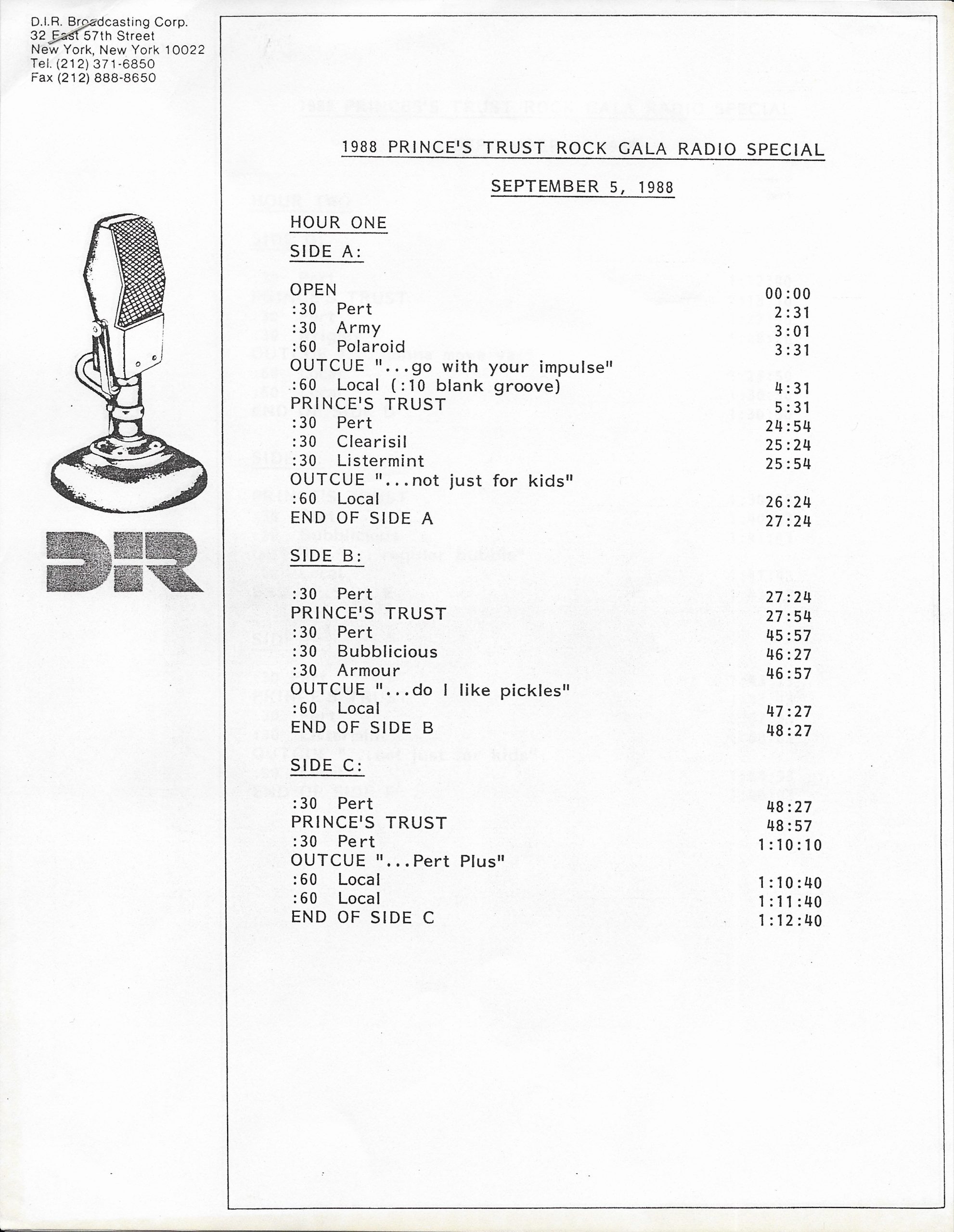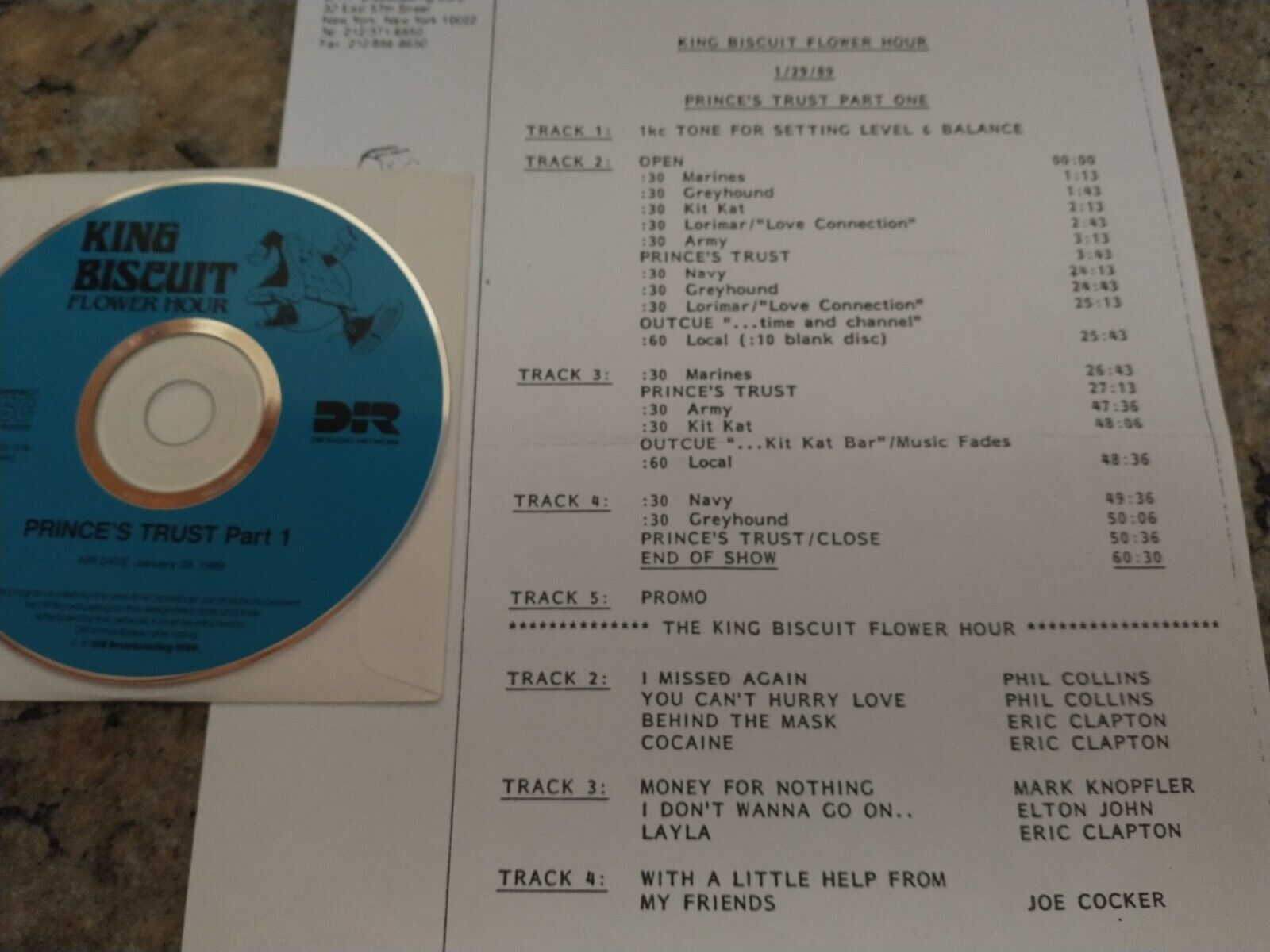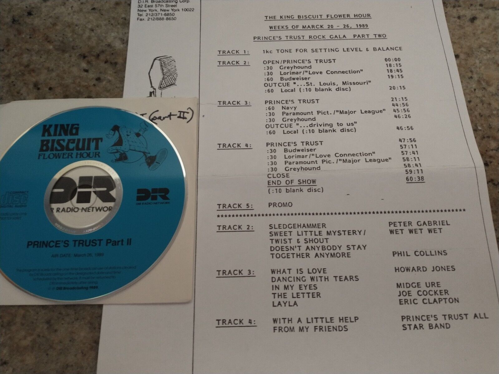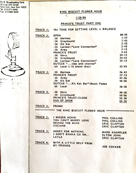 Our friends at the King Biscuit Flower Hour reproduced the 1988 Prince’s Trust show and repackaged it onto compact disc on at least one occasion (and possibly two – more on that in a moment) for broadcast across two weekends in 1989. Their show was significantly edited down to fit onto two discs. Phil’s solo performances, including two of the three songs listed above, namely You Can’t Hurry Love and I Missed Again, appear on Part I, while the track Doesn’t Anybody Stay Together Anymore? shows up on Part II. Discogs only lists Part I of II, but information from an eBay listing does show that the broadcast contained two discs. (Oddly, the eBay listing shows an image of the cue sheet for Part II with a date of 20 – 26 March 1989. This would lead me to believe that the show was broadcast at least twice in 1989; once at the end of January into early February, and again in mid-to-late March.)