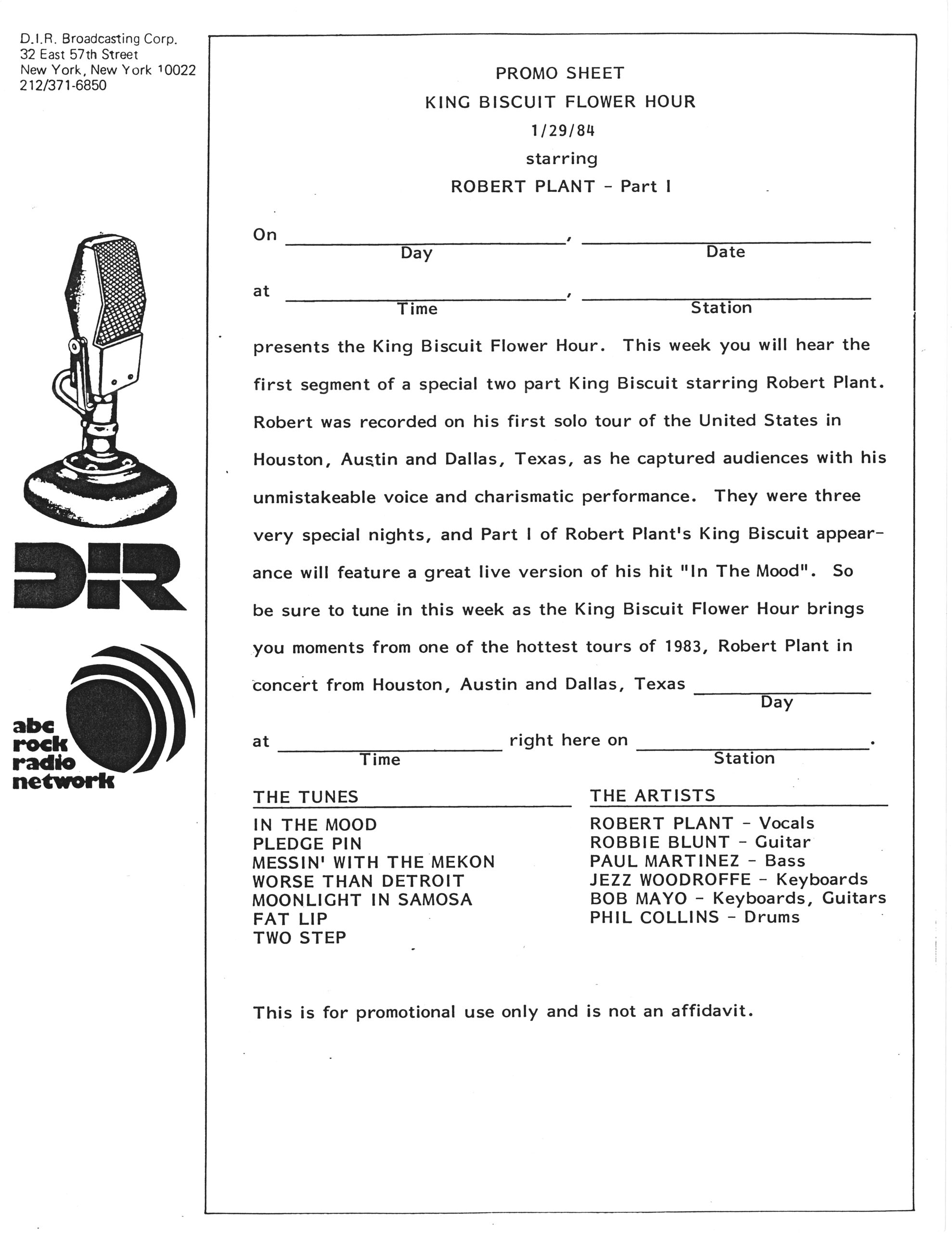 In late 1983, after completing his first solo tour, Phil hit the road for a brief stint as Robert Plant’s drummer on Plant’s very own first solo outing. The King Biscuit Flower Hour captured three nights from this tour and edited them together for a huge four LP radio show which aired over consecutive weekends in early 1984.