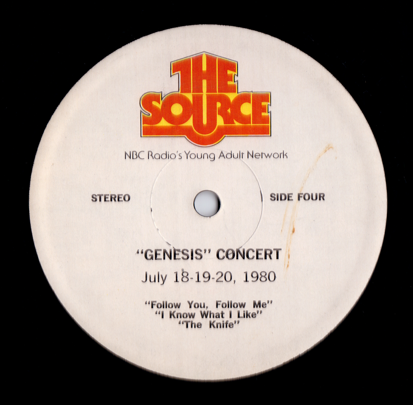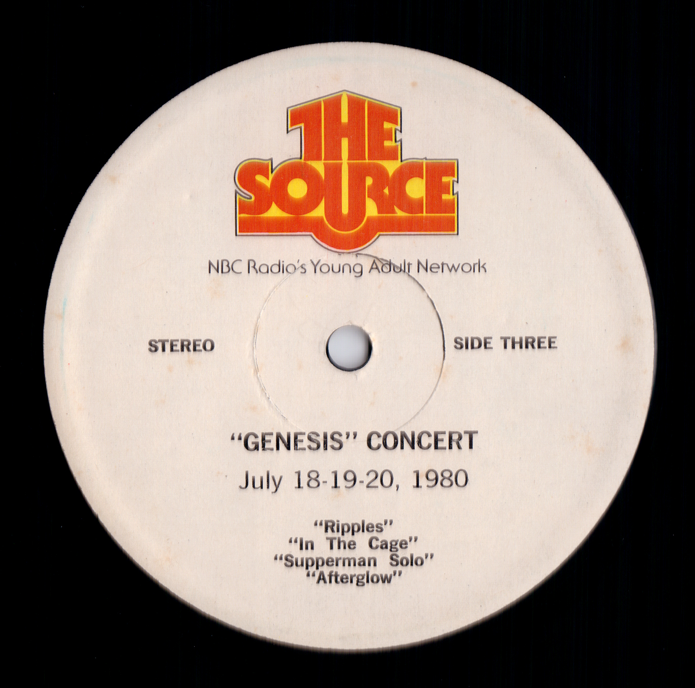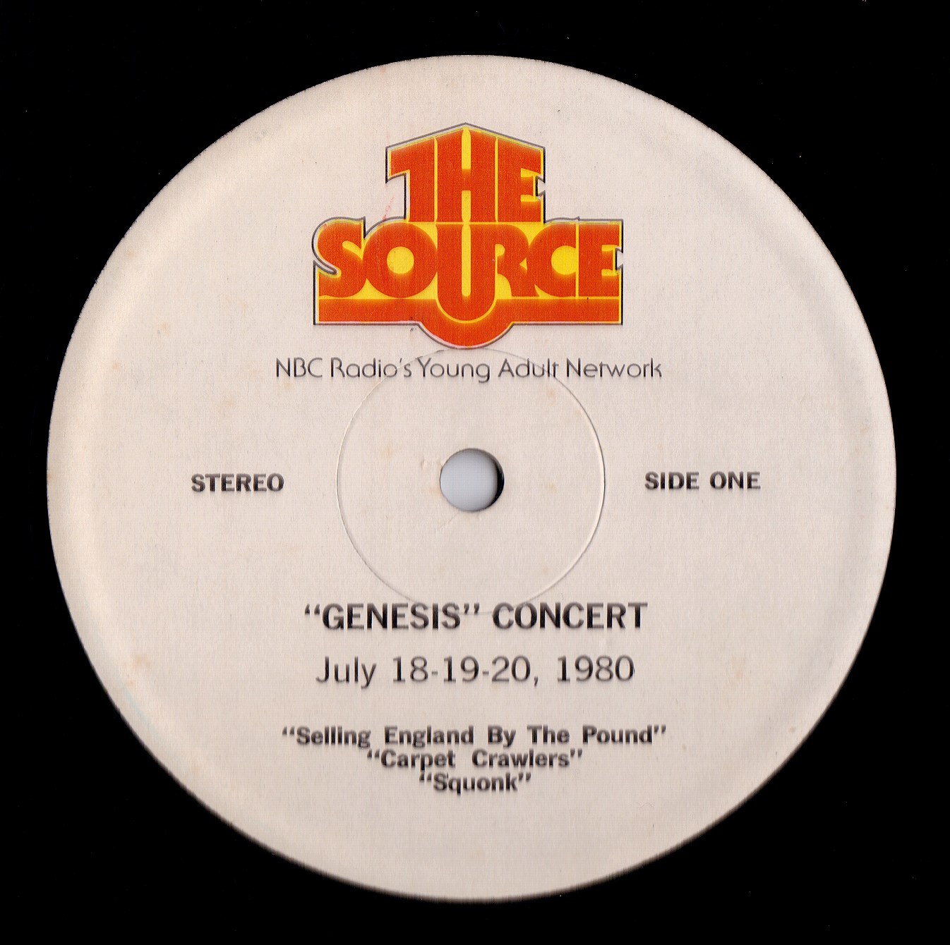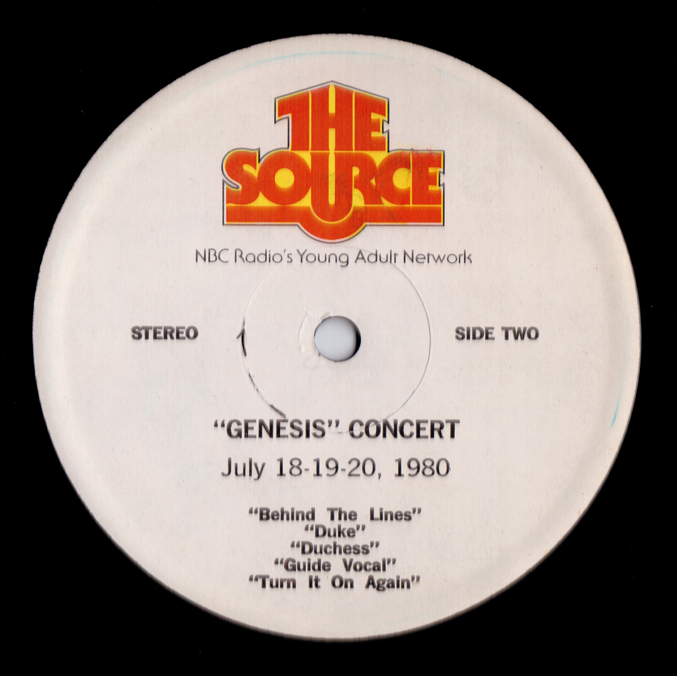 This historic Lyceum 7 May 1980 concert had air time in the U.S. courtesy of The Source, a program put out by NBC since 1979, distributed via radio show LPs. Seventy minutes of the live Genesis are supplemented with the usual announcements and adverts. The venue is mistakenly identified as Drury Lane Theatre. Note: Follow You, Follow Me from this show was used on the official release THREE SIDES LIVE.