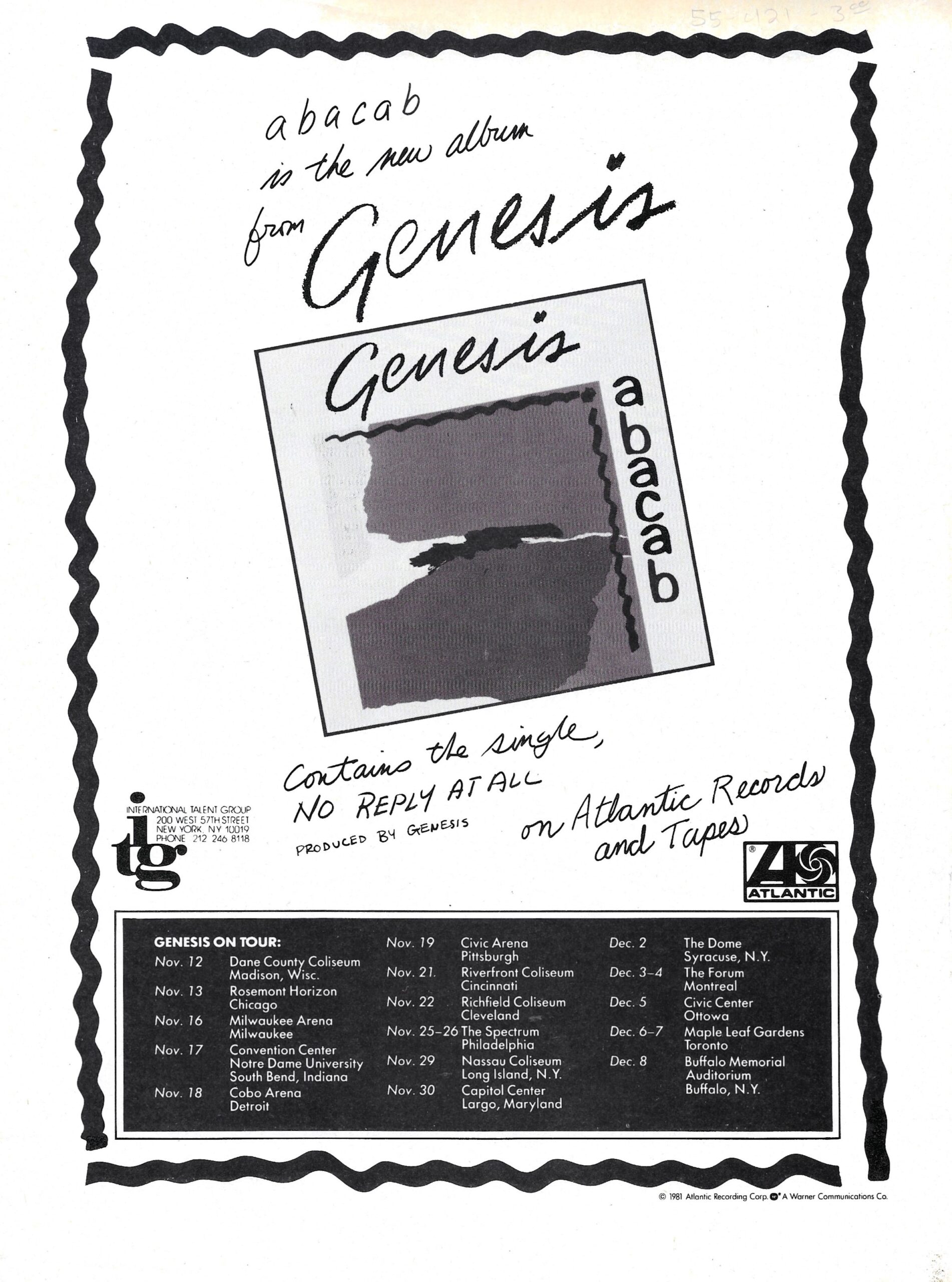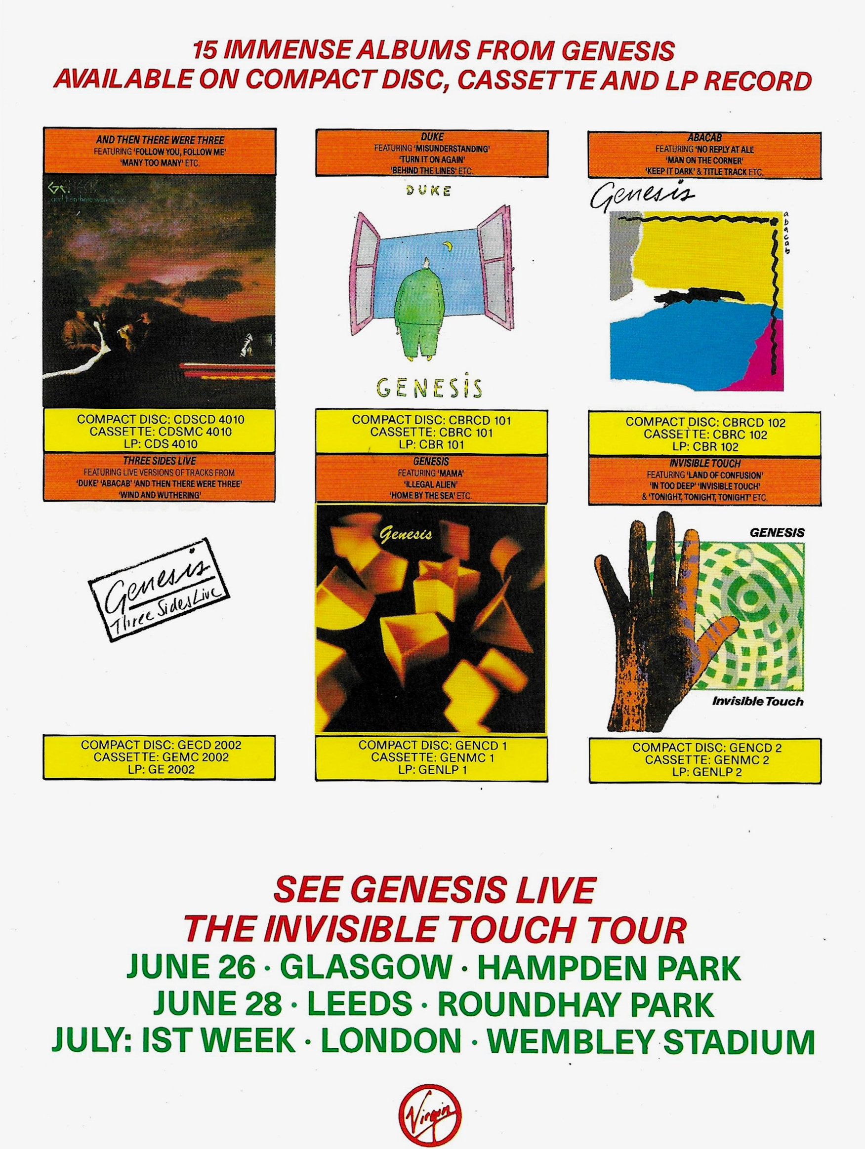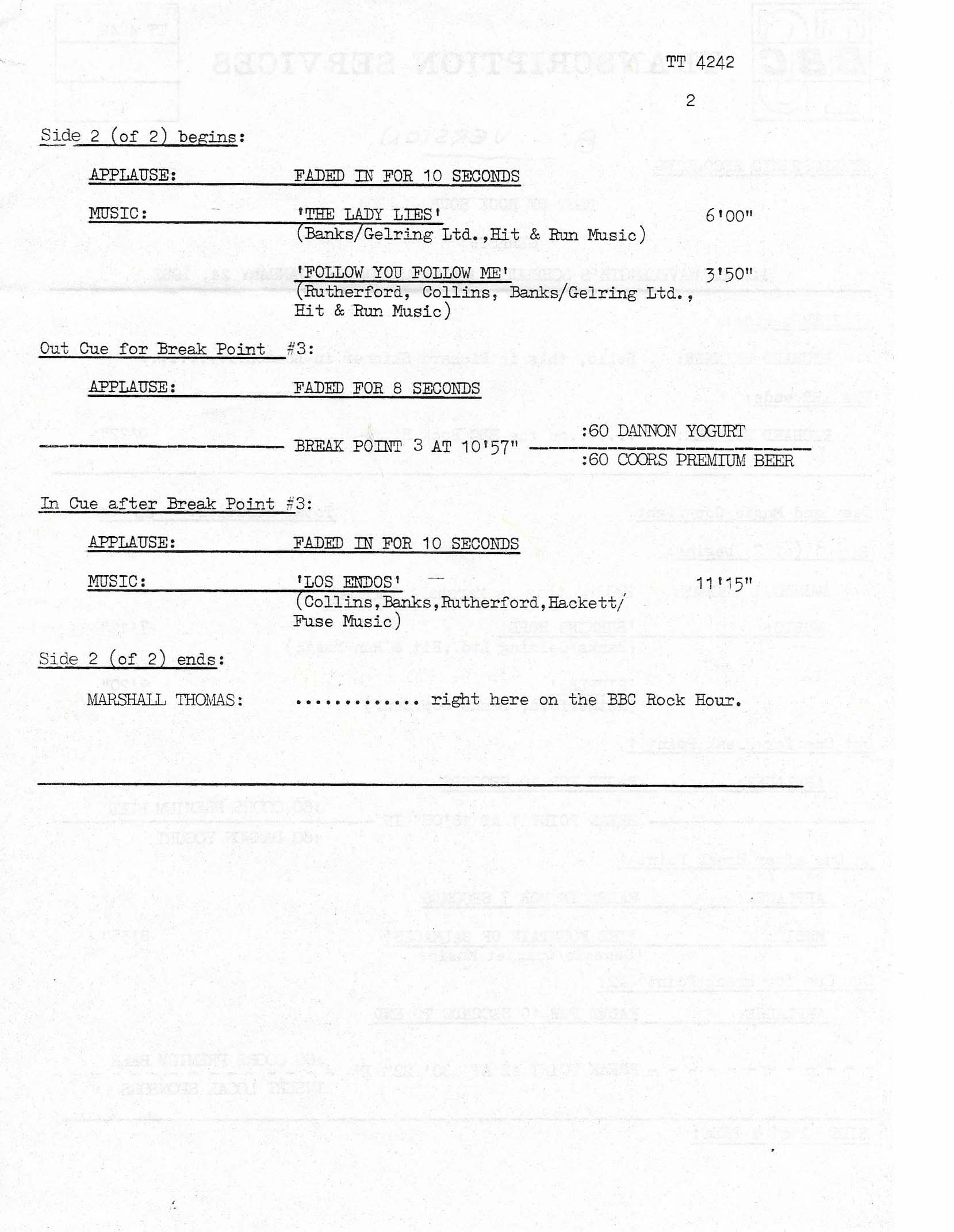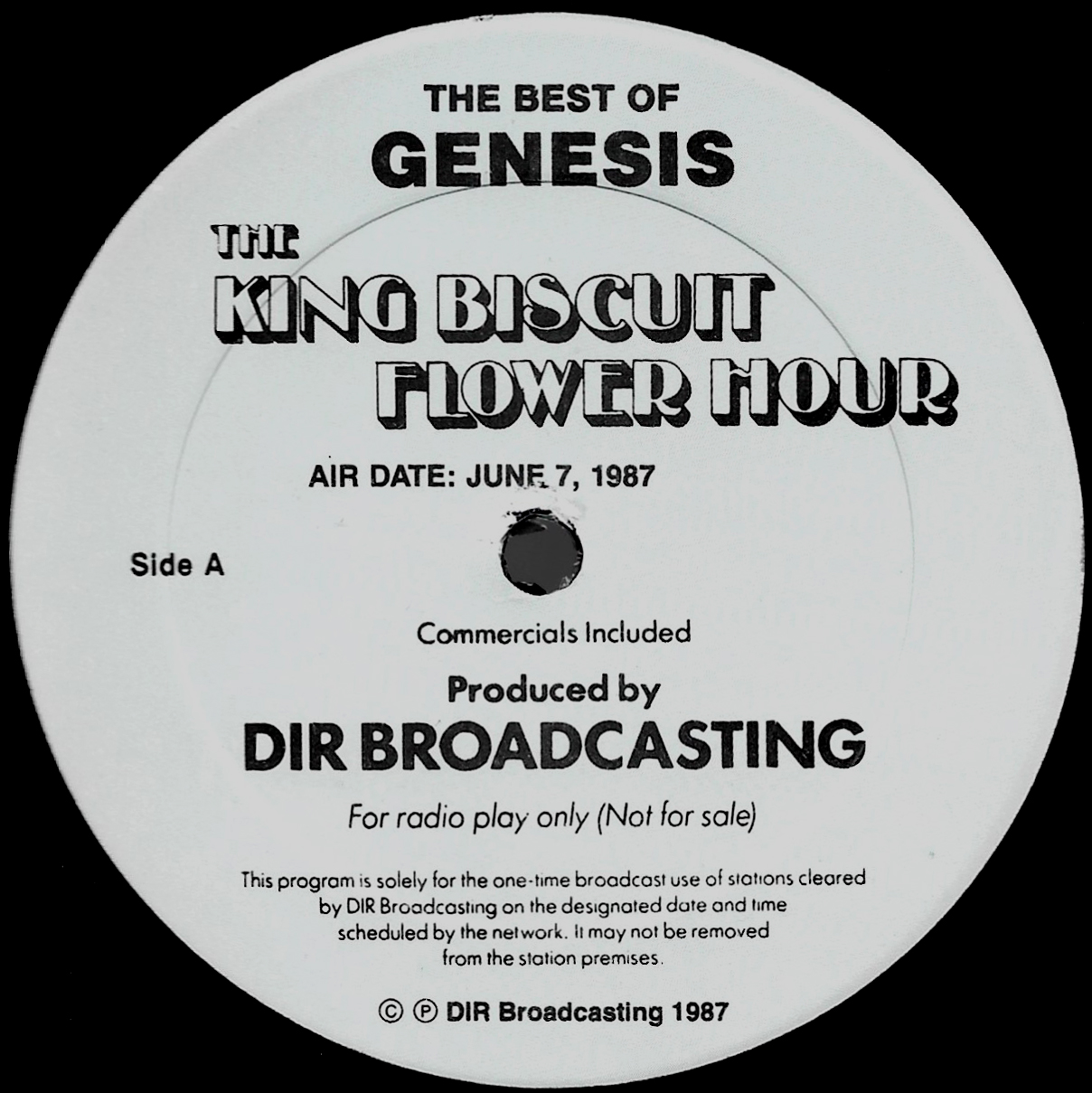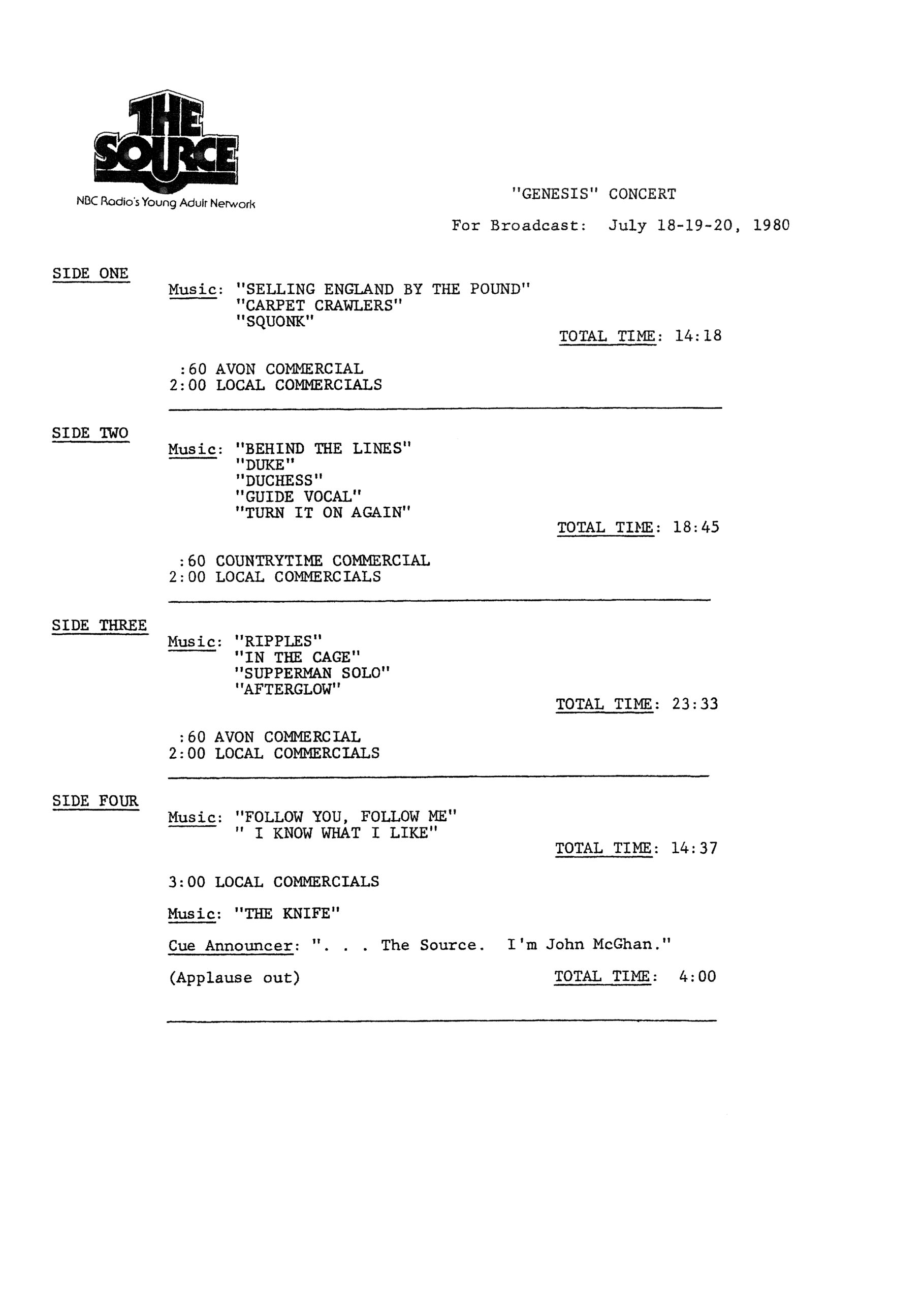 This historic Lyceum 7 May 1980 concert had air time in the U.S. courtesy of The Source, a program put out by NBC since 1979, distributed via radio show LPs. Seventy minutes of the live Genesis are supplemented with the usual announcements and adverts. The venue is mistakenly identified as Drury Lane Theatre. Note: Follow You, Follow Me from this show was used on the official release THREE SIDES LIVE.