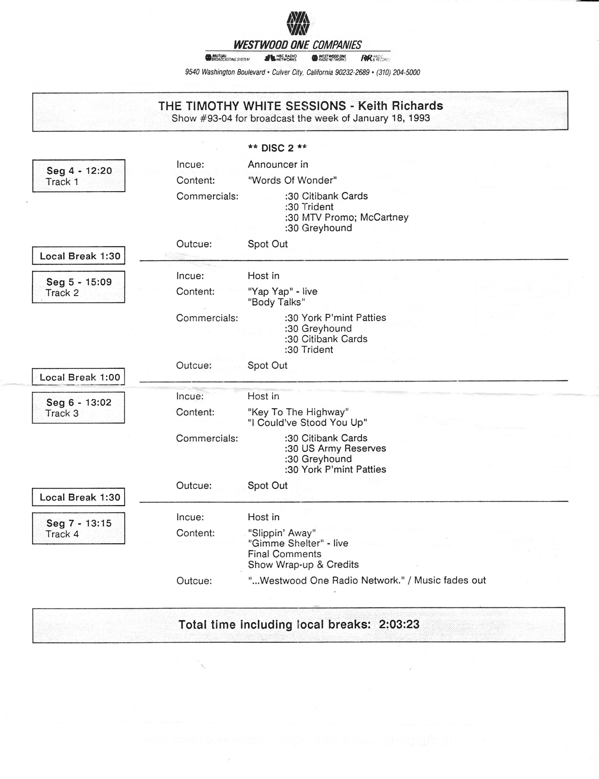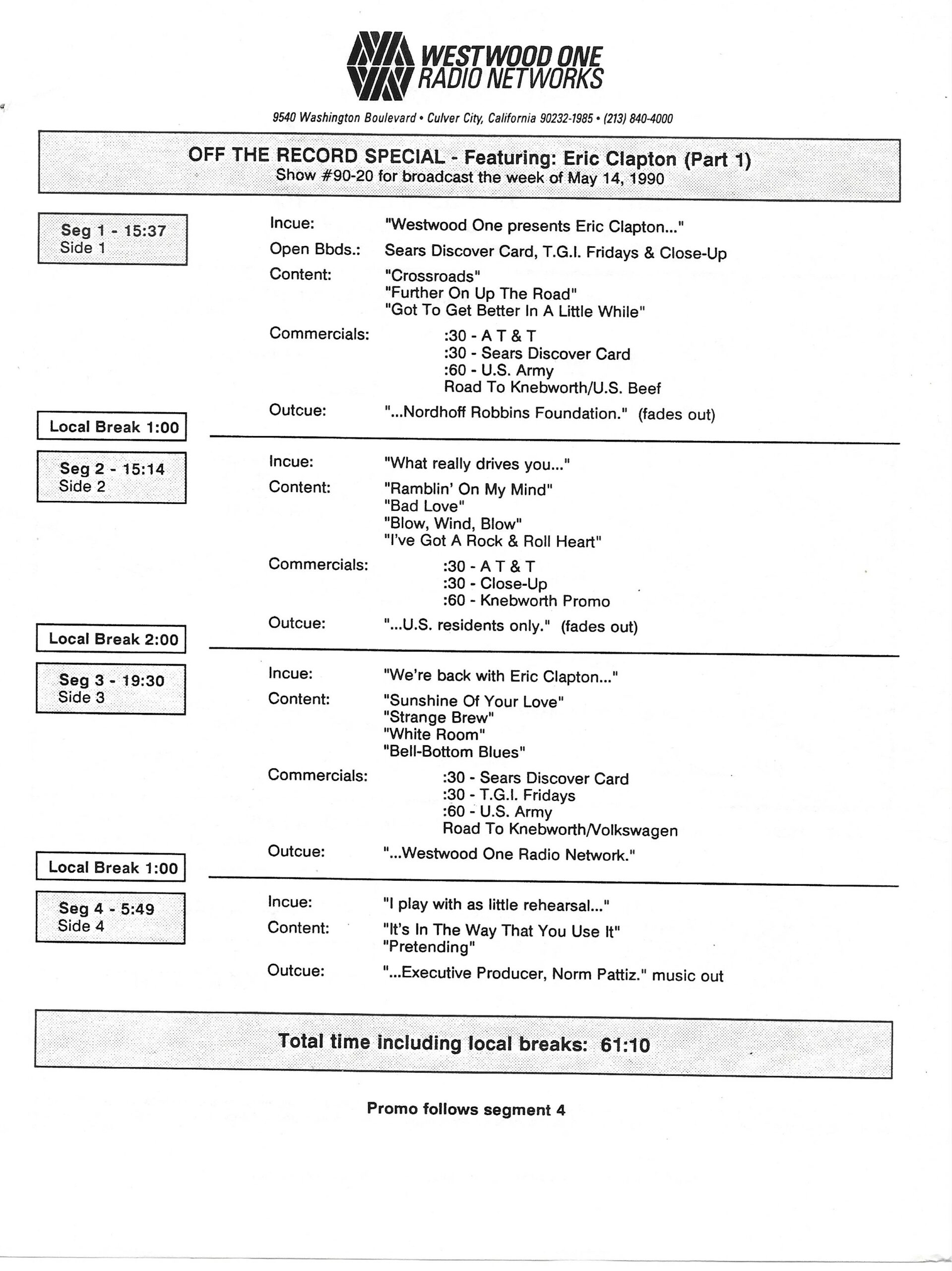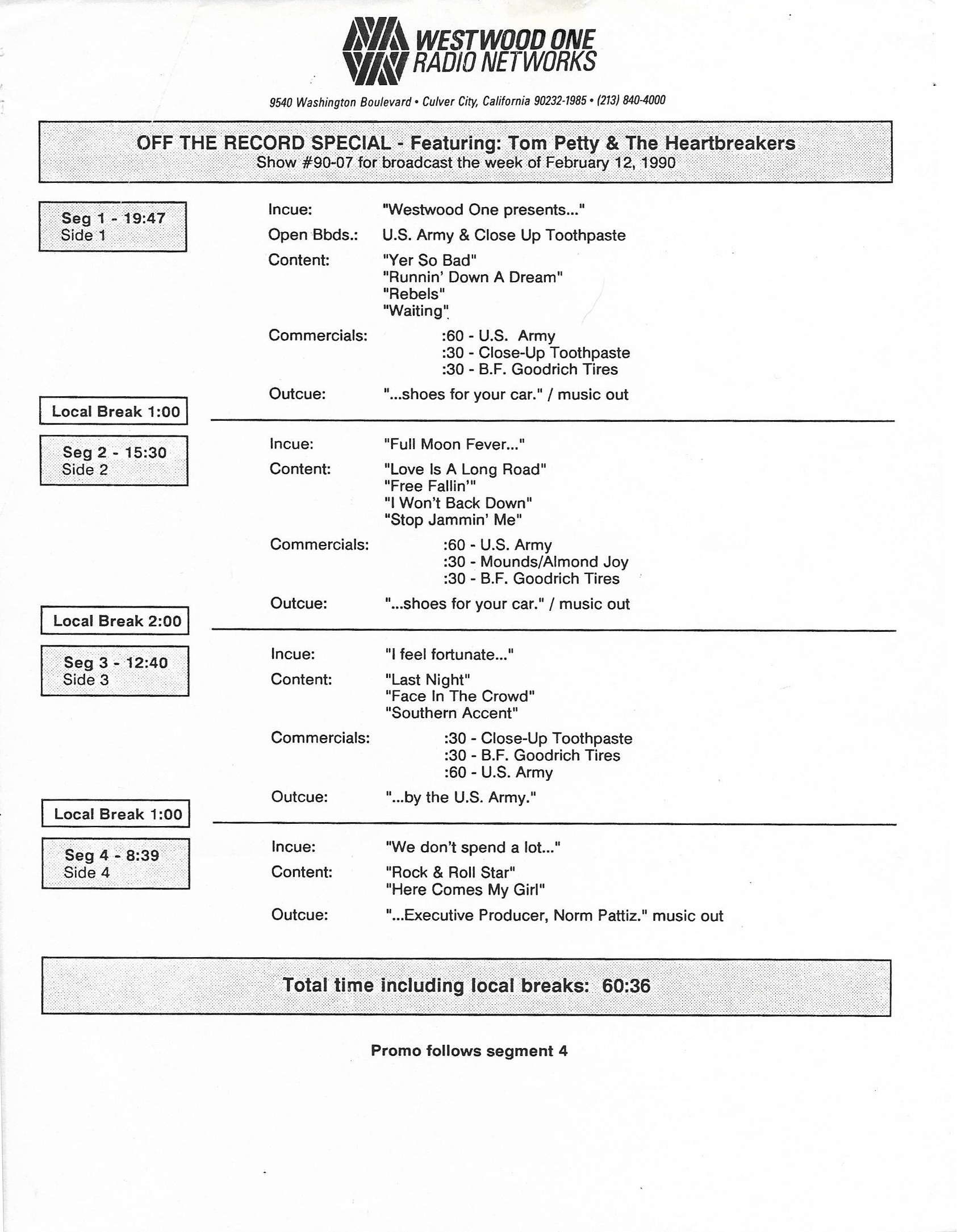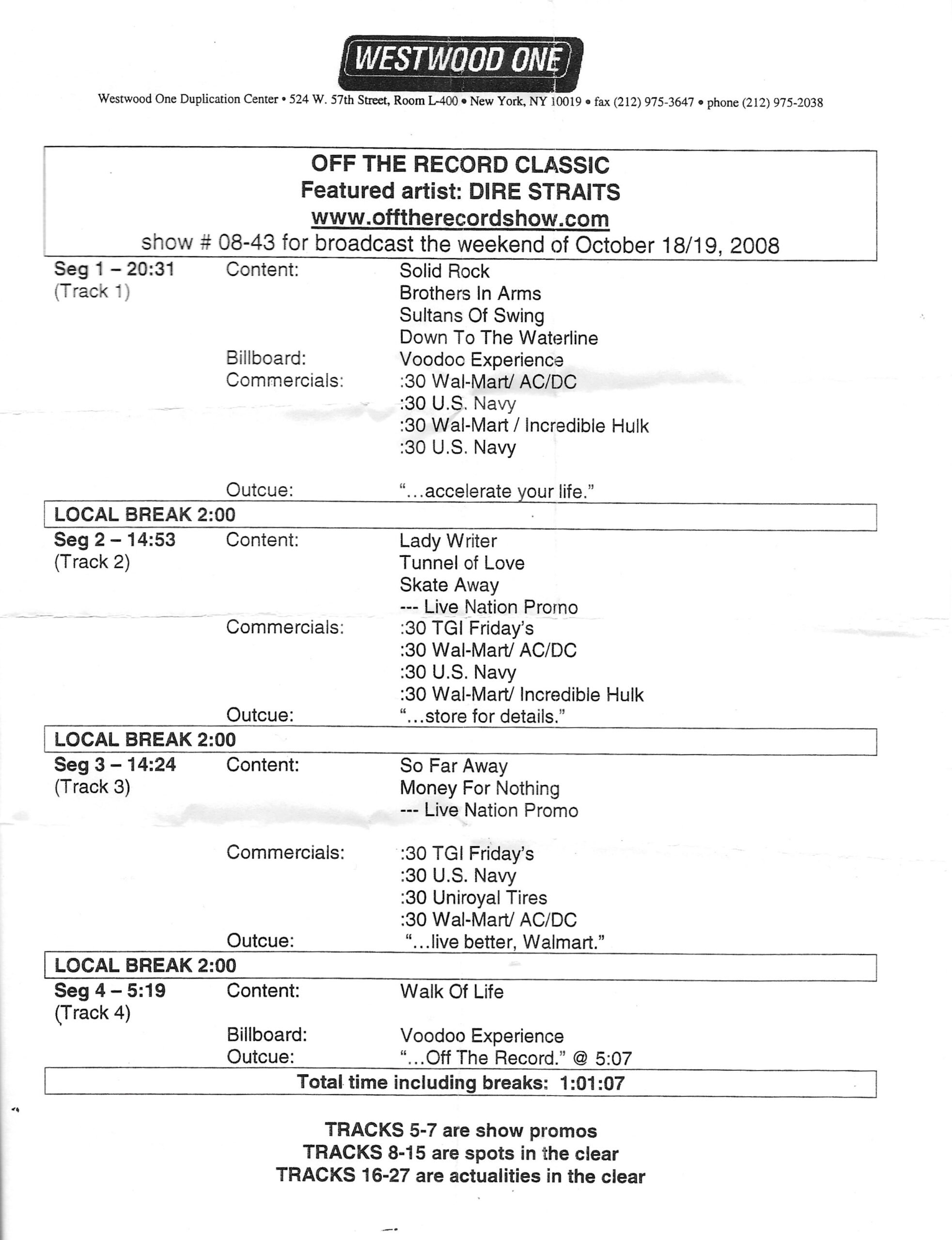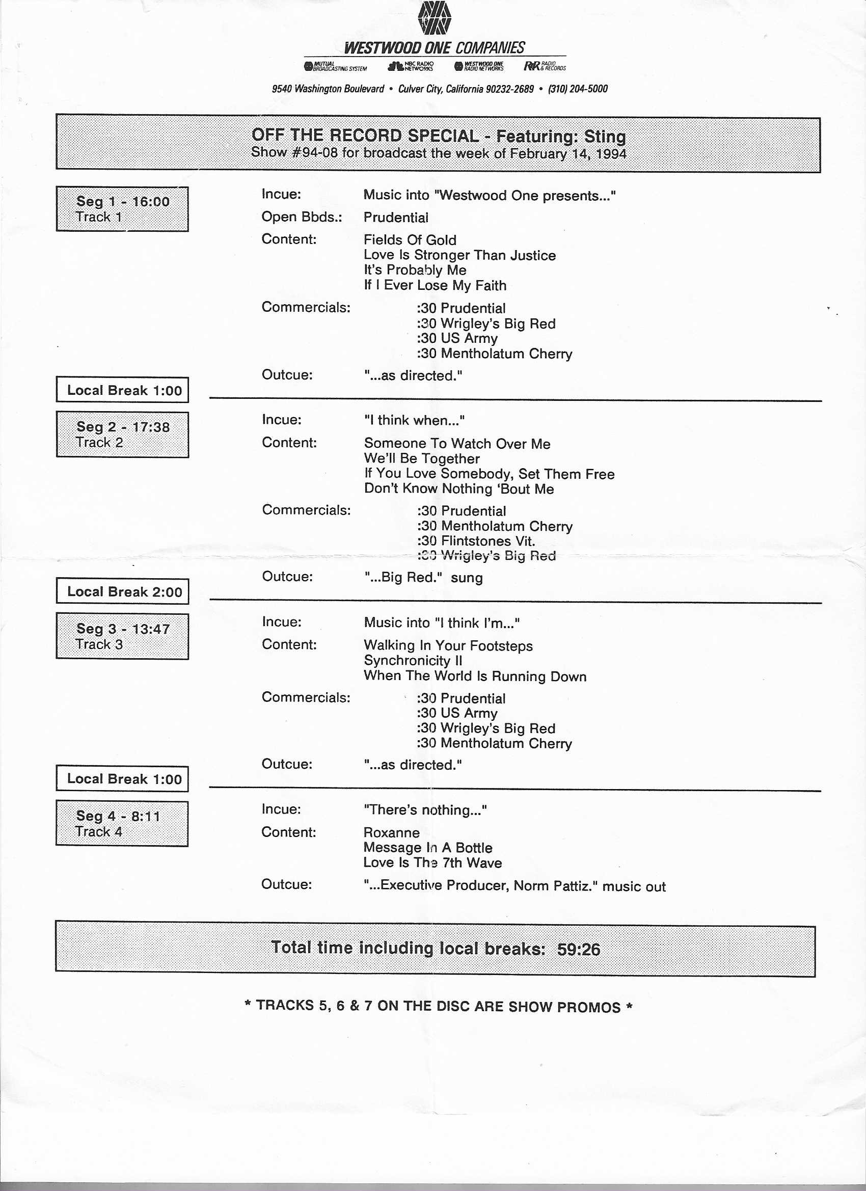 Tracks 1 – 4 are the actual radio show, Tracks 5 – 7 are promo spots, Tracks 8 – 15 are commercial spots, while Tracks 16 – 27 are the actual interview segments and segment intros separated into individual tracks.