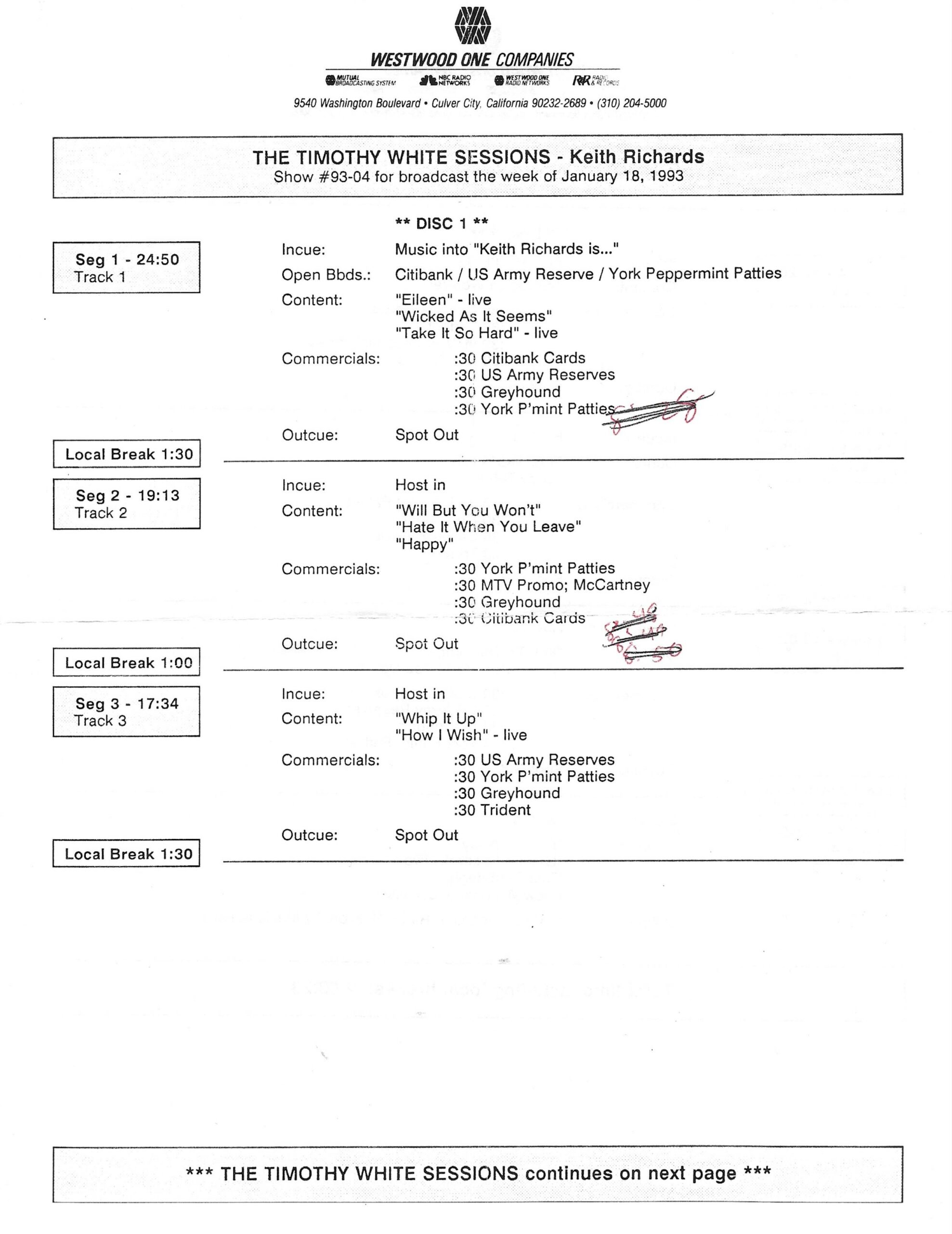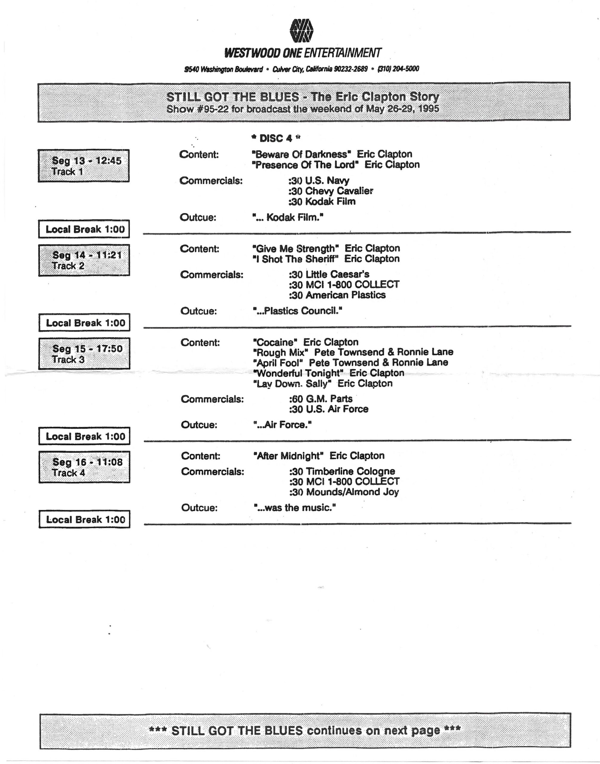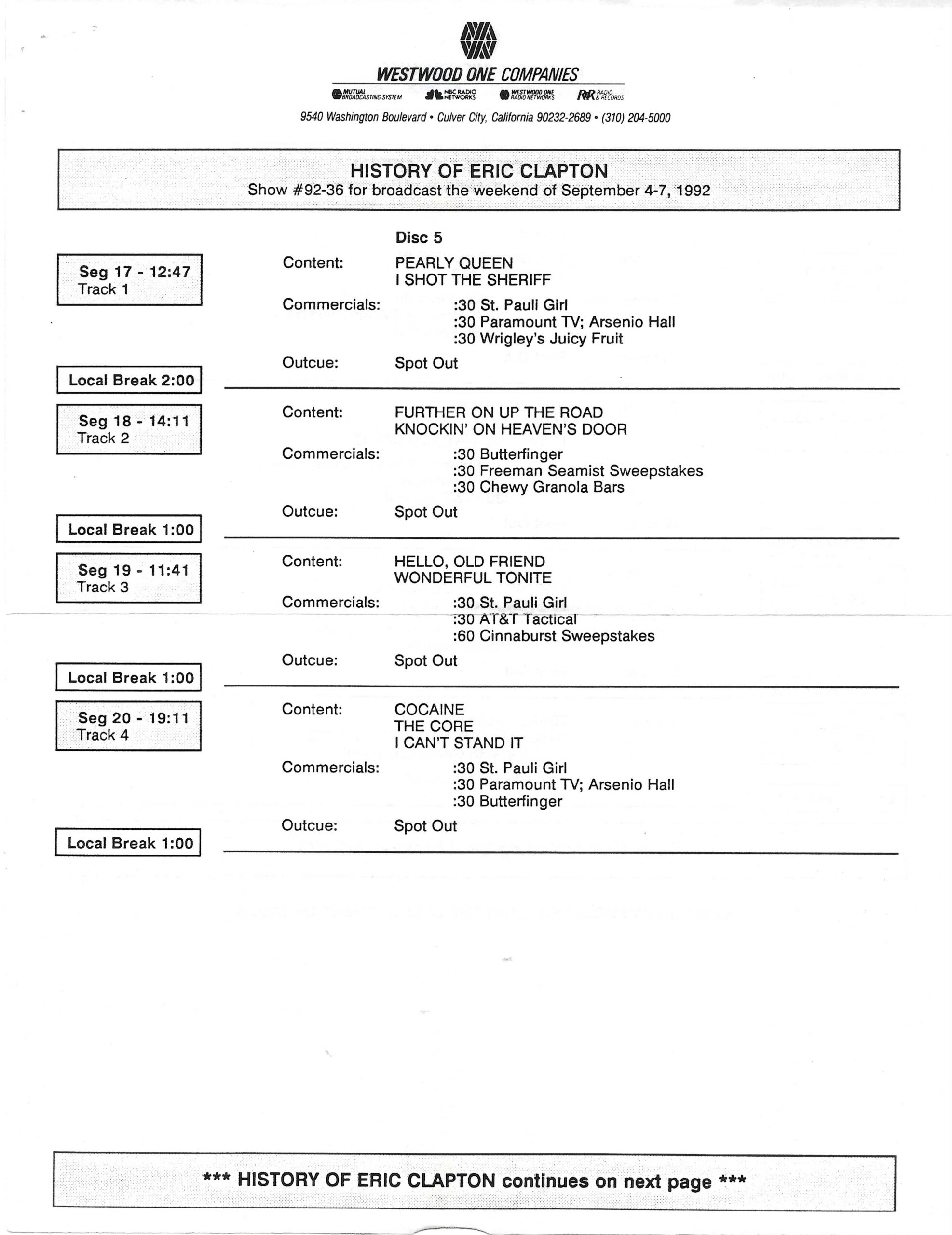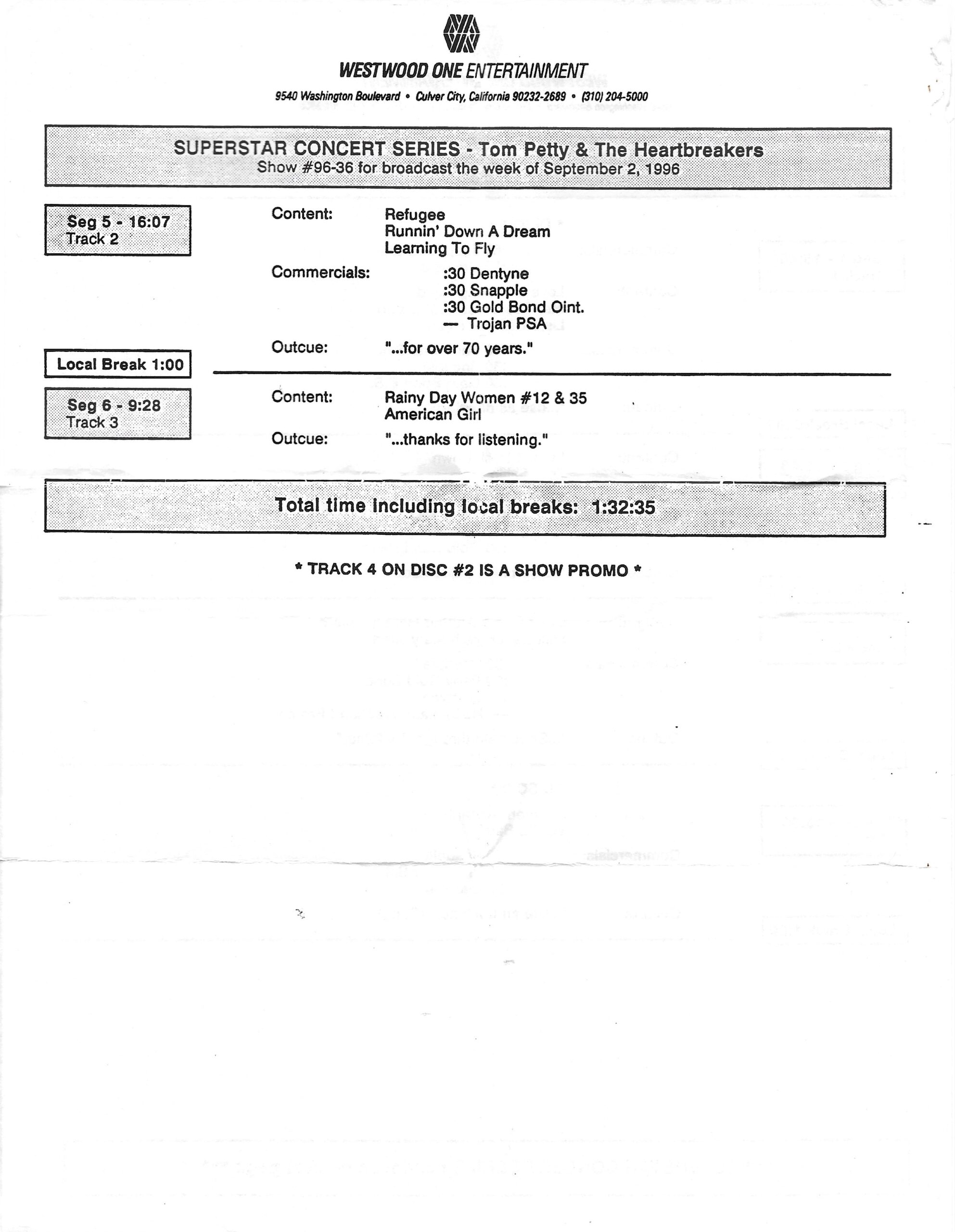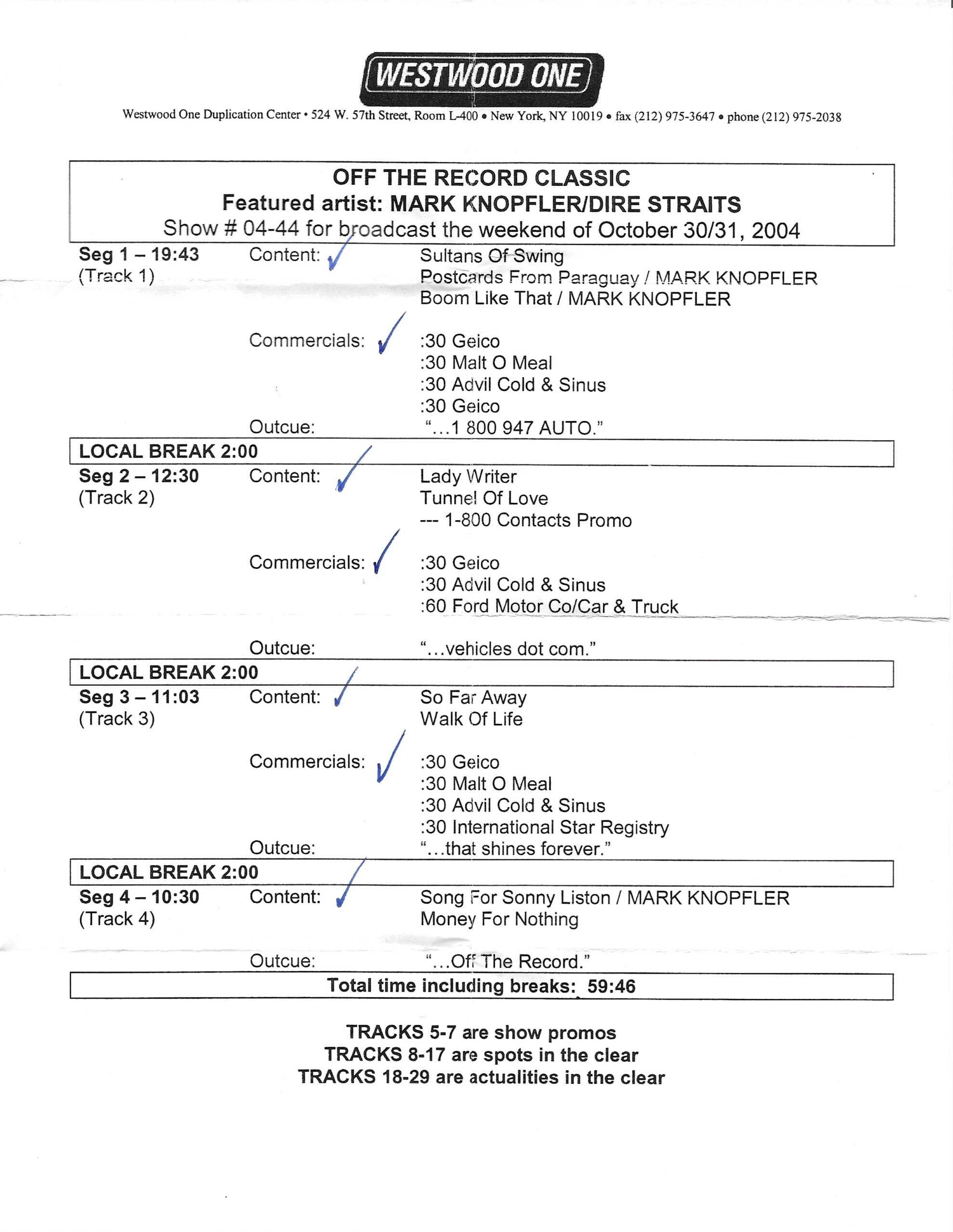 Tracks 1 – 4 are the actual radio show, Tracks 5 – 7 are promo spots, Tracks 8 – 15 are commercial spots, while Tracks 16 – 27 are the actual interview segments and segment intros separated into individual tracks.