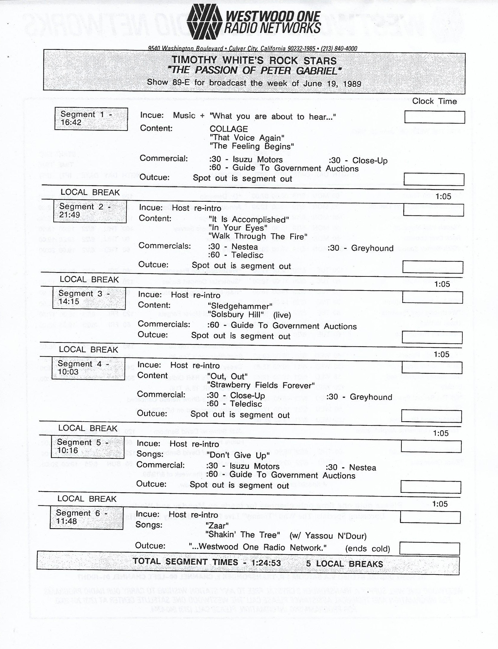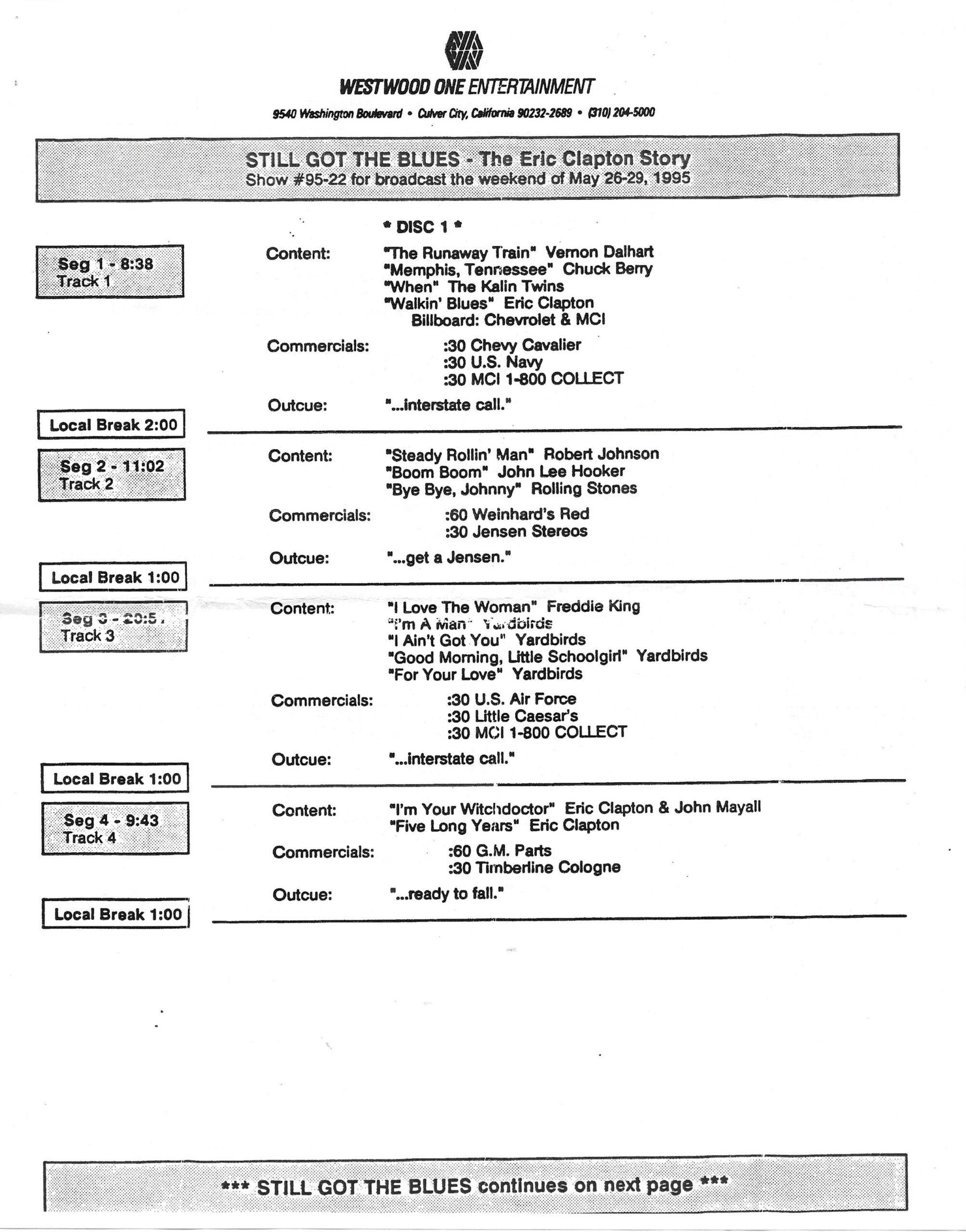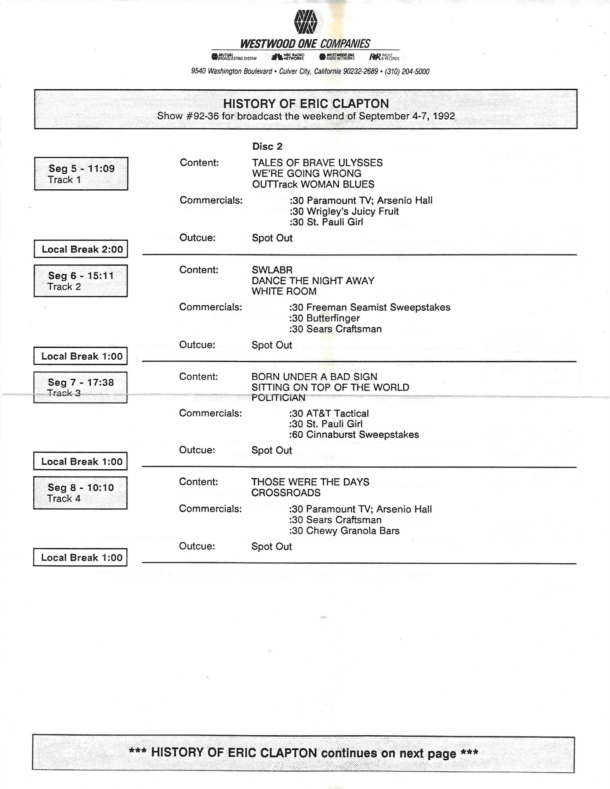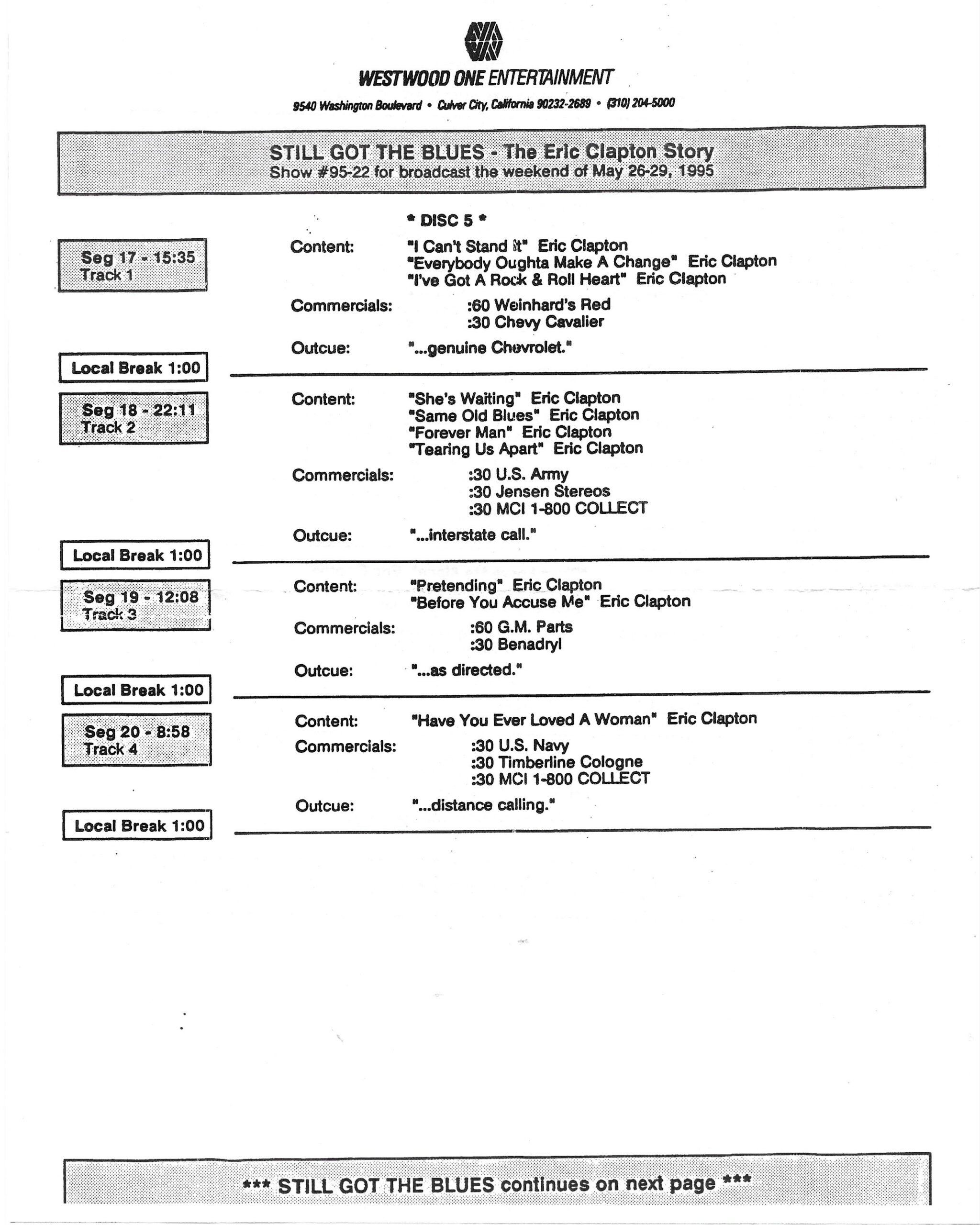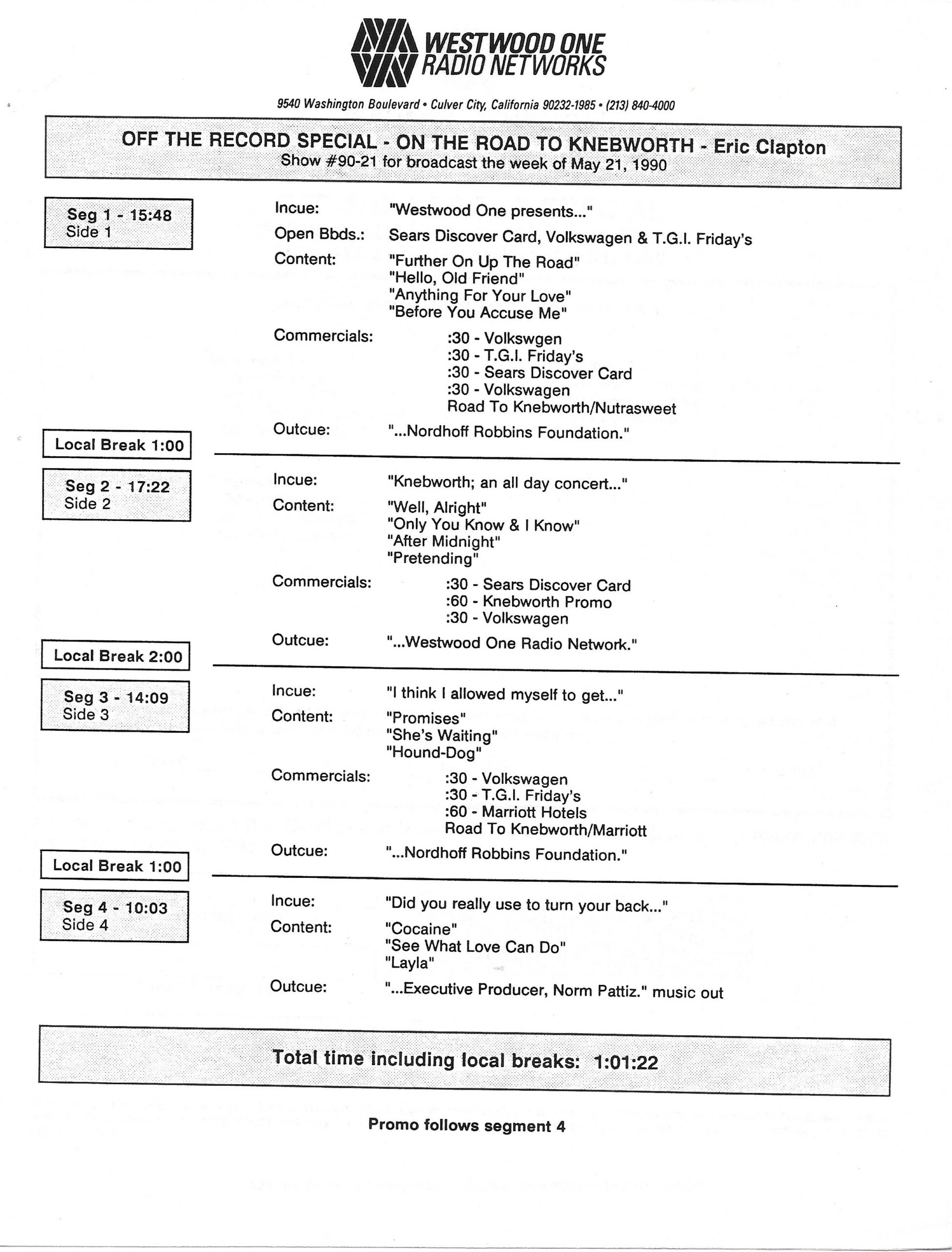 Tracks 1 – 4 are the actual radio show, Tracks 5 – 7 are promo spots, Tracks 8 – 15 are commercial spots, while Tracks 16 – 27 are the actual interview segments and segment intros separated into individual tracks.