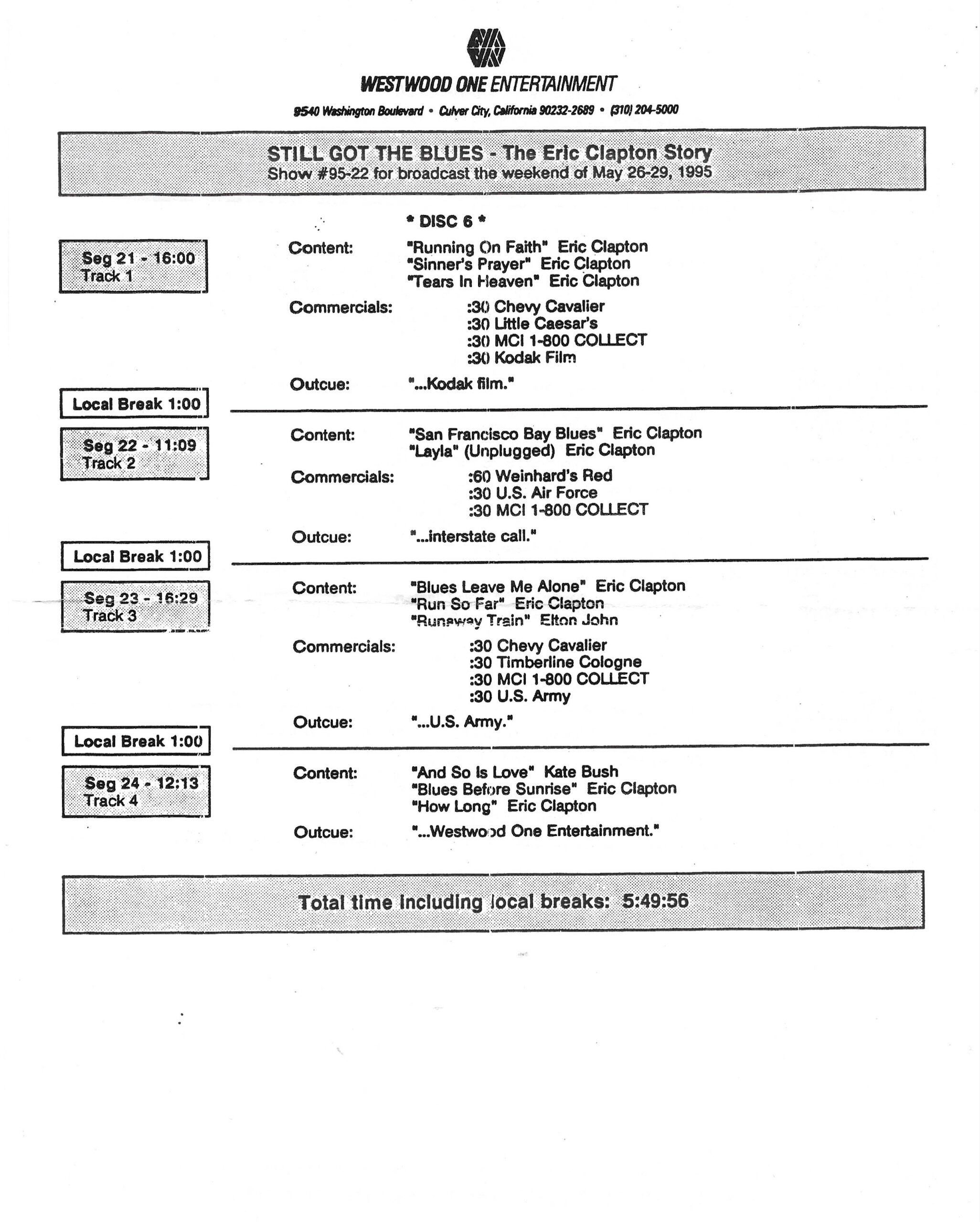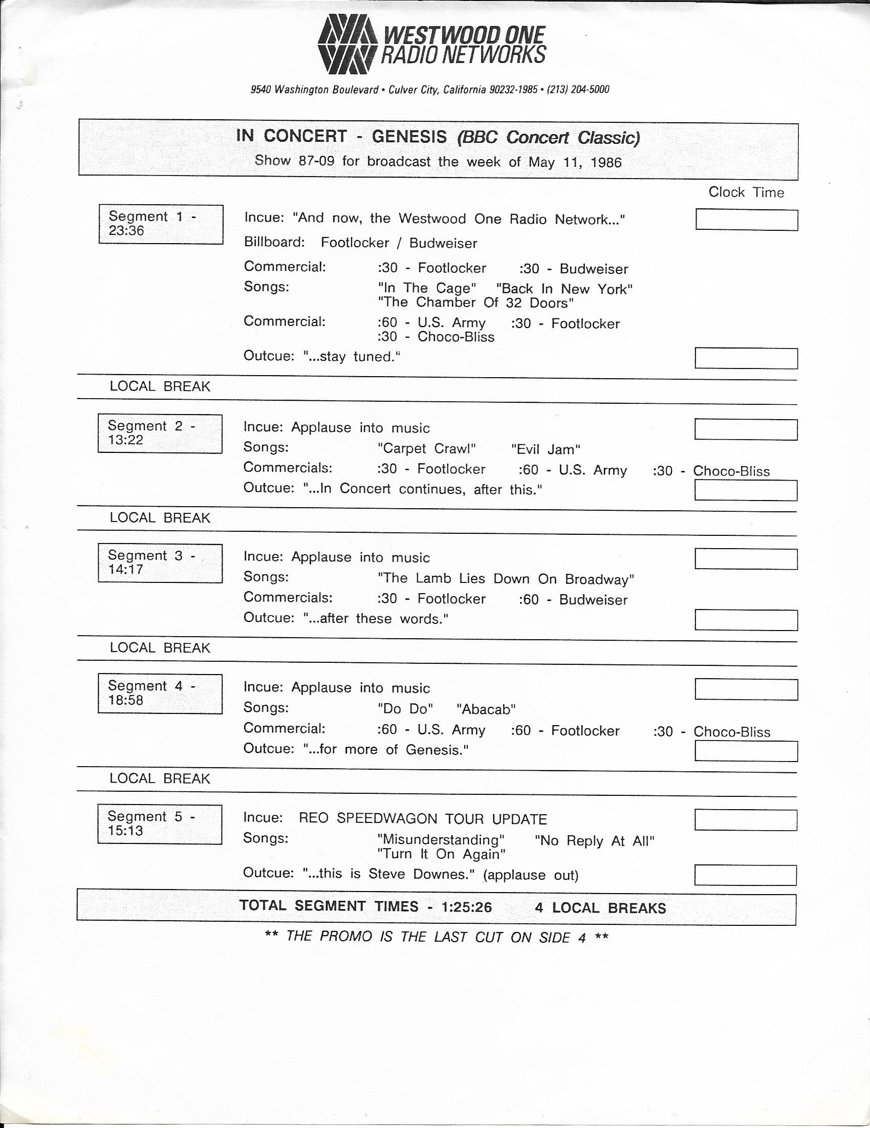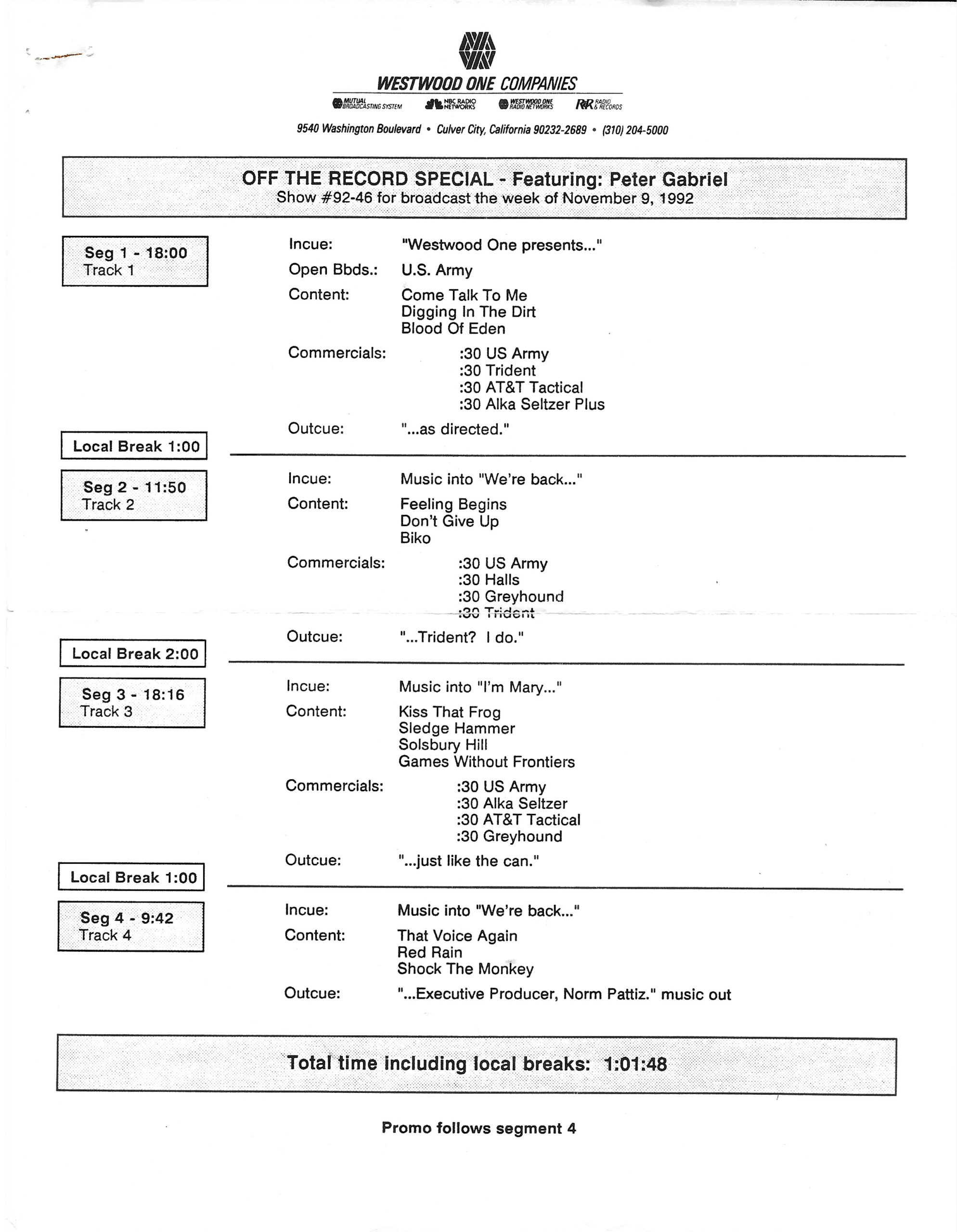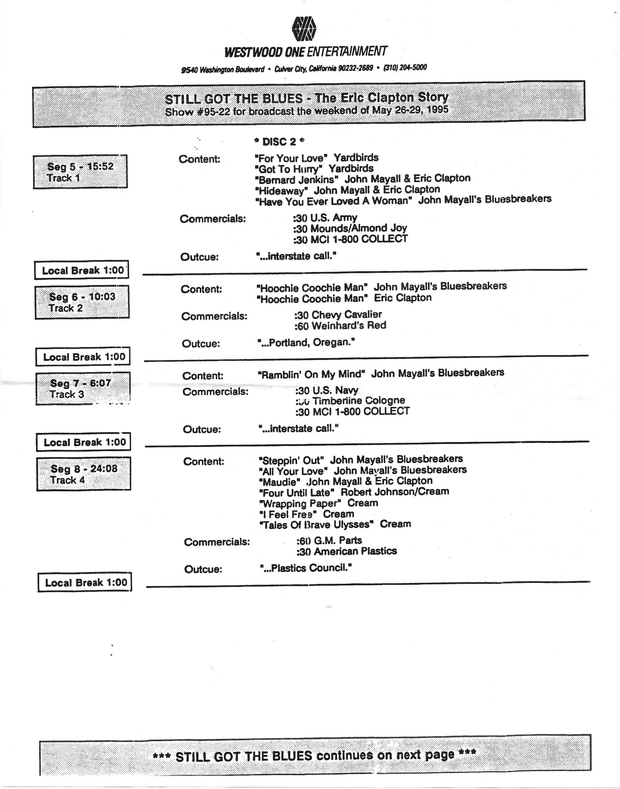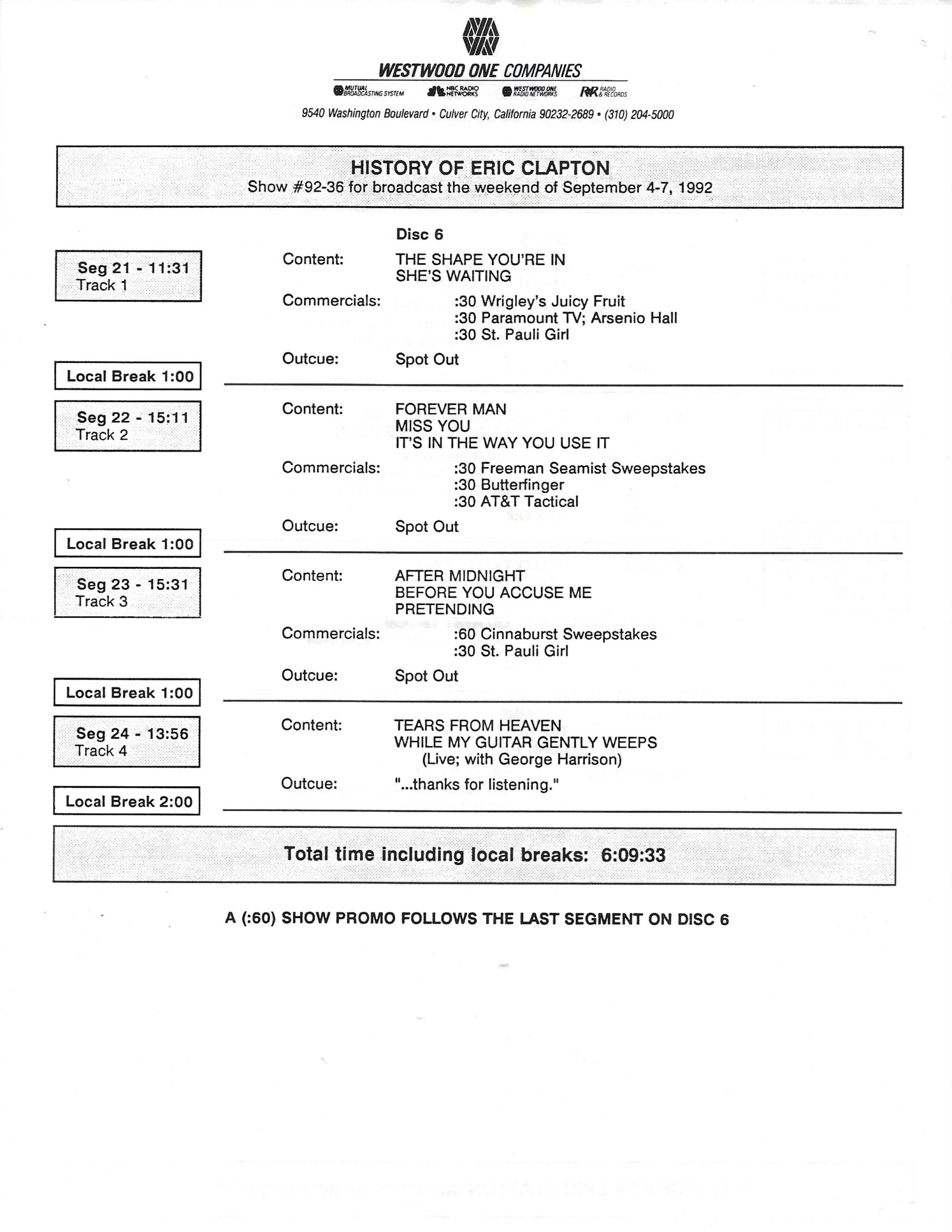 Tracks 1 – 4 are the actual radio show, Tracks 5 – 7 are promo spots, Tracks 8 – 15 are commercial spots, while Tracks 16 – 27 are the actual interview segments and segment intros separated into individual tracks.