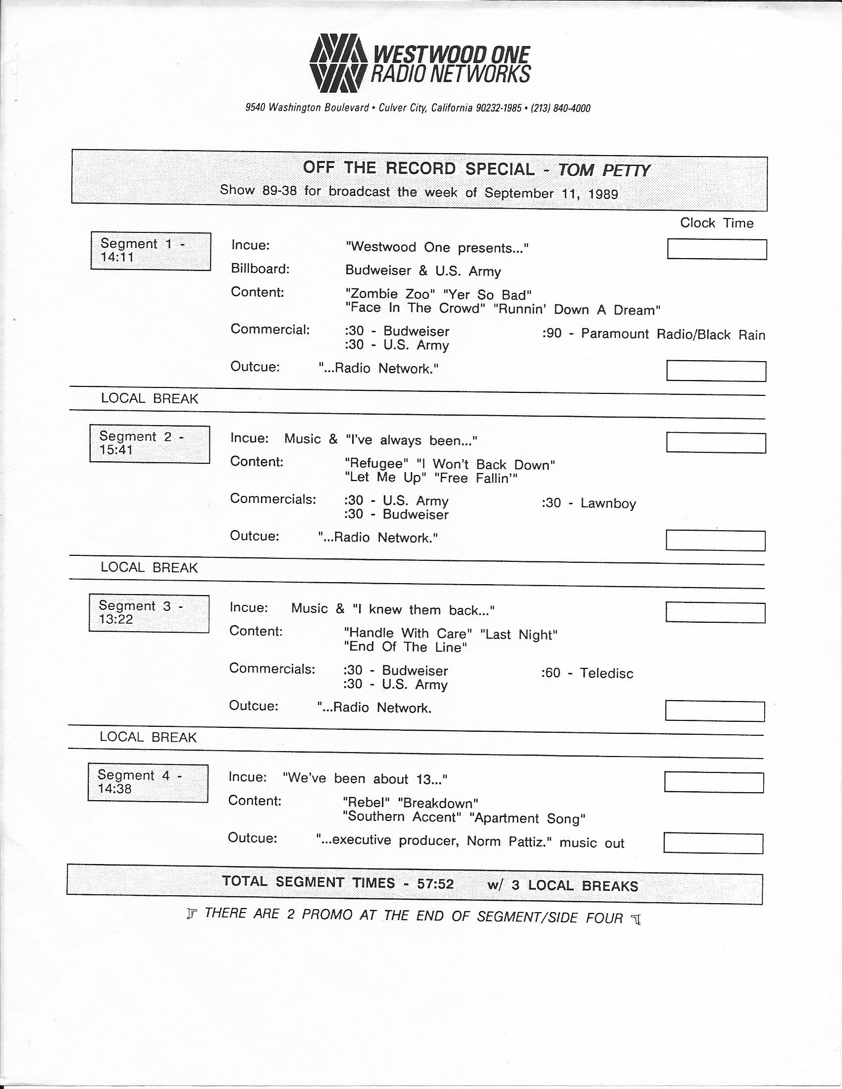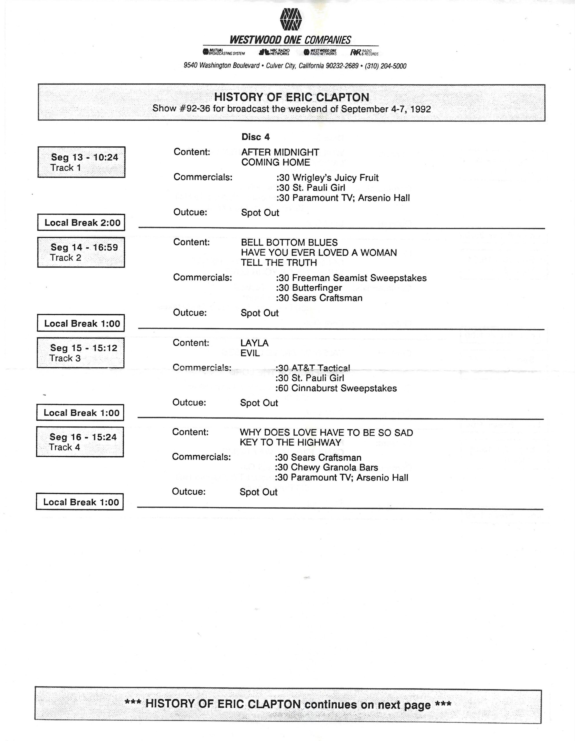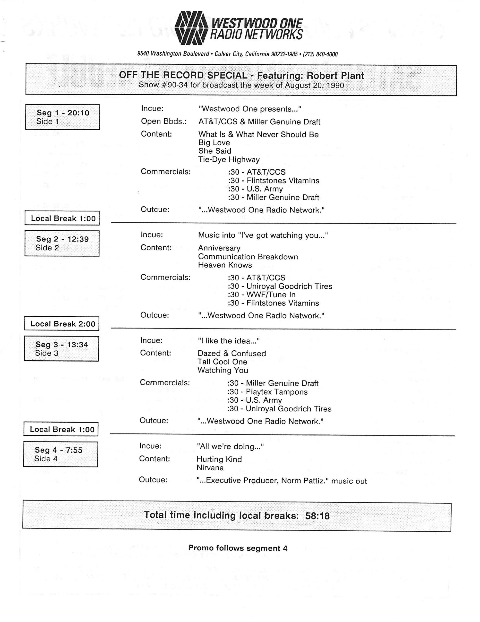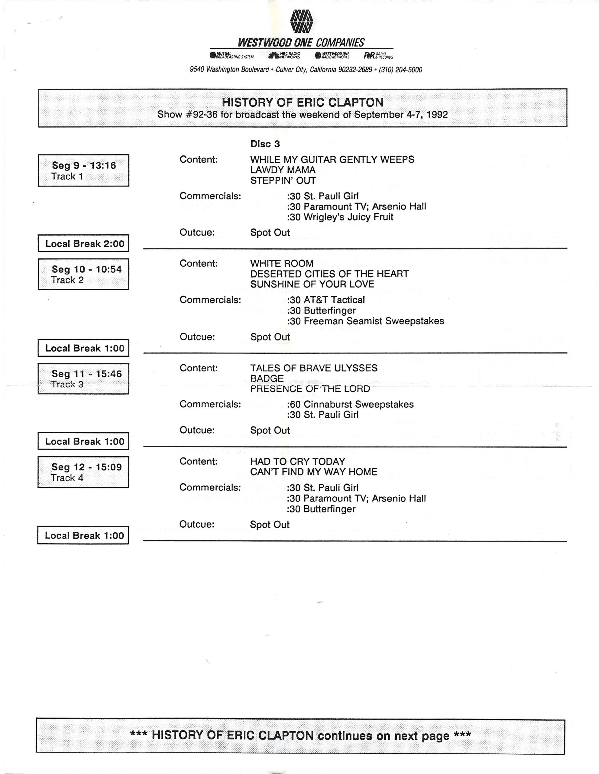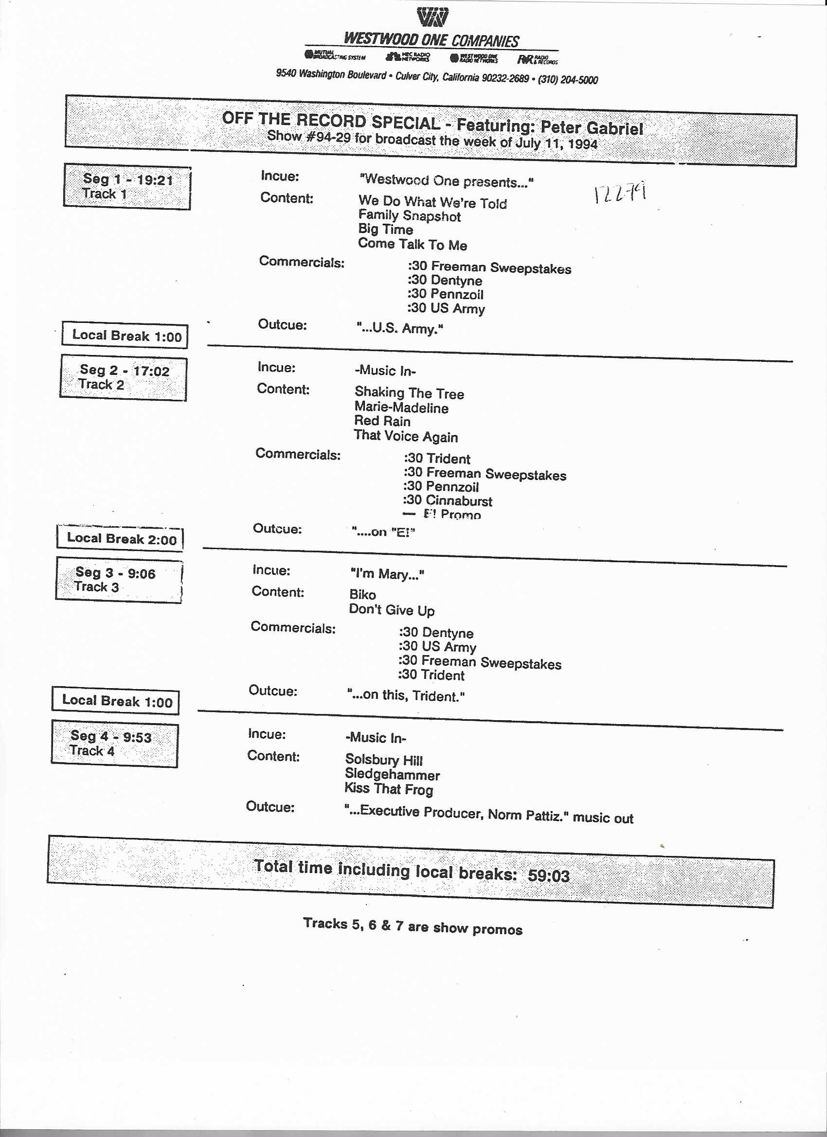 Tracks 1 – 4 are the actual radio show, Tracks 5 – 7 are promo spots, Tracks 8 – 15 are commercial spots, while Tracks 16 – 27 are the actual interview segments and segment intros separated into individual tracks.