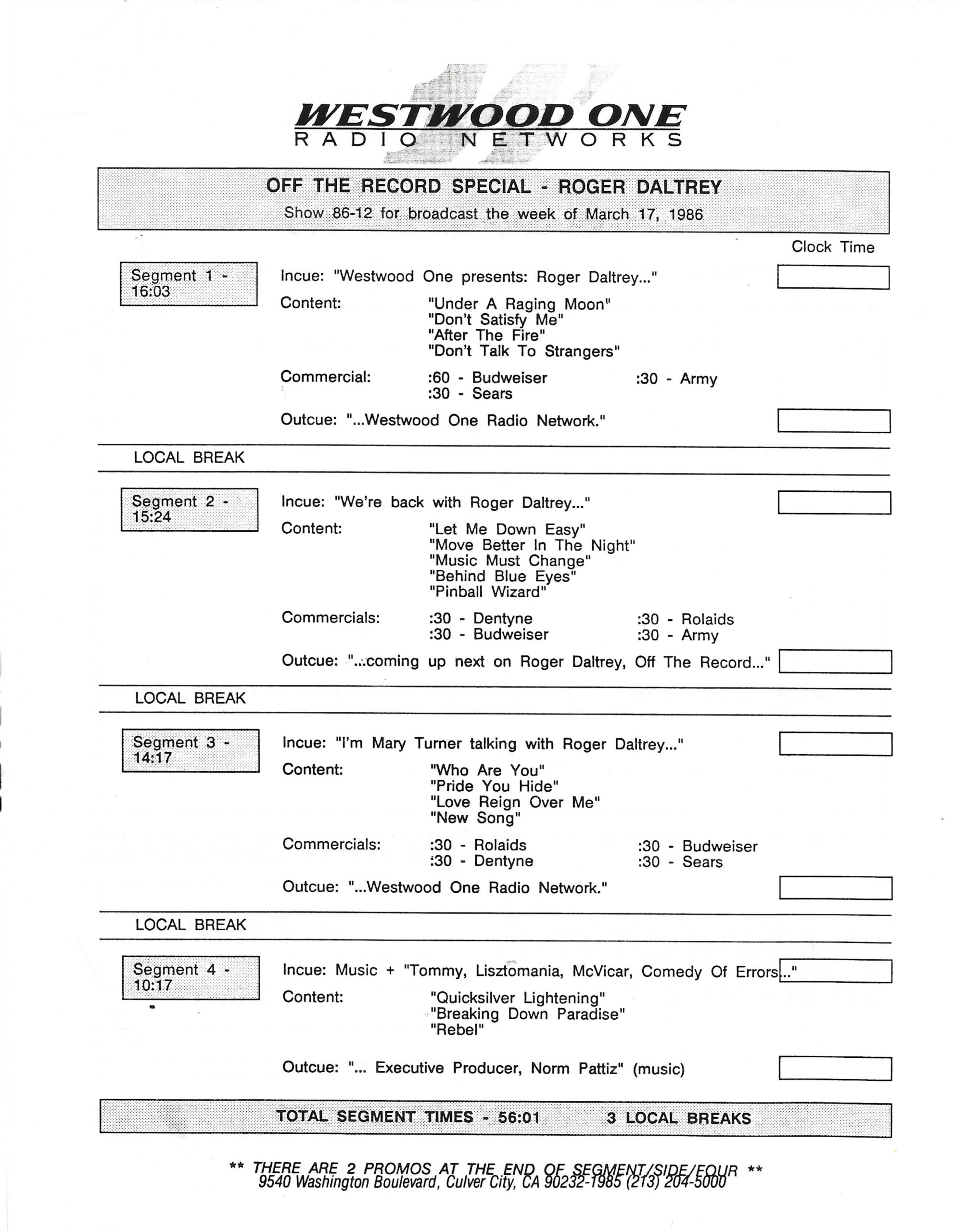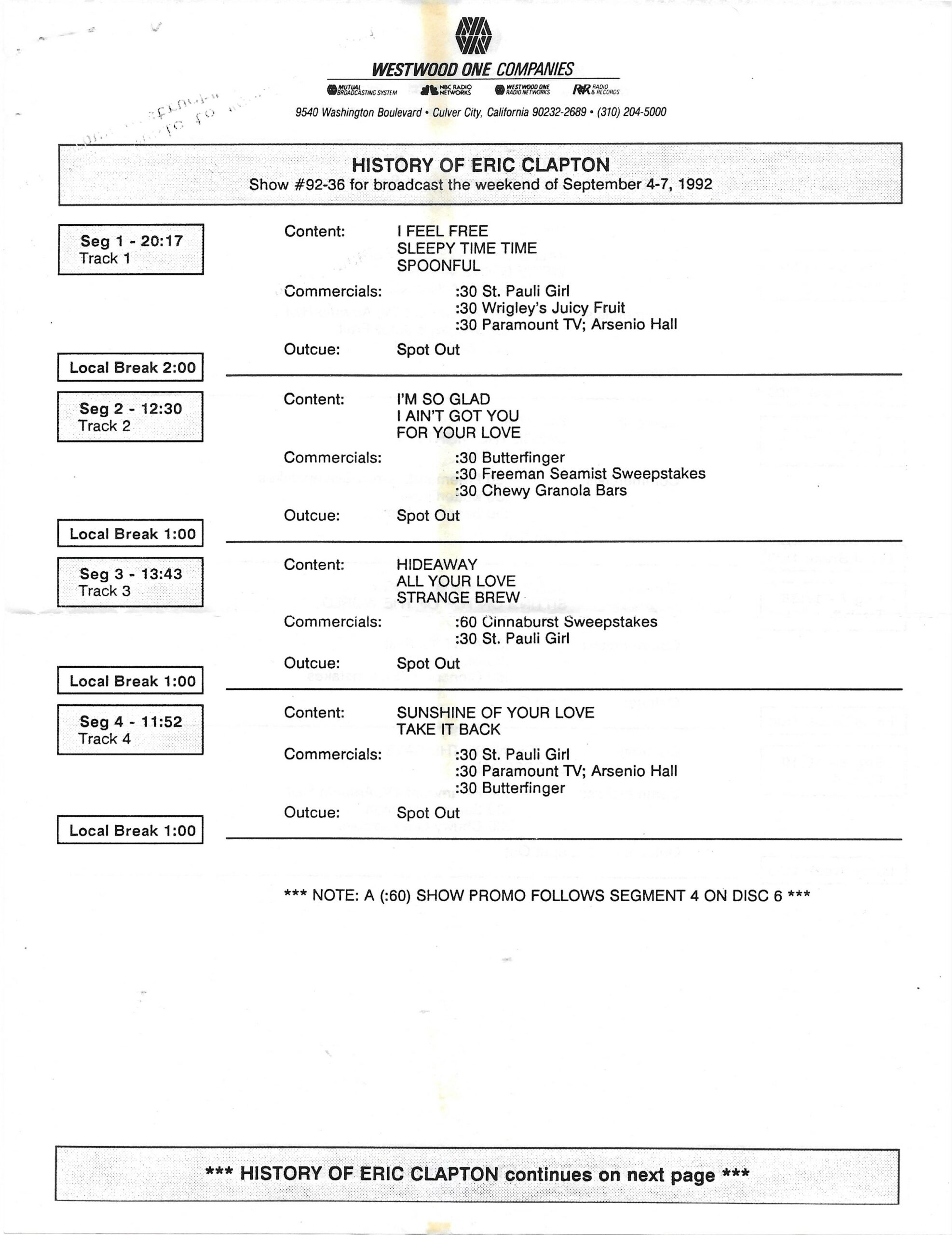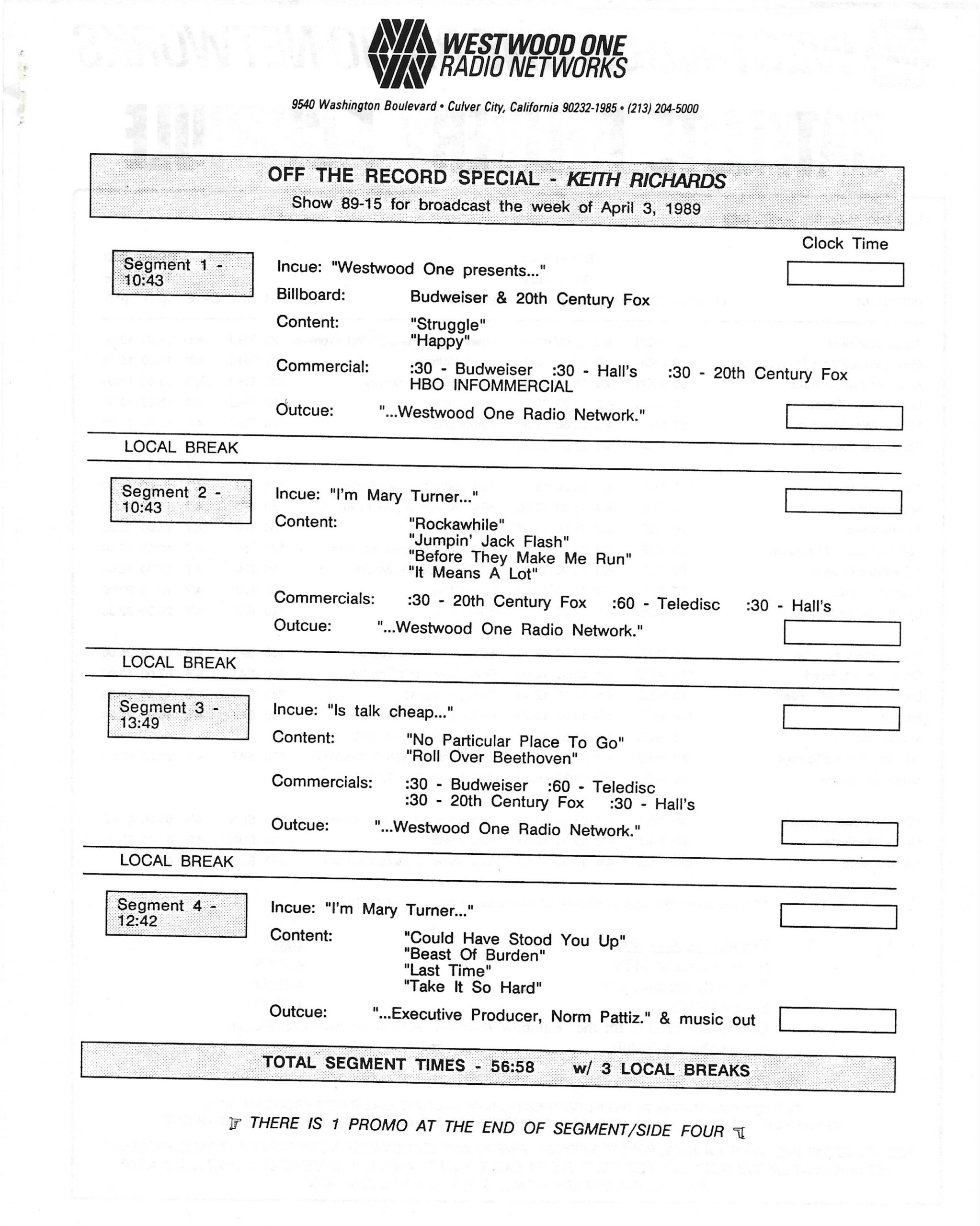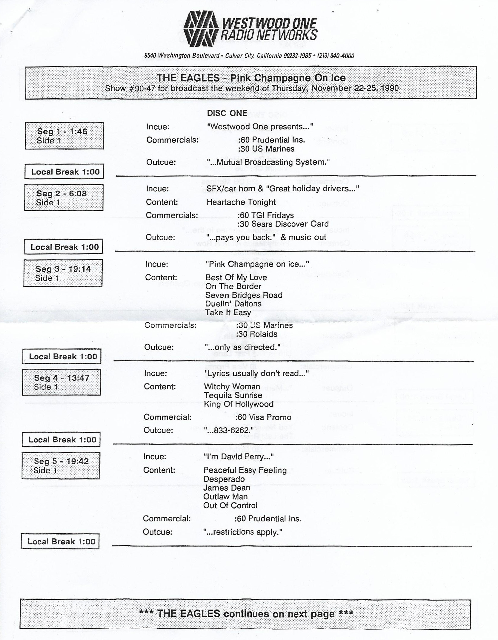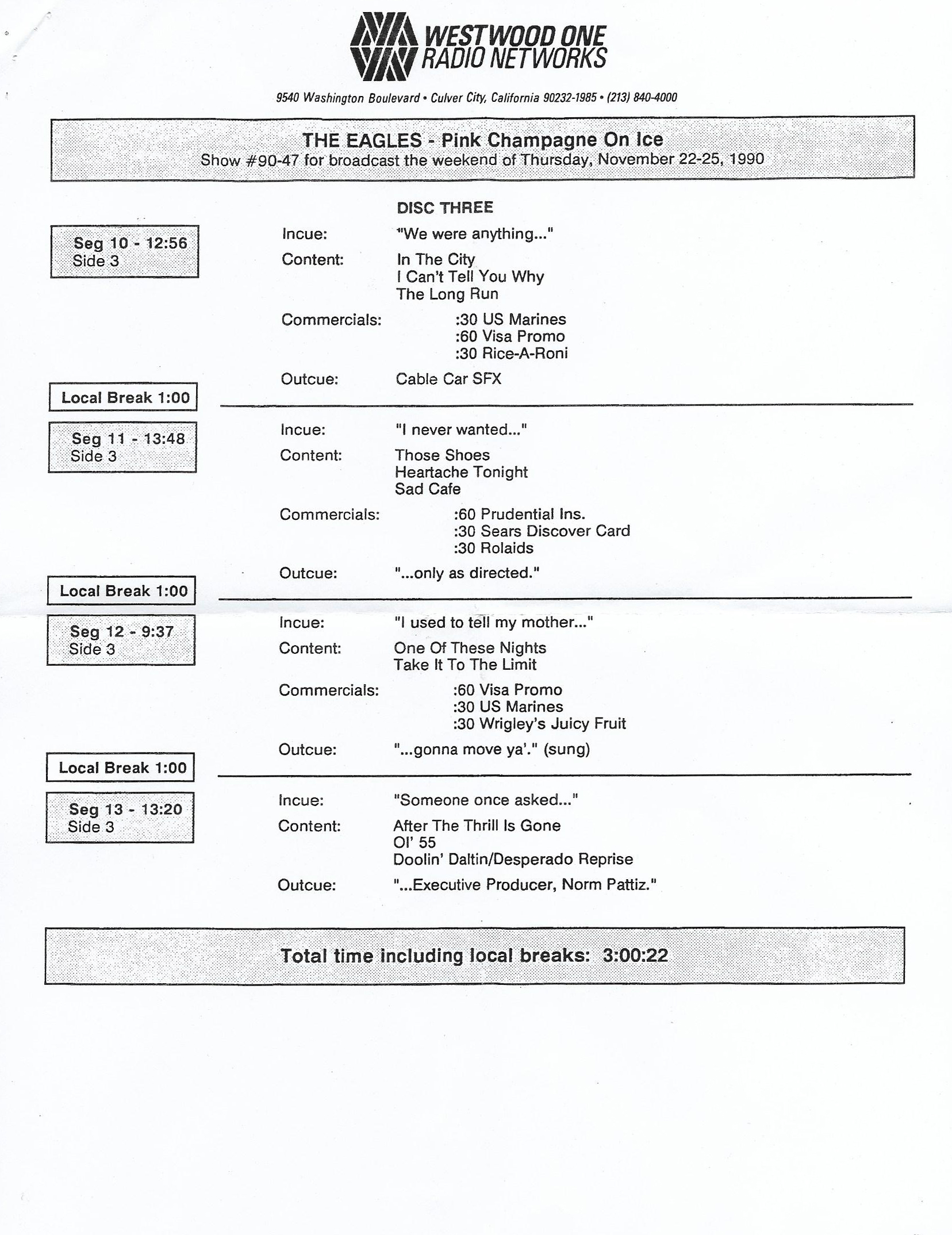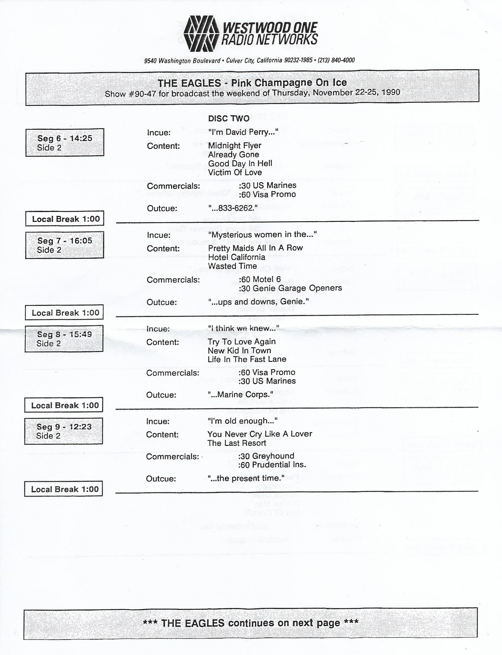 Tracks 1 – 4 are the actual radio show, Tracks 5 – 7 are promo spots, Tracks 8 – 15 are commercial spots, while Tracks 16 – 27 are the actual interview segments and segment intros separated into individual tracks.