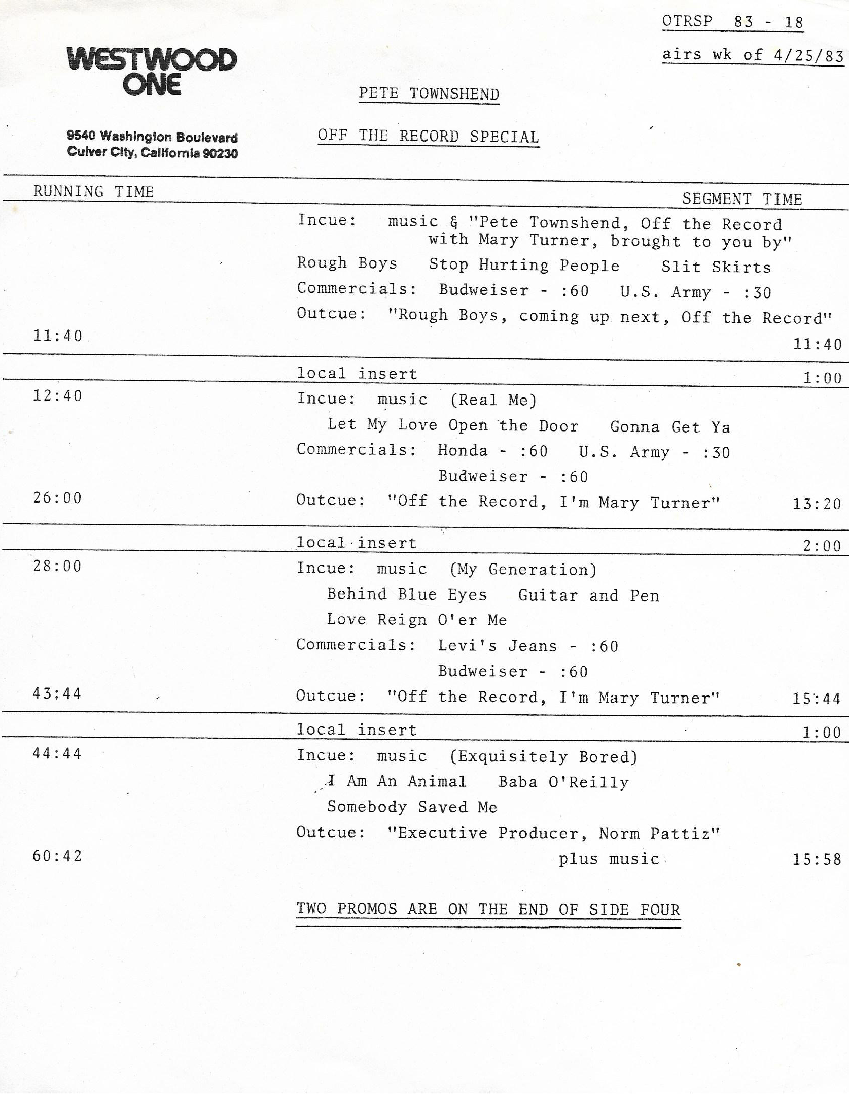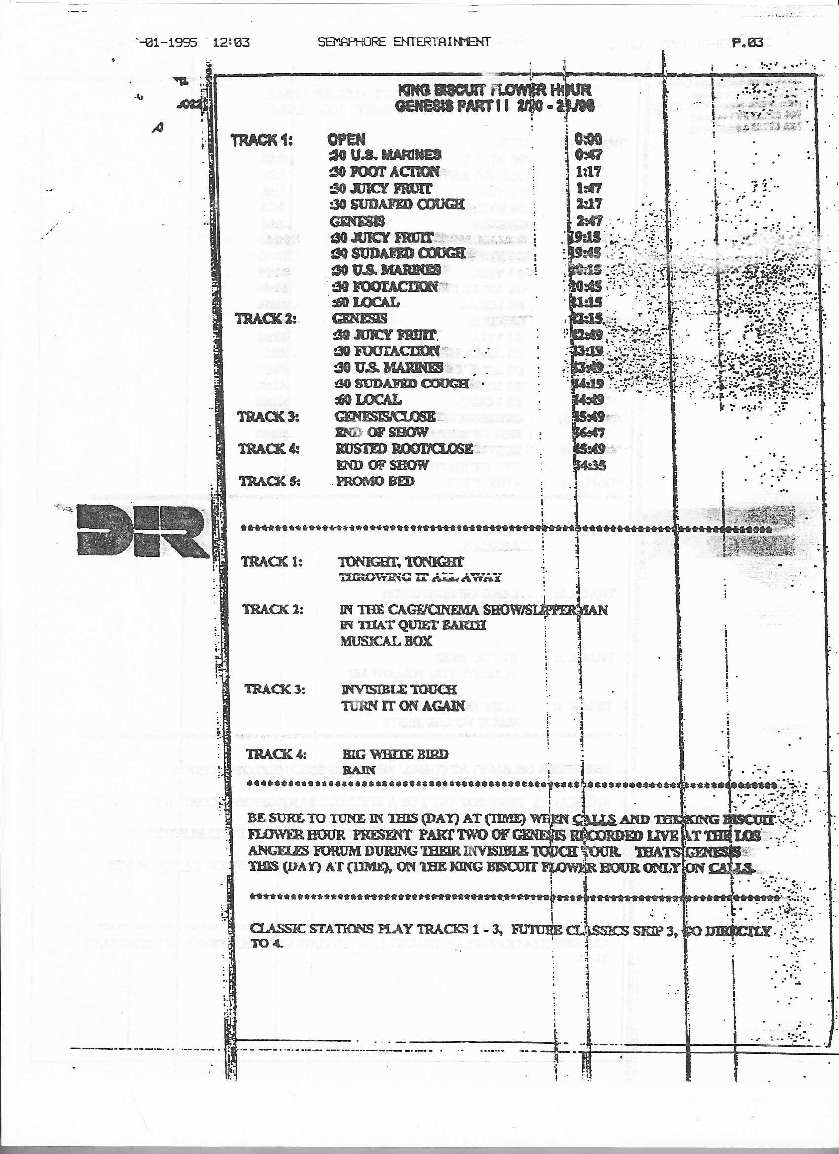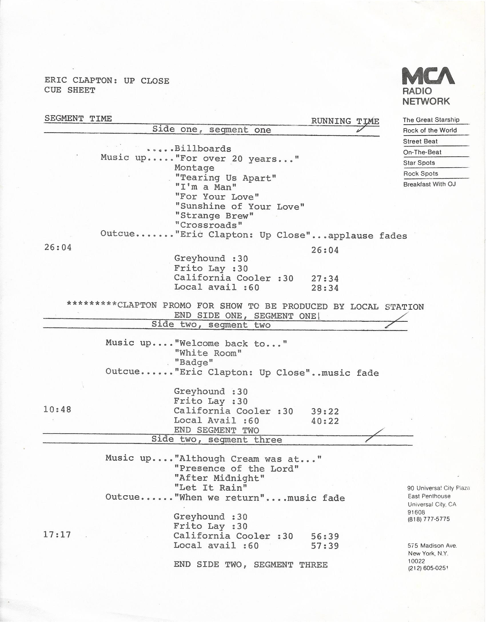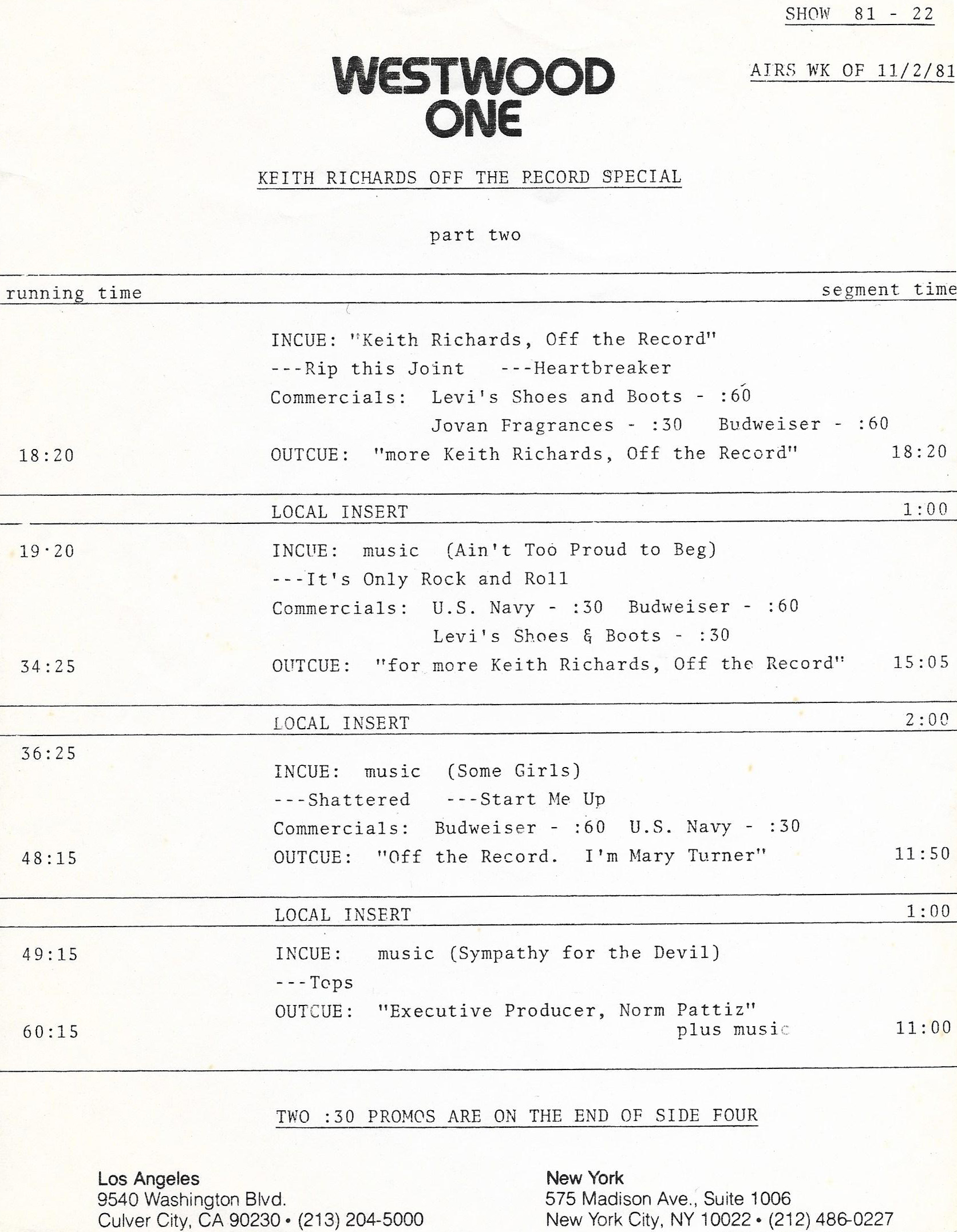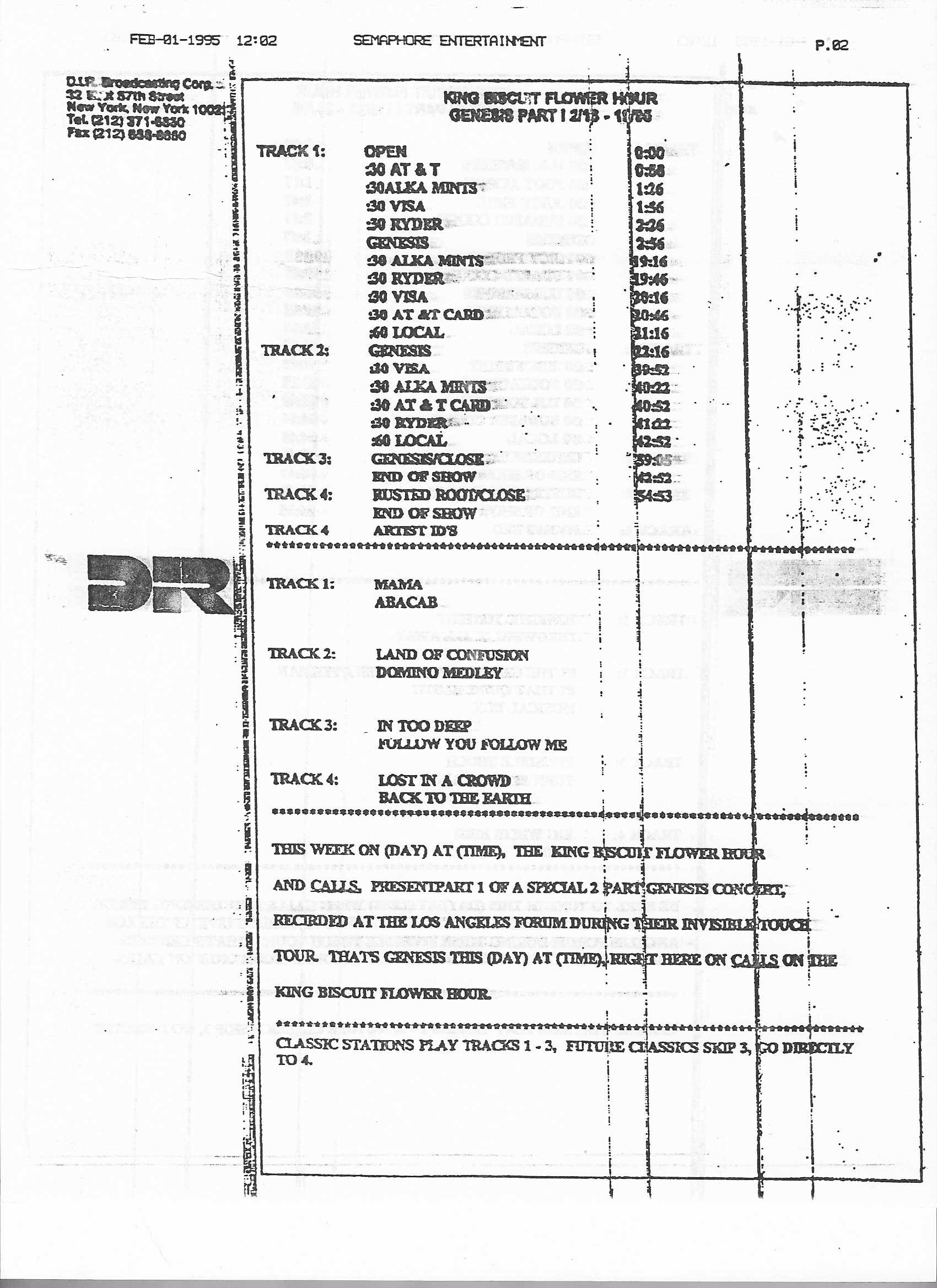 Tracks 1 – 4 are the actual radio show, Tracks 5 – 7 are promo spots, Tracks 8 – 15 are commercial spots, while Tracks 16 – 27 are the actual interview segments and segment intros separated into individual tracks.