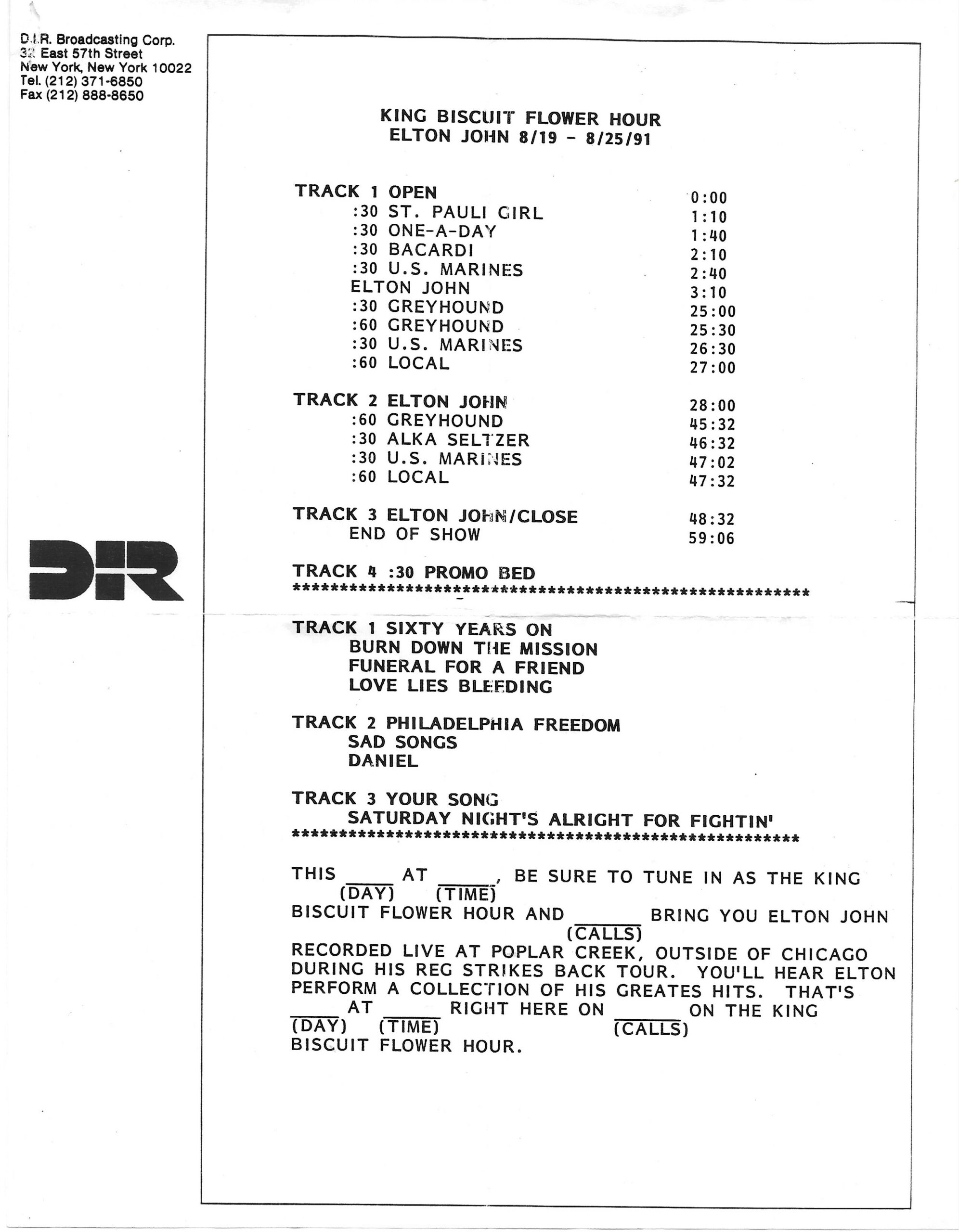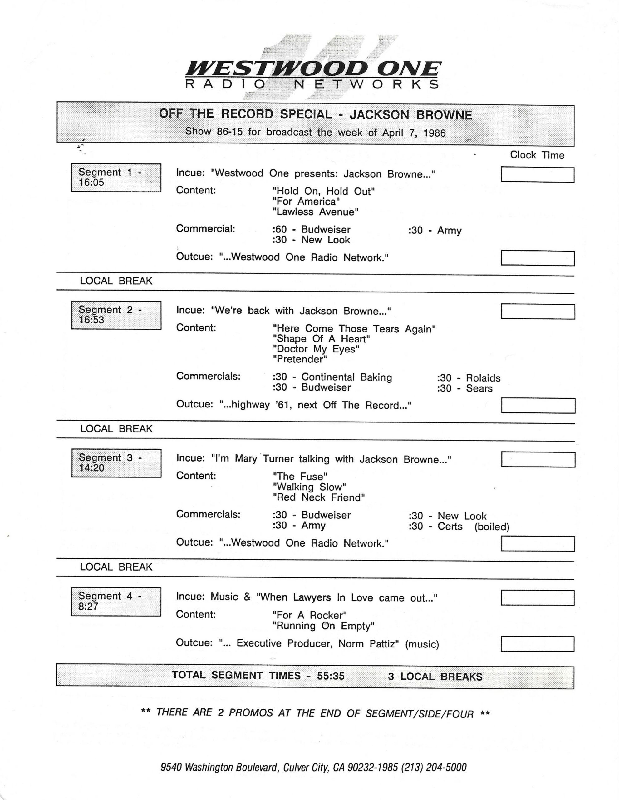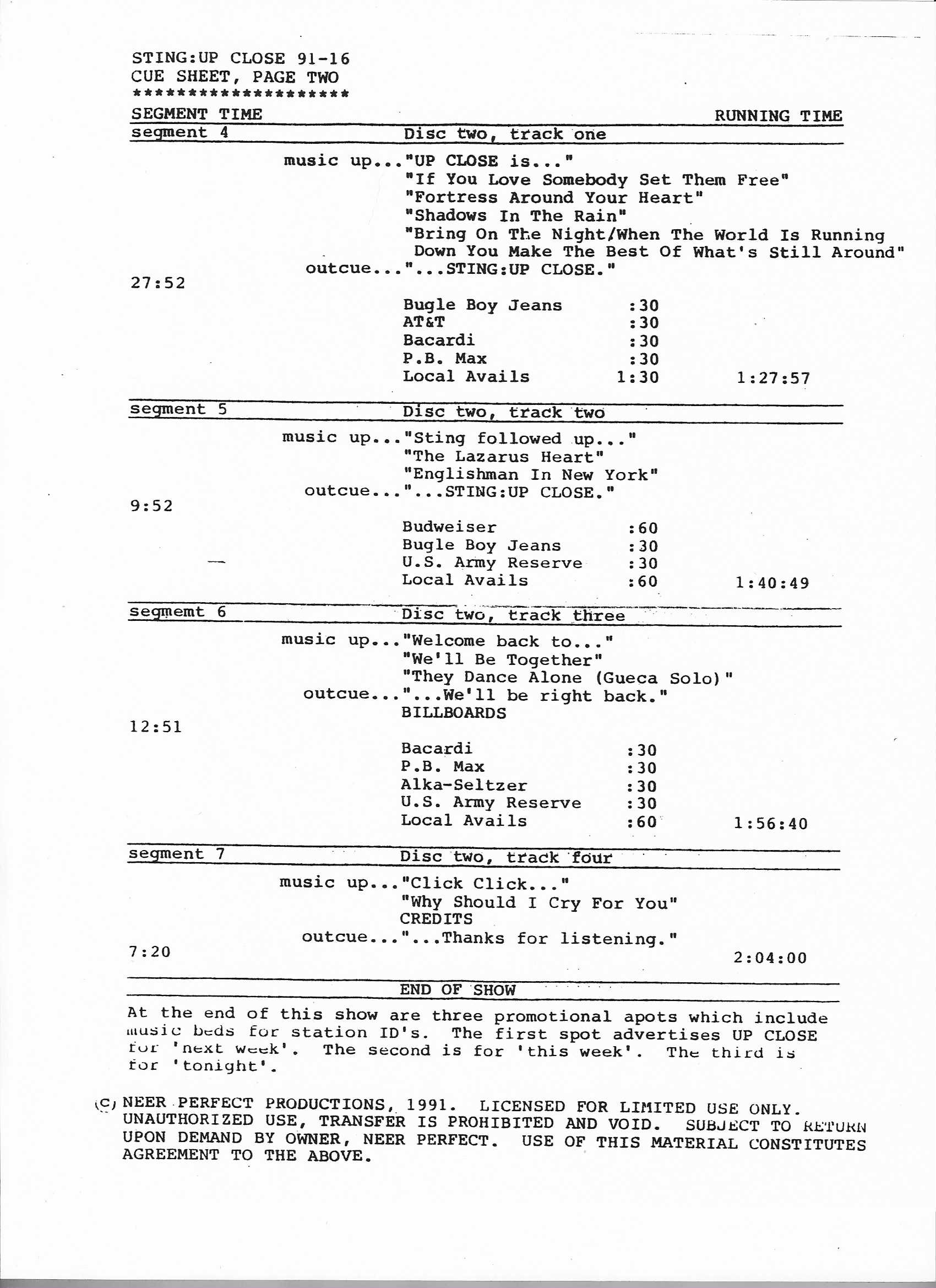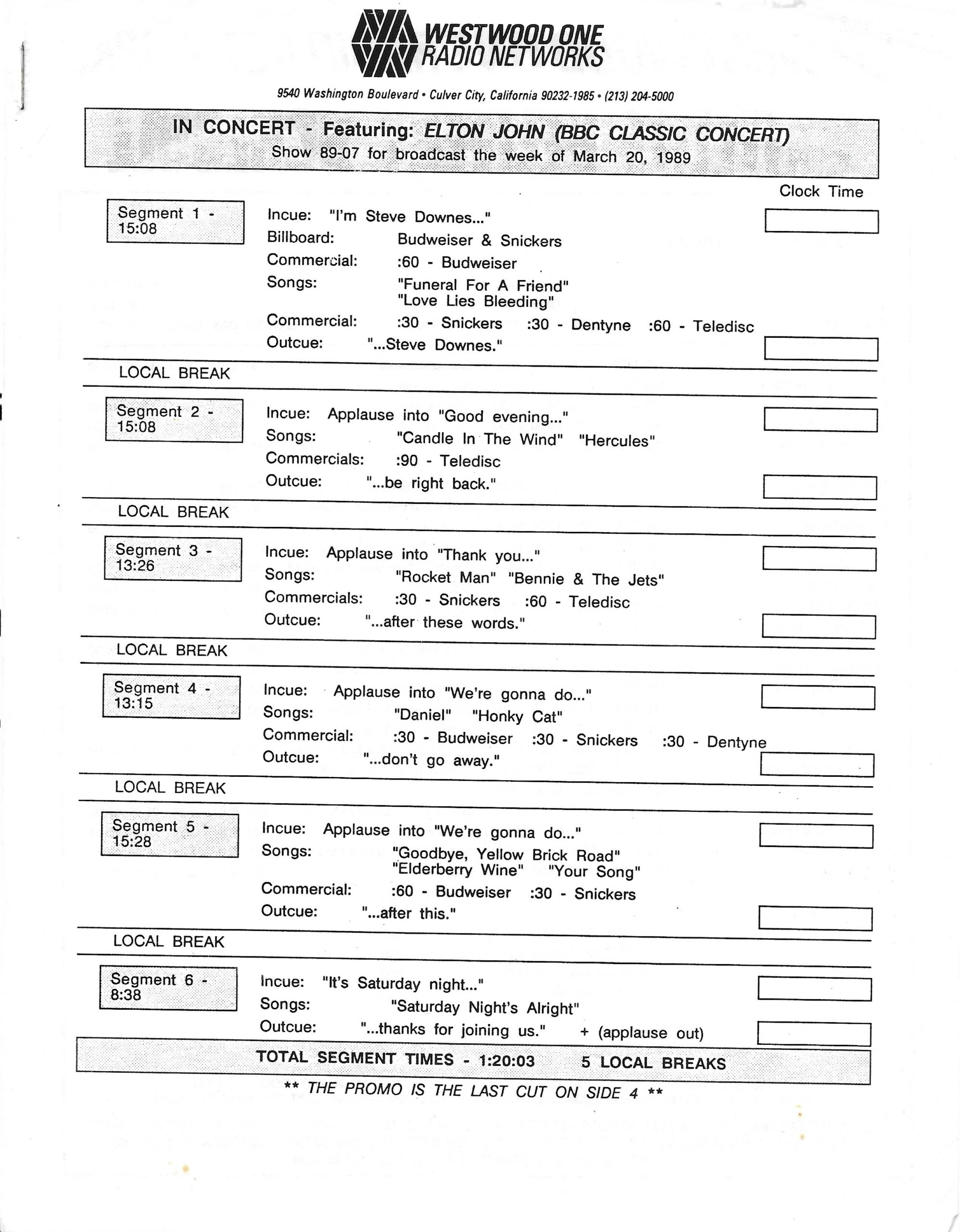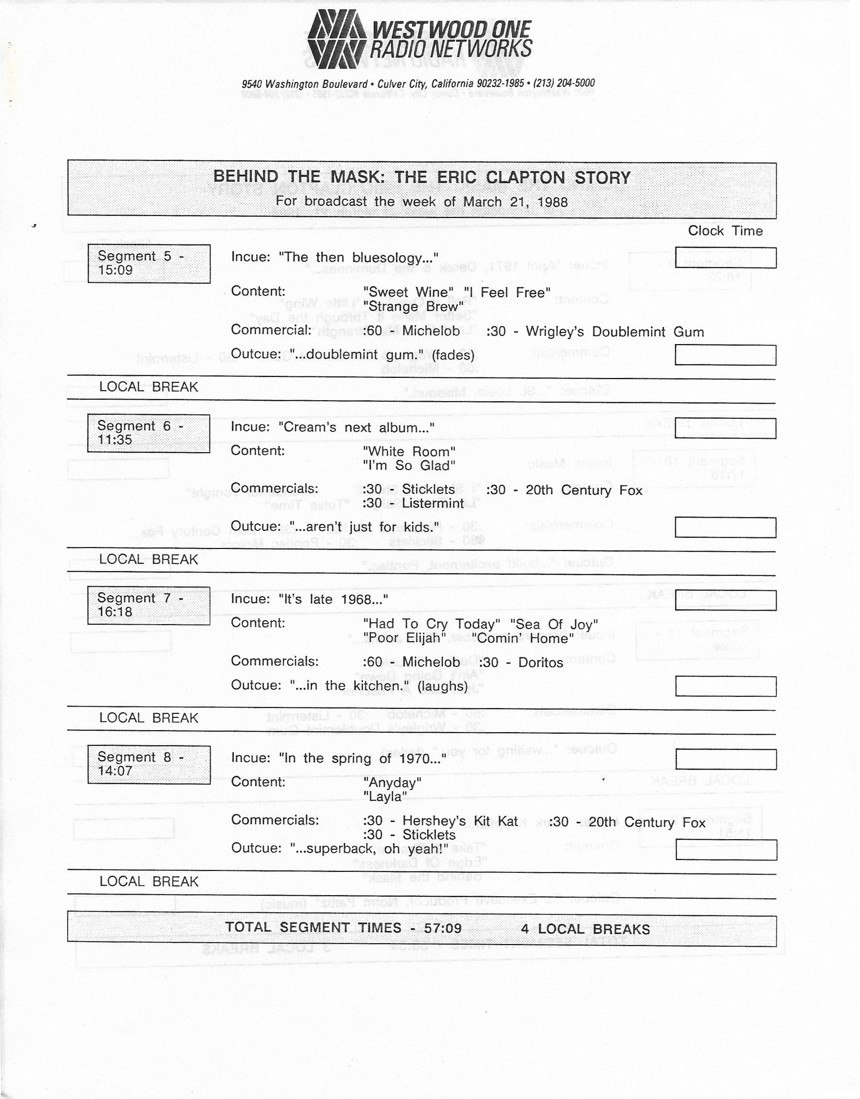 Tracks 1 – 4 are the actual radio show, Tracks 5 – 7 are promo spots, Tracks 8 – 15 are commercial spots, while Tracks 16 – 27 are the actual interview segments and segment intros separated into individual tracks.