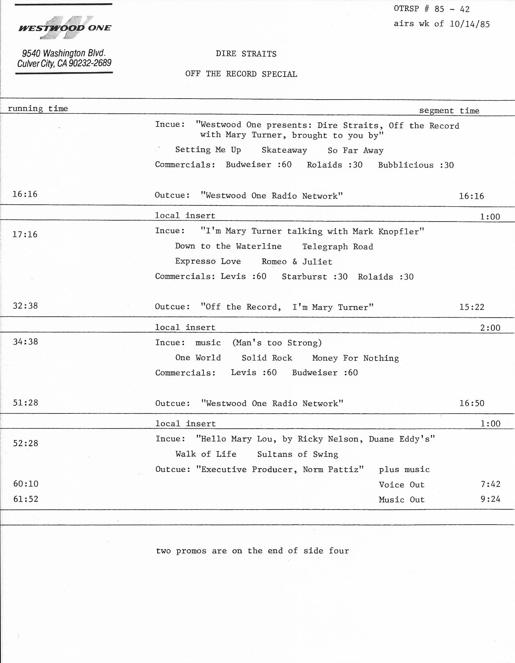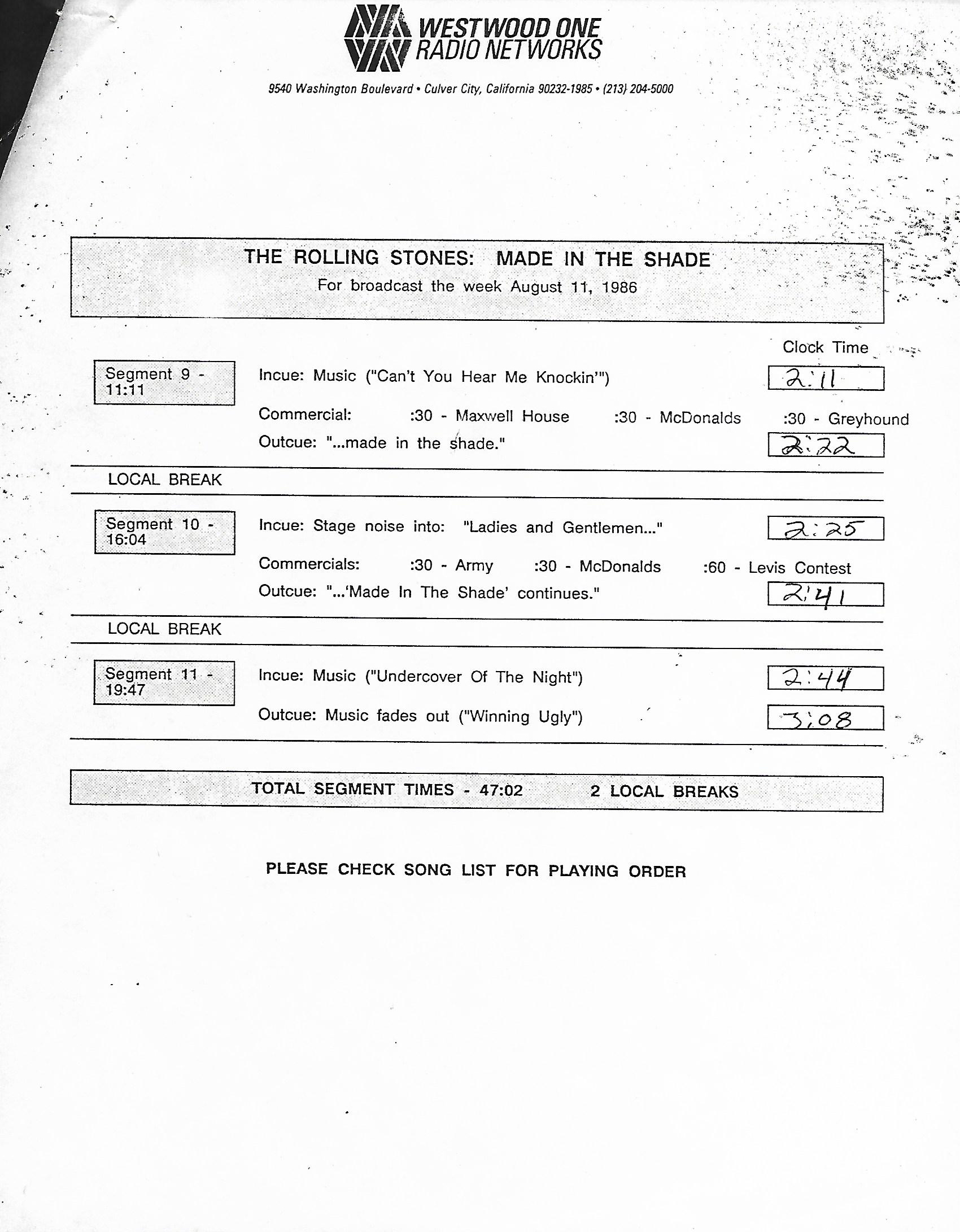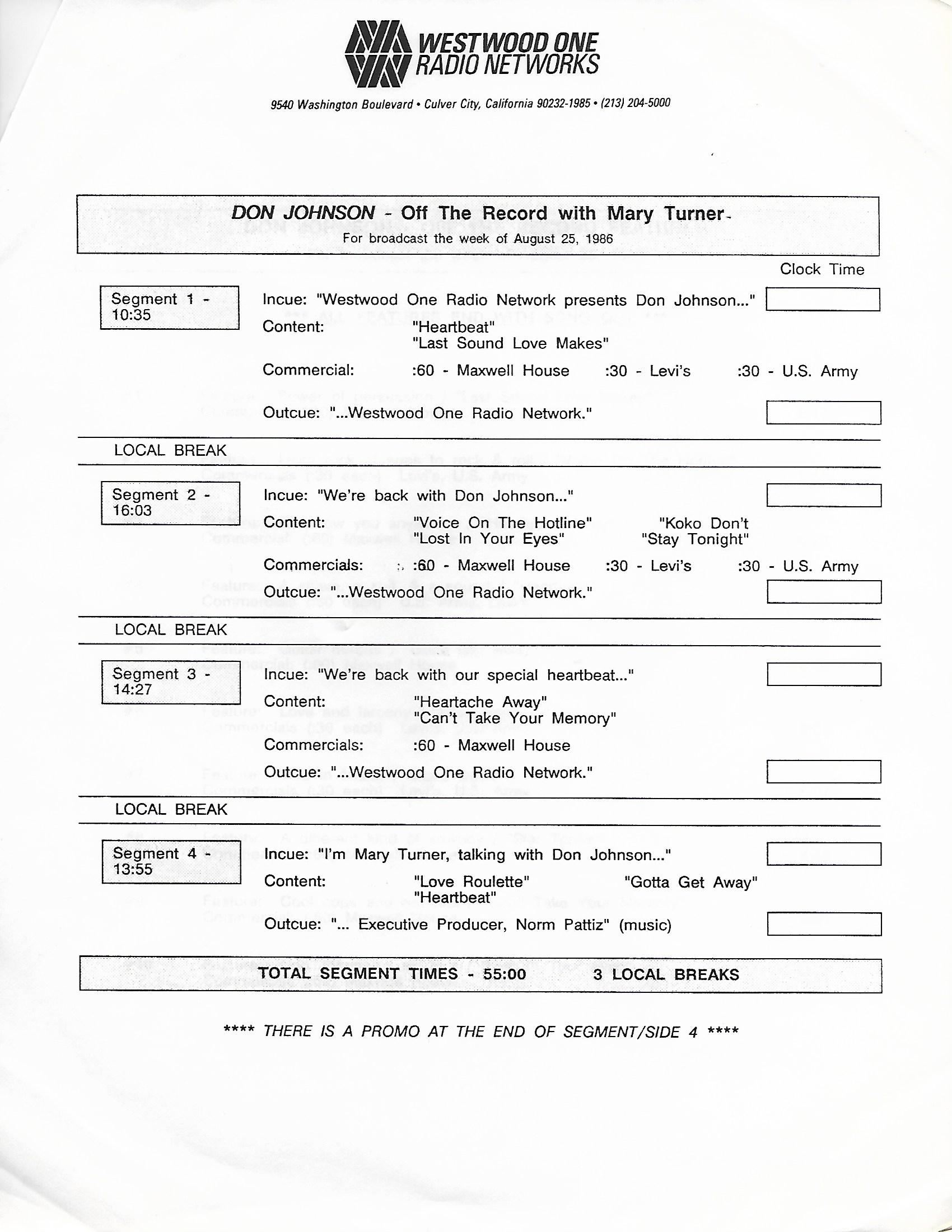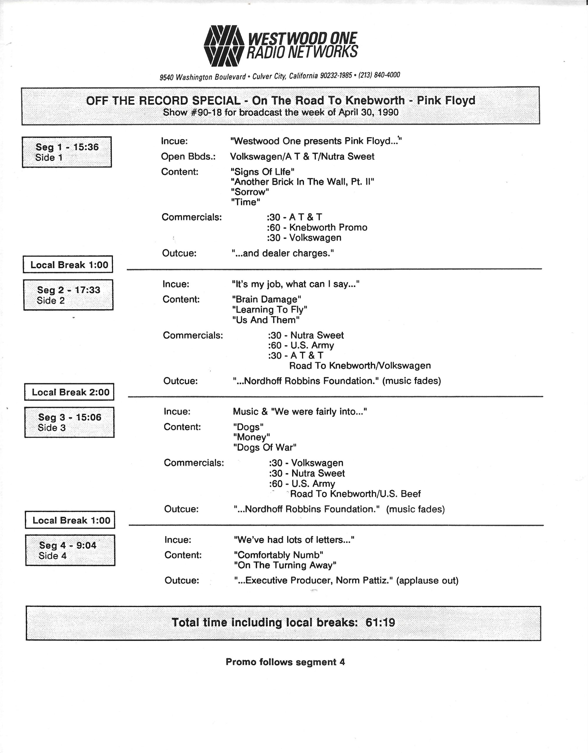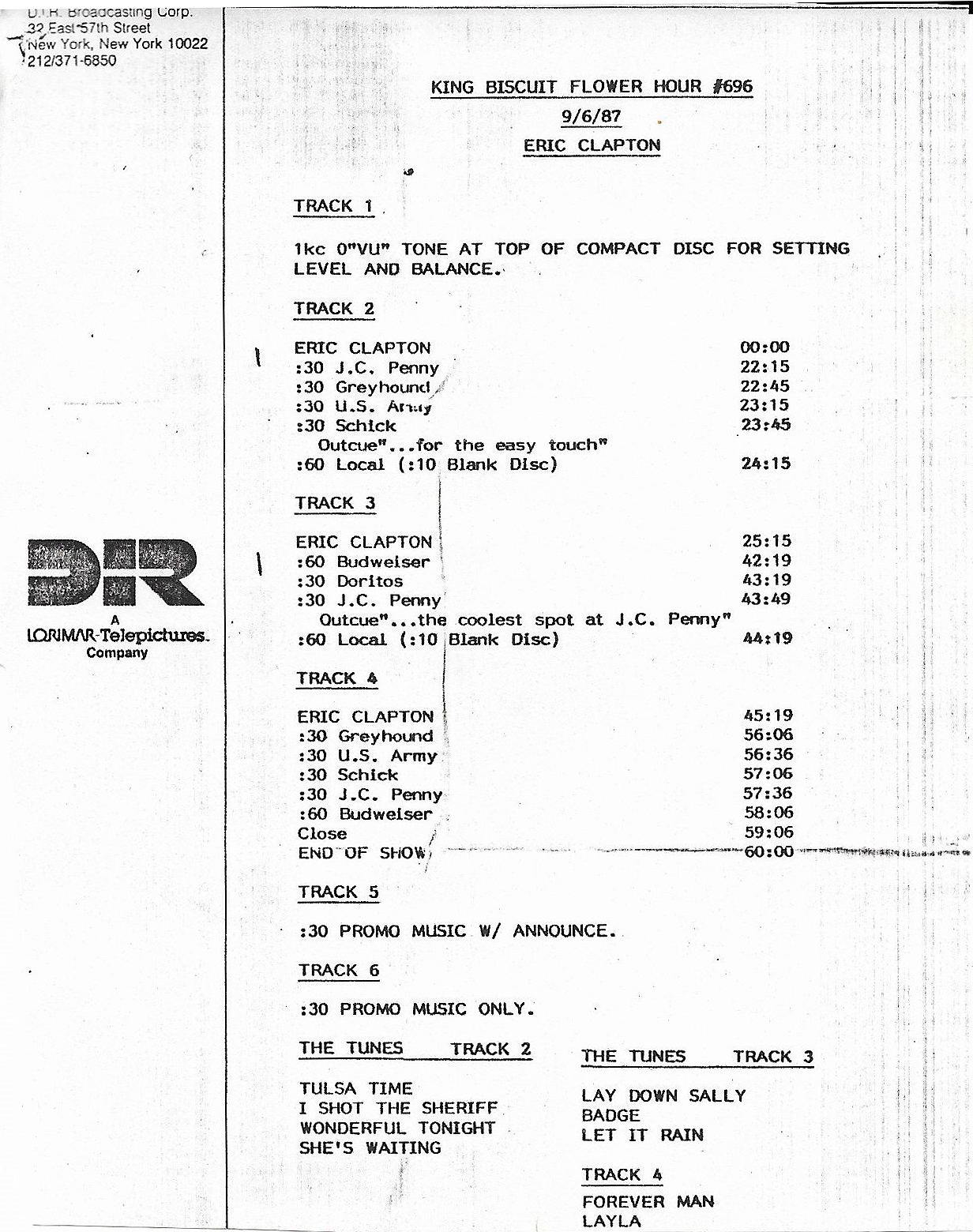 Tracks 1 – 4 are the actual radio show, Tracks 5 – 7 are promo spots, Tracks 8 – 15 are commercial spots, while Tracks 16 – 27 are the actual interview segments and segment intros separated into individual tracks.