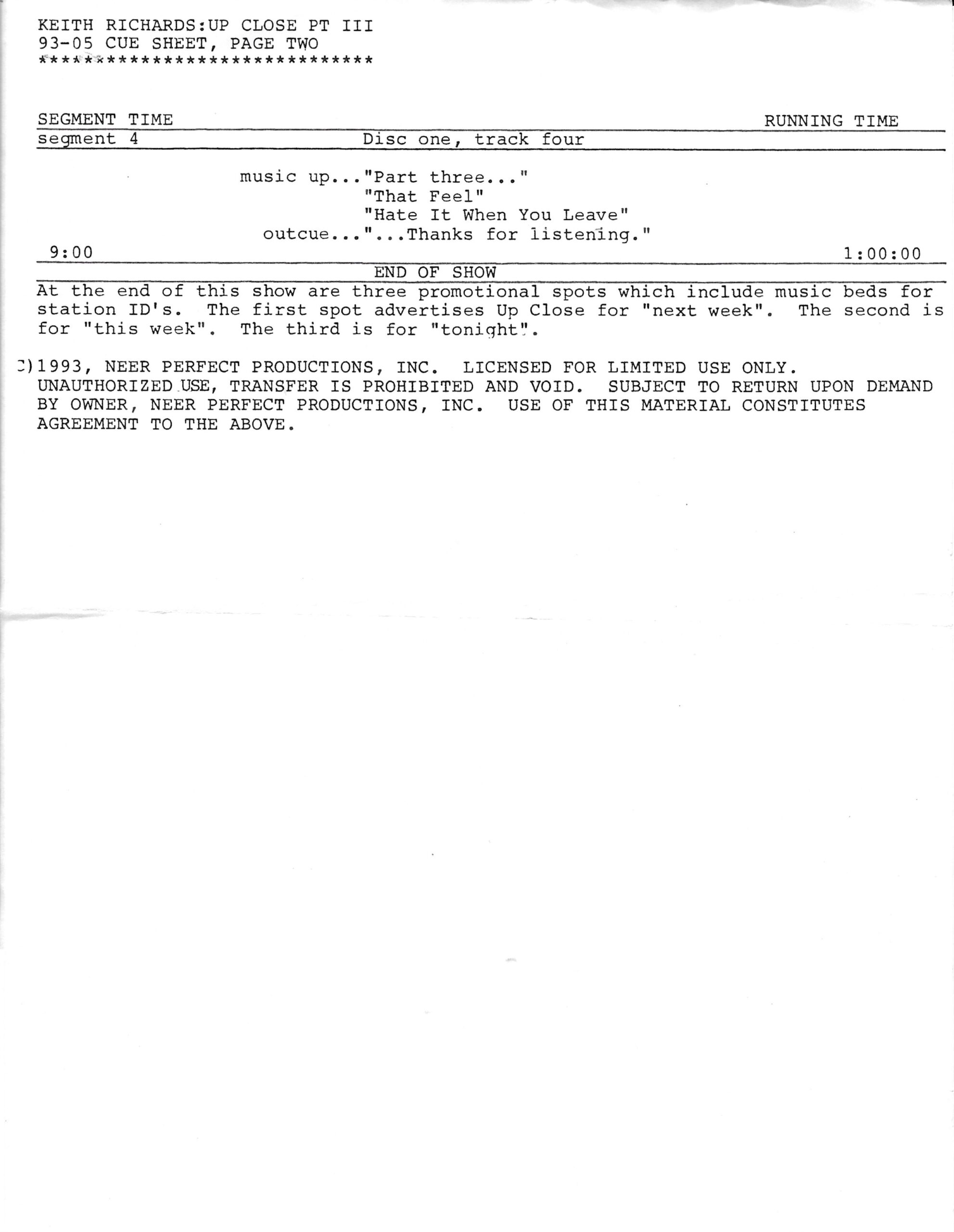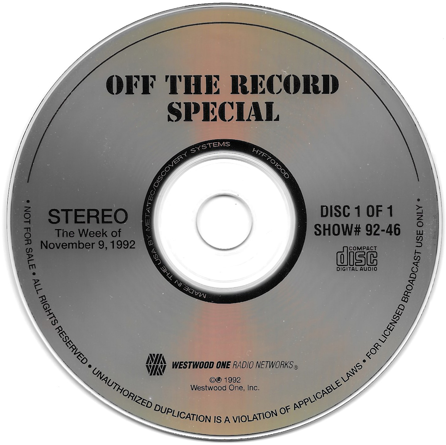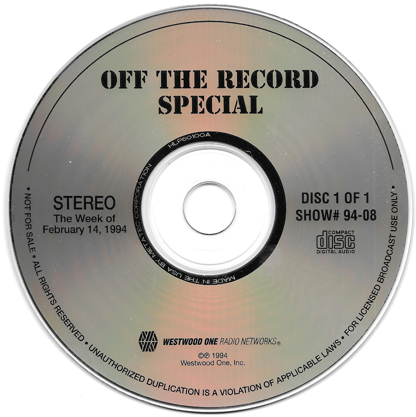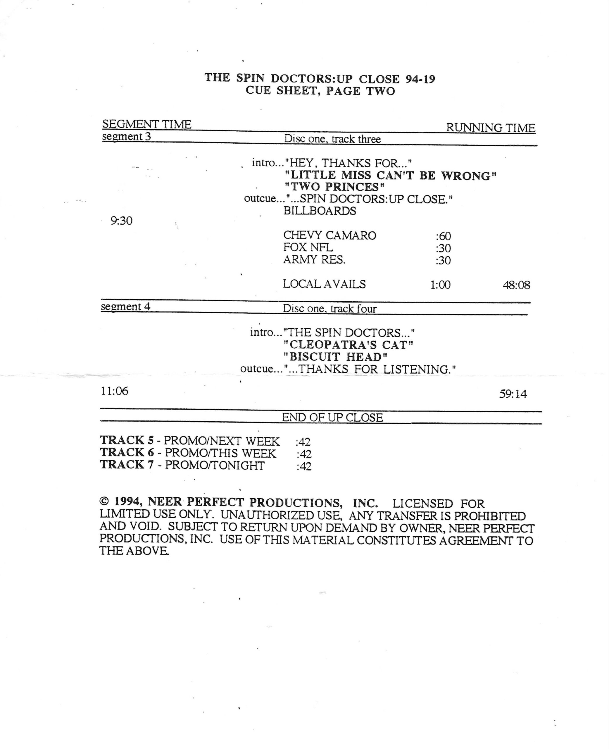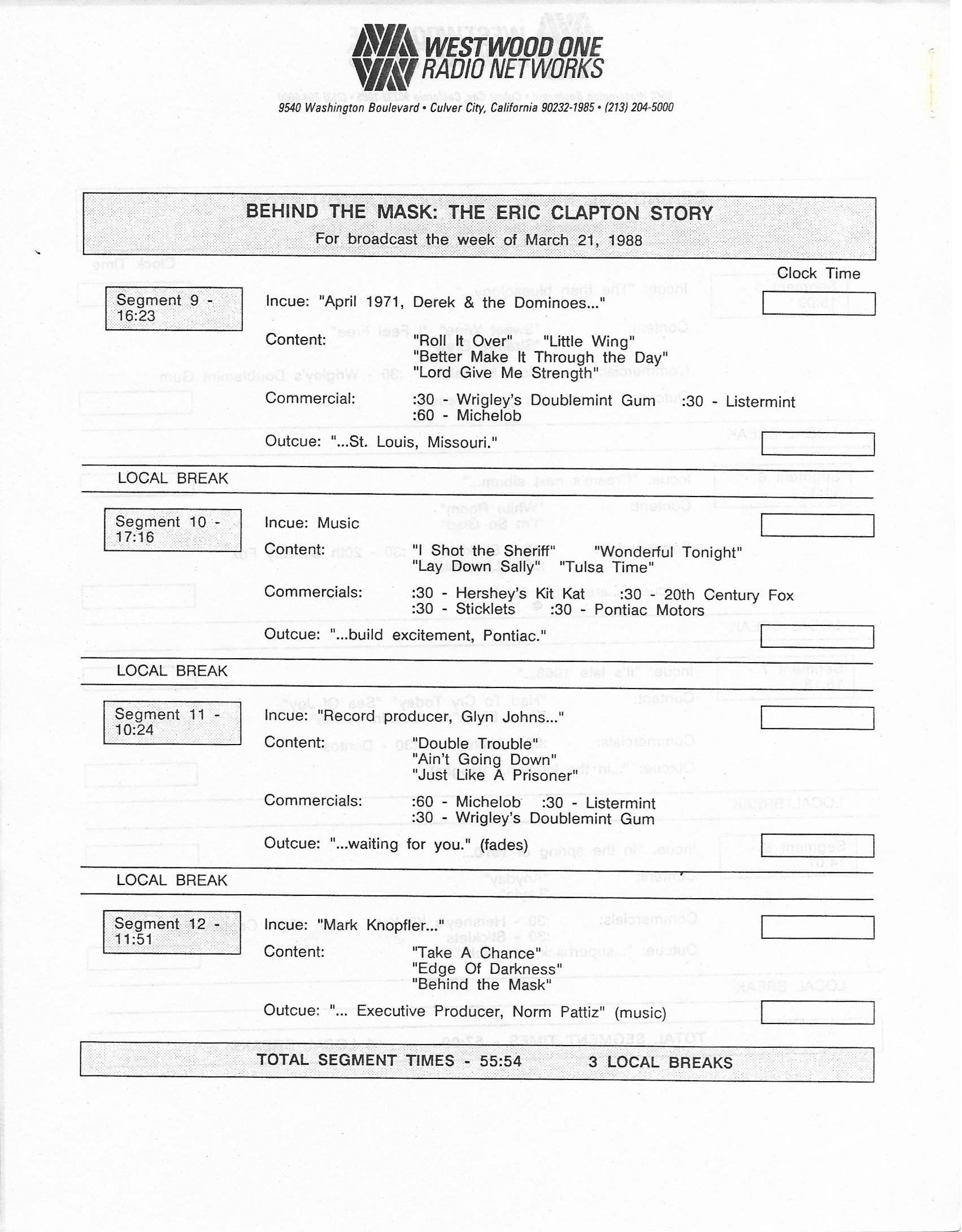 Tracks 1 – 4 are the actual radio show, Tracks 5 – 7 are promo spots, Tracks 8 – 15 are commercial spots, while Tracks 16 – 27 are the actual interview segments and segment intros separated into individual tracks.