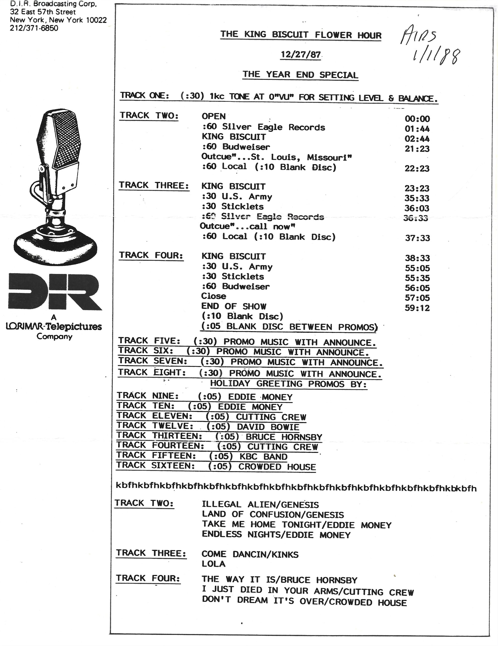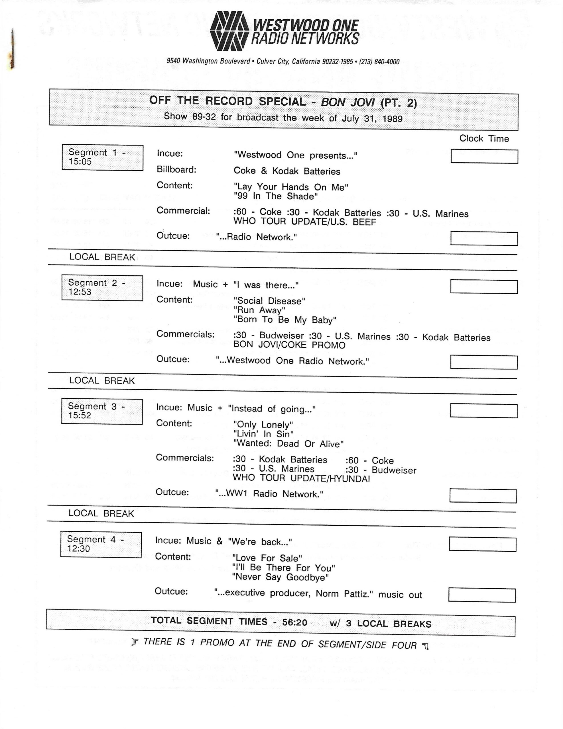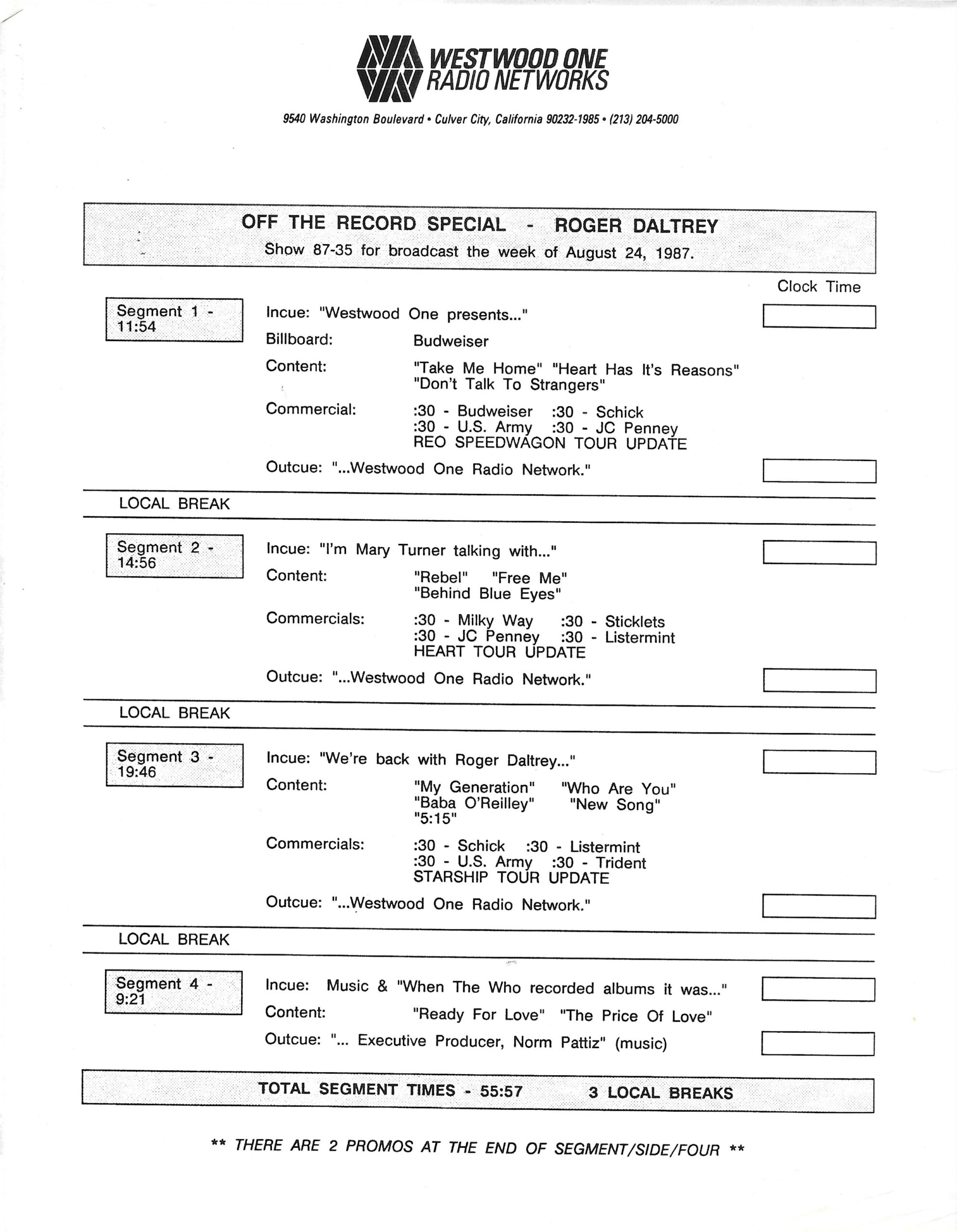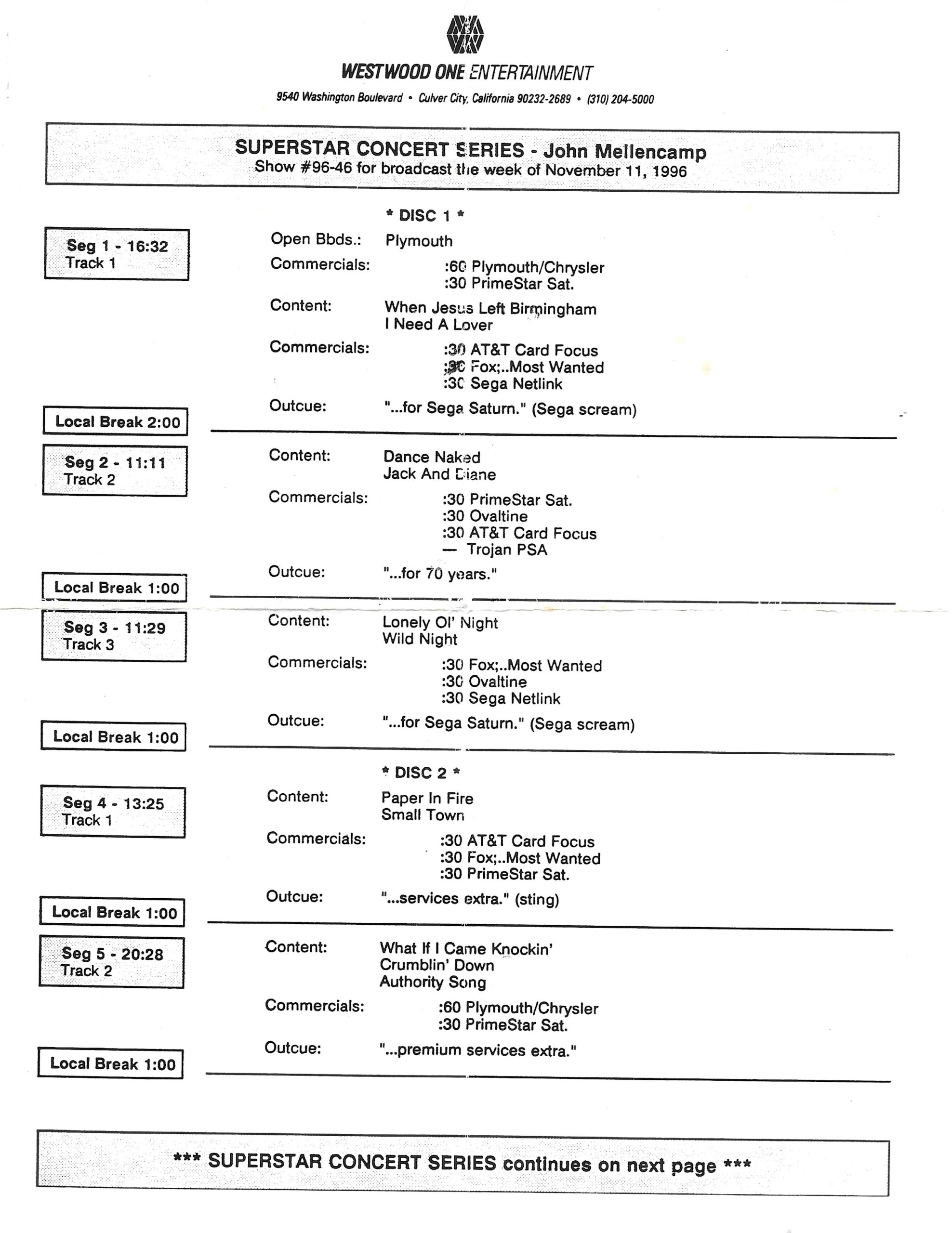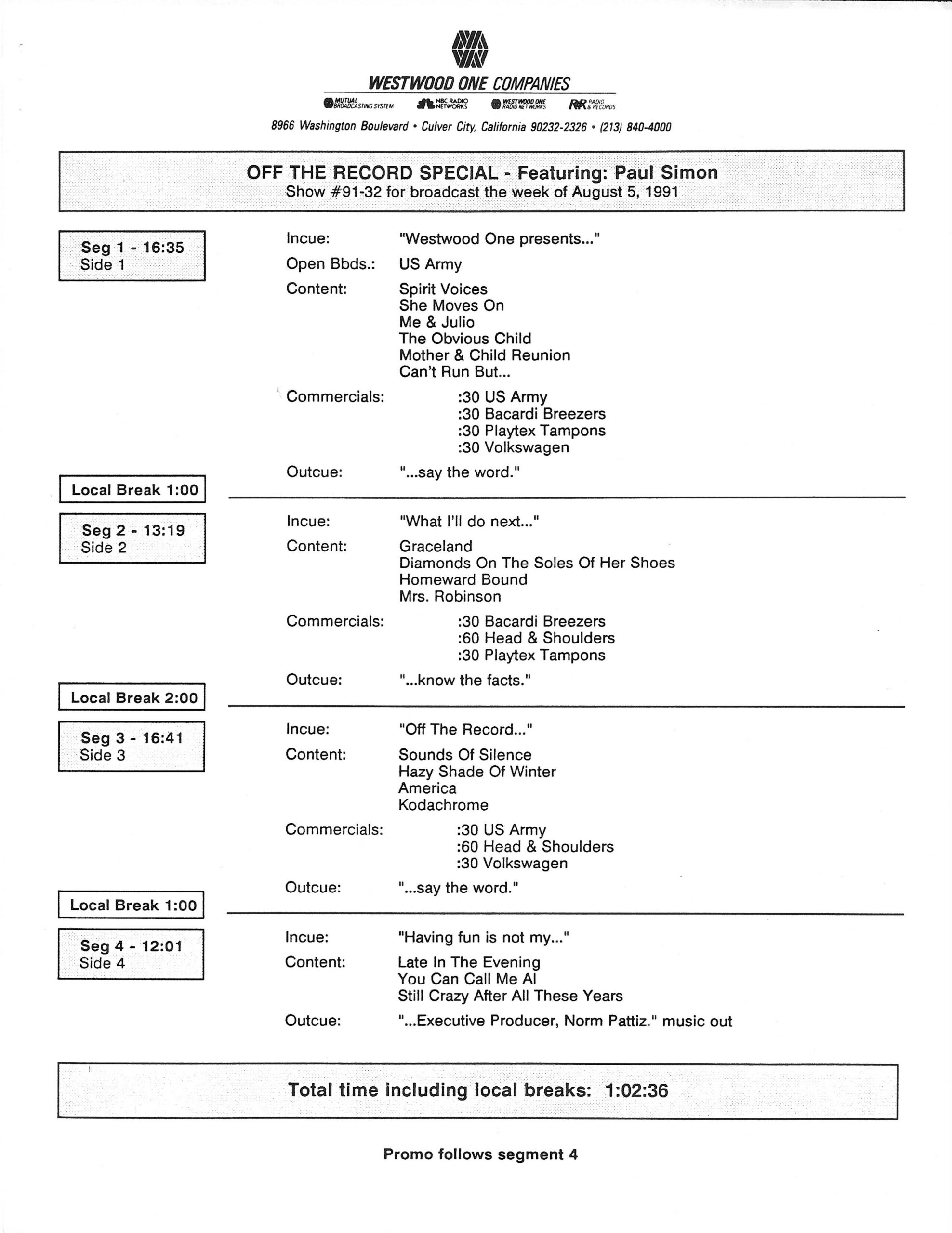 Tracks 1 – 4 are the actual radio show, Tracks 5 – 7 are promo spots, Tracks 8 – 15 are commercial spots, while Tracks 16 – 27 are the actual interview segments and segment intros separated into individual tracks.