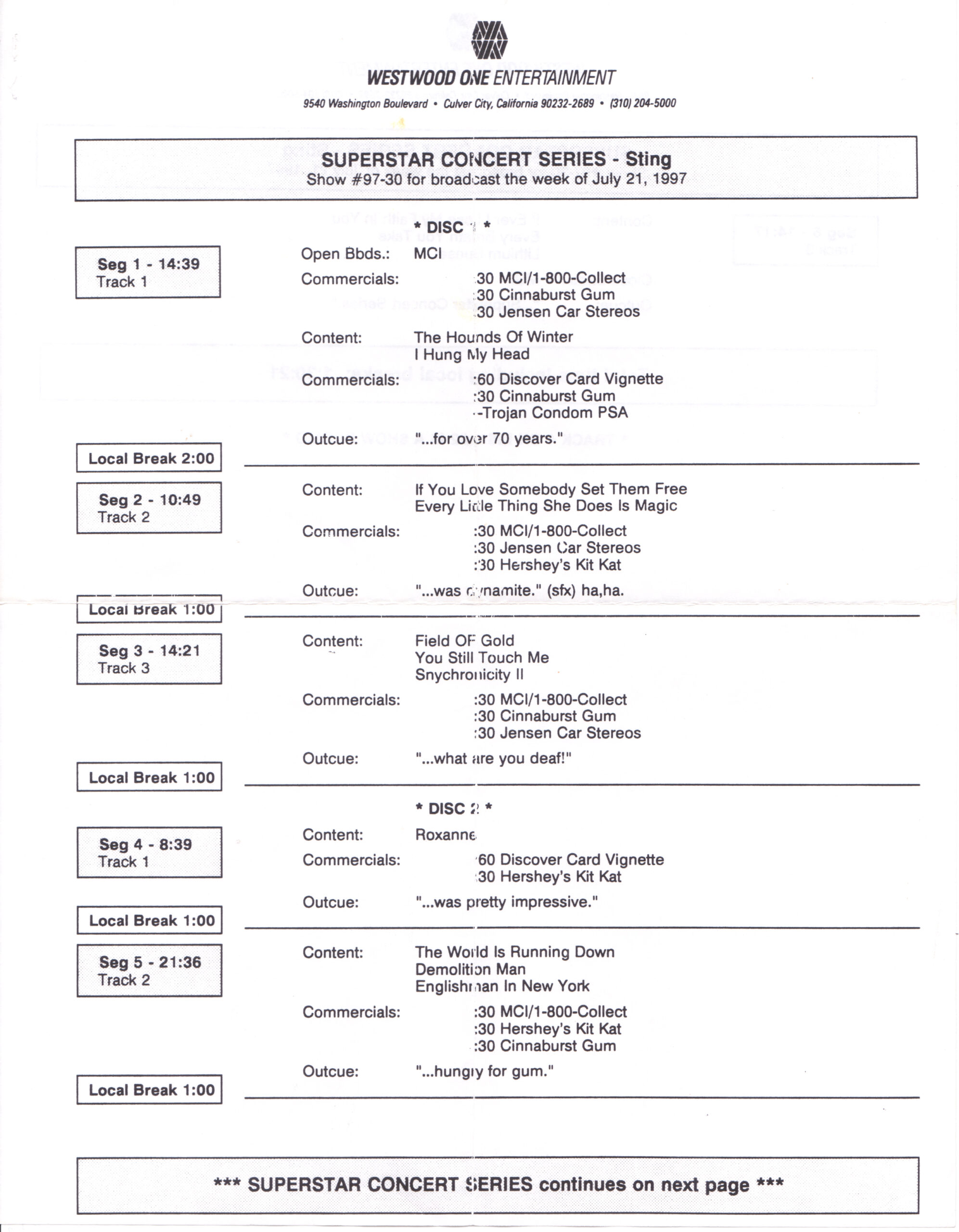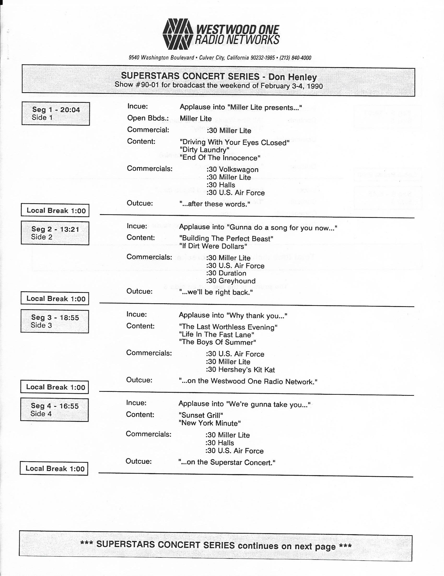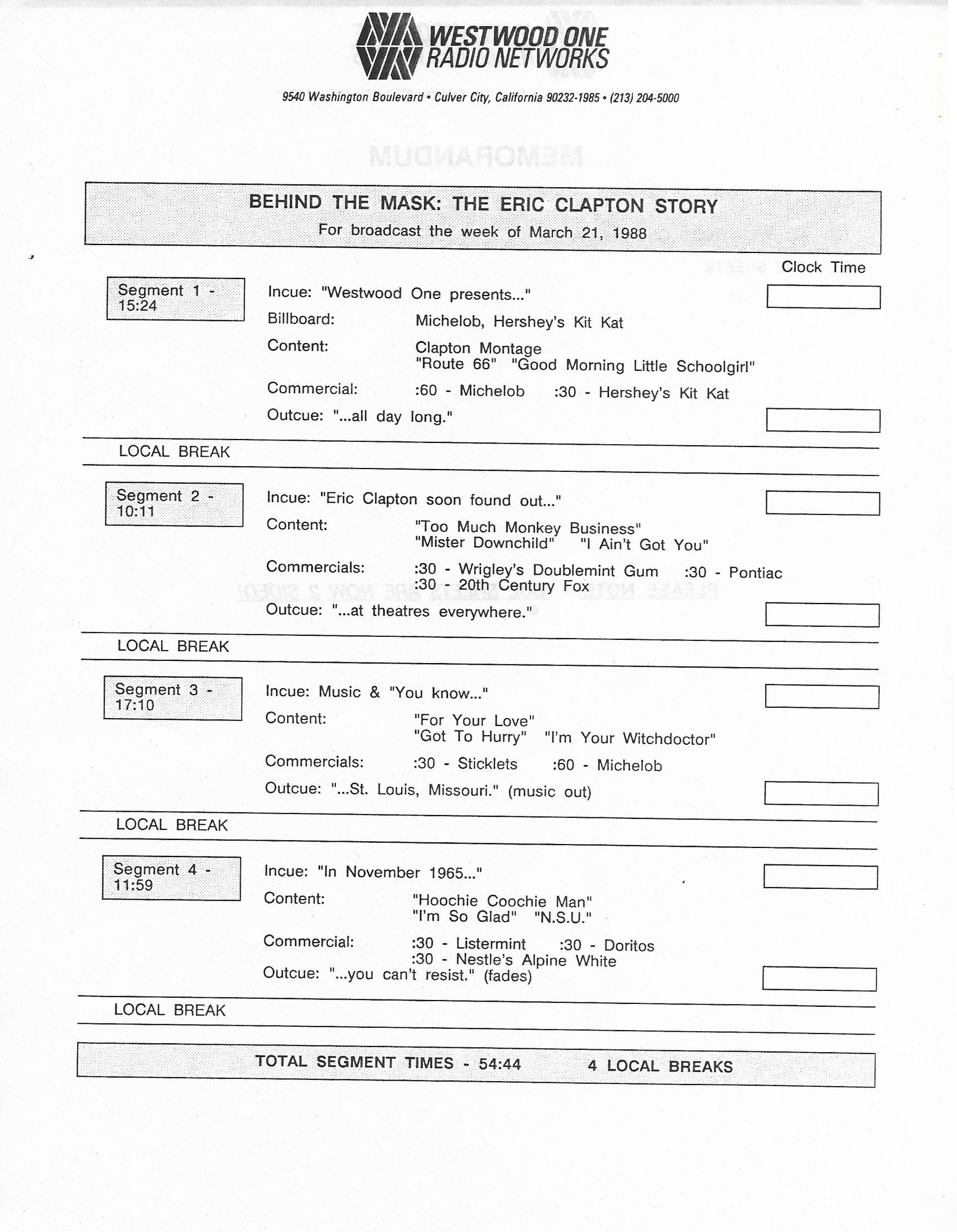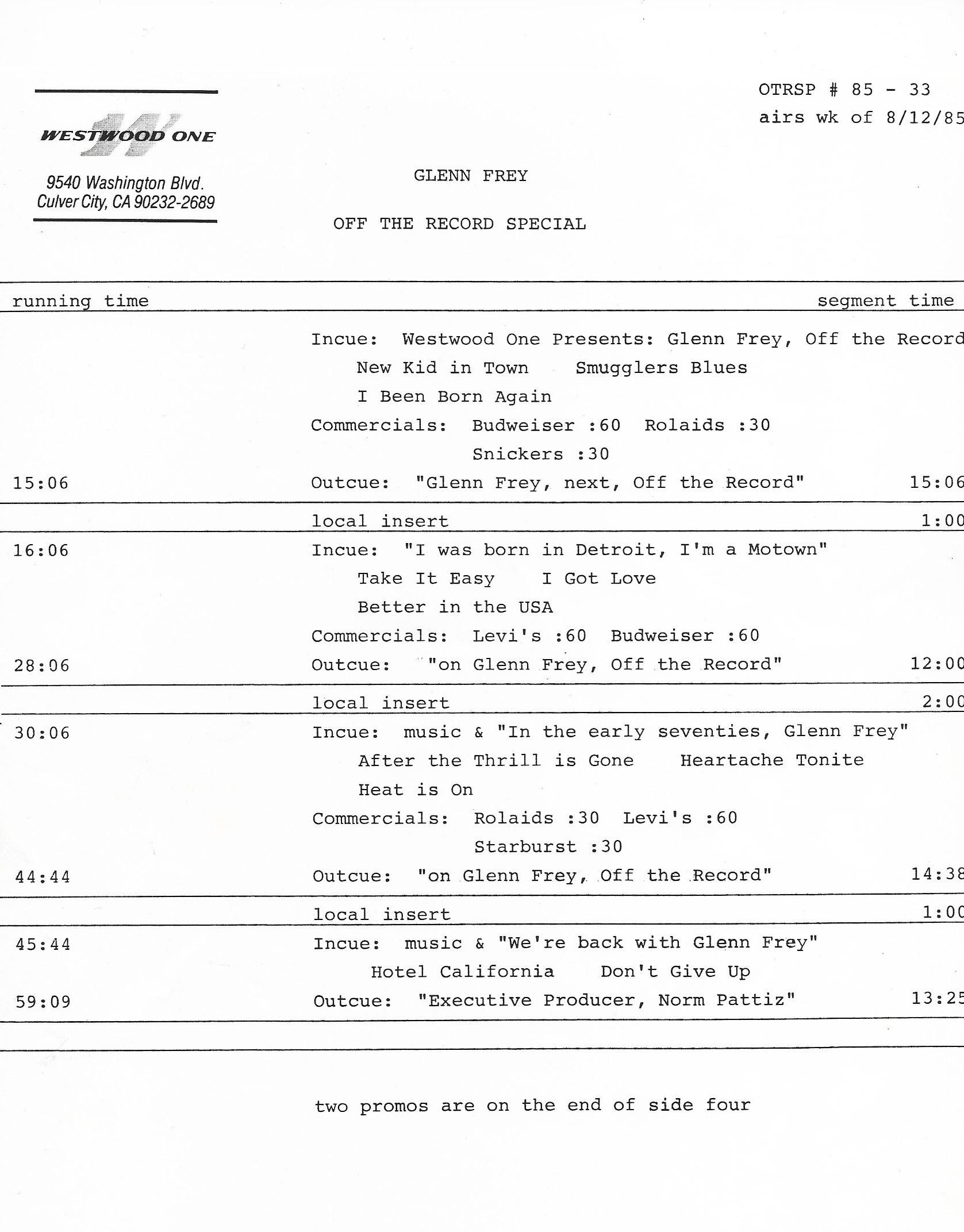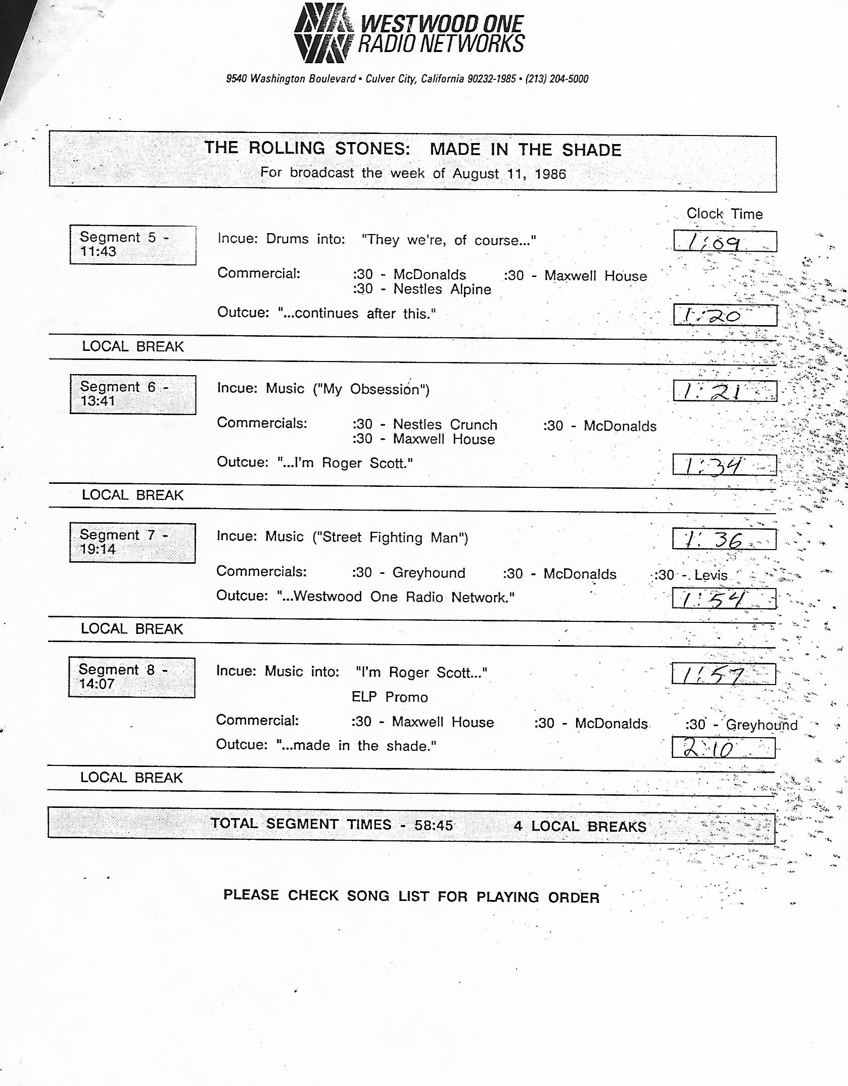 Tracks 1 – 4 are the actual radio show, Tracks 5 – 7 are promo spots, Tracks 8 – 15 are commercial spots, while Tracks 16 – 27 are the actual interview segments and segment intros separated into individual tracks.