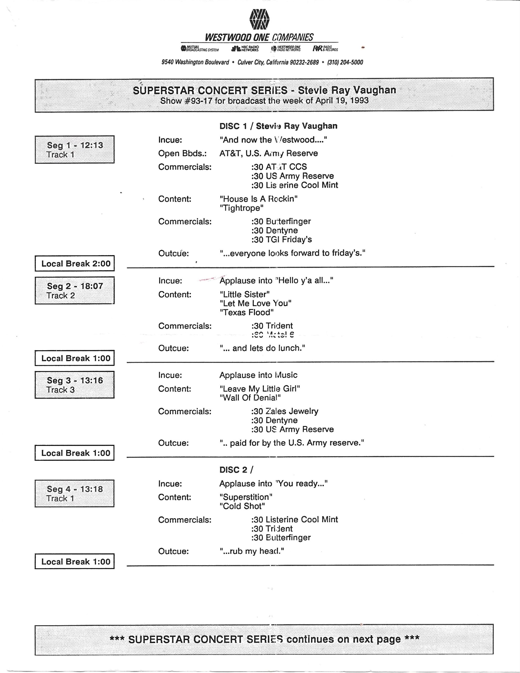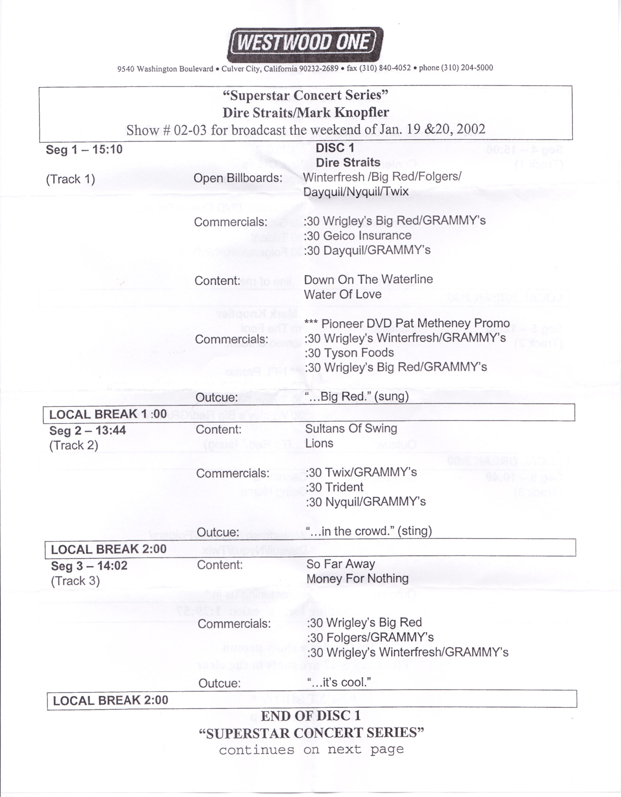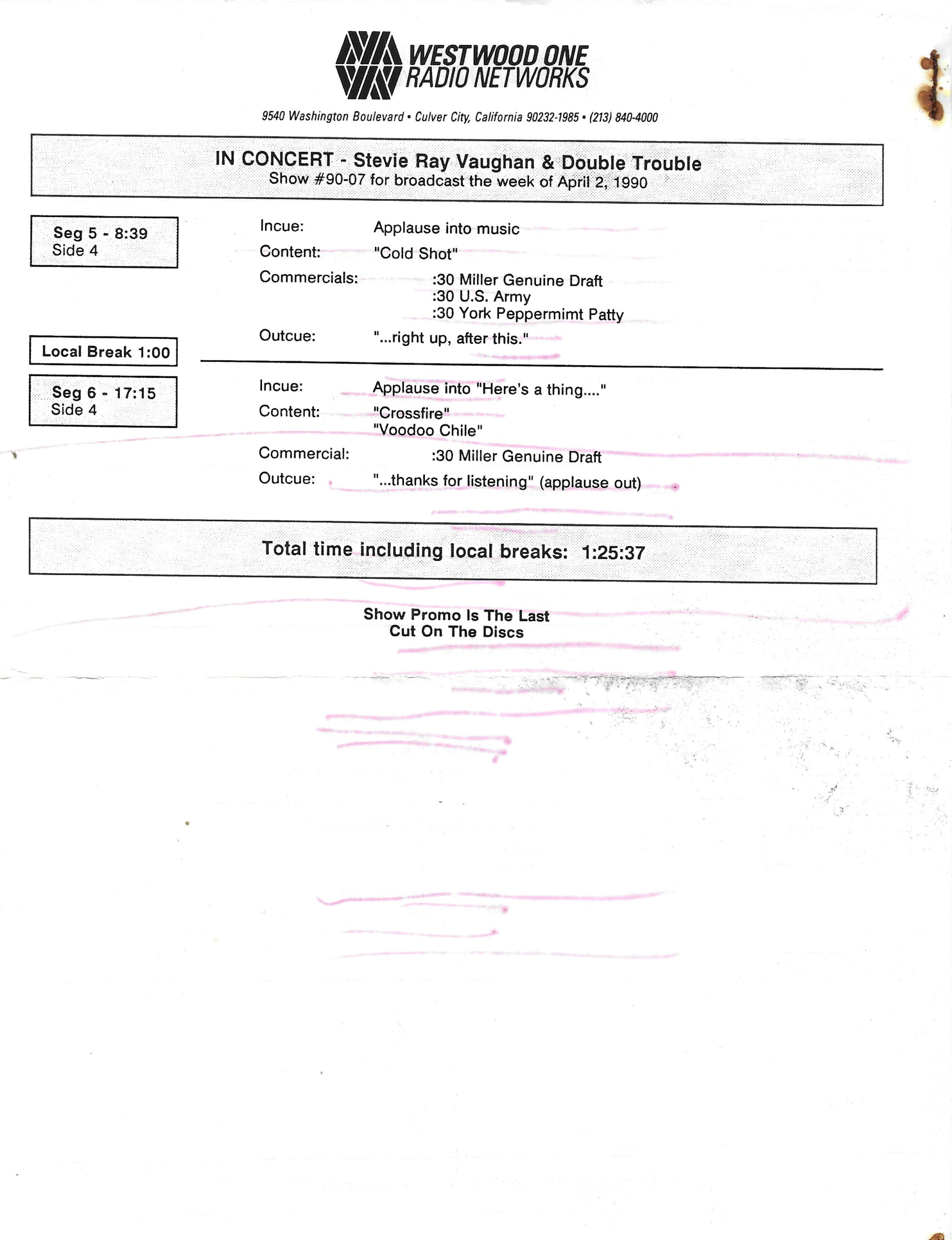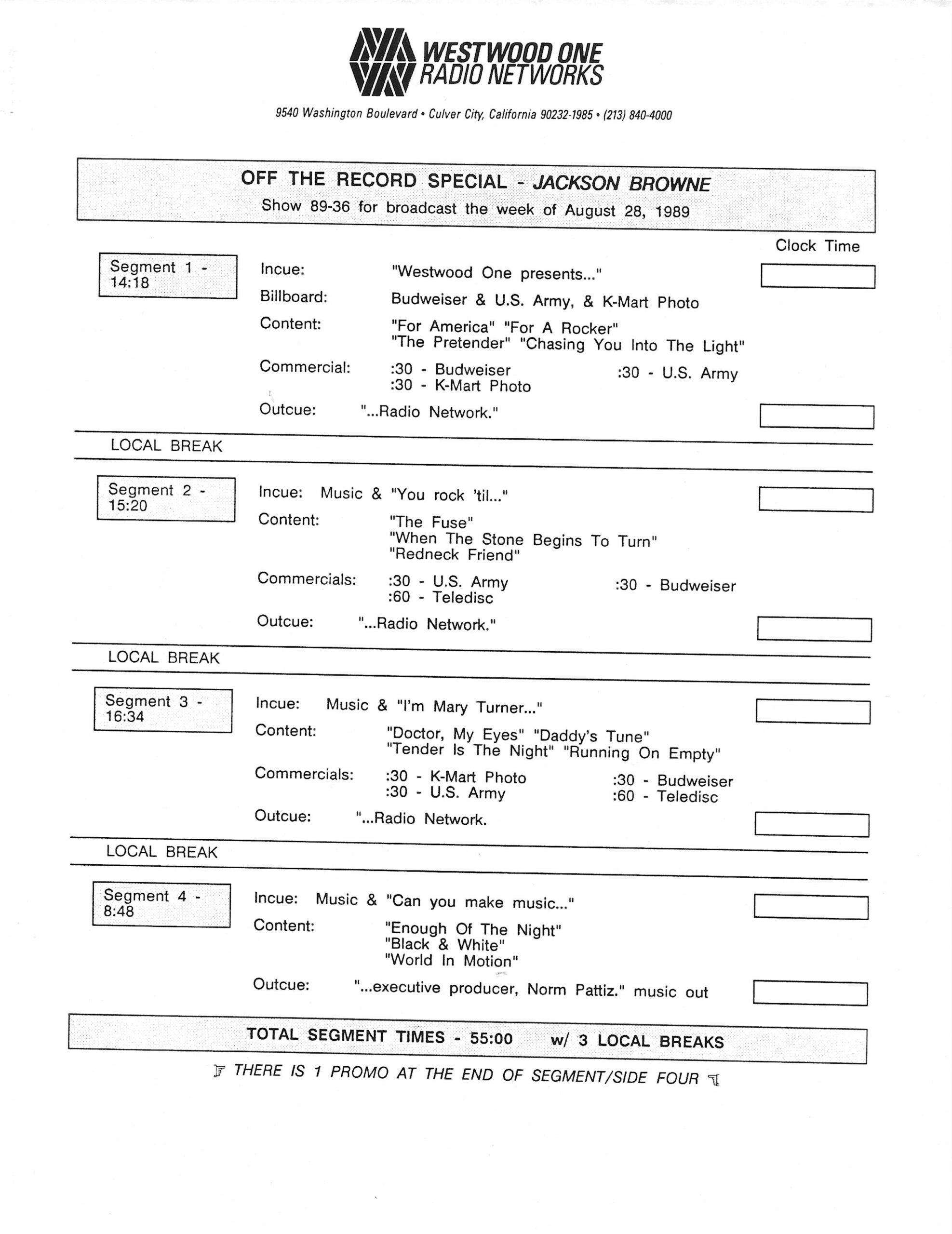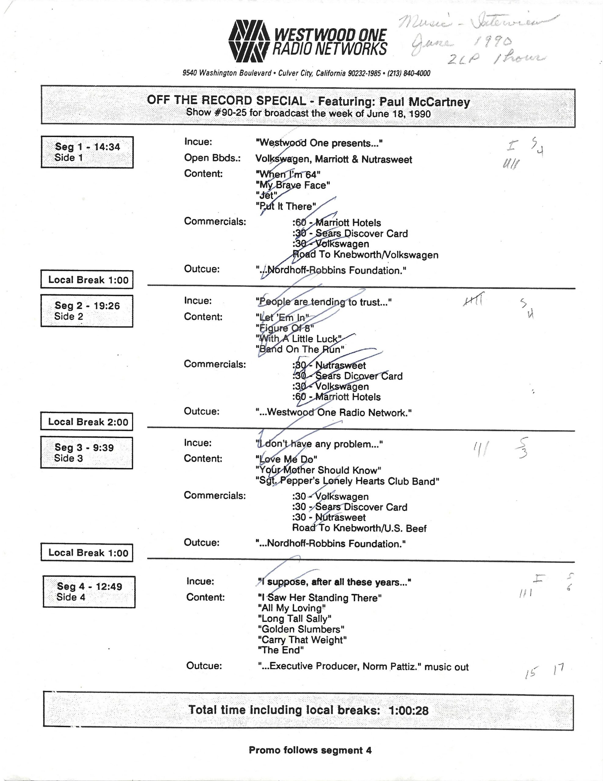 Tracks 1 – 4 are the actual radio show, Tracks 5 – 7 are promo spots, Tracks 8 – 15 are commercial spots, while Tracks 16 – 27 are the actual interview segments and segment intros separated into individual tracks.